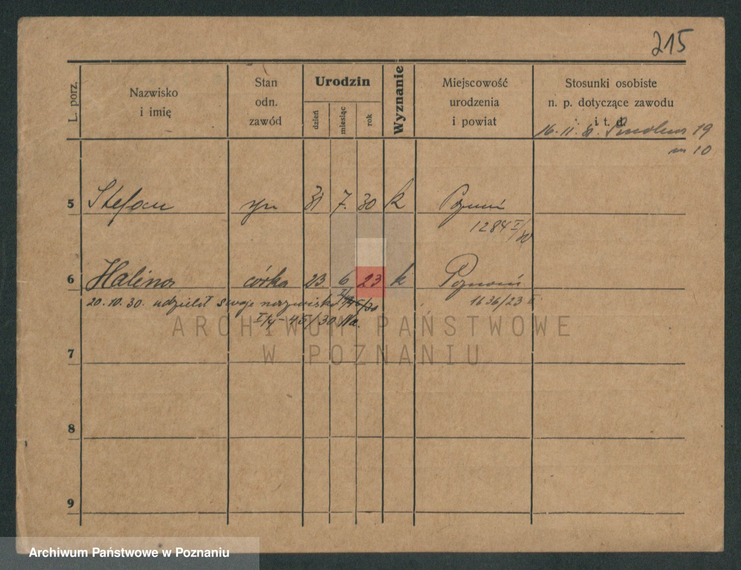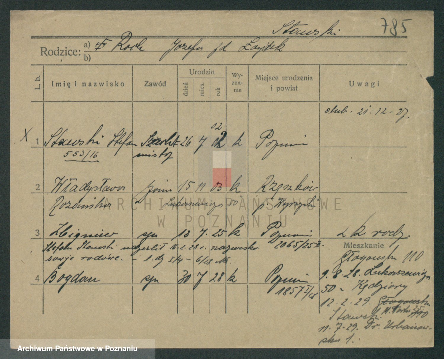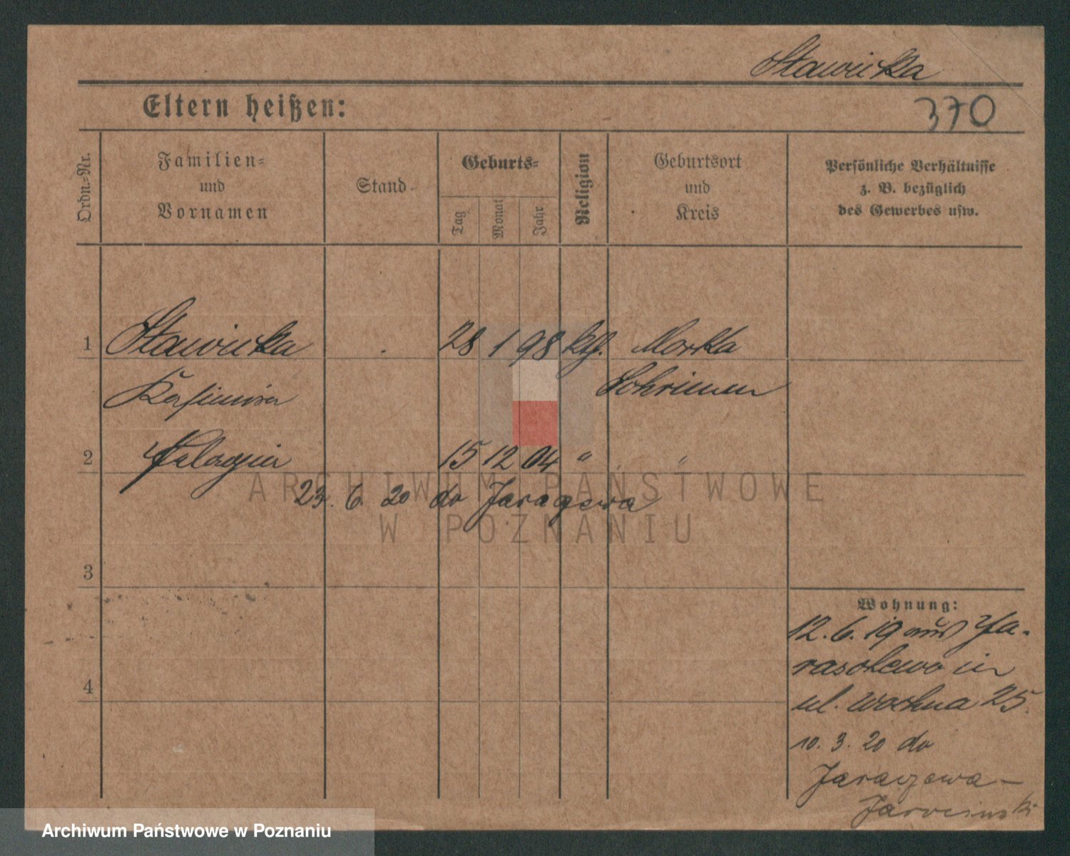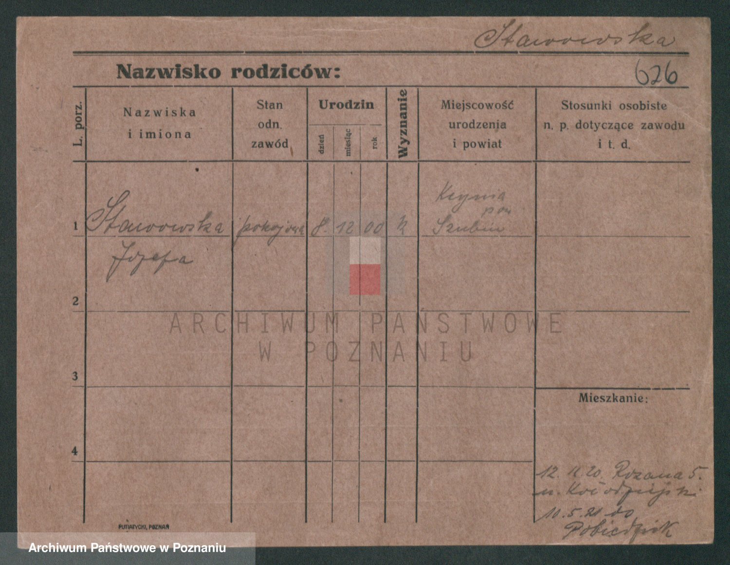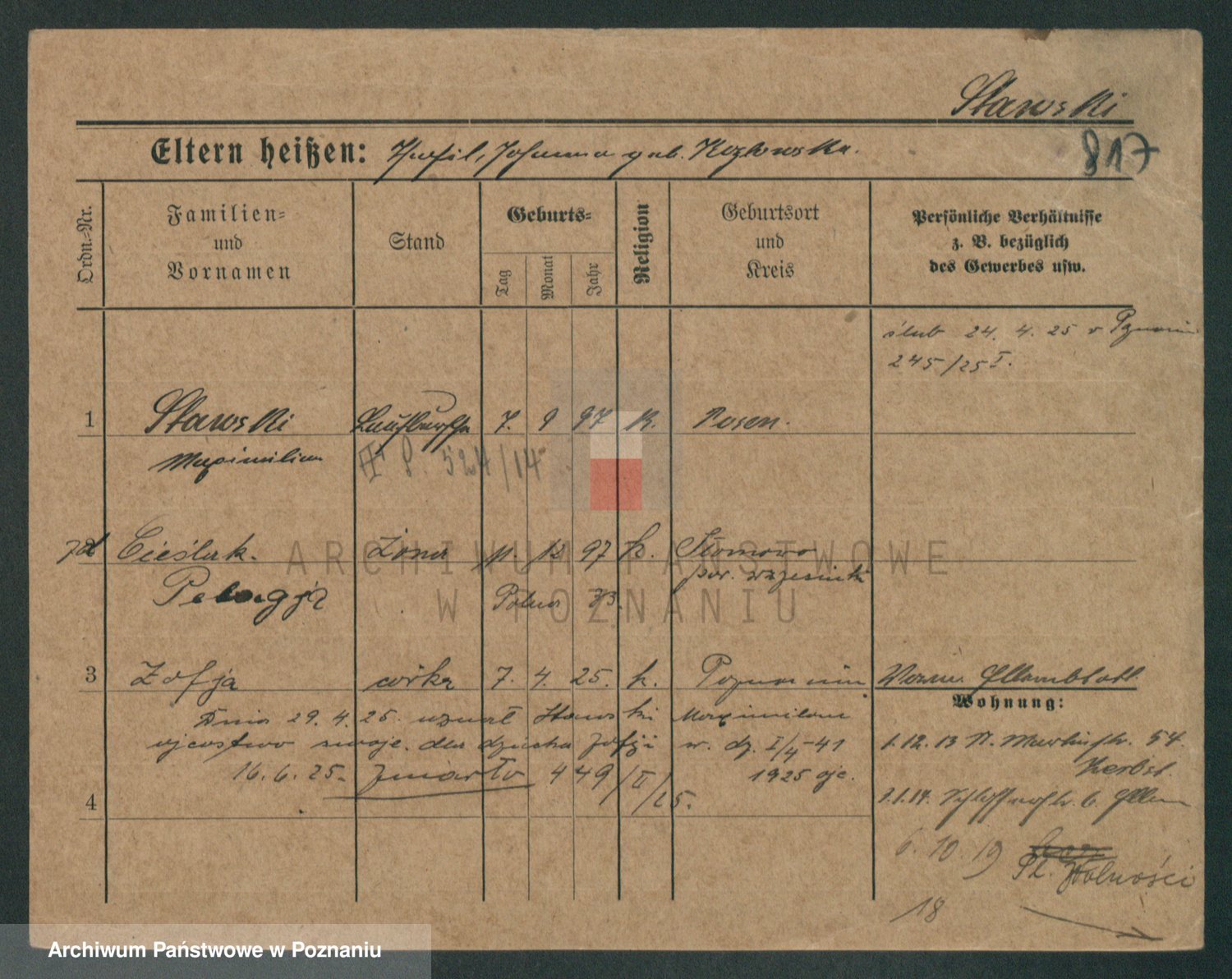 Podgląd karty osobowej dostępny jest po kliknięciu na nazwisko lub ikonkę karty. Można dokonywać powiększenia (ikony na górze) lub przechodzić między kolejnymi skanami (strzałki po bokach).