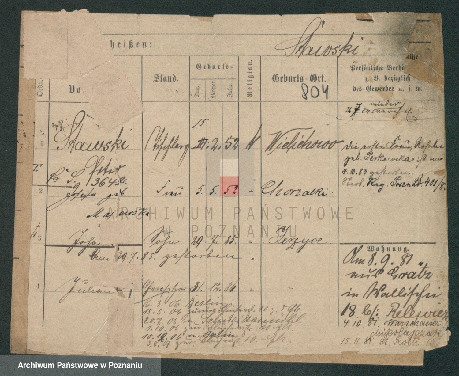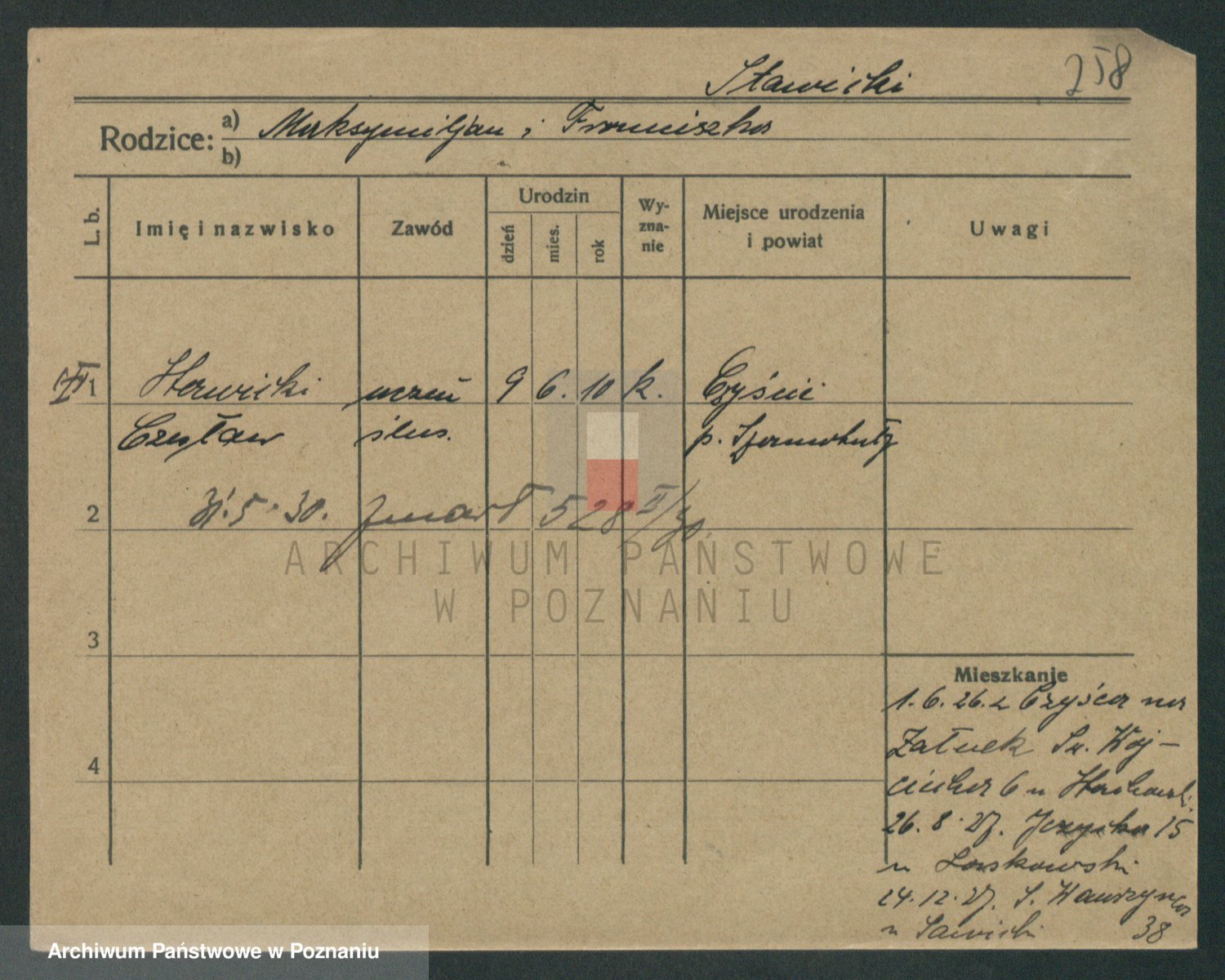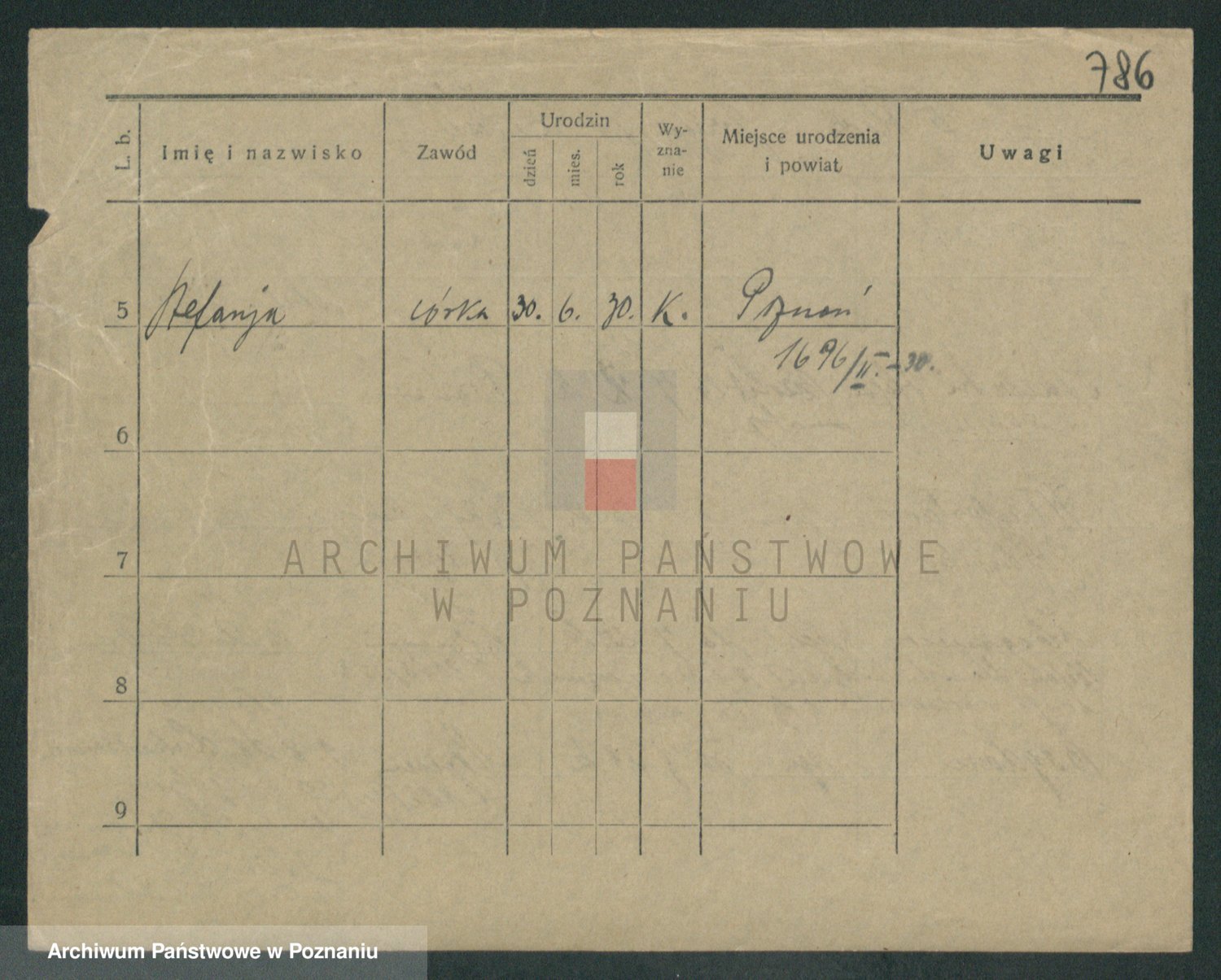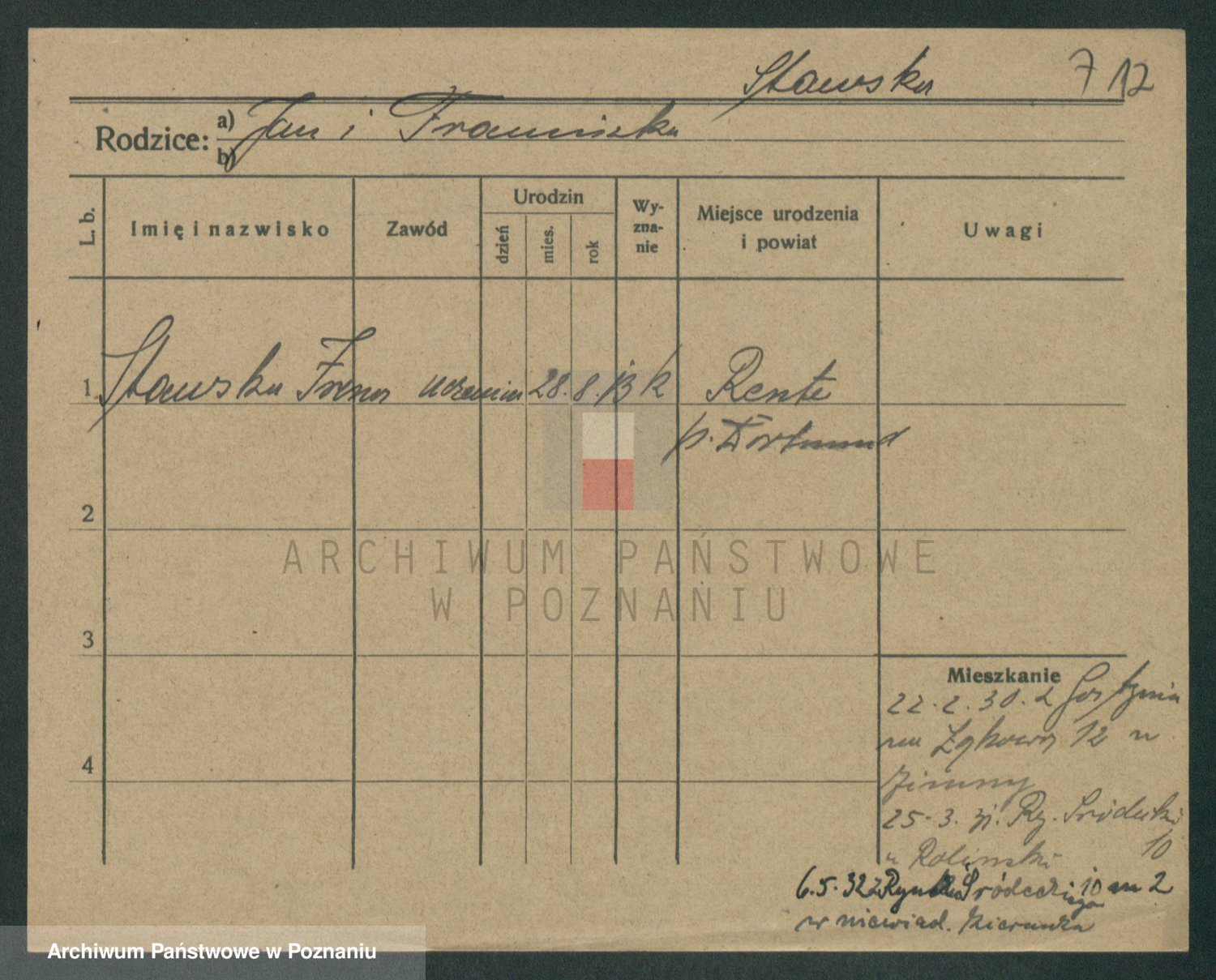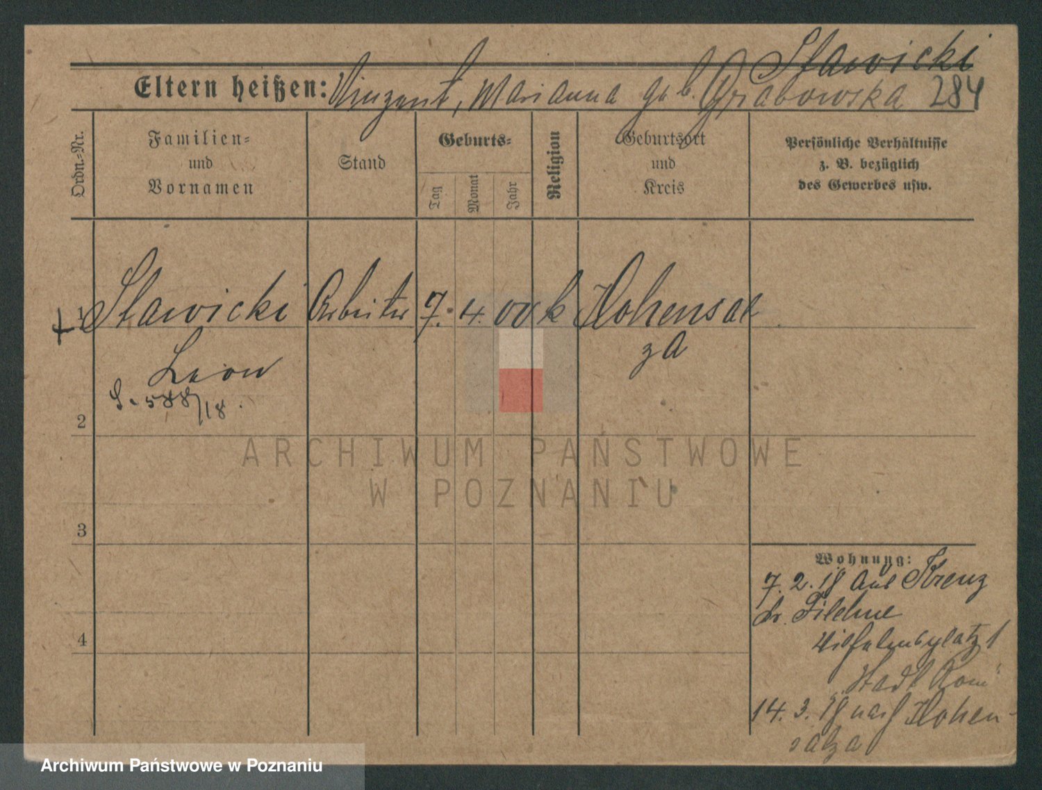 Podgląd karty osobowej dostępny jest po kliknięciu na nazwisko lub ikonkę karty. Można dokonywać powiększenia (ikony na górze) lub przechodzić między kolejnymi skanami (strzałki po bokach).