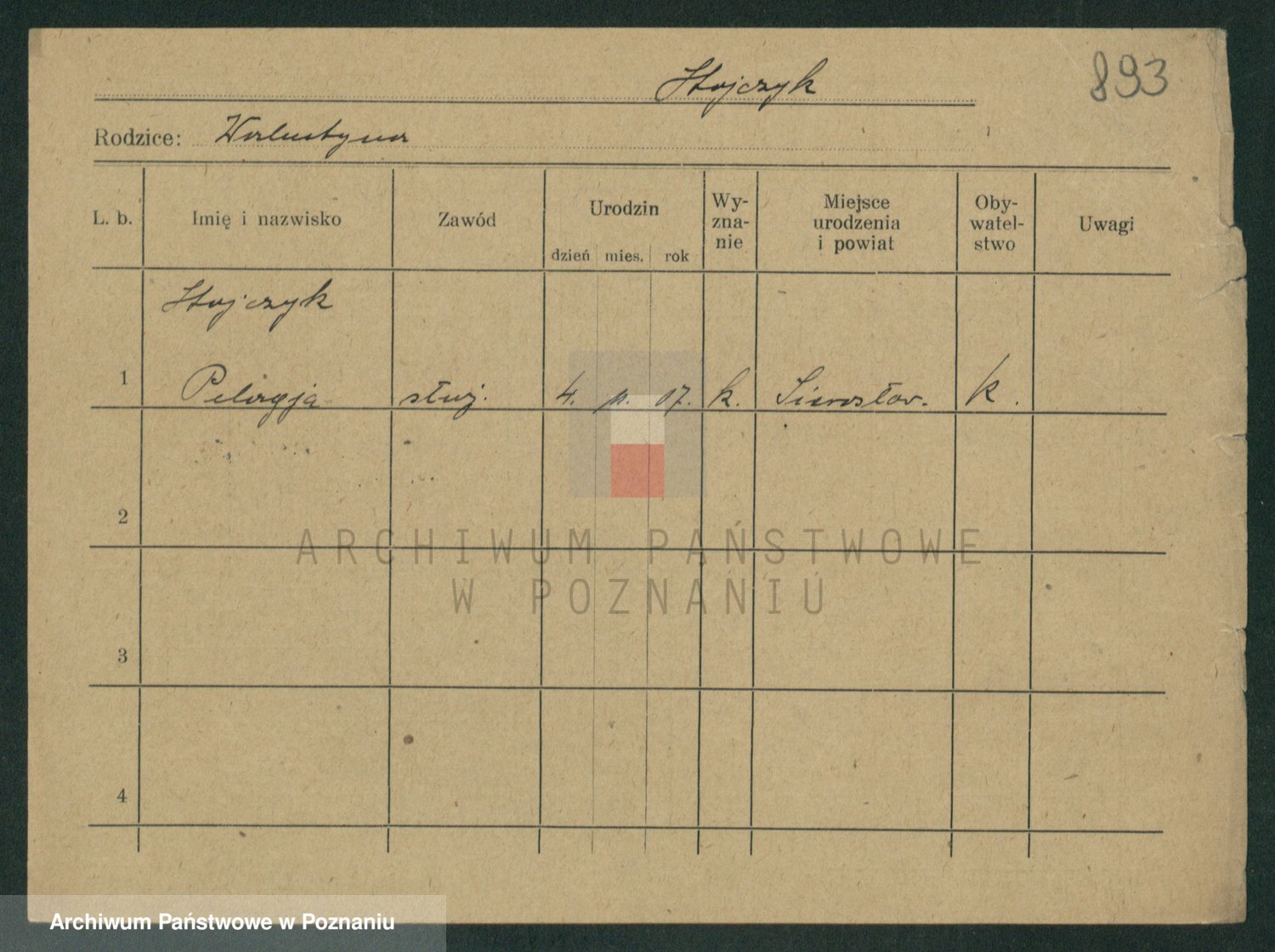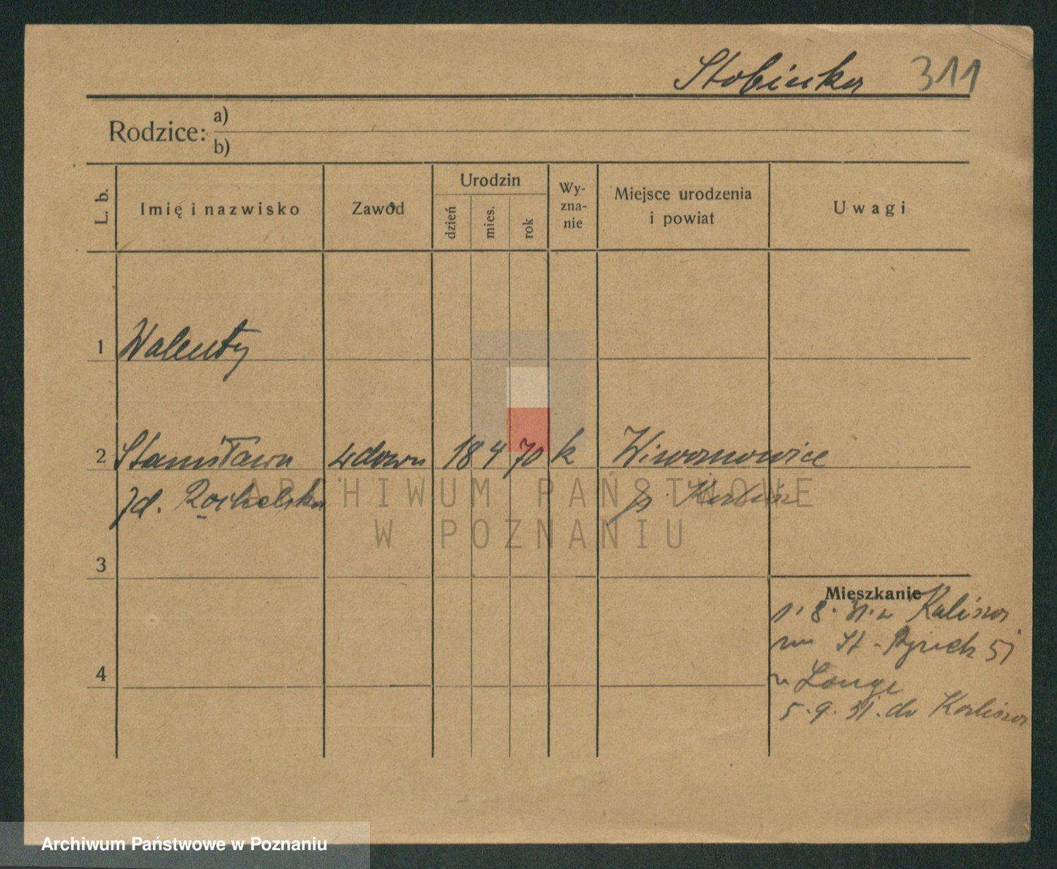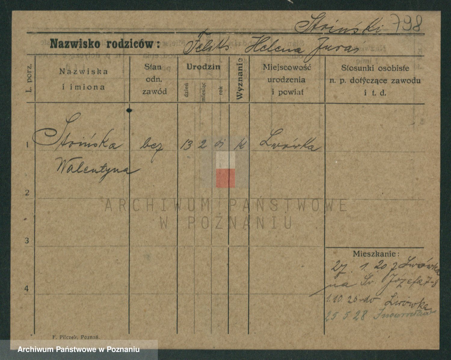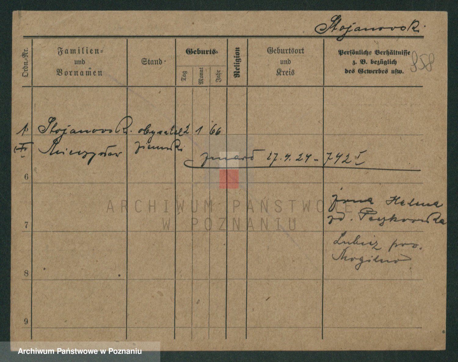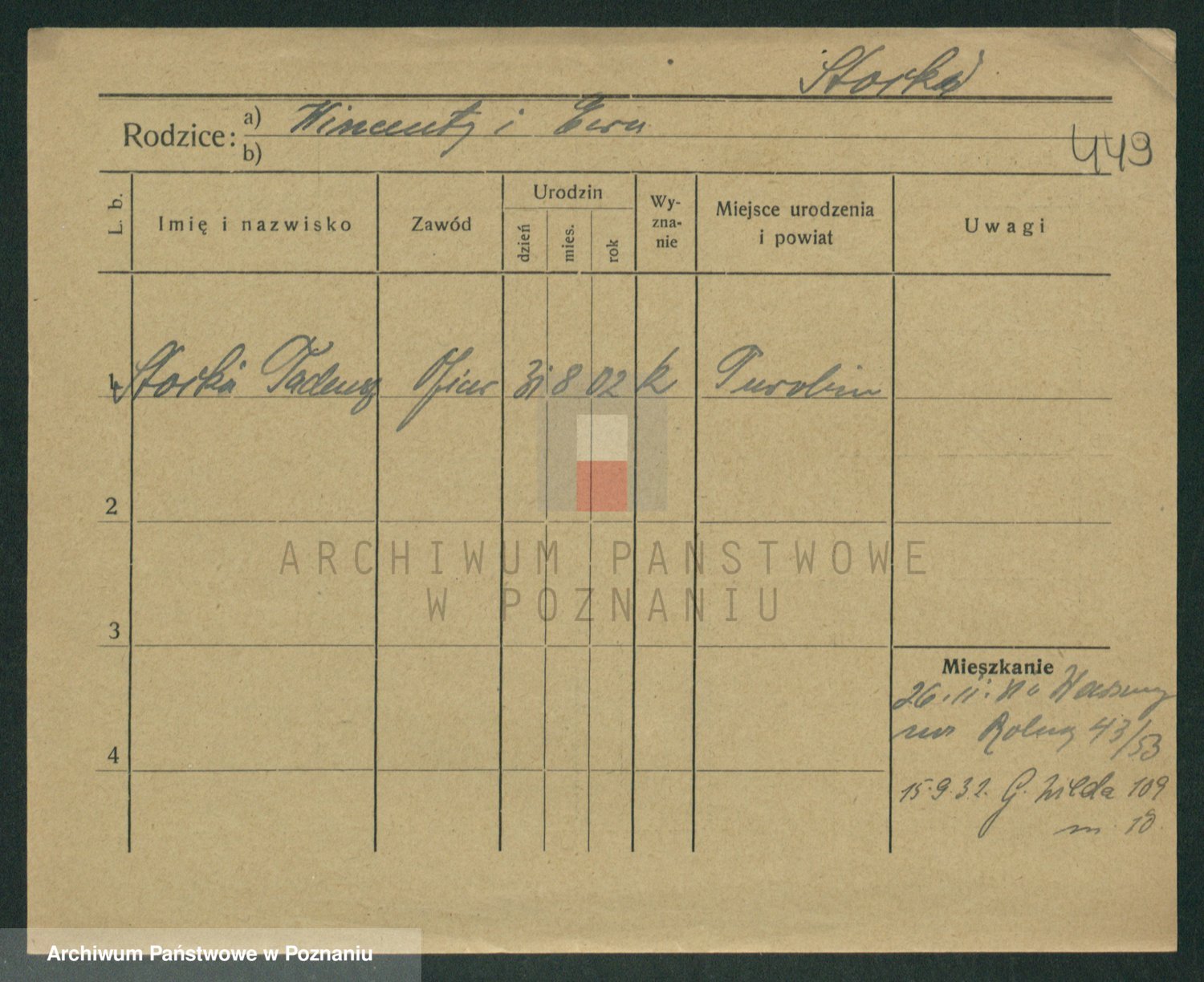 Podgląd karty osobowej dostępny jest po kliknięciu na nazwisko lub ikonkę karty. Można dokonywać powiększenia (ikony na górze) lub przechodzić między kolejnymi skanami (strzałki po bokach).