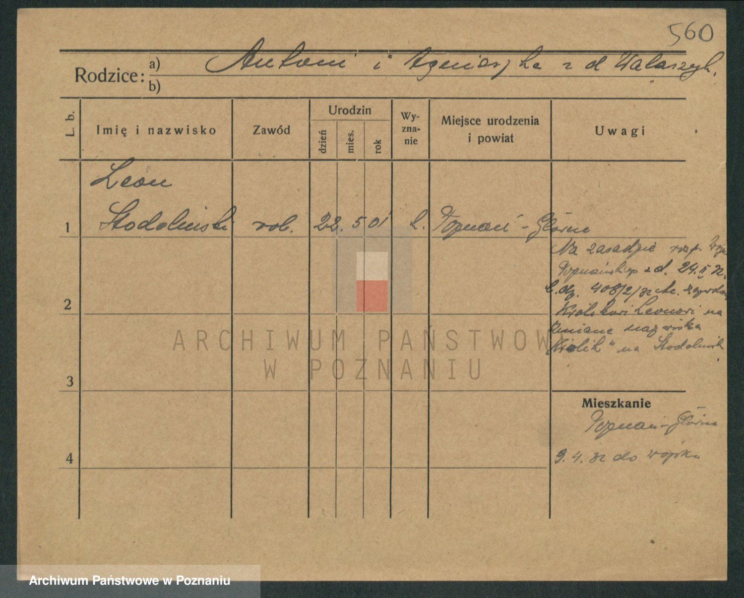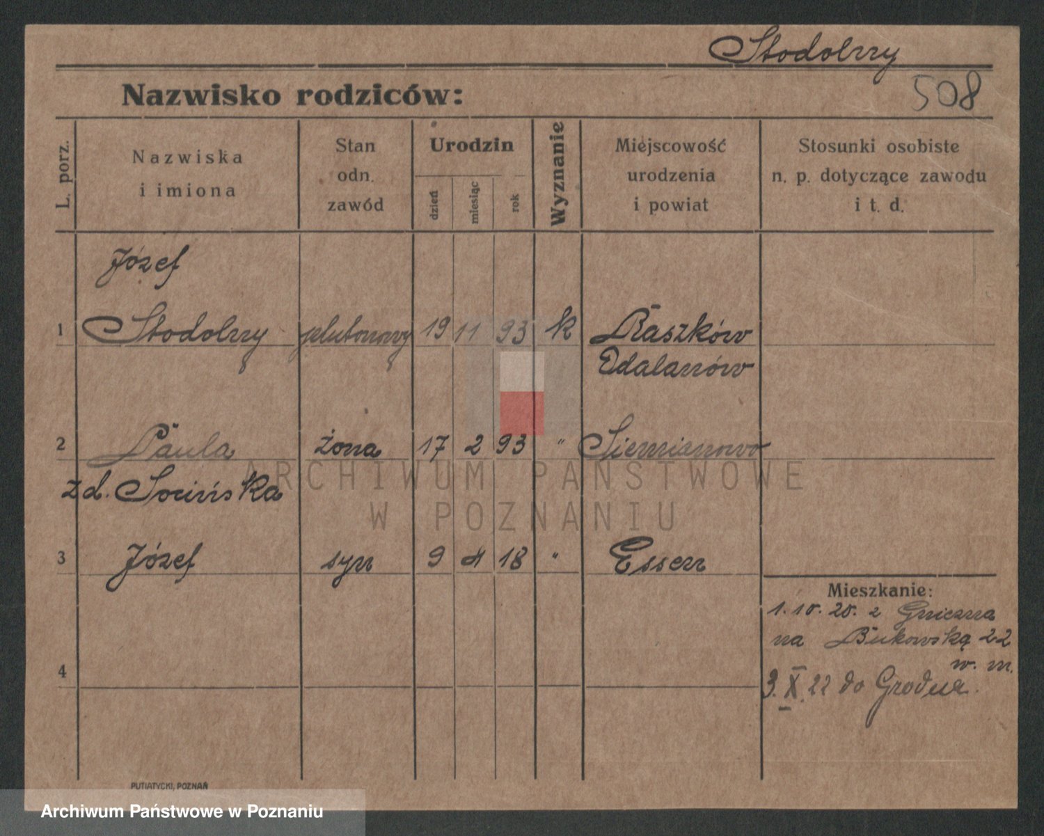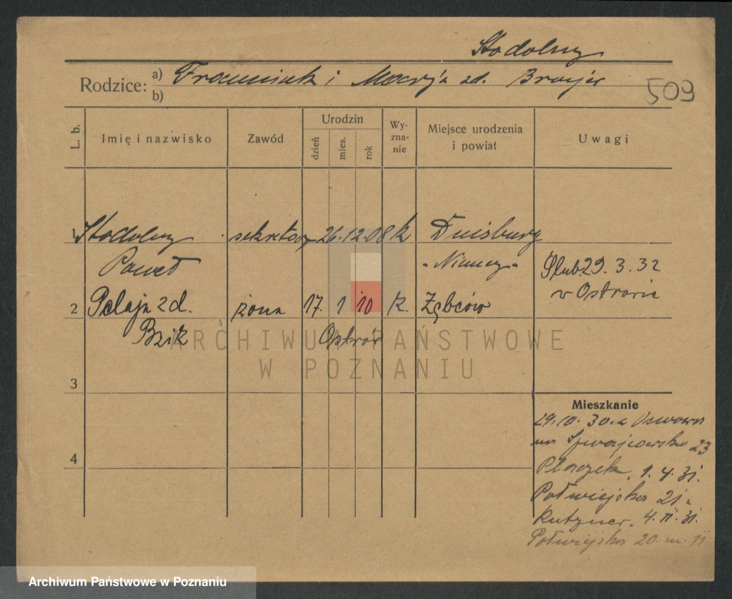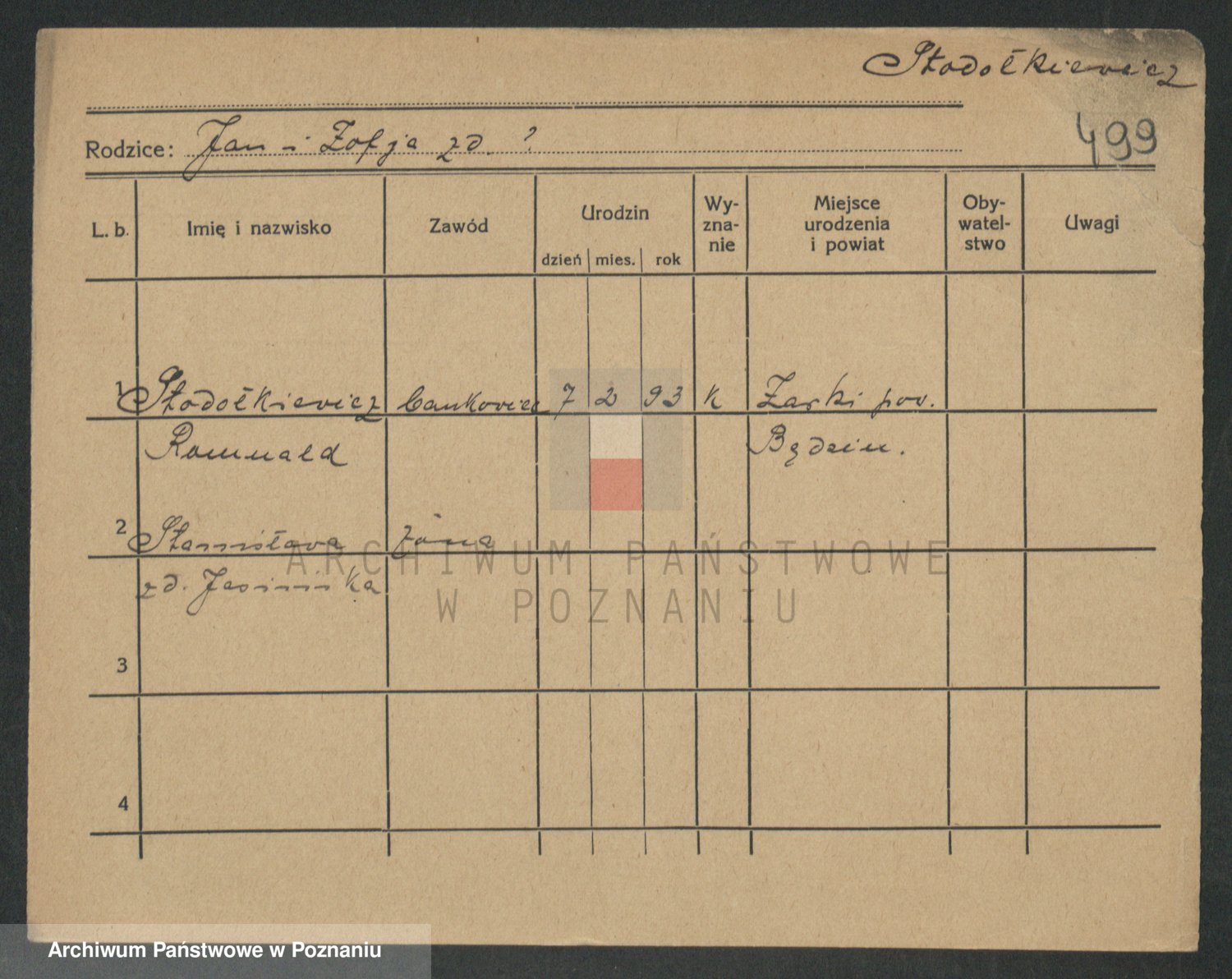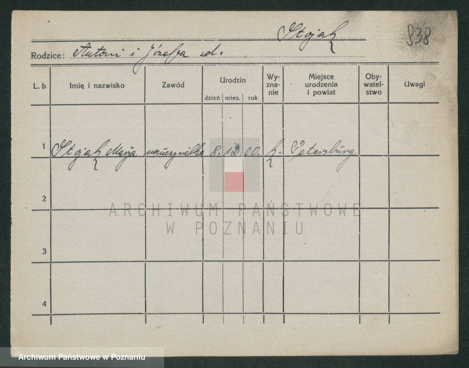 Podgląd karty osobowej dostępny jest po kliknięciu na nazwisko lub ikonkę karty. Można dokonywać powiększenia (ikony na górze) lub przechodzić między kolejnymi skanami (strzałki po bokach).