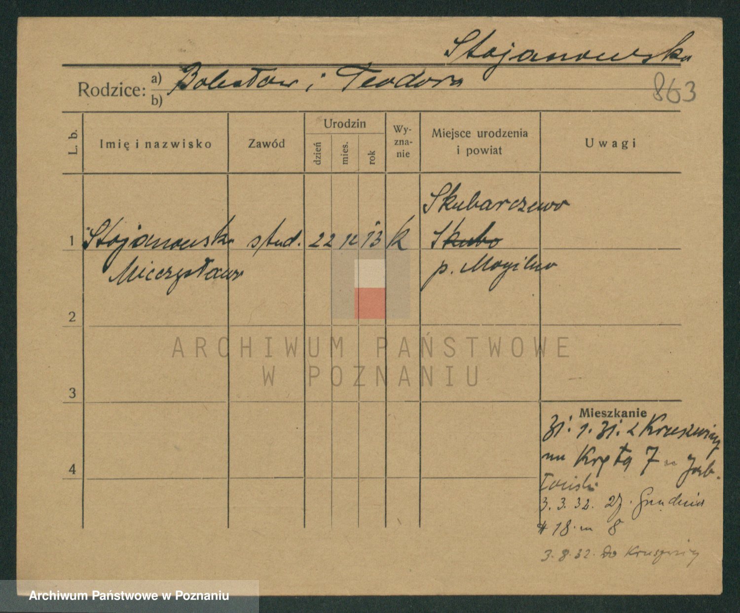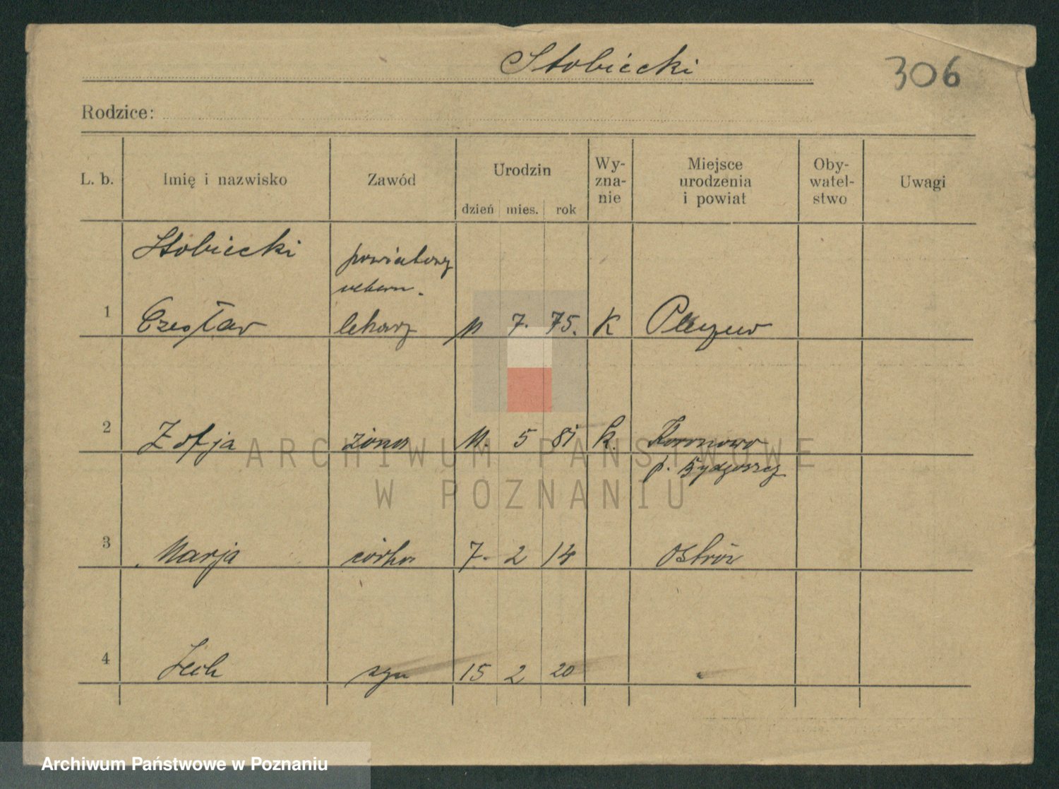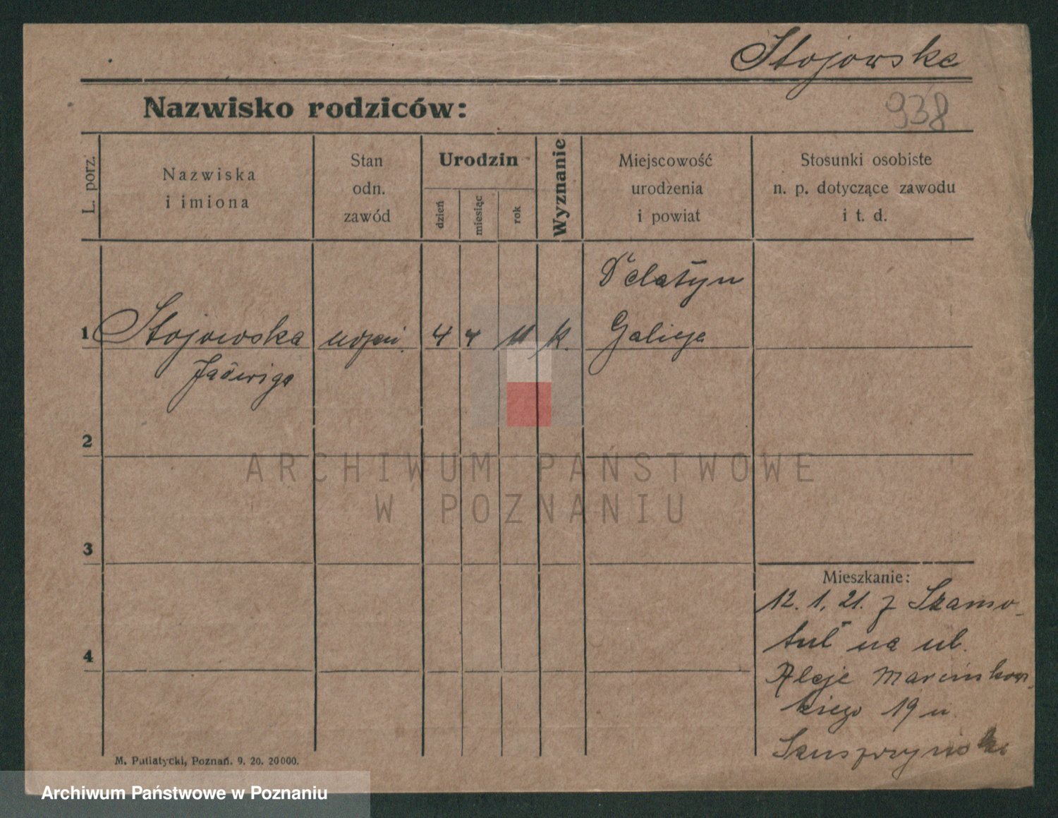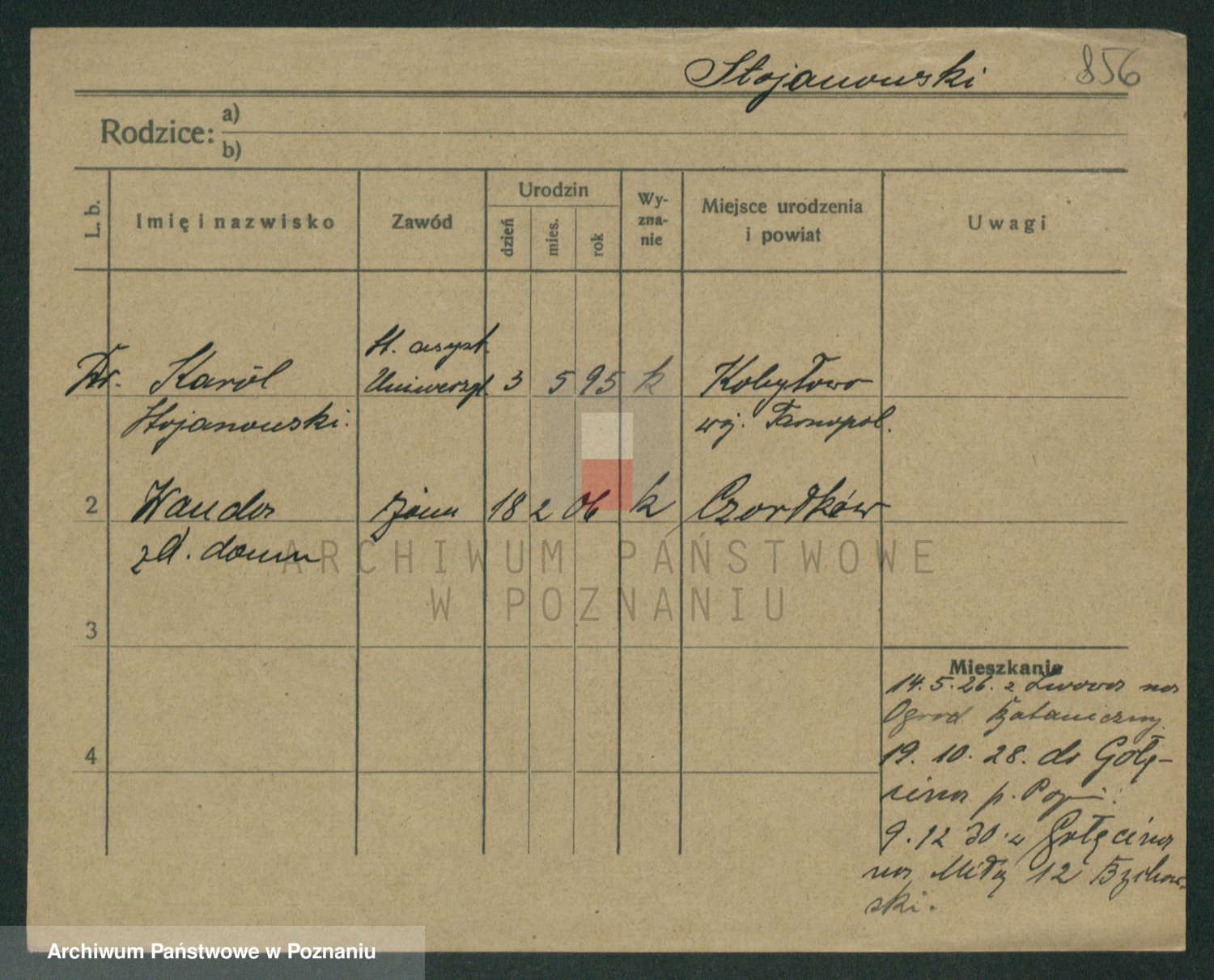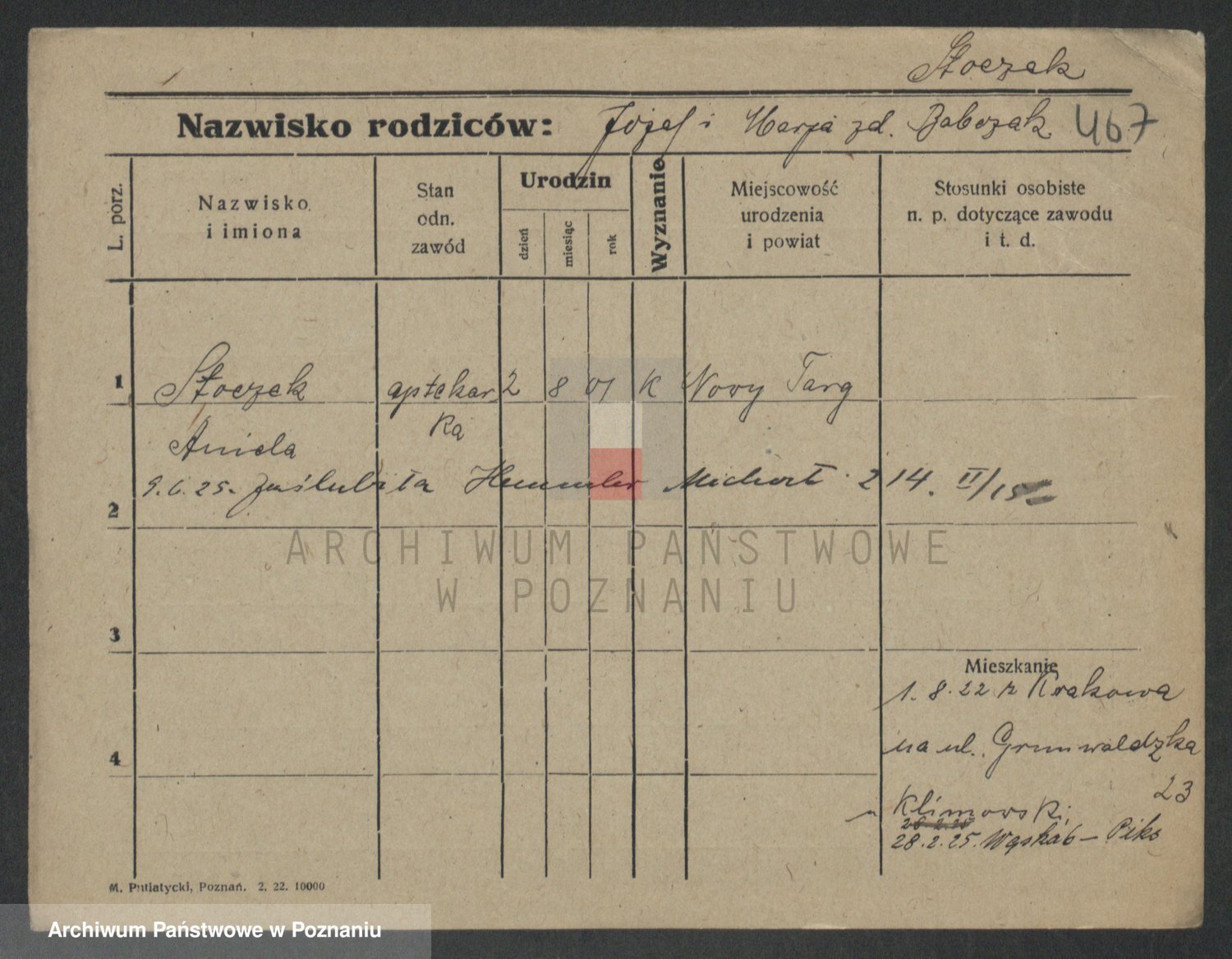 Podgląd karty osobowej dostępny jest po kliknięciu na nazwisko lub ikonkę karty. Można dokonywać powiększenia (ikony na górze) lub przechodzić między kolejnymi skanami (strzałki po bokach).