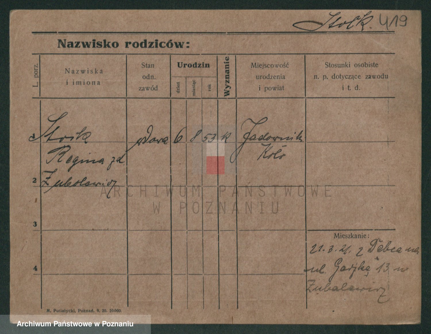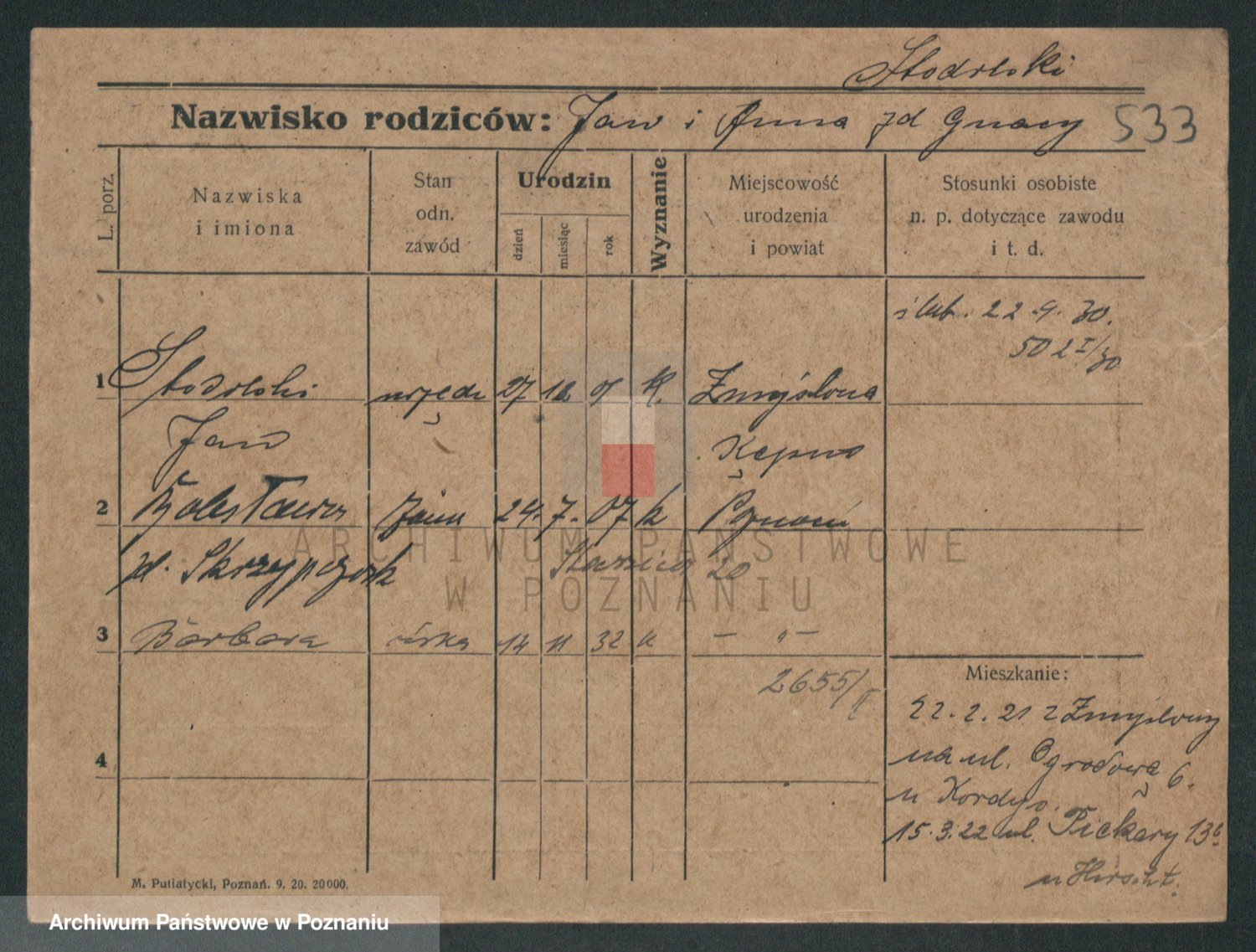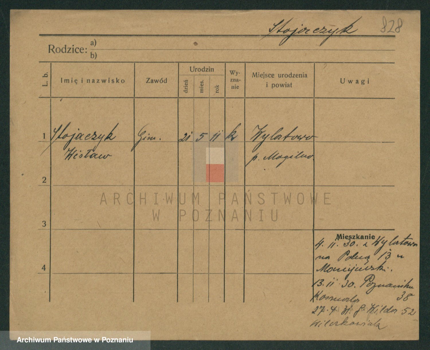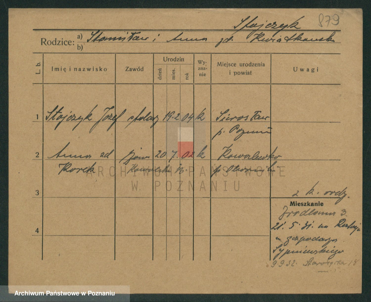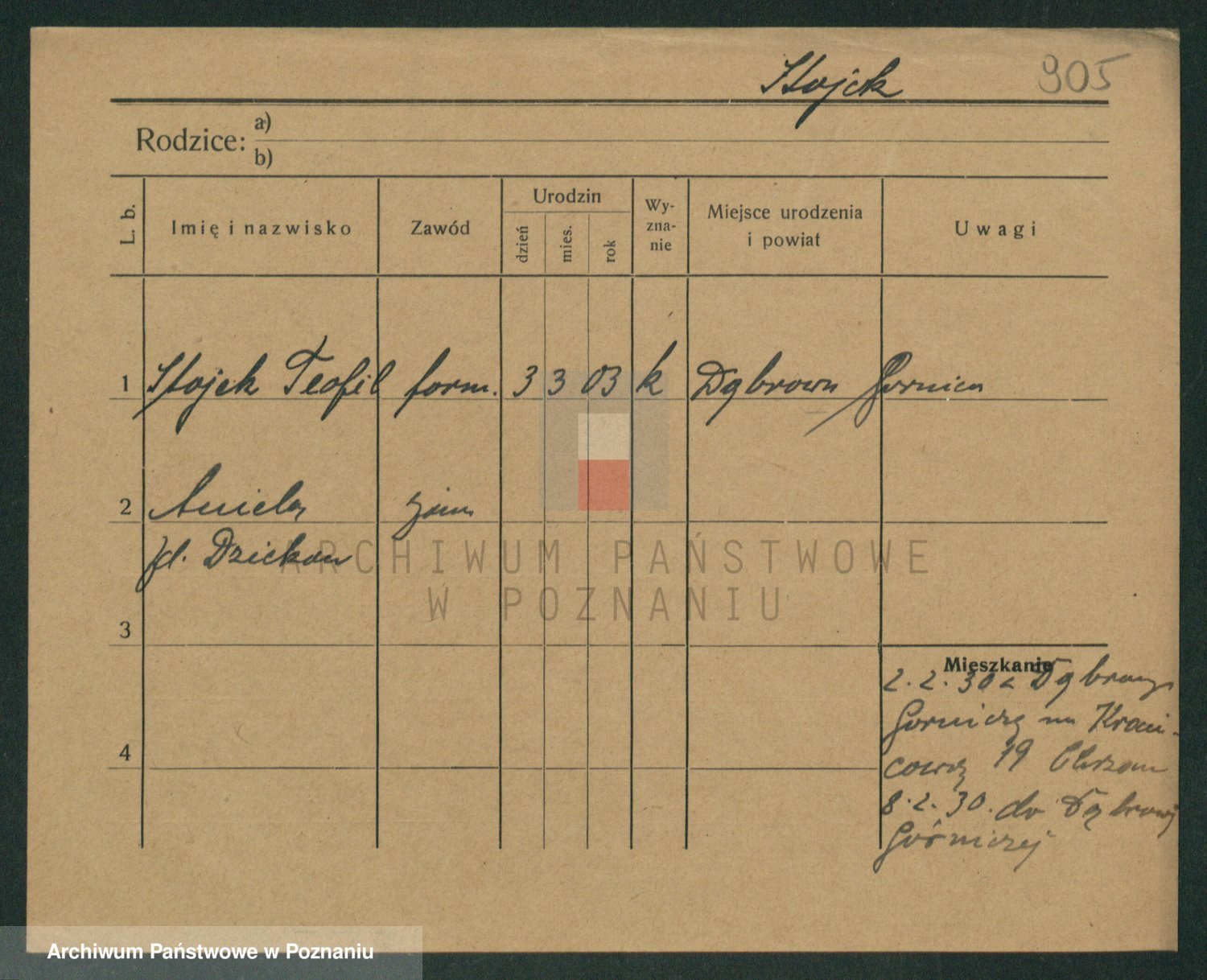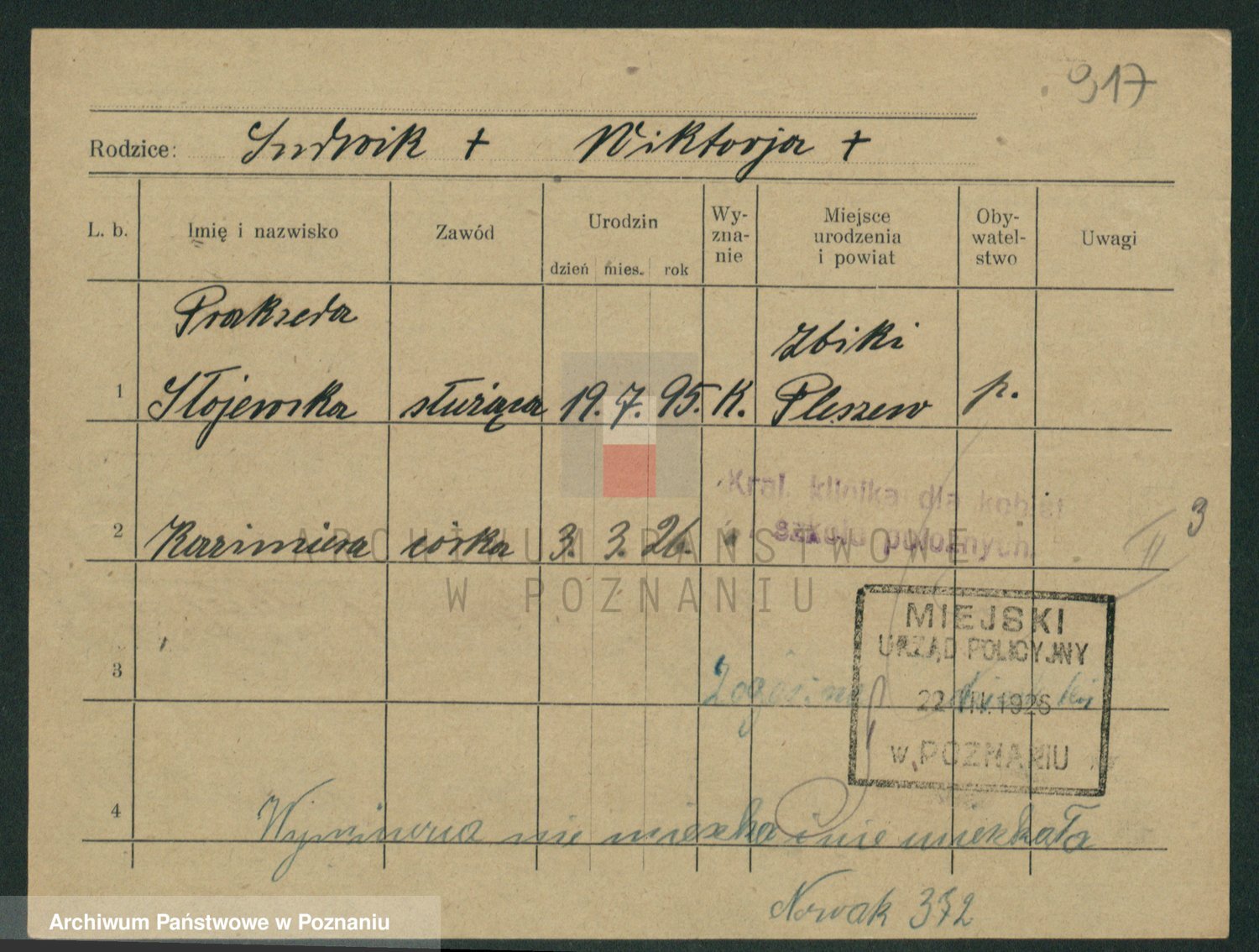 Podgląd karty osobowej dostępny jest po kliknięciu na nazwisko lub ikonkę karty. Można dokonywać powiększenia (ikony na górze) lub przechodzić między kolejnymi skanami (strzałki po bokach).