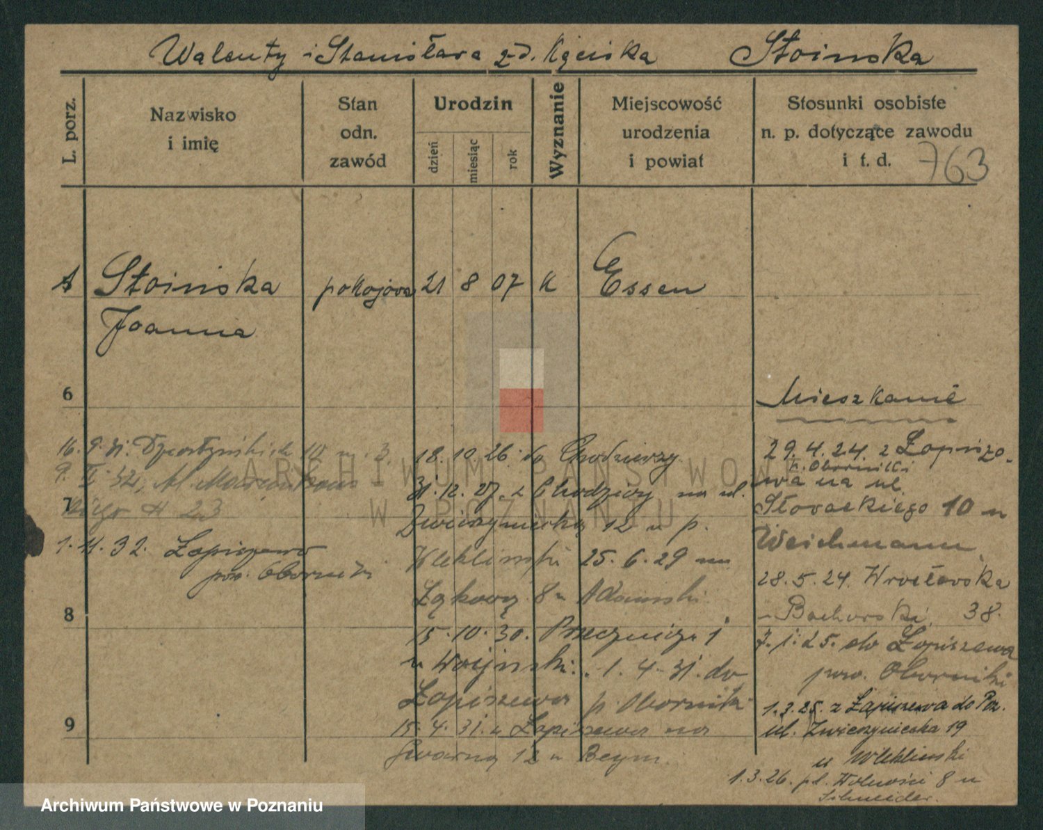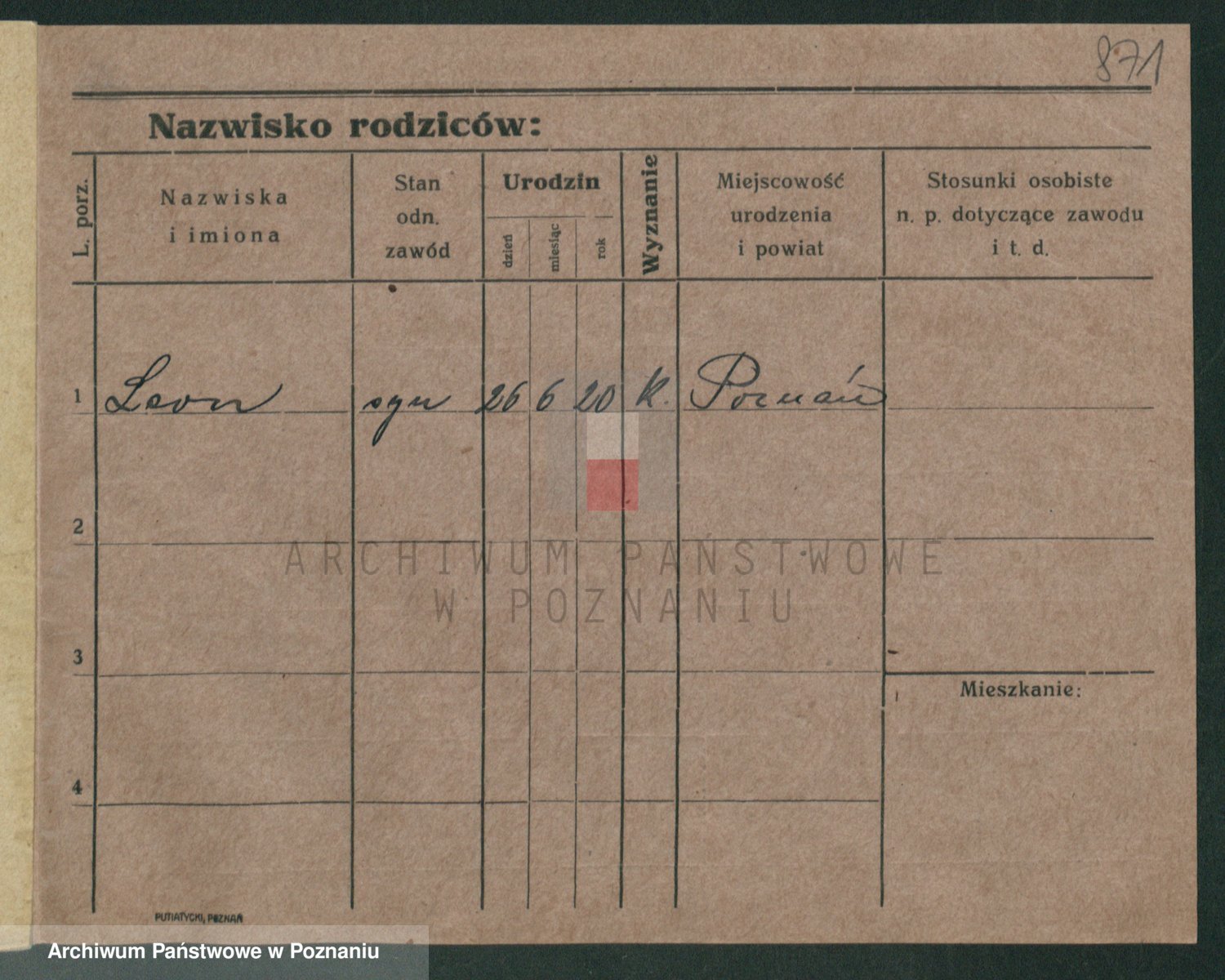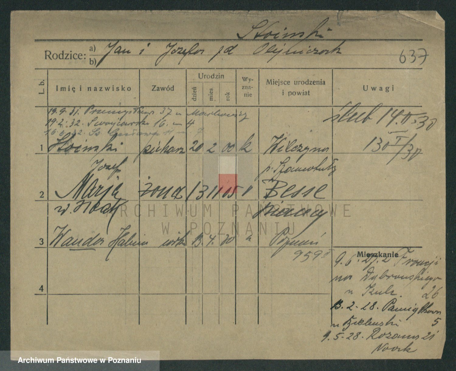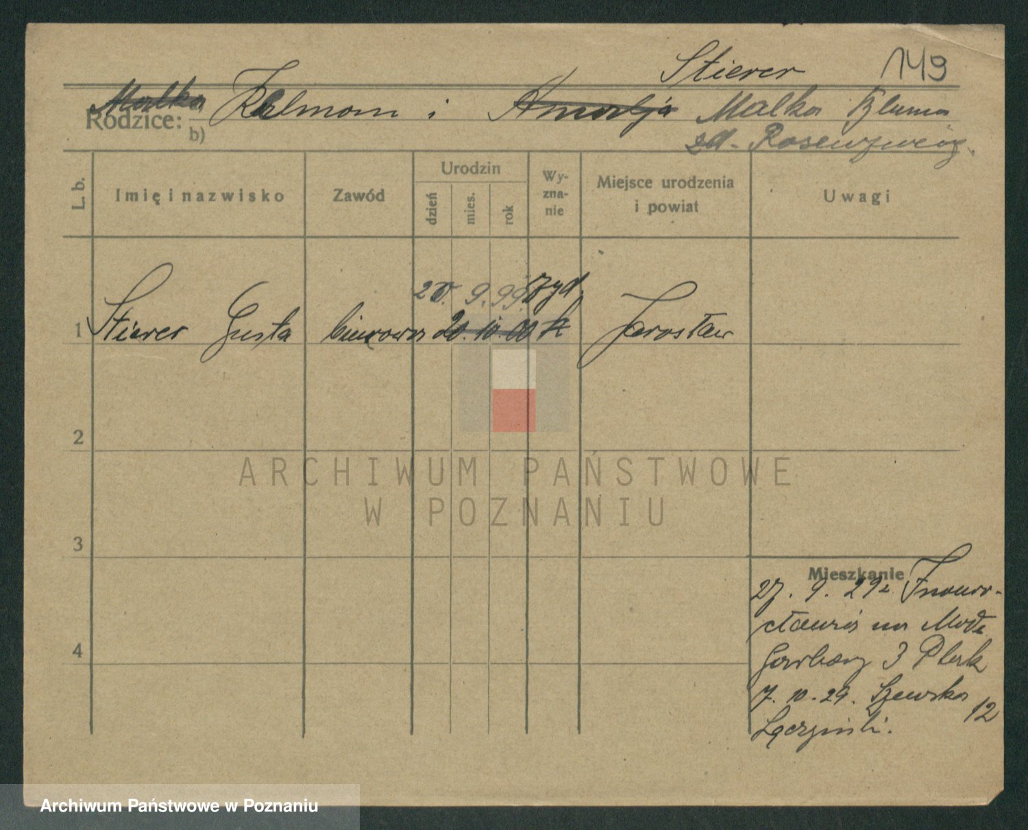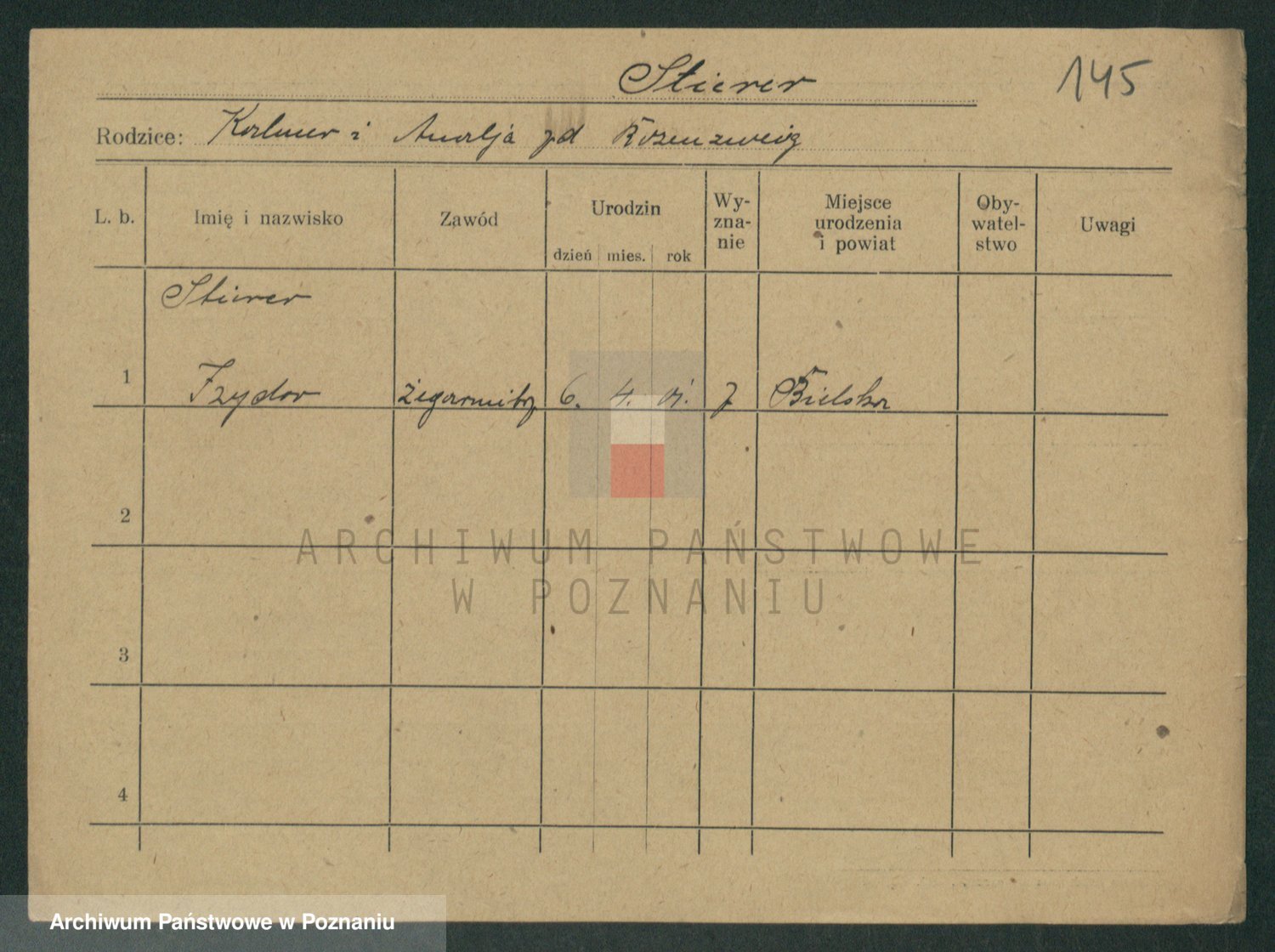 Podgląd karty osobowej dostępny jest po kliknięciu na nazwisko lub ikonkę karty. Można dokonywać powiększenia (ikony na górze) lub przechodzić między kolejnymi skanami (strzałki po bokach).
