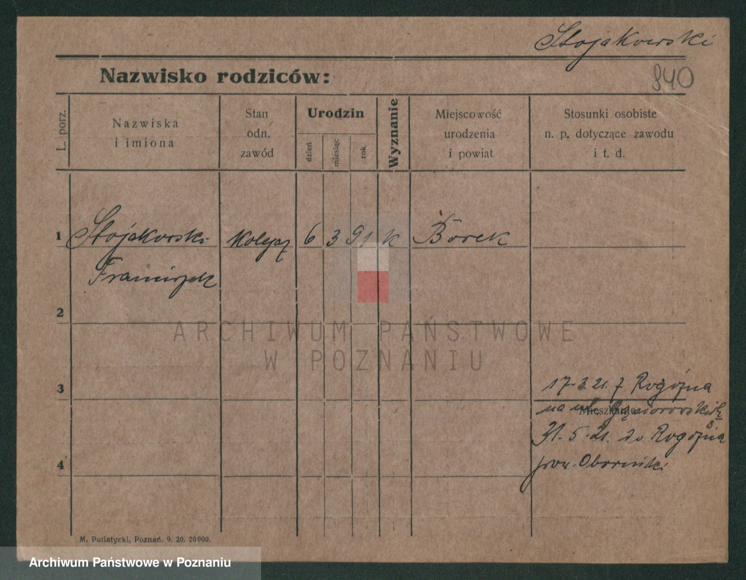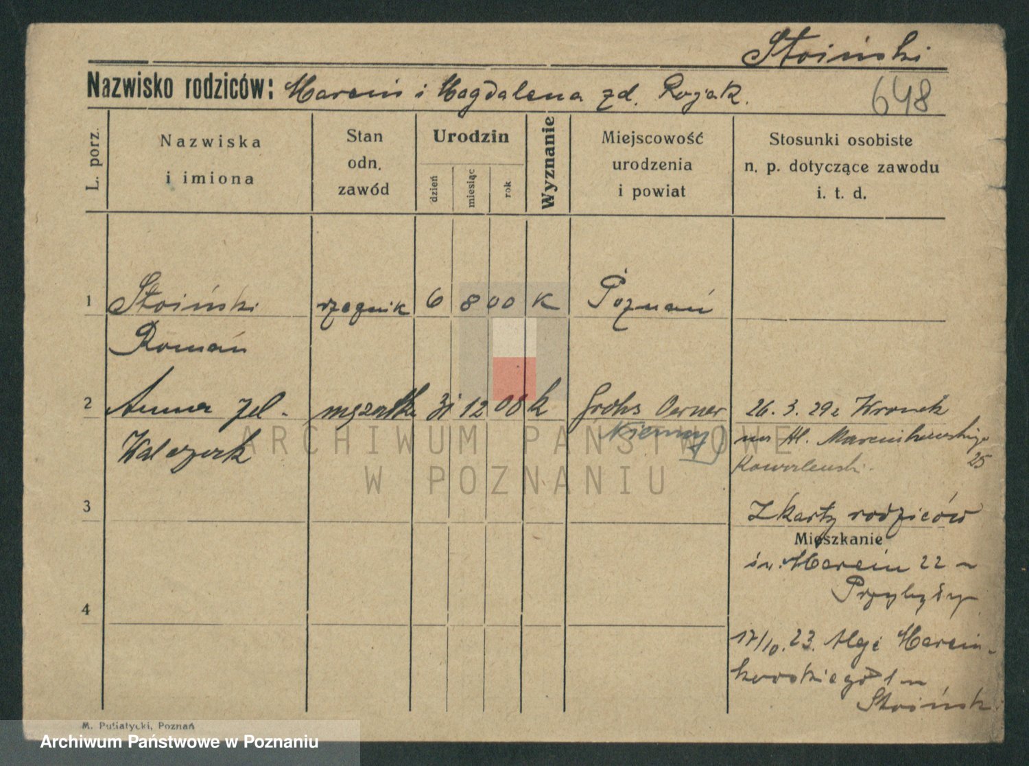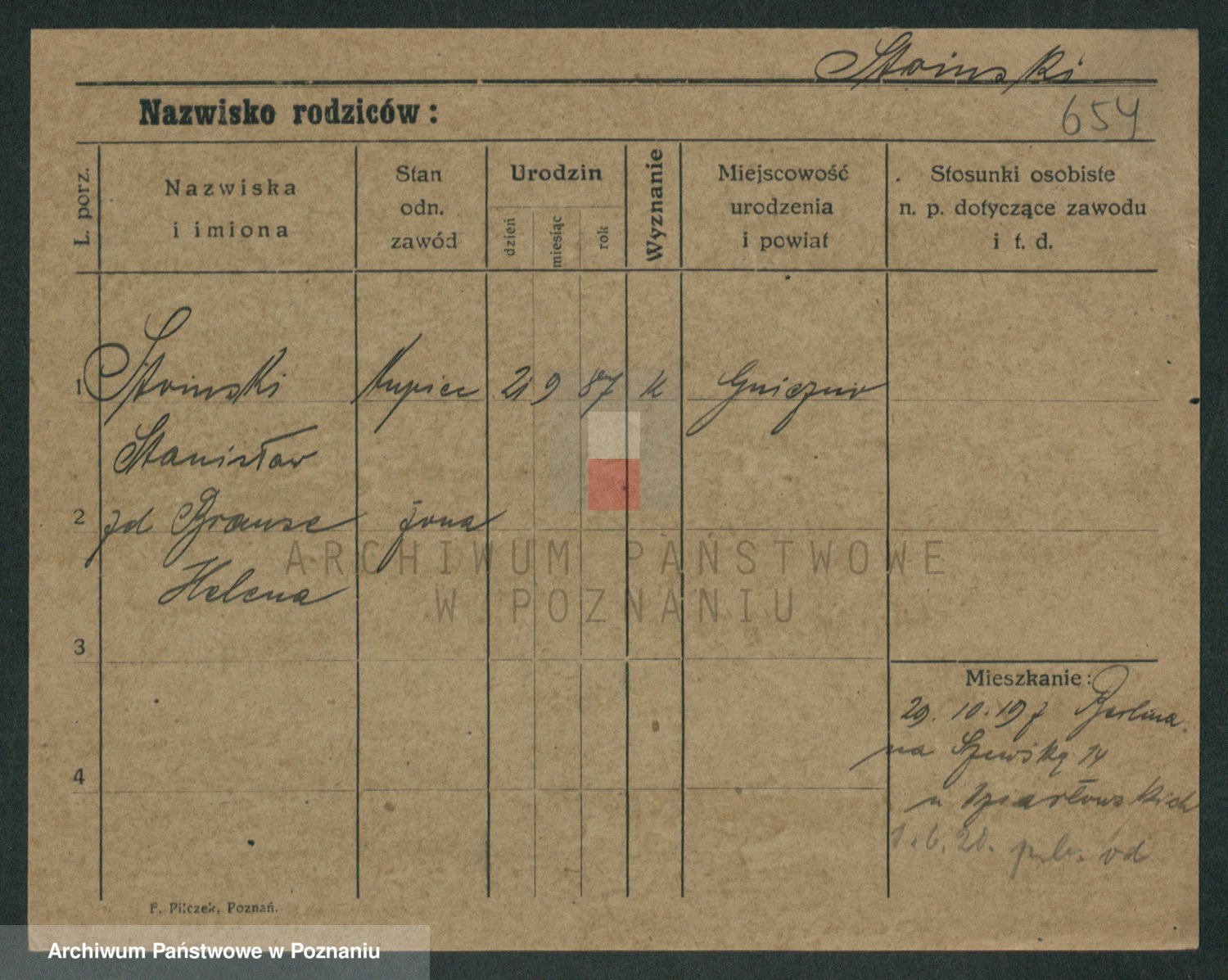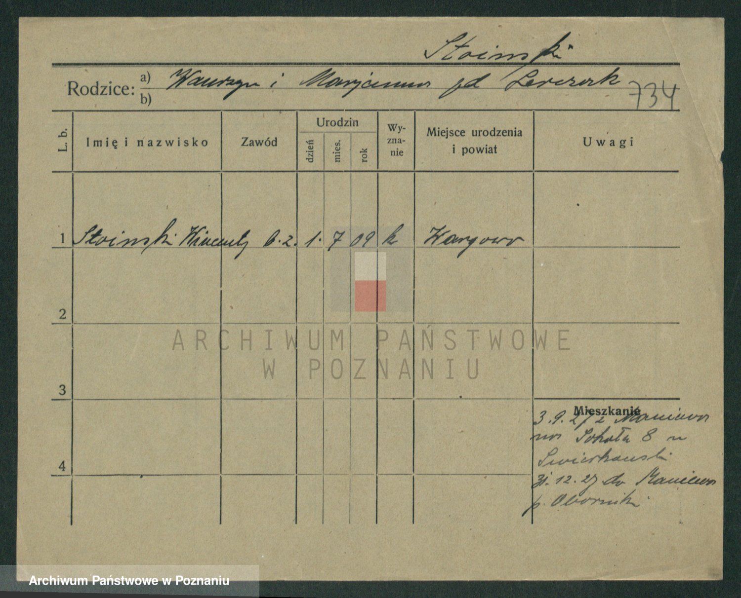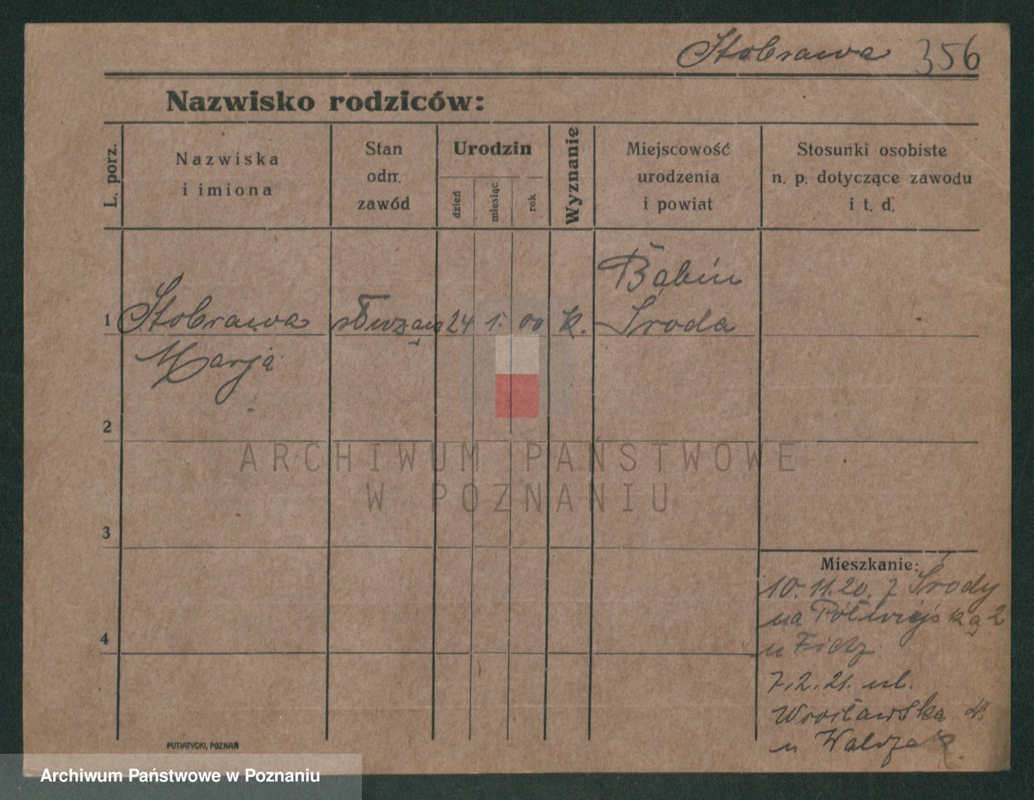Podgląd karty osobowej dostępny jest po kliknięciu na nazwisko lub ikonkę karty. Można dokonywać powiększenia (ikony na górze) lub przechodzić między kolejnymi skanami (strzałki po bokach).