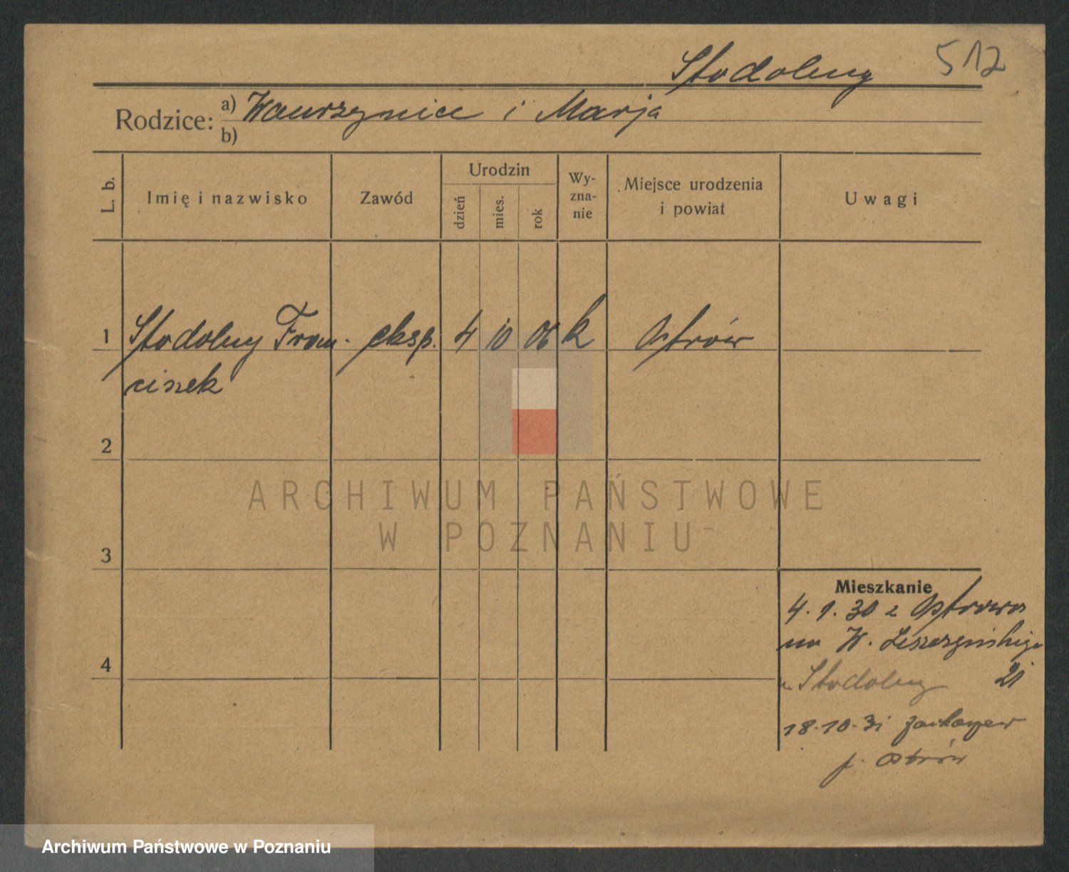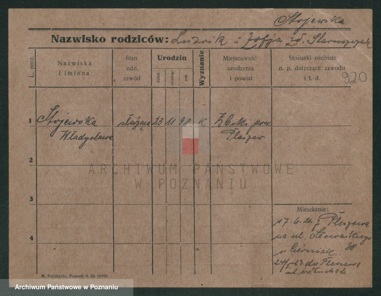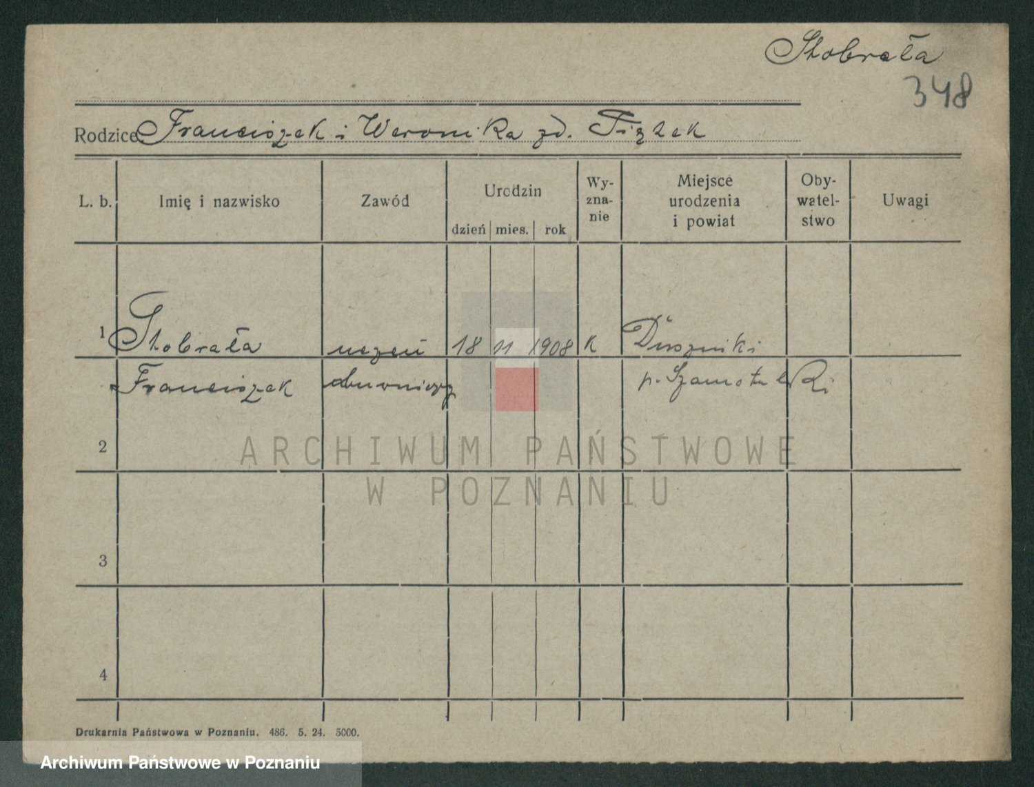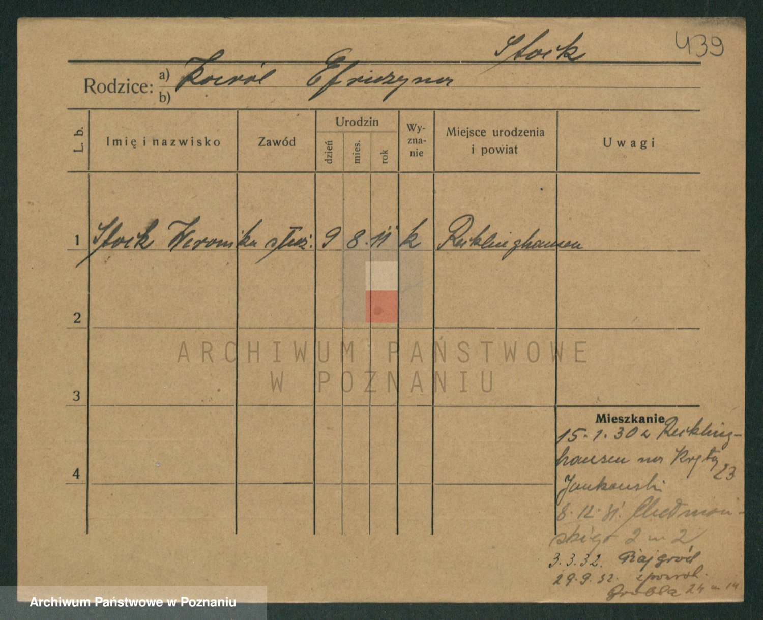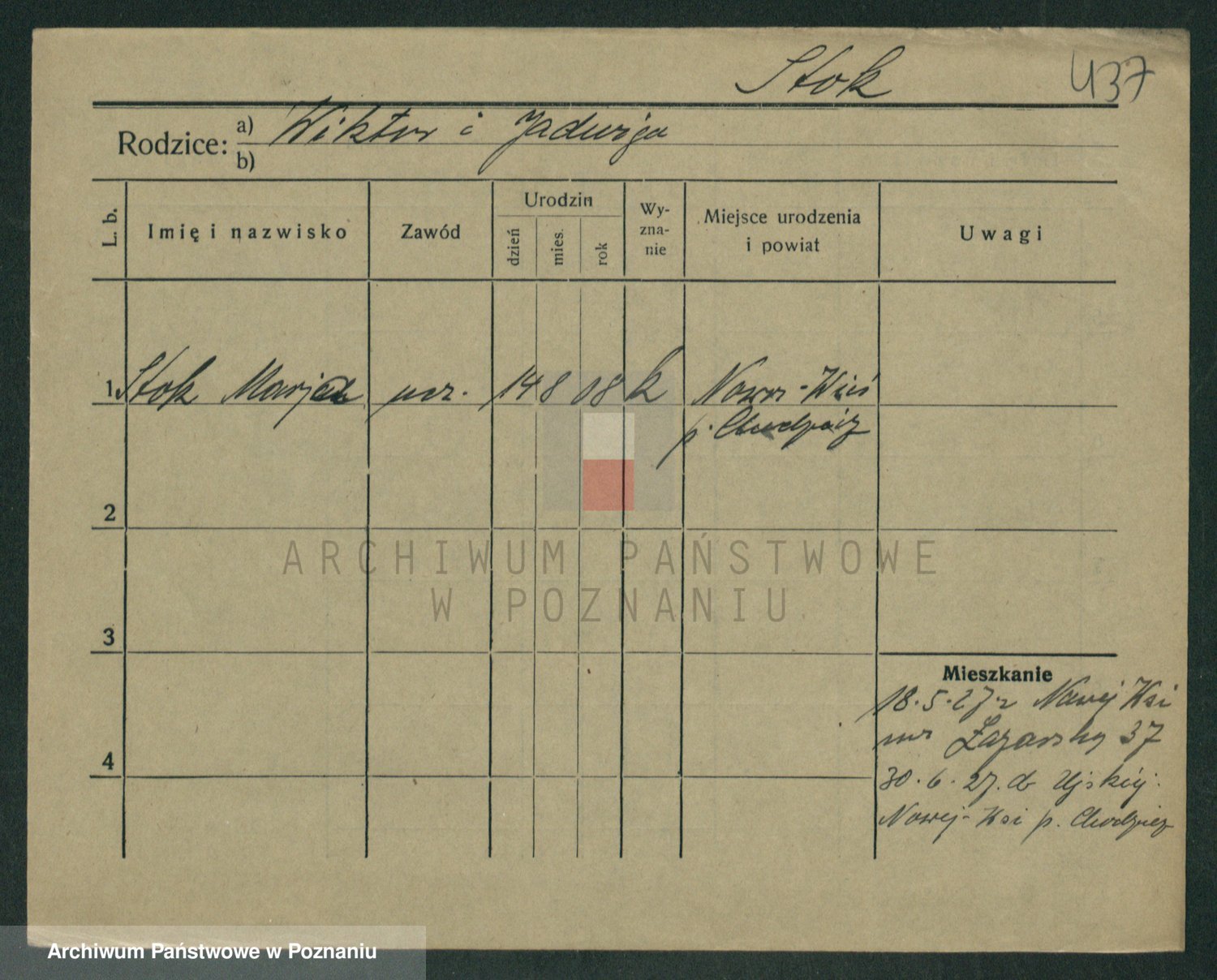 Podgląd karty osobowej dostępny jest po kliknięciu na nazwisko lub ikonkę karty. Można dokonywać powiększenia (ikony na górze) lub przechodzić między kolejnymi skanami (strzałki po bokach).