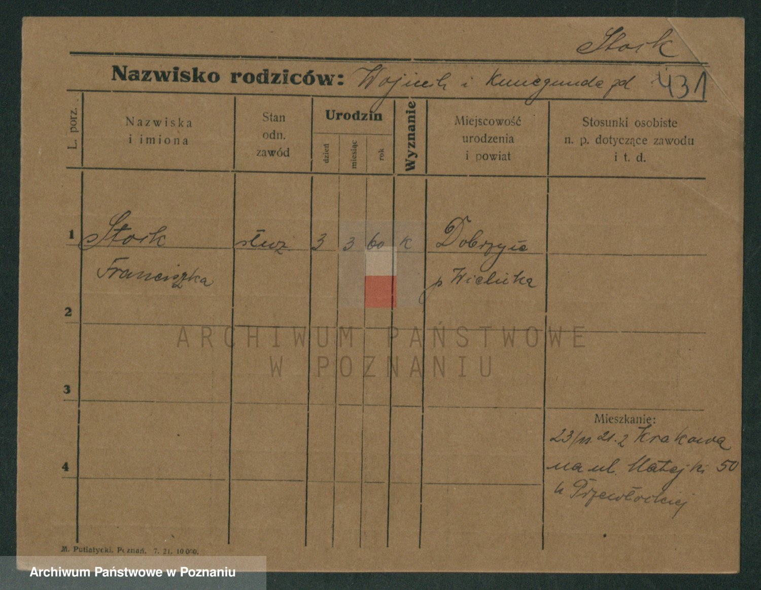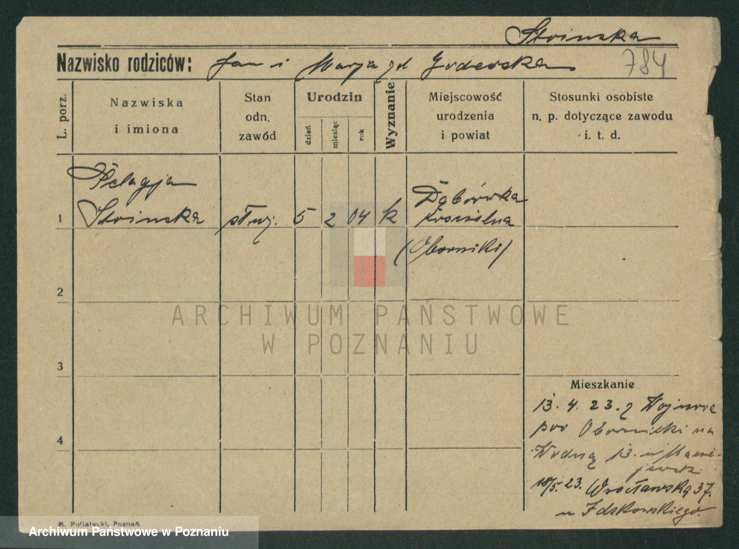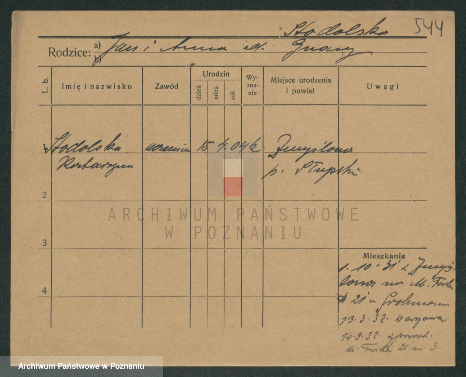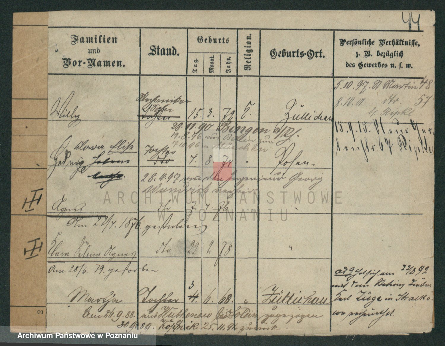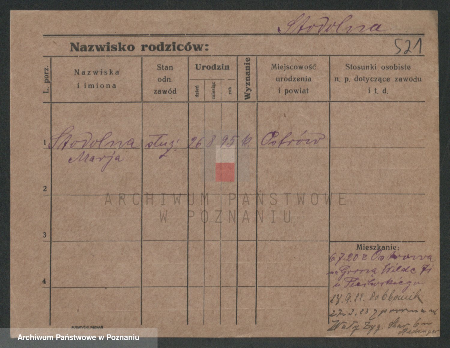 Podgląd karty osobowej dostępny jest po kliknięciu na nazwisko lub ikonkę karty. Można dokonywać powiększenia (ikony na górze) lub przechodzić między kolejnymi skanami (strzałki po bokach).