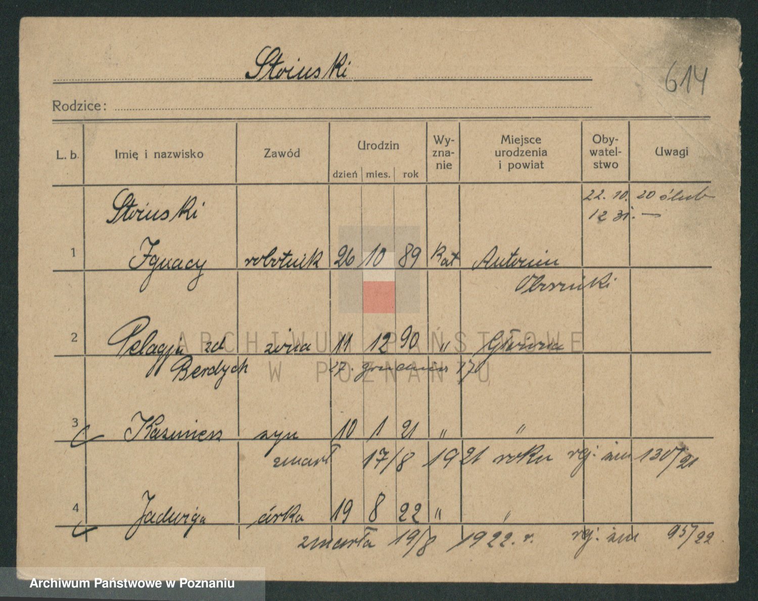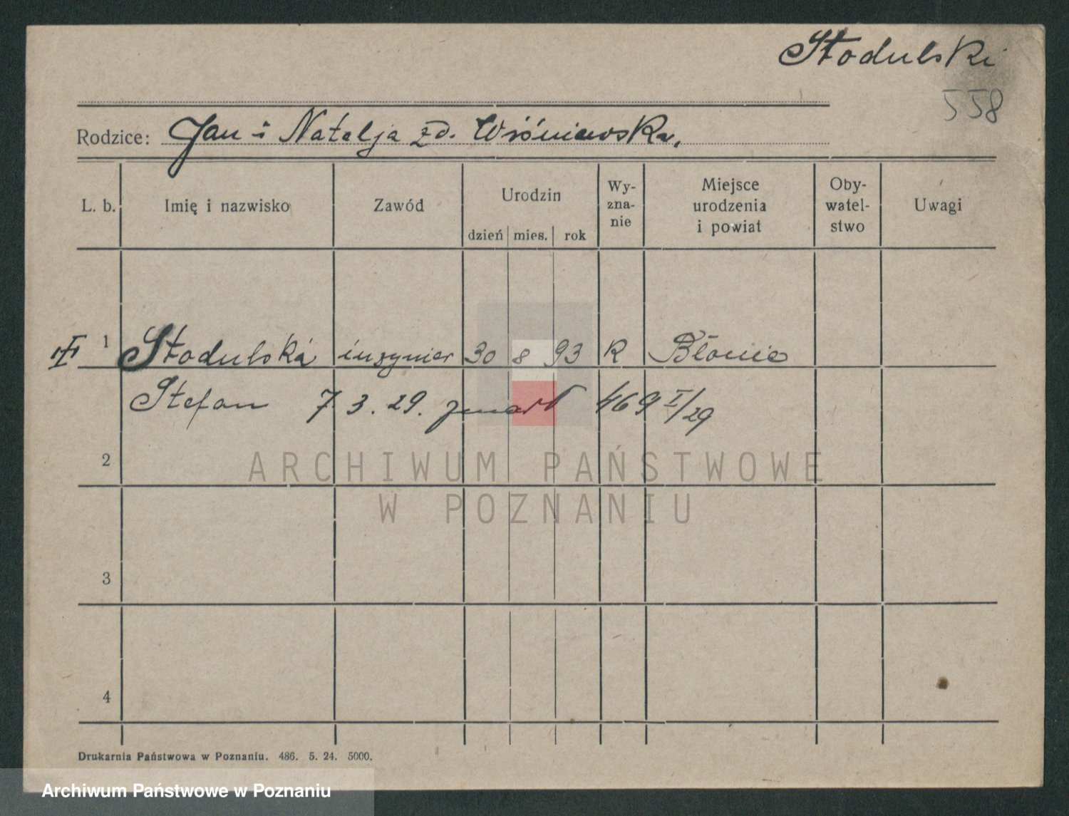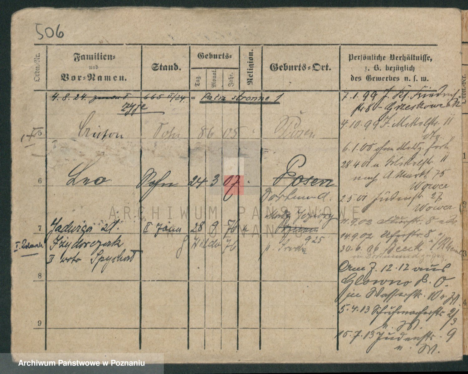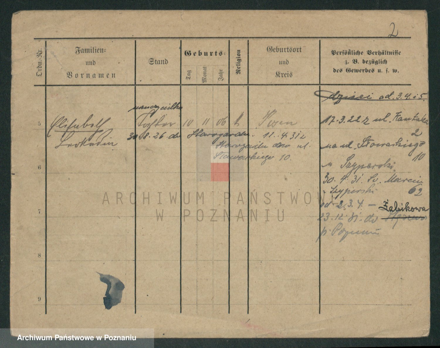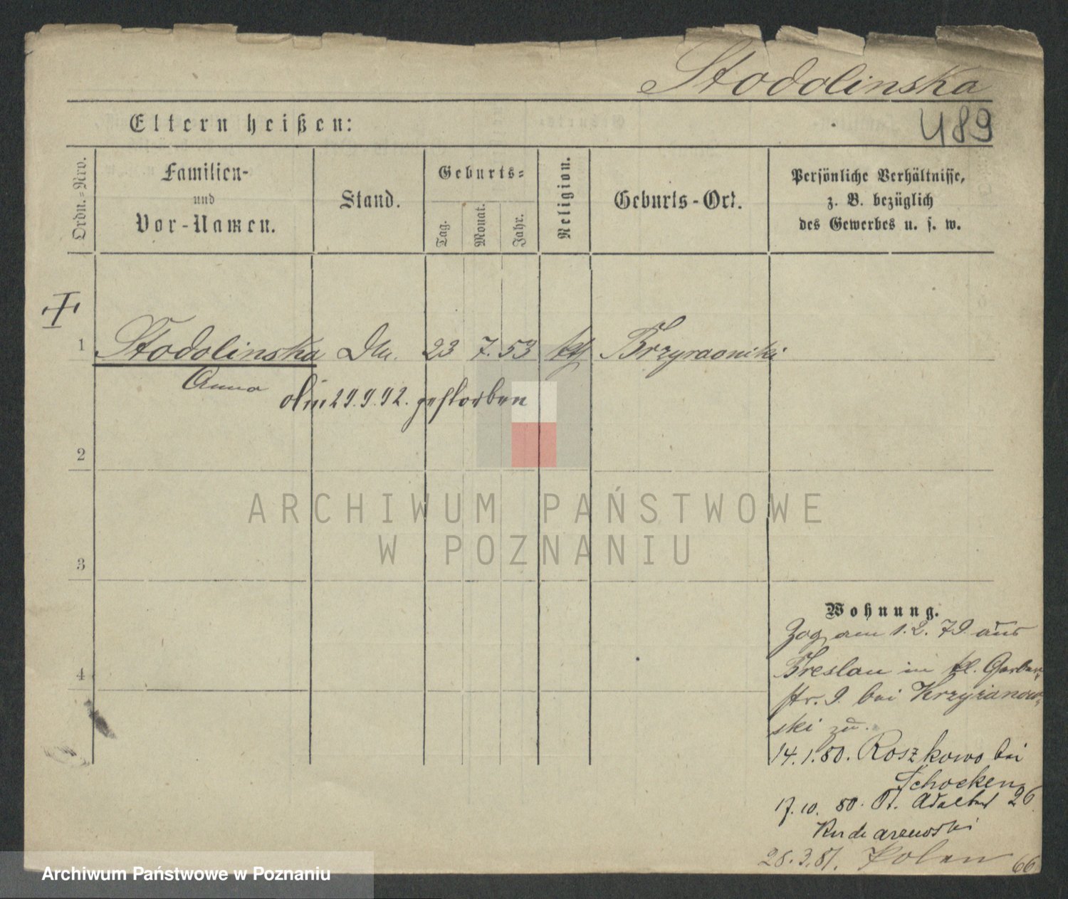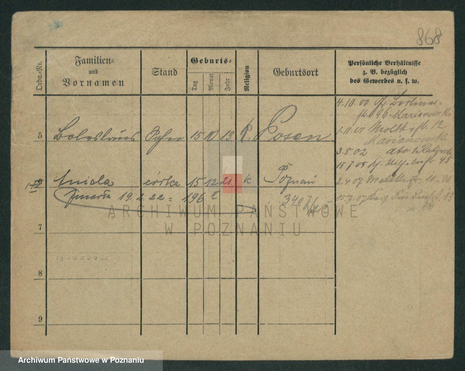 Podgląd karty osobowej dostępny jest po kliknięciu na nazwisko lub ikonkę karty. Można dokonywać powiększenia (ikony na górze) lub przechodzić między kolejnymi skanami (strzałki po bokach).
