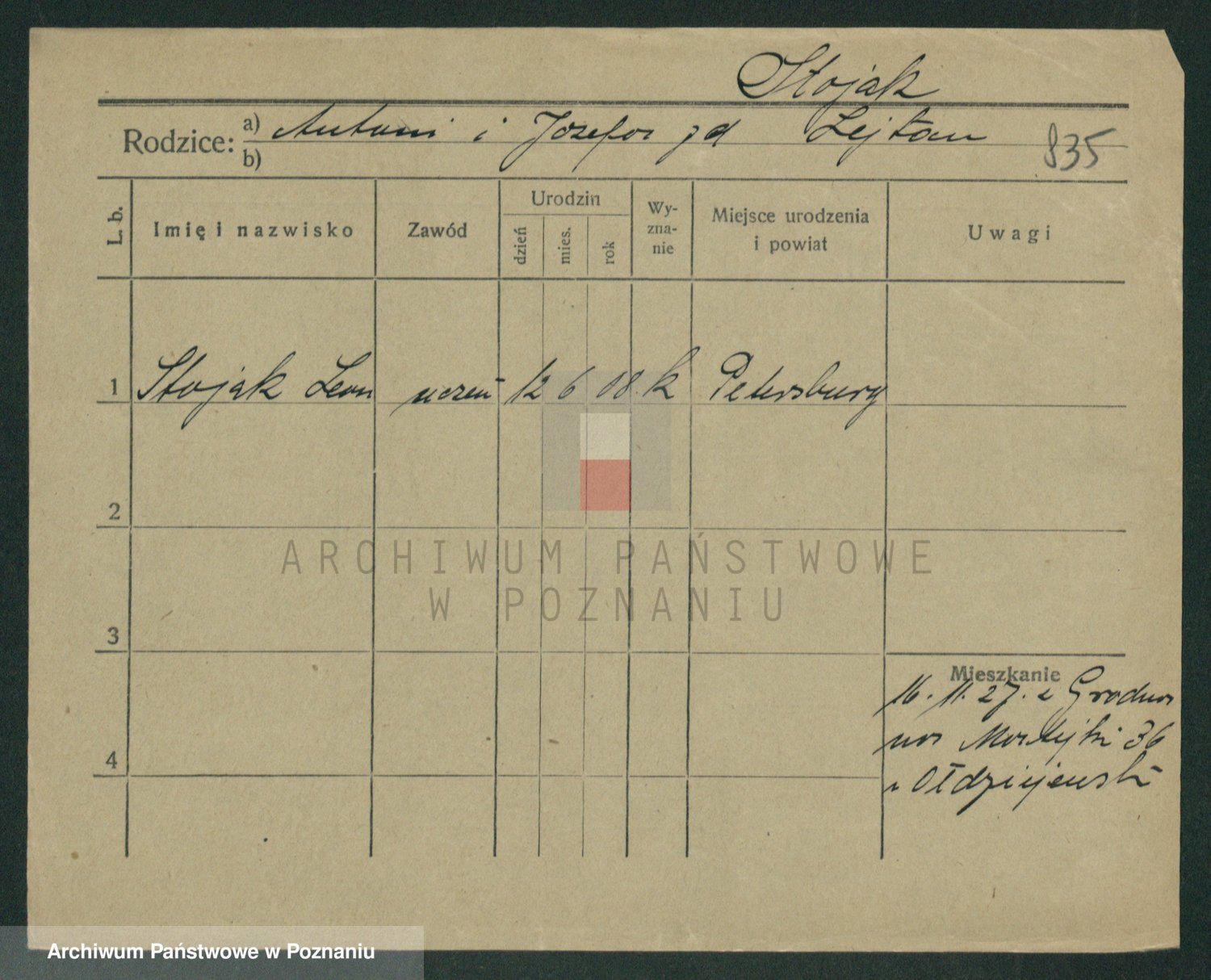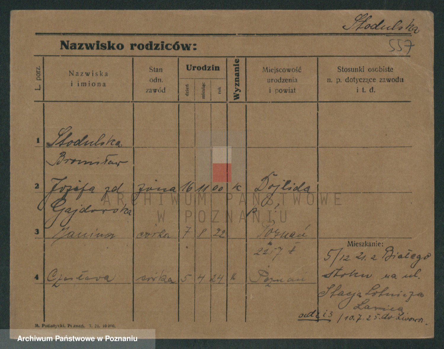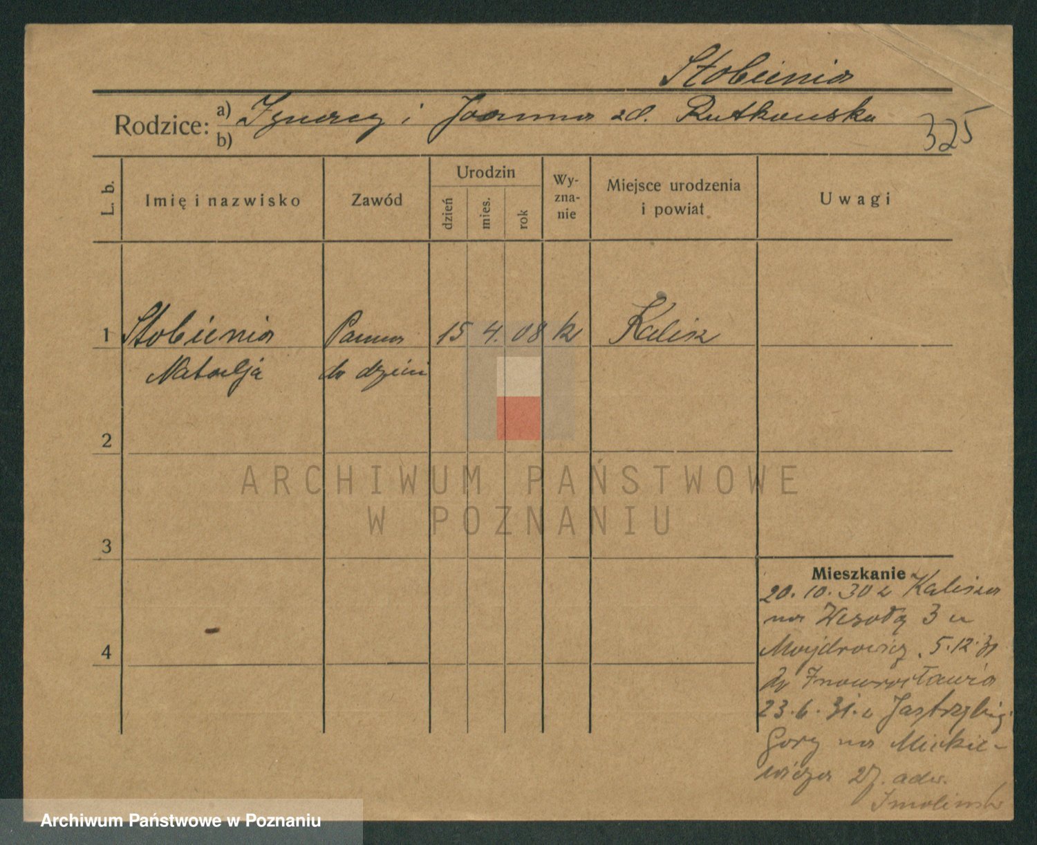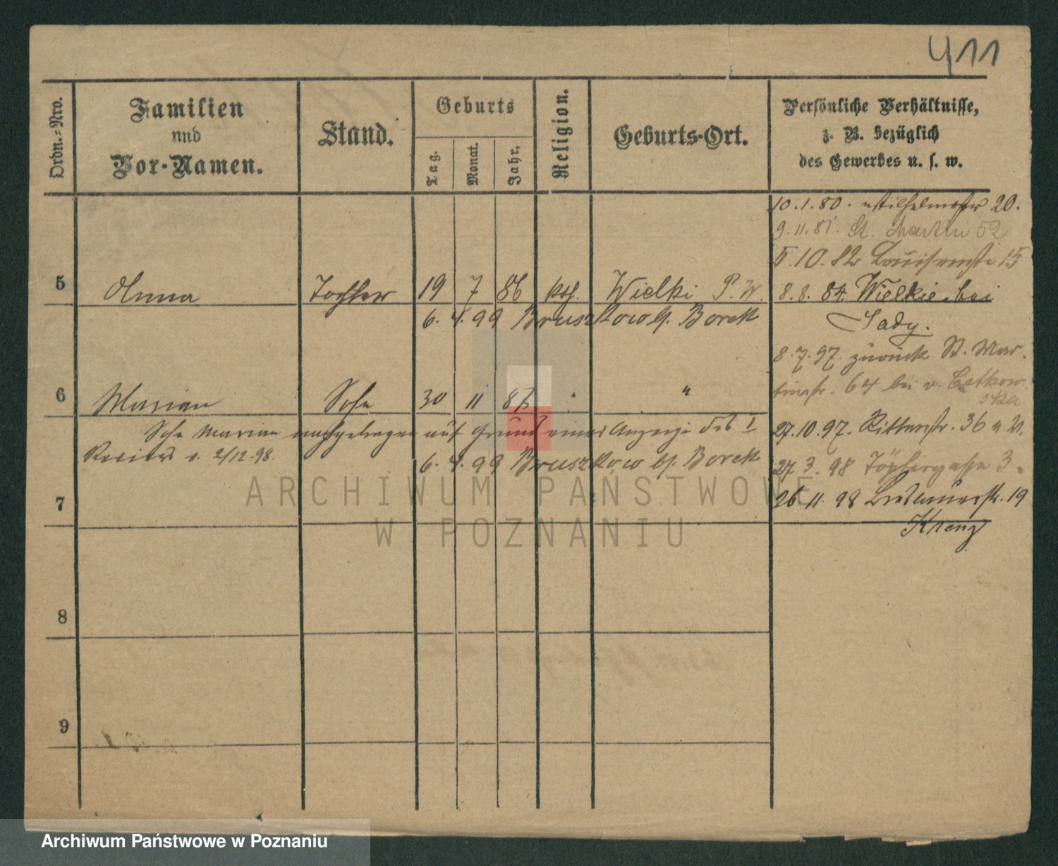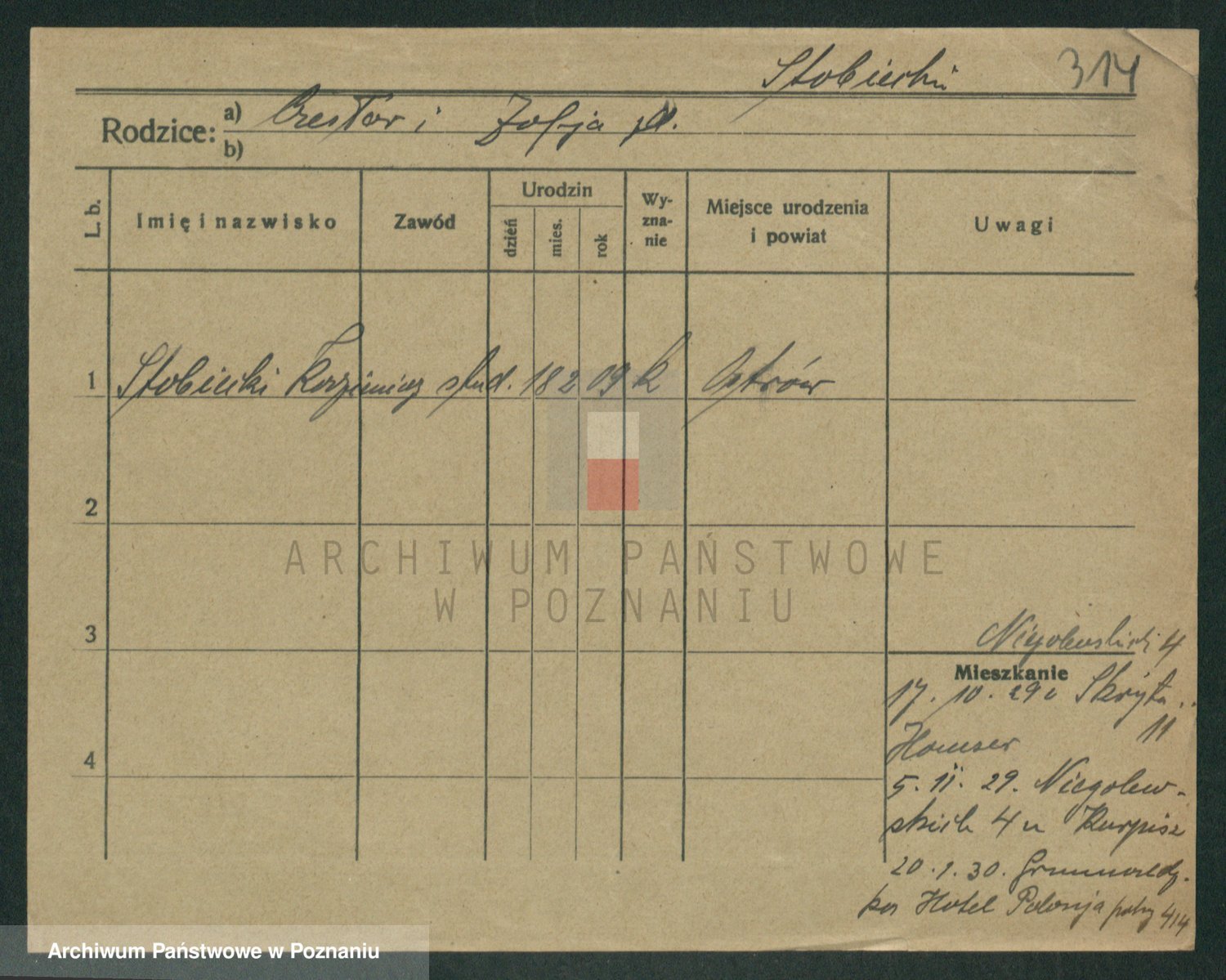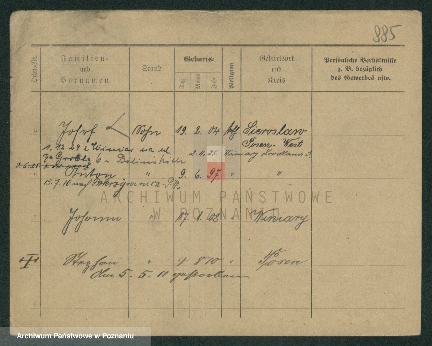 Podgląd karty osobowej dostępny jest po kliknięciu na nazwisko lub ikonkę karty. Można dokonywać powiększenia (ikony na górze) lub przechodzić między kolejnymi skanami (strzałki po bokach).
