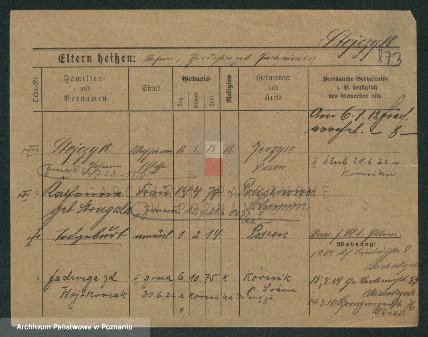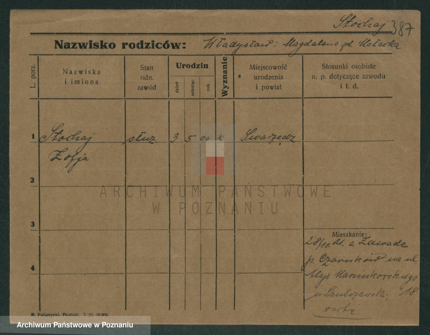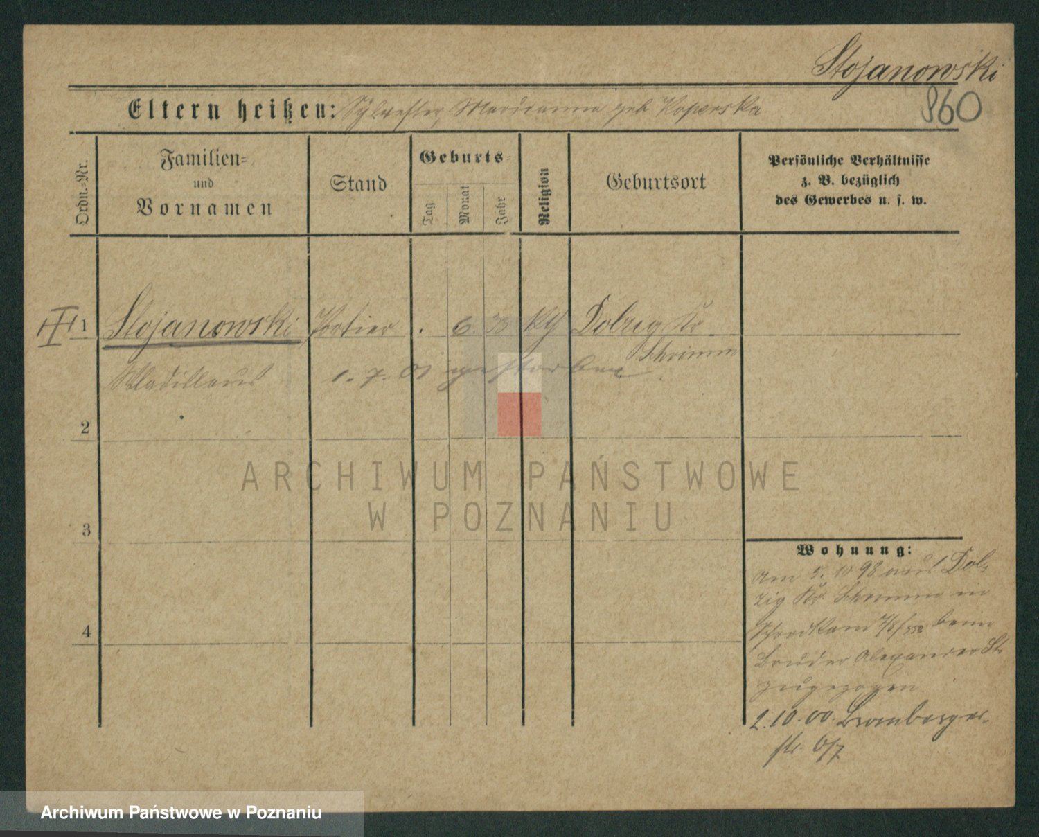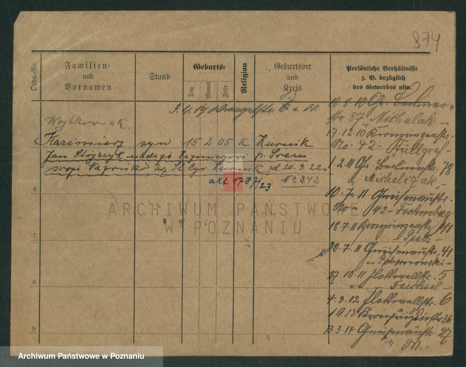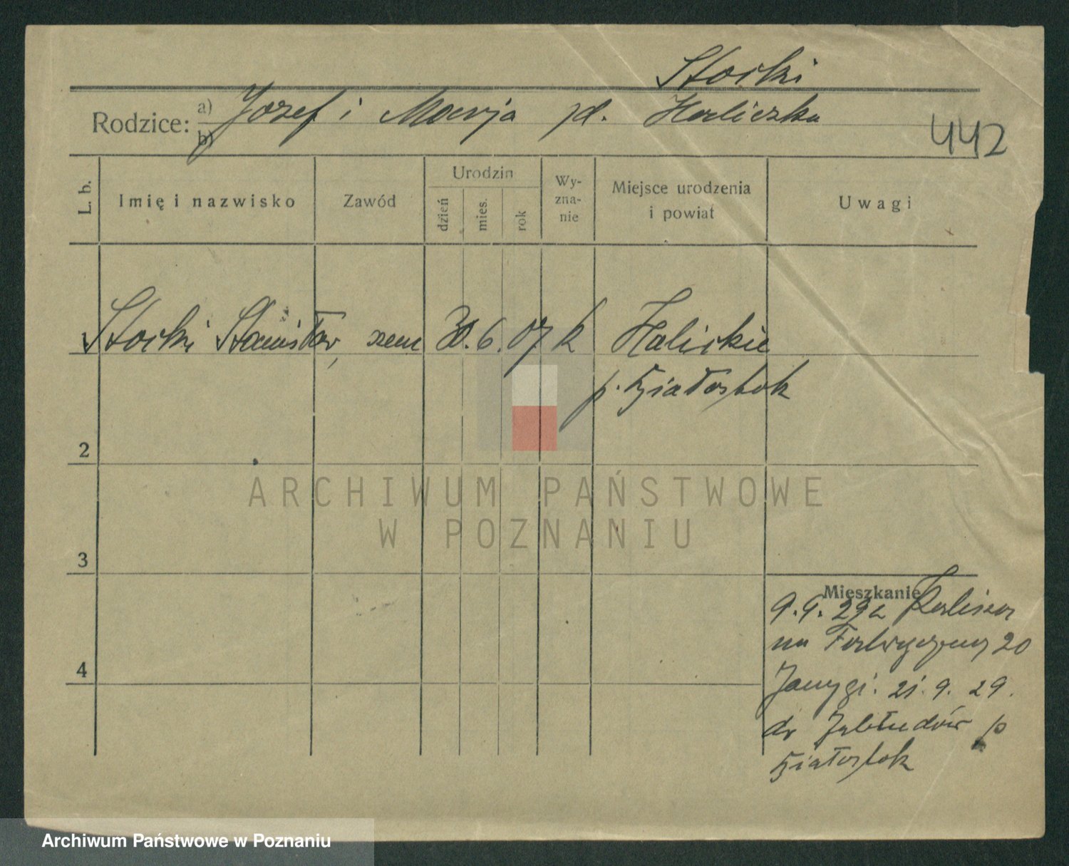 Podgląd karty osobowej dostępny jest po kliknięciu na nazwisko lub ikonkę karty. Można dokonywać powiększenia (ikony na górze) lub przechodzić między kolejnymi skanami (strzałki po bokach).