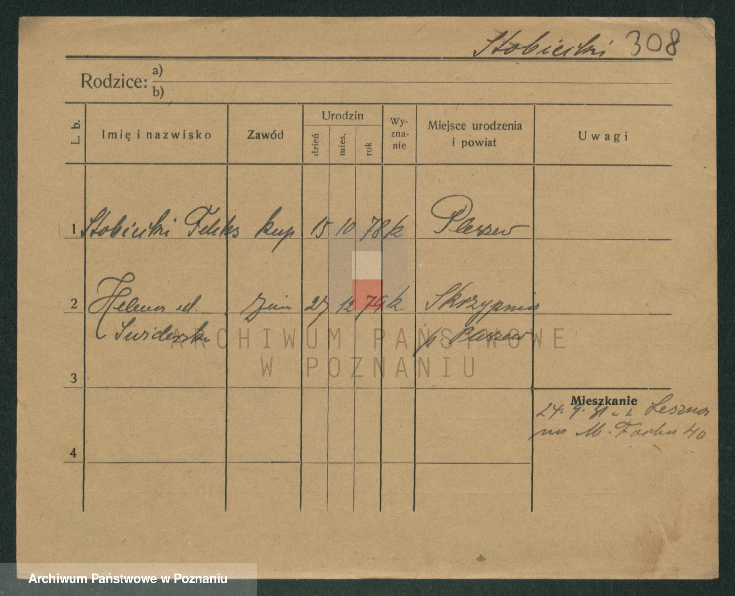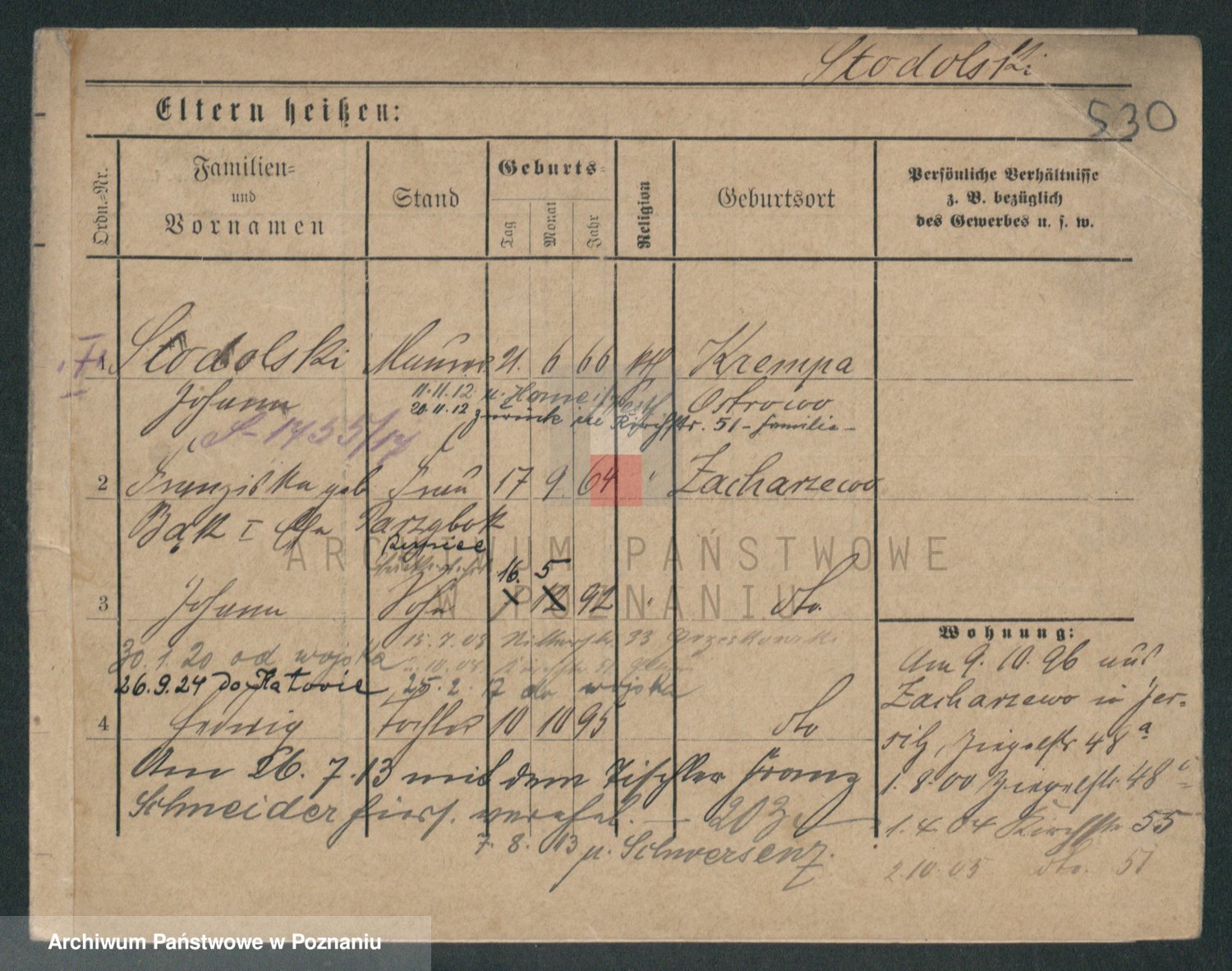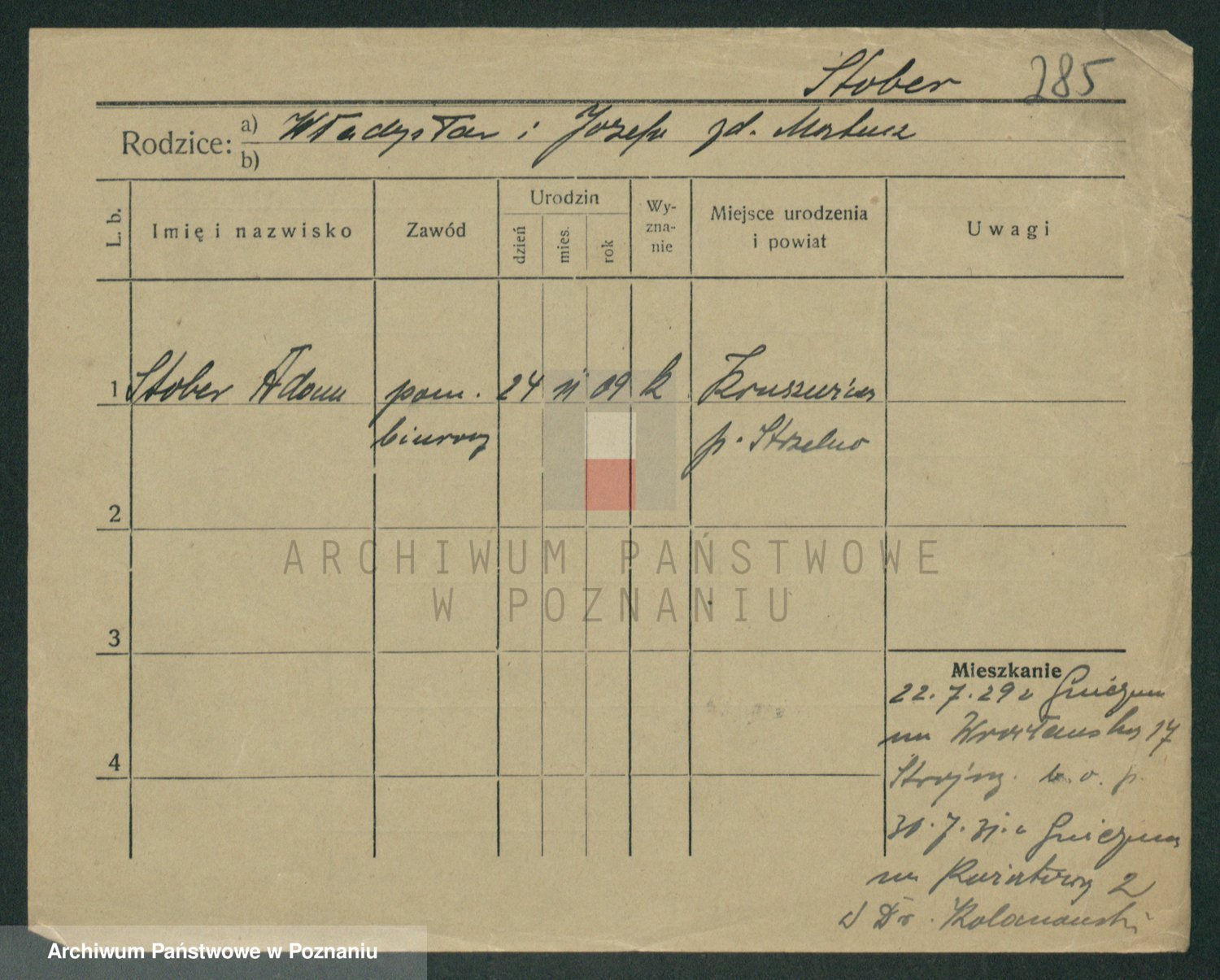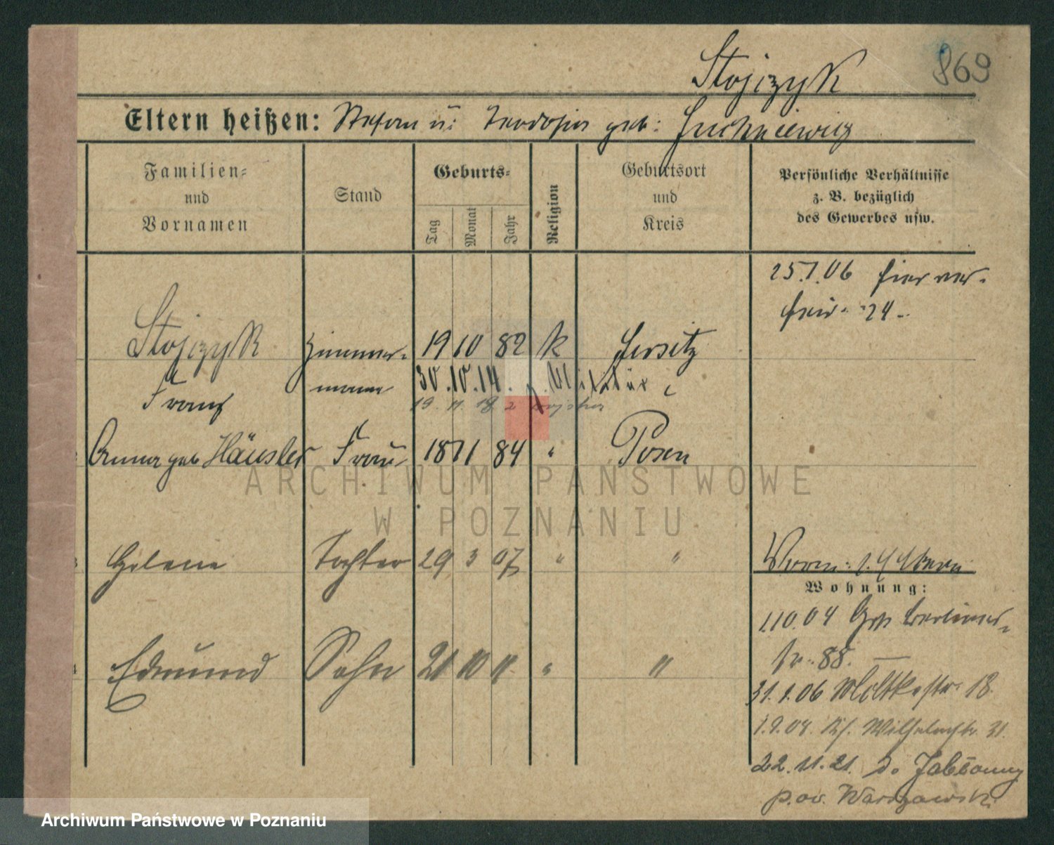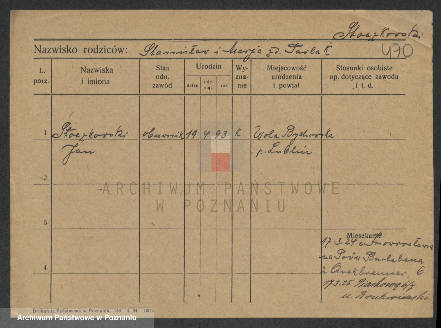 Podgląd karty osobowej dostępny jest po kliknięciu na nazwisko lub ikonkę karty. Można dokonywać powiększenia (ikony na górze) lub przechodzić między kolejnymi skanami (strzałki po bokach).