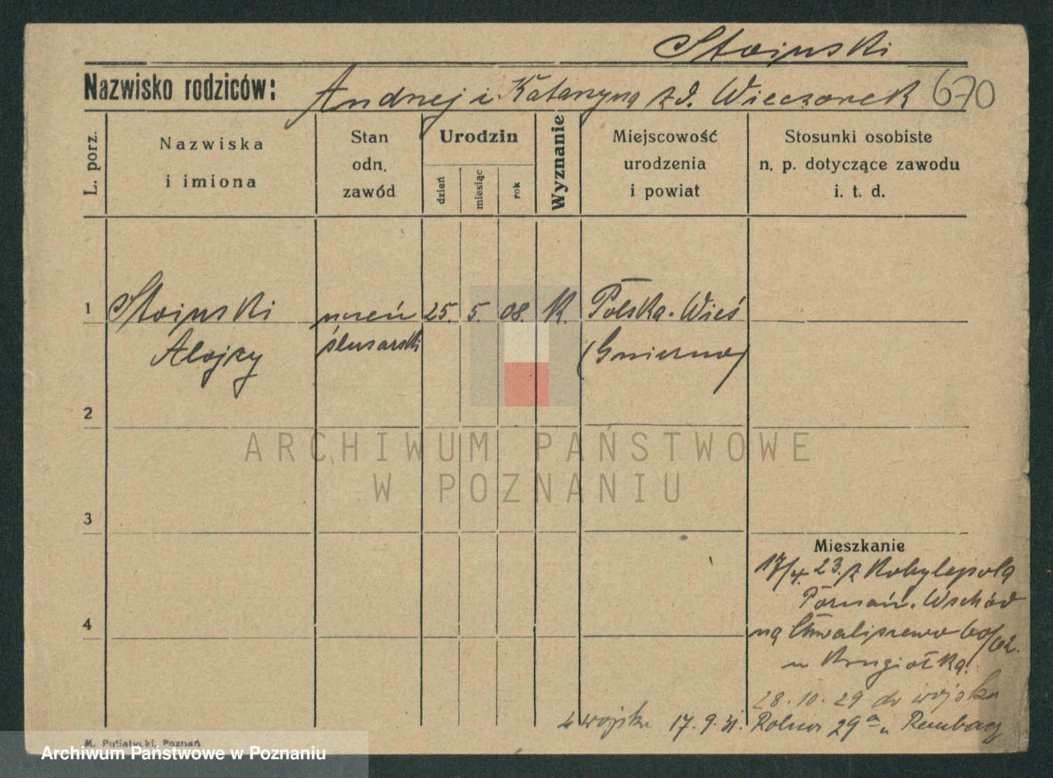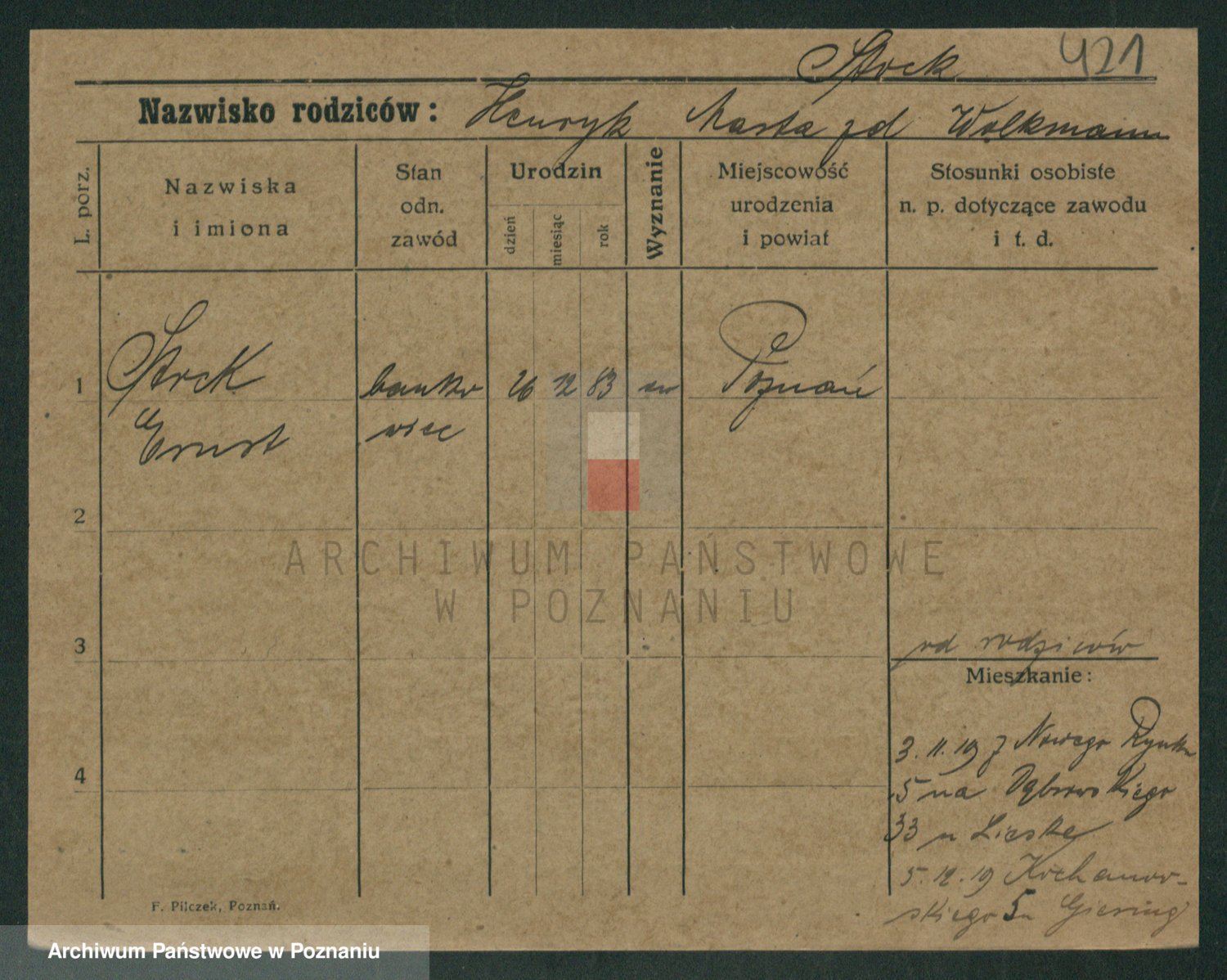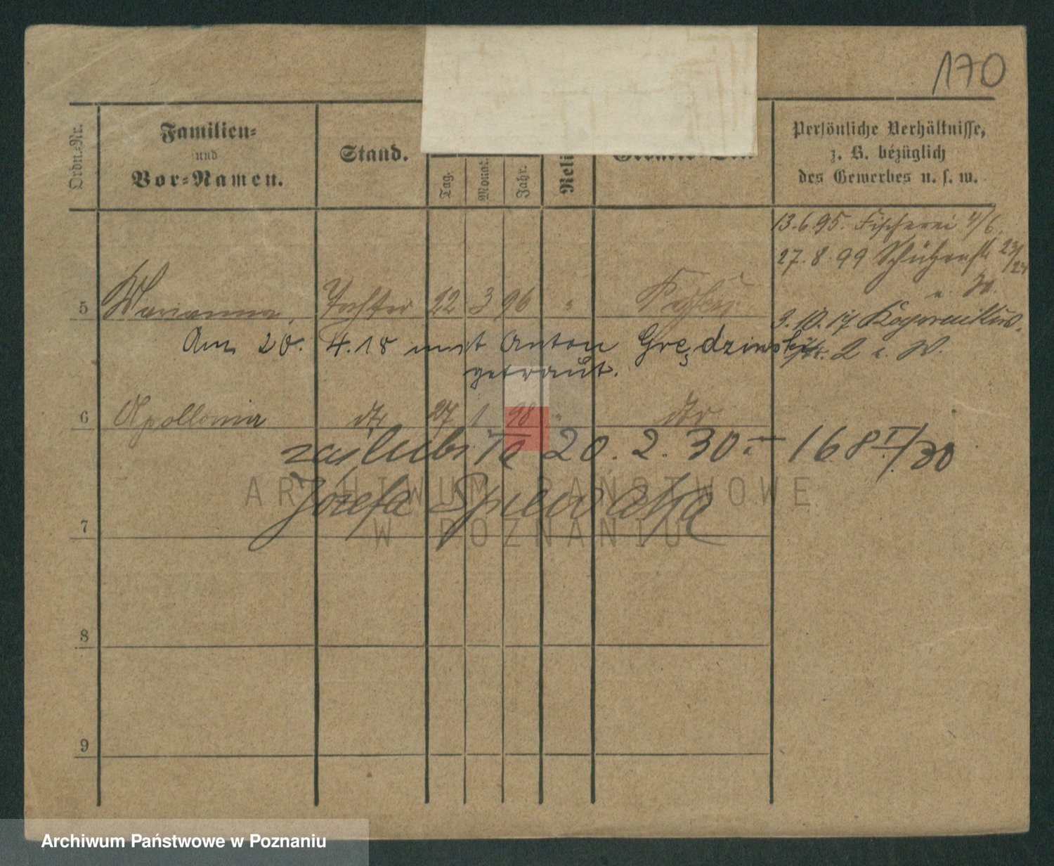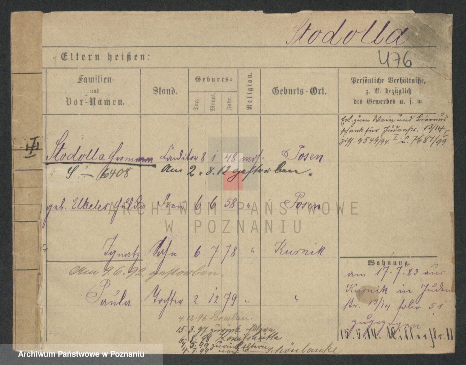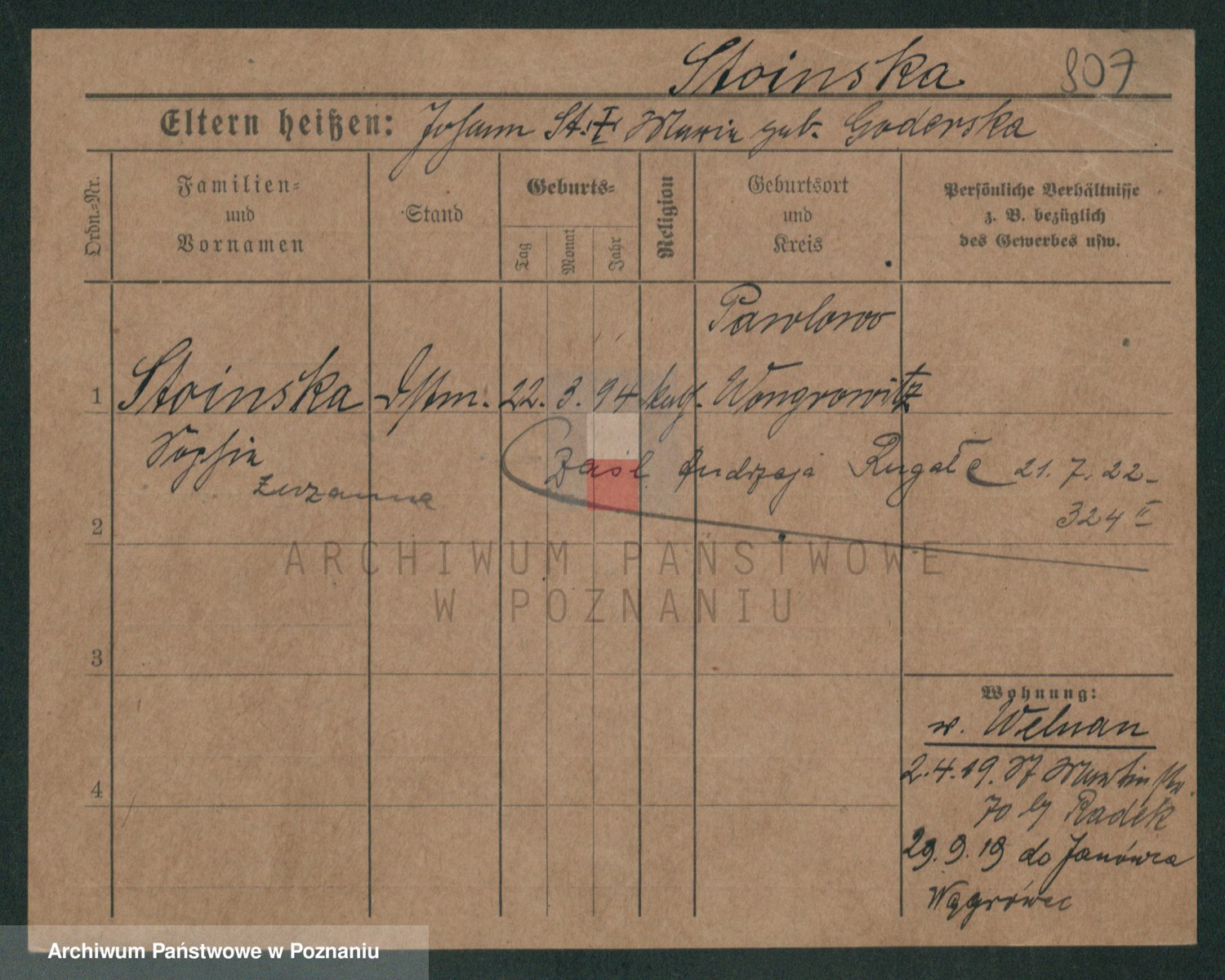 Podgląd karty osobowej dostępny jest po kliknięciu na nazwisko lub ikonkę karty. Można dokonywać powiększenia (ikony na górze) lub przechodzić między kolejnymi skanami (strzałki po bokach).