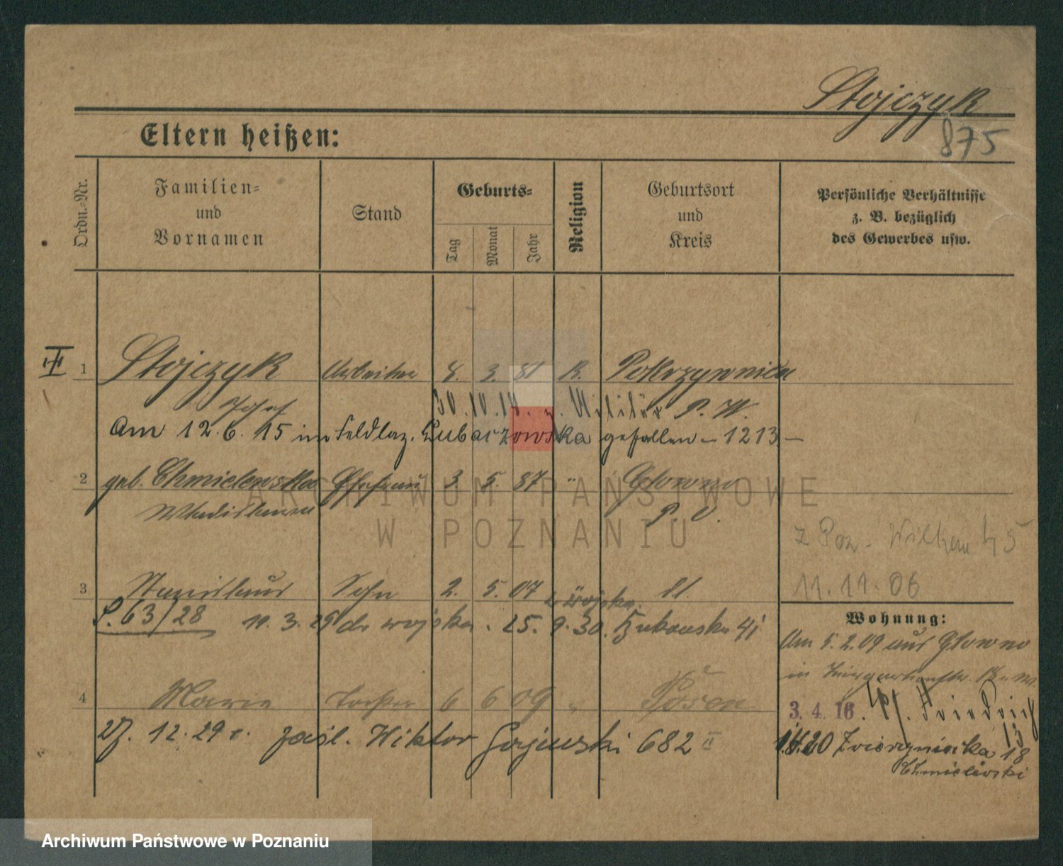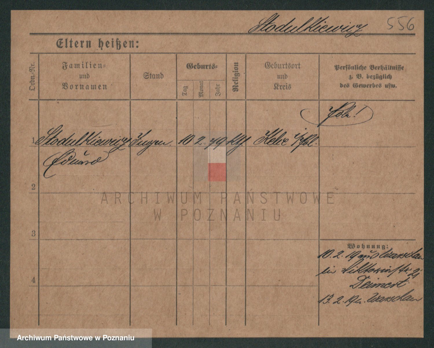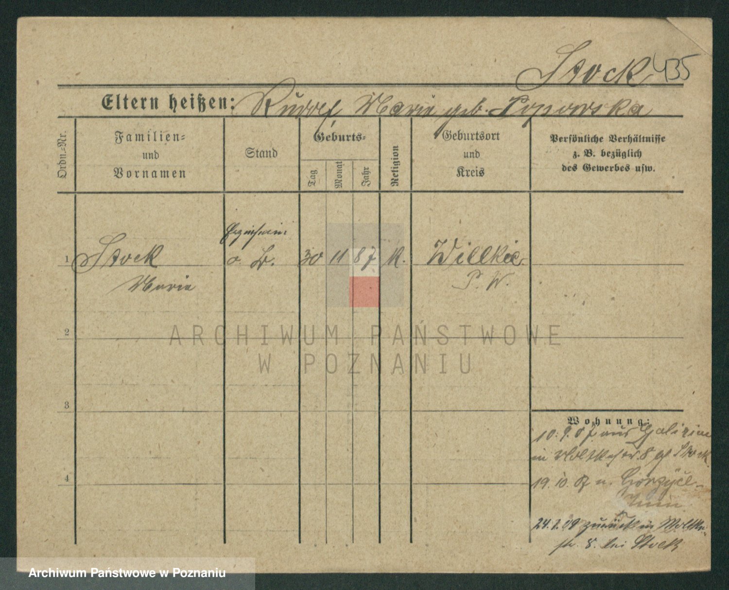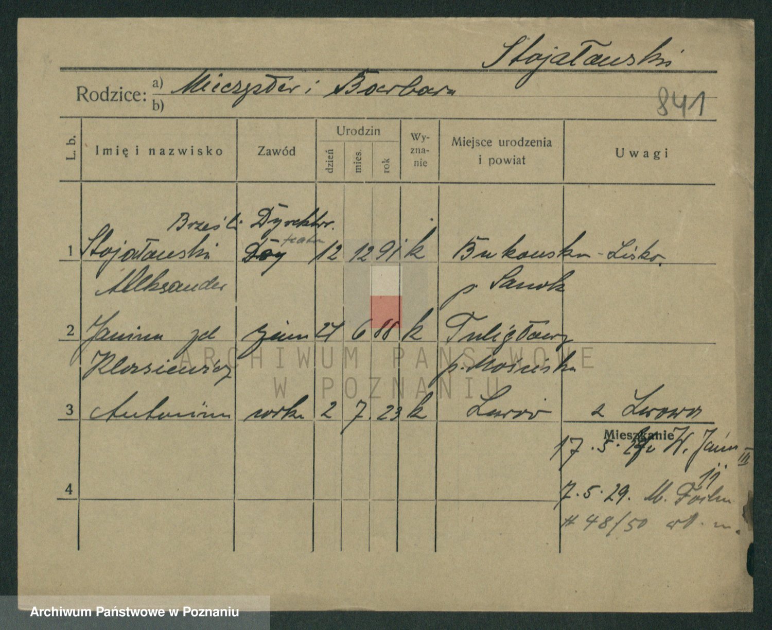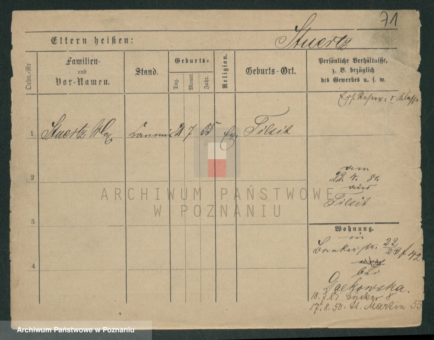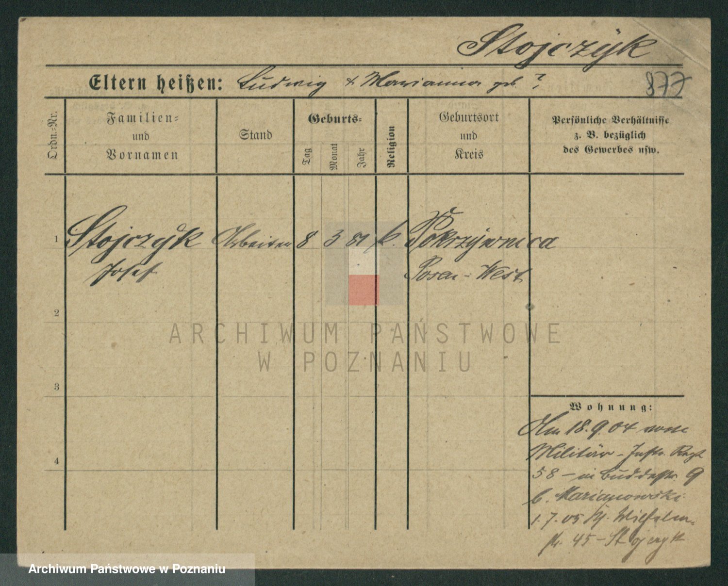 Podgląd karty osobowej dostępny jest po kliknięciu na nazwisko lub ikonkę karty. Można dokonywać powiększenia (ikony na górze) lub przechodzić między kolejnymi skanami (strzałki po bokach).