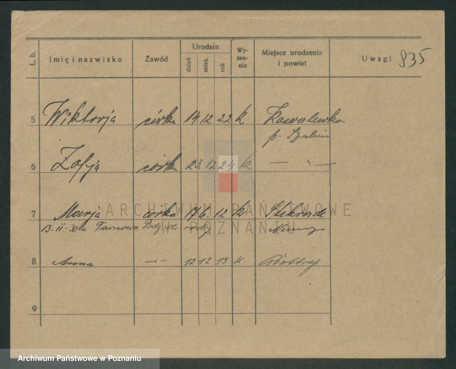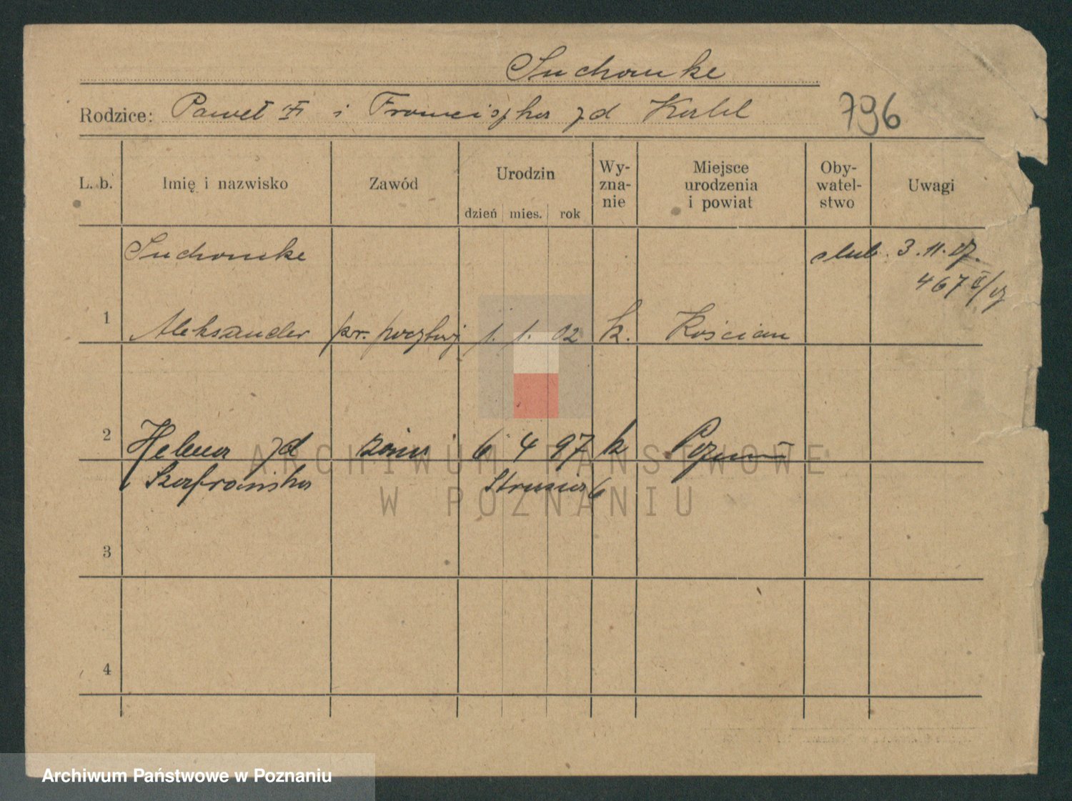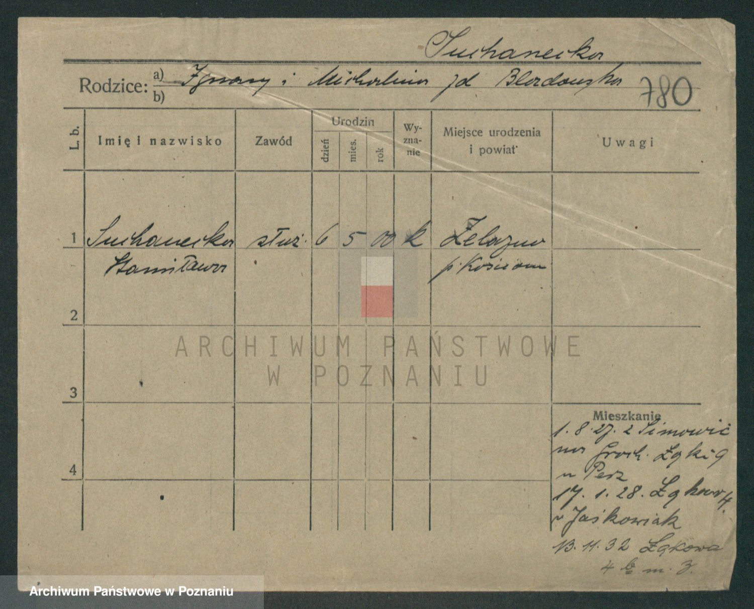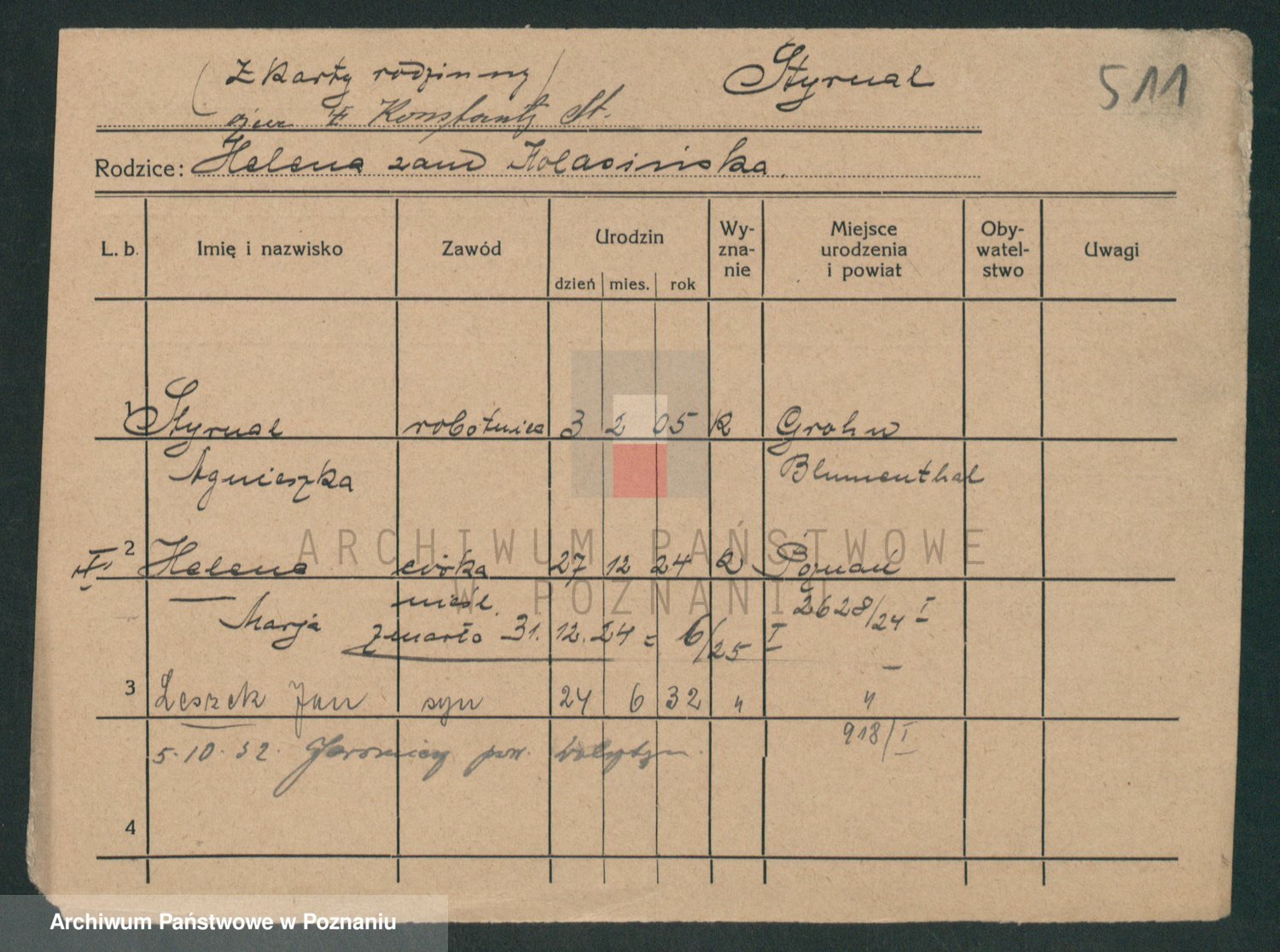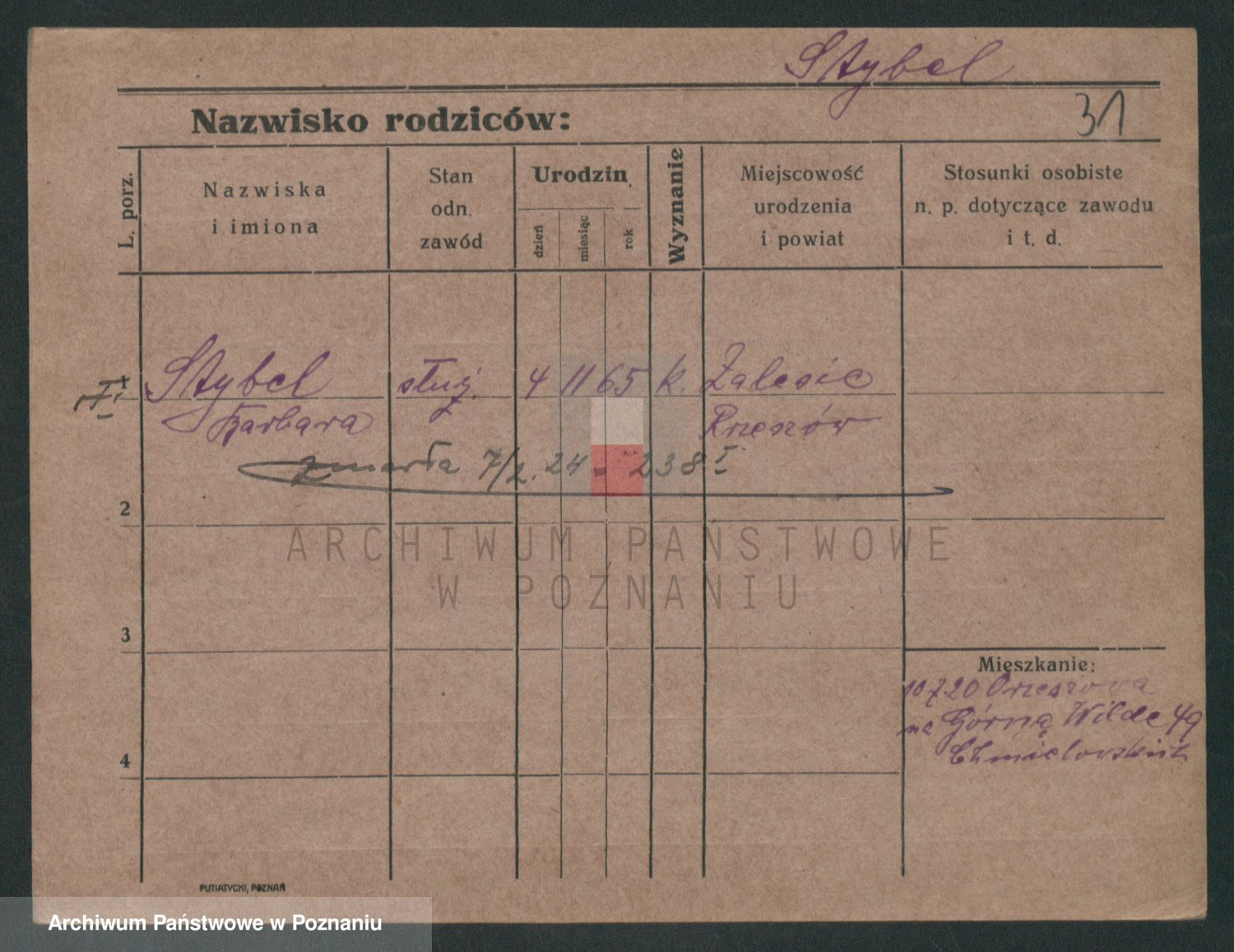 Podgląd karty osobowej dostępny jest po kliknięciu na nazwisko lub ikonkę karty. Można dokonywać powiększenia (ikony na górze) lub przechodzić między kolejnymi skanami (strzałki po bokach).