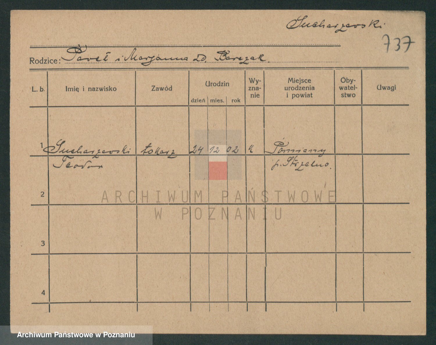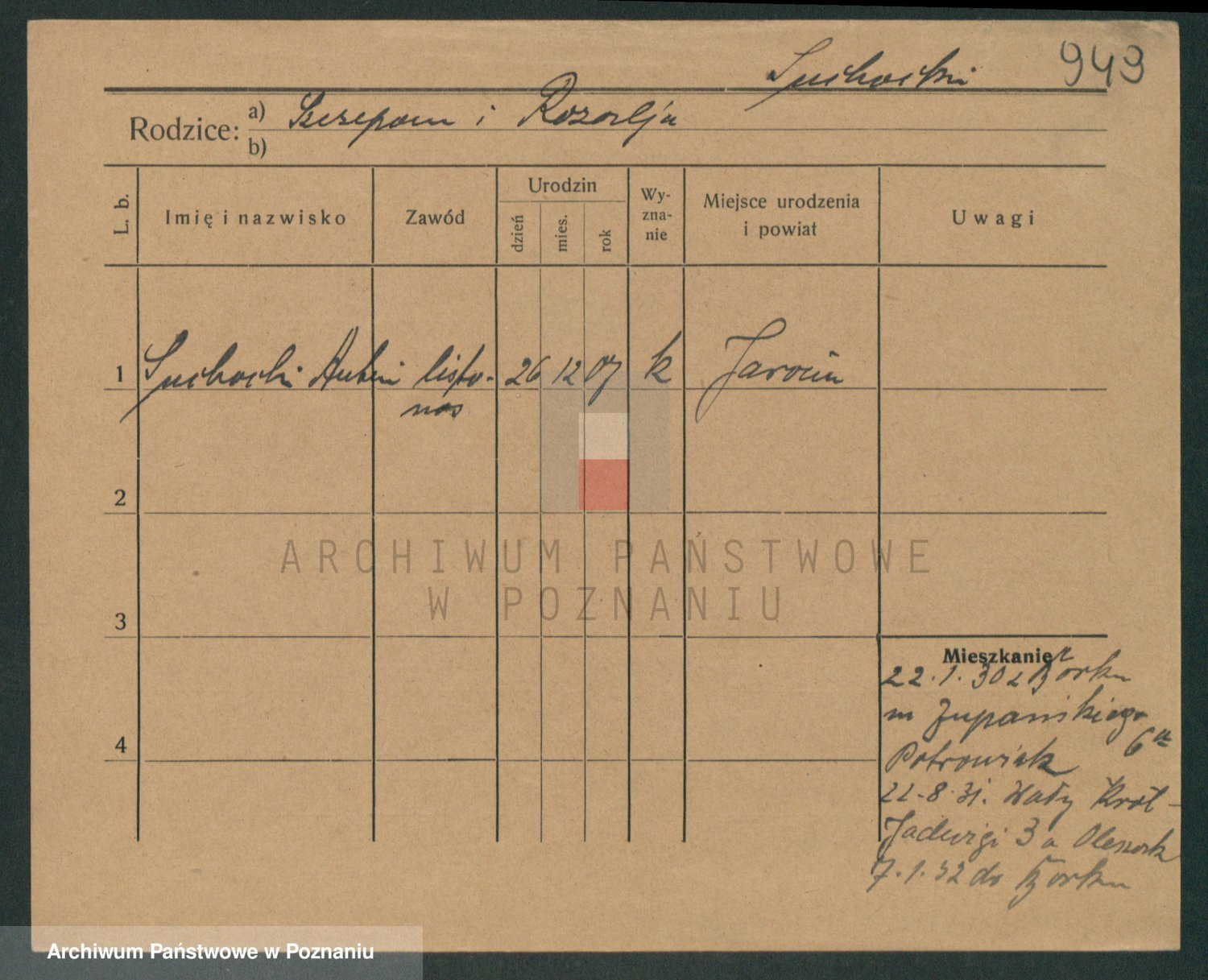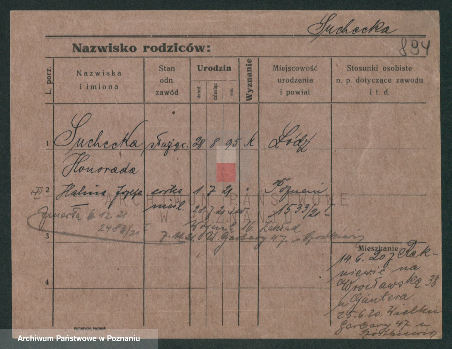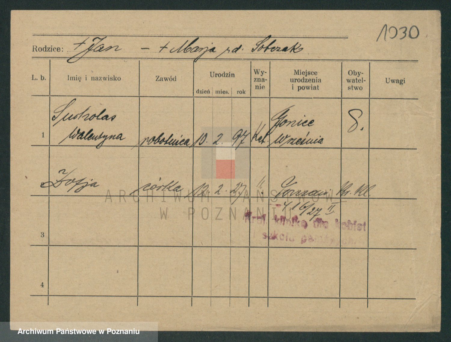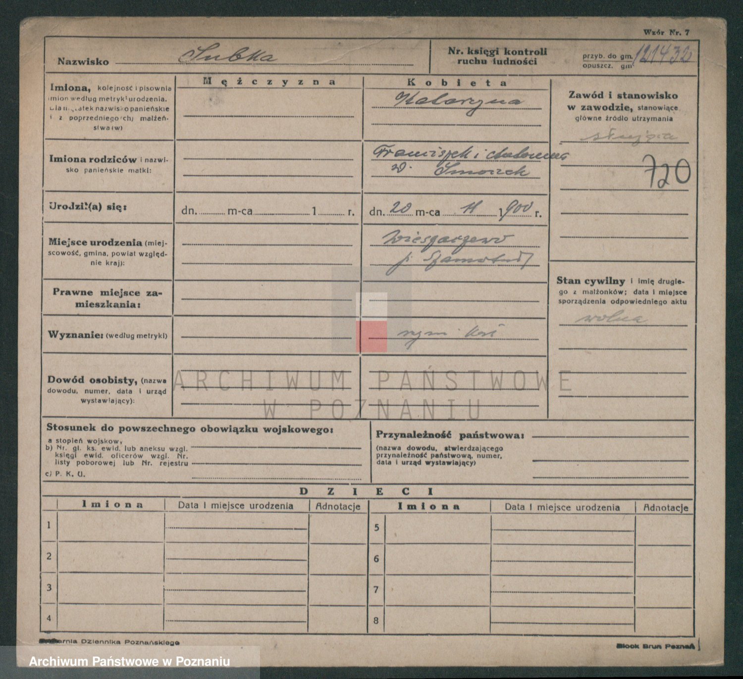 Podgląd karty osobowej dostępny jest po kliknięciu na nazwisko lub ikonkę karty. Można dokonywać powiększenia (ikony na górze) lub przechodzić między kolejnymi skanami (strzałki po bokach).