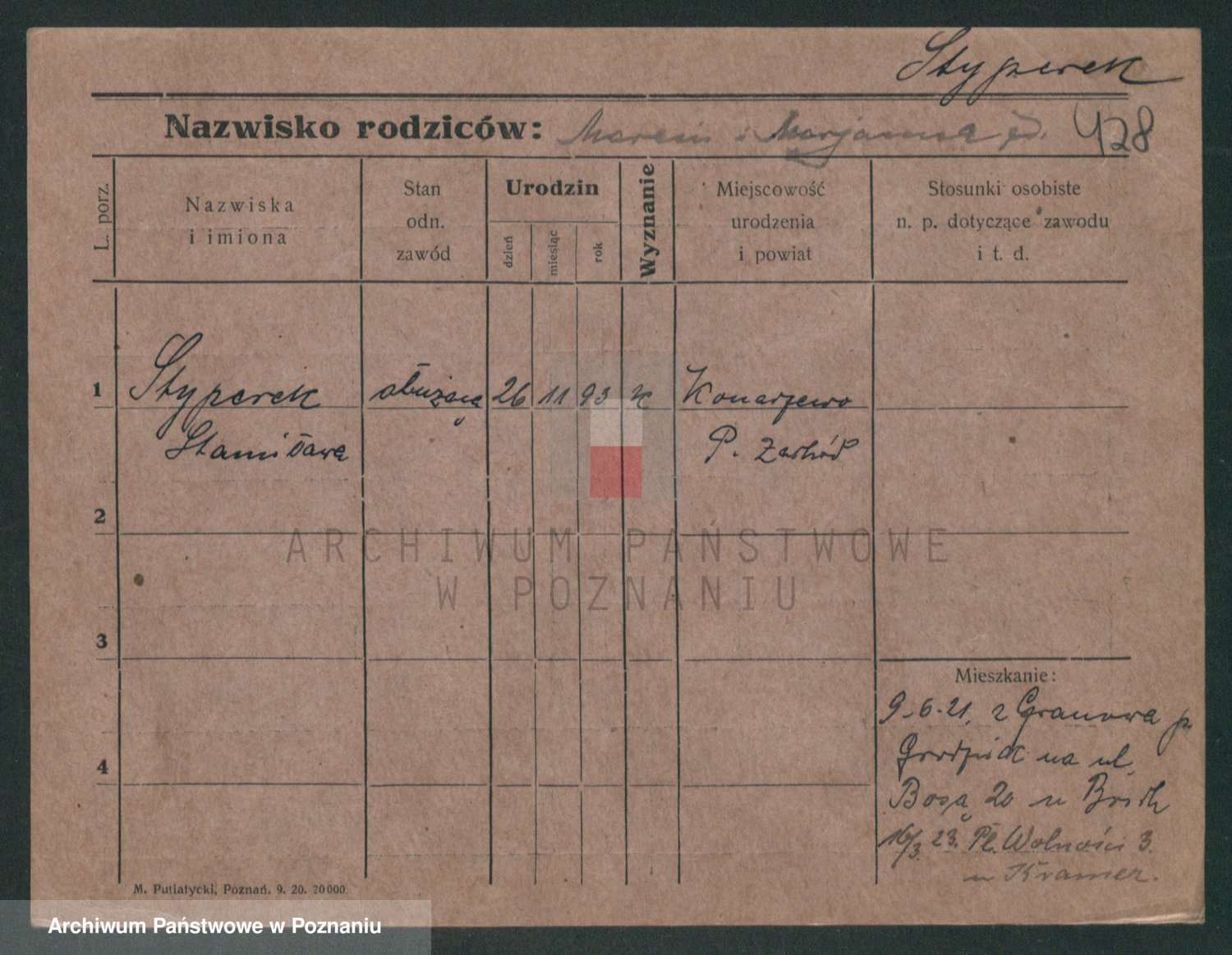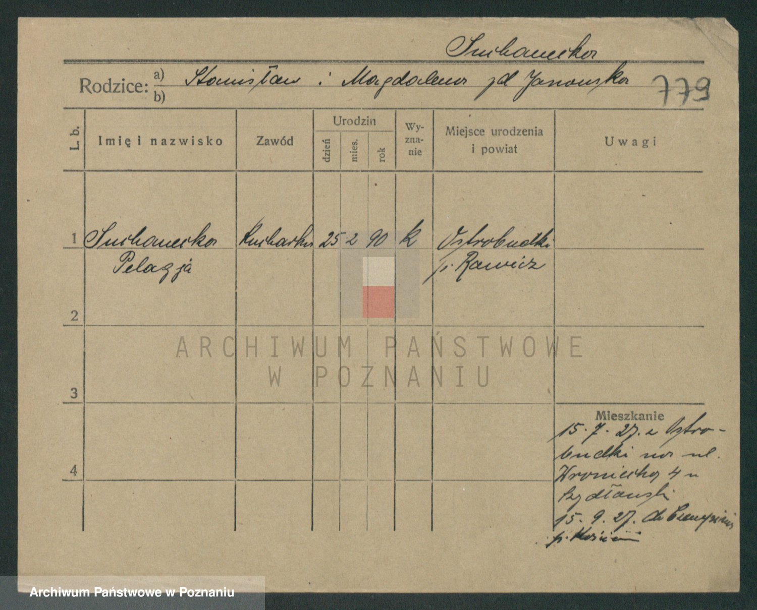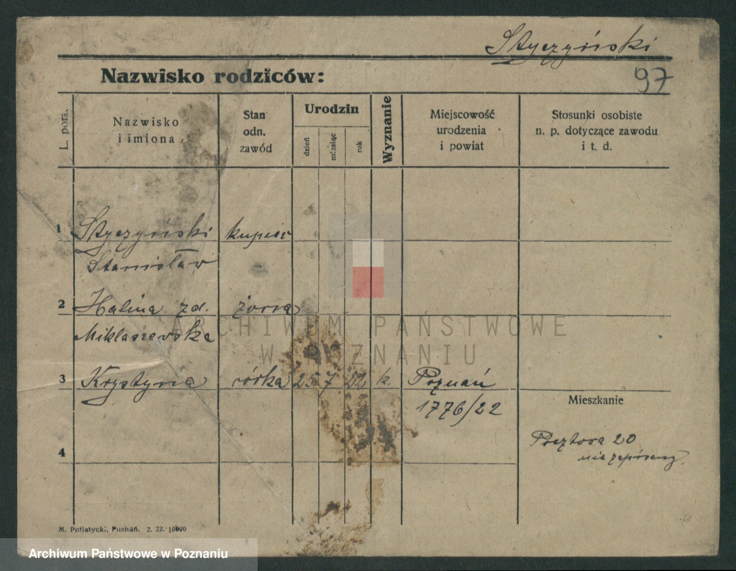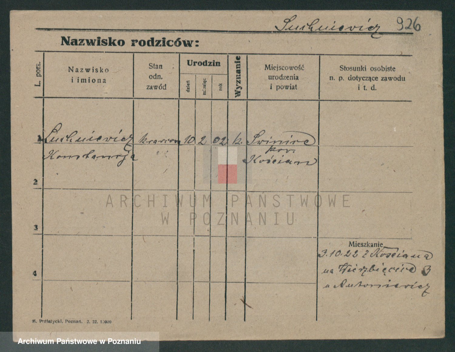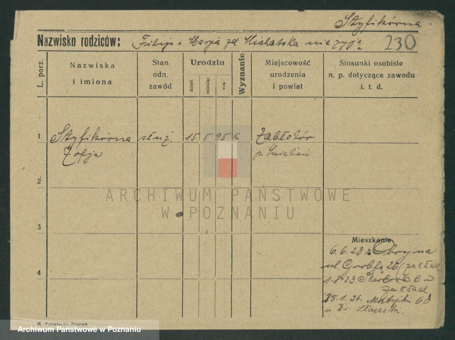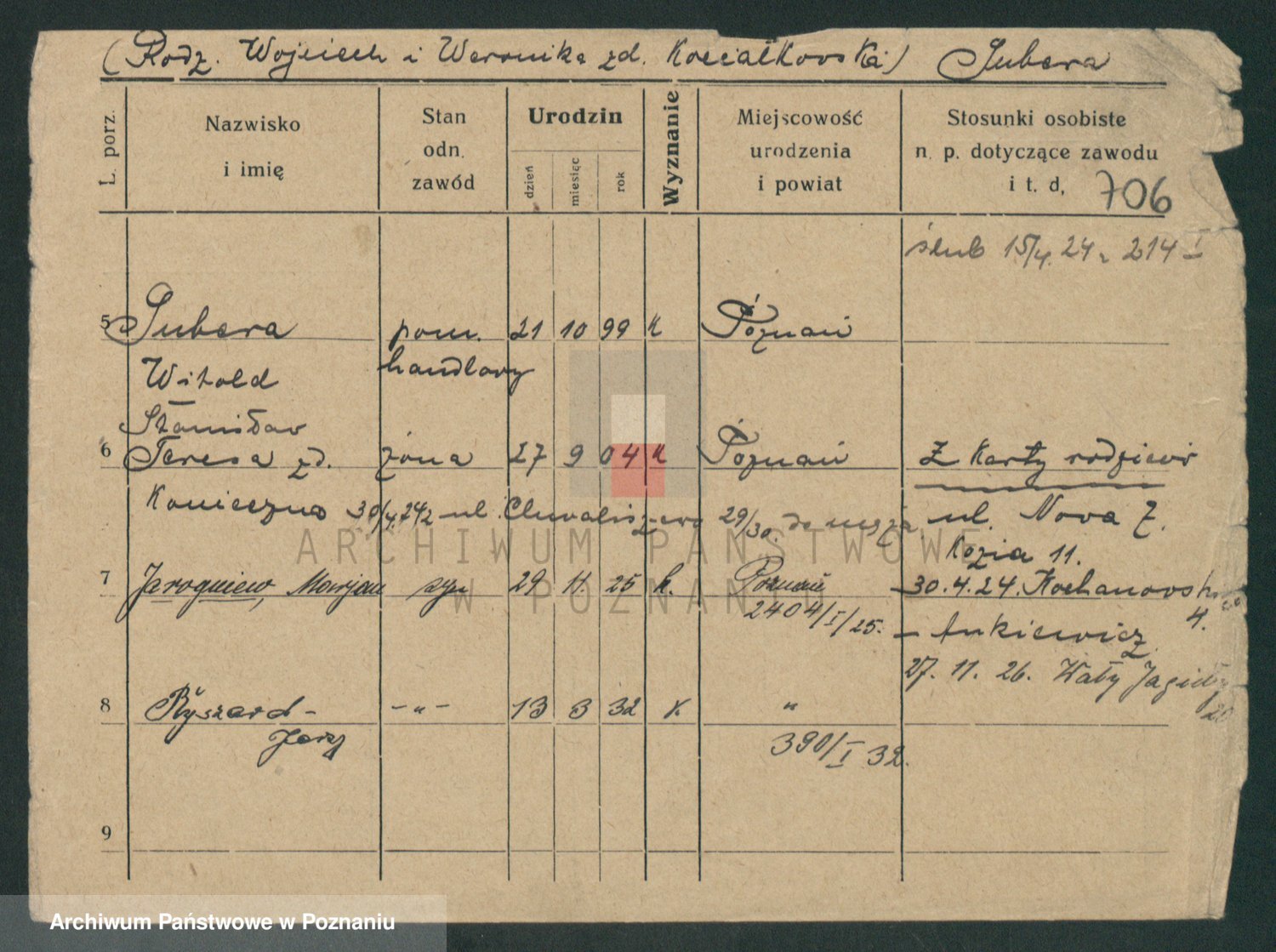 Podgląd karty osobowej dostępny jest po kliknięciu na nazwisko lub ikonkę karty. Można dokonywać powiększenia (ikony na górze) lub przechodzić między kolejnymi skanami (strzałki po bokach).