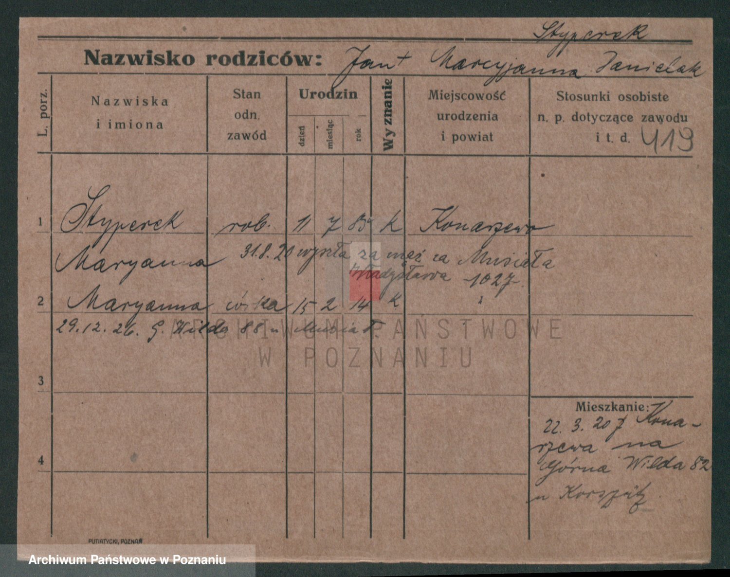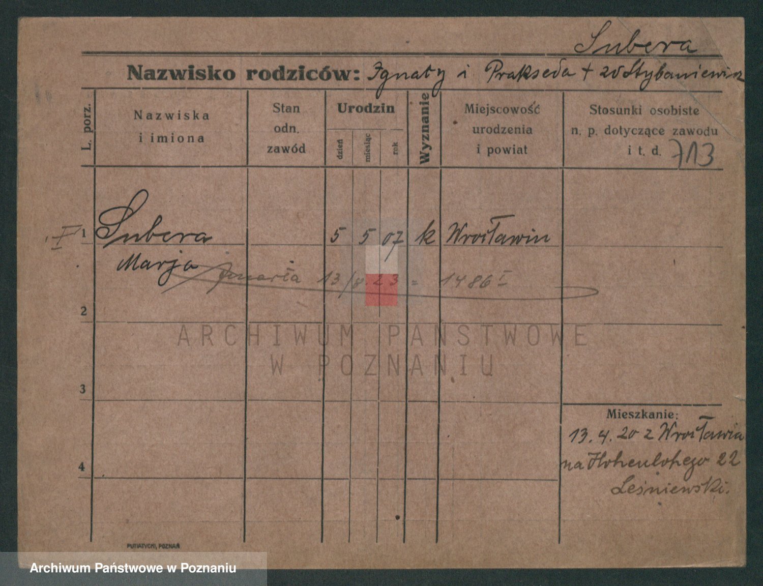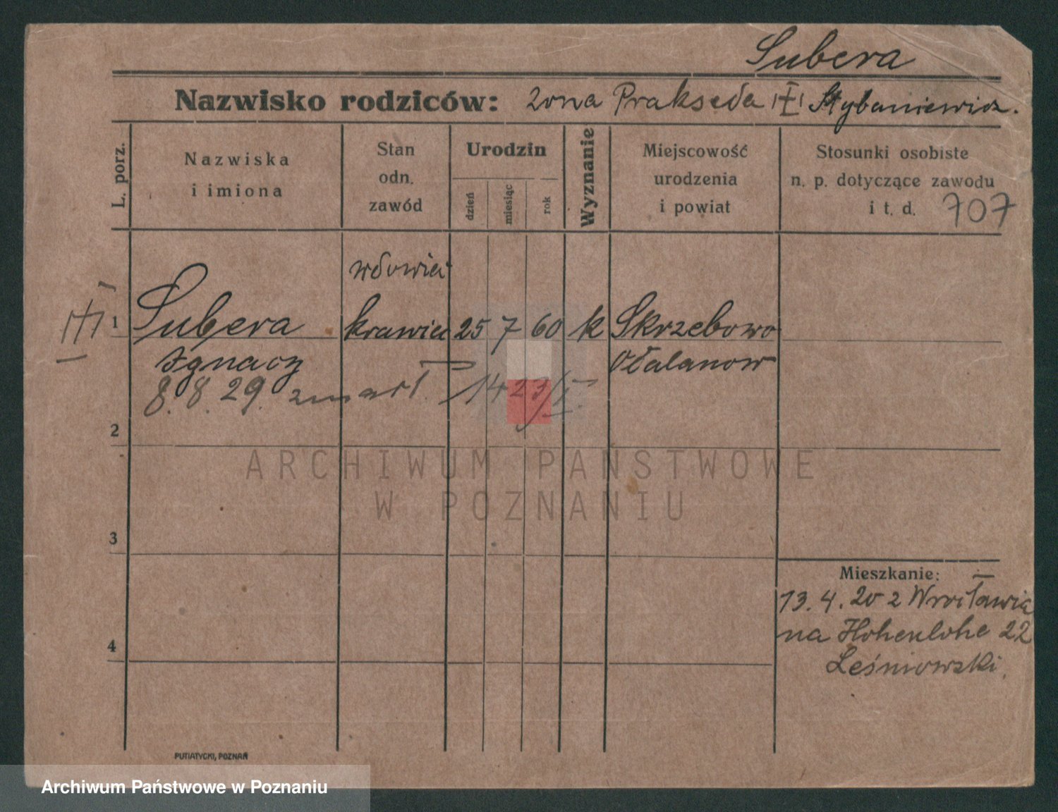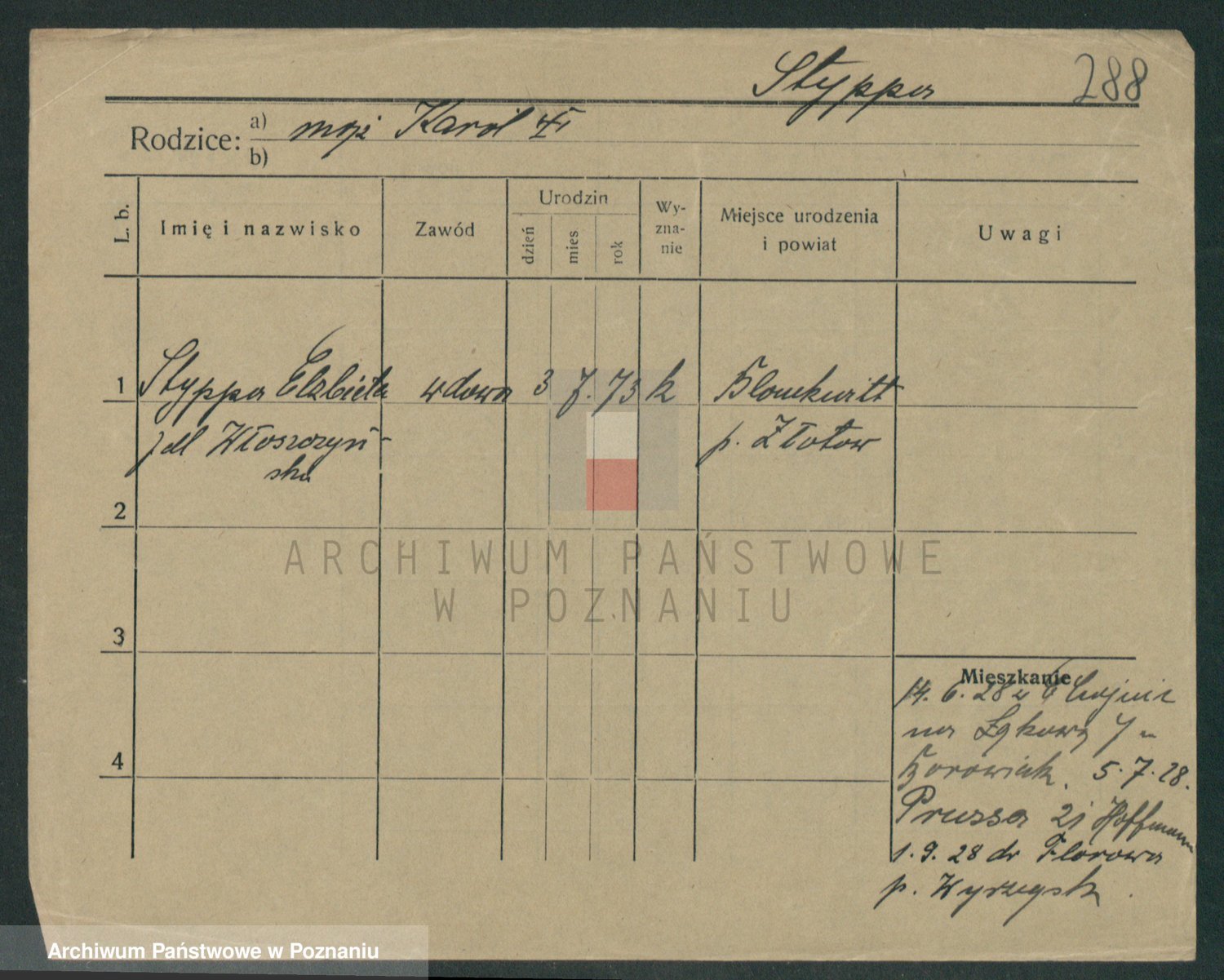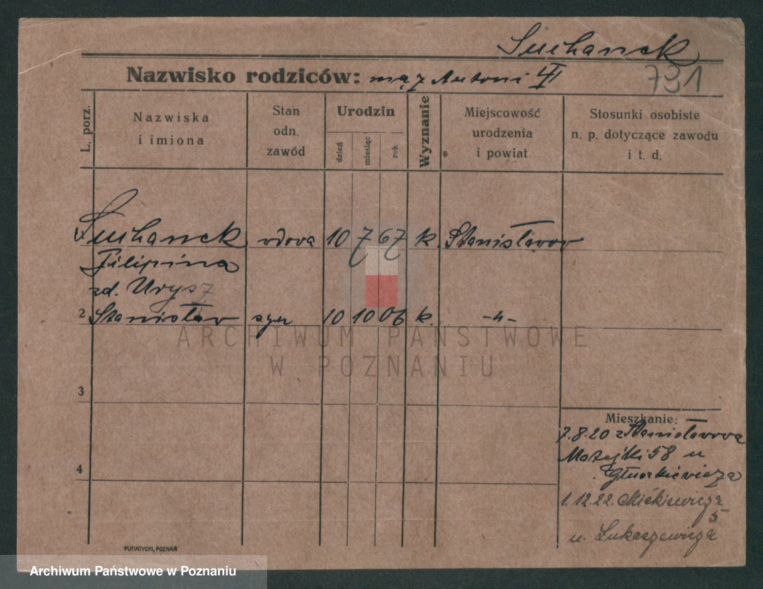 Podgląd karty osobowej dostępny jest po kliknięciu na nazwisko lub ikonkę karty. Można dokonywać powiększenia (ikony na górze) lub przechodzić między kolejnymi skanami (strzałki po bokach).