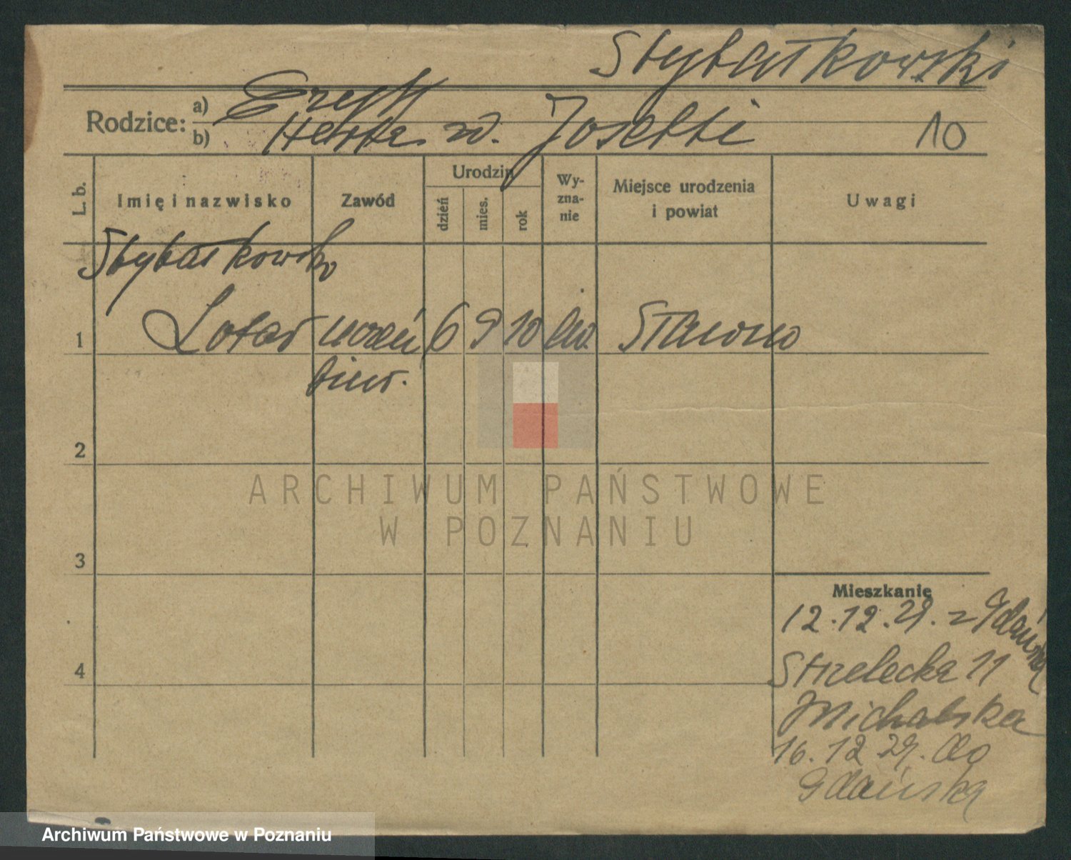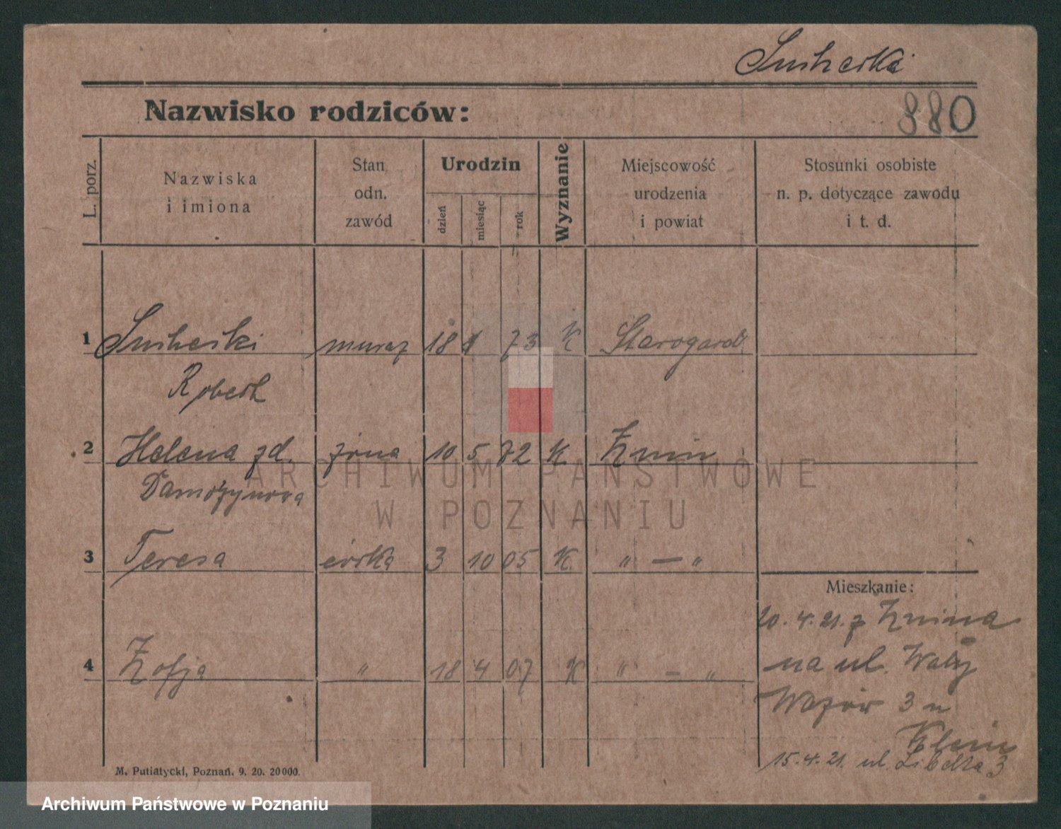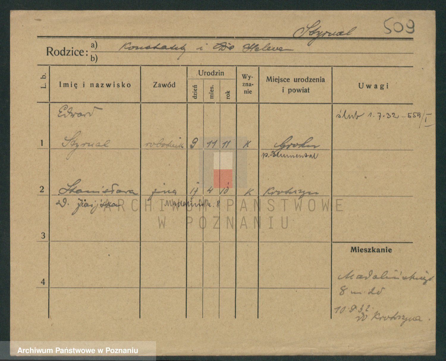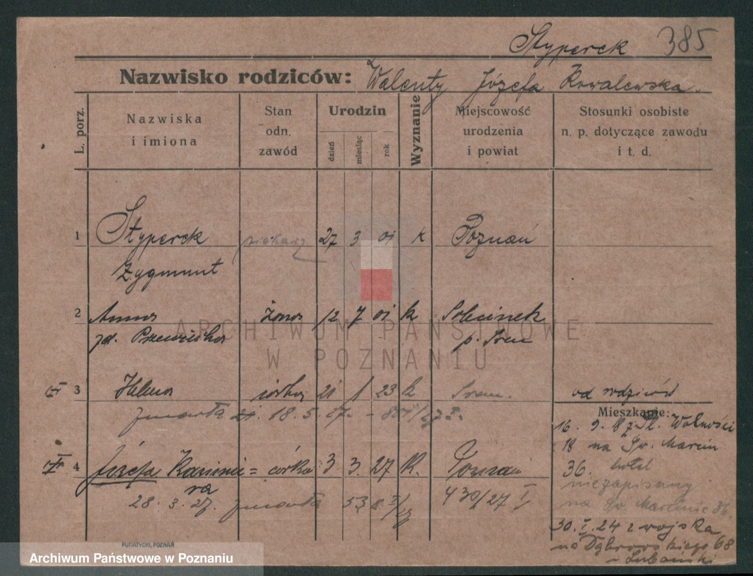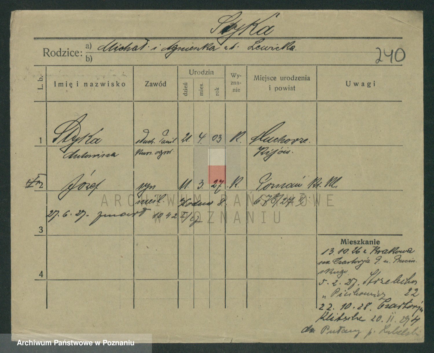 Podgląd karty osobowej dostępny jest po kliknięciu na nazwisko lub ikonkę karty. Można dokonywać powiększenia (ikony na górze) lub przechodzić między kolejnymi skanami (strzałki po bokach).