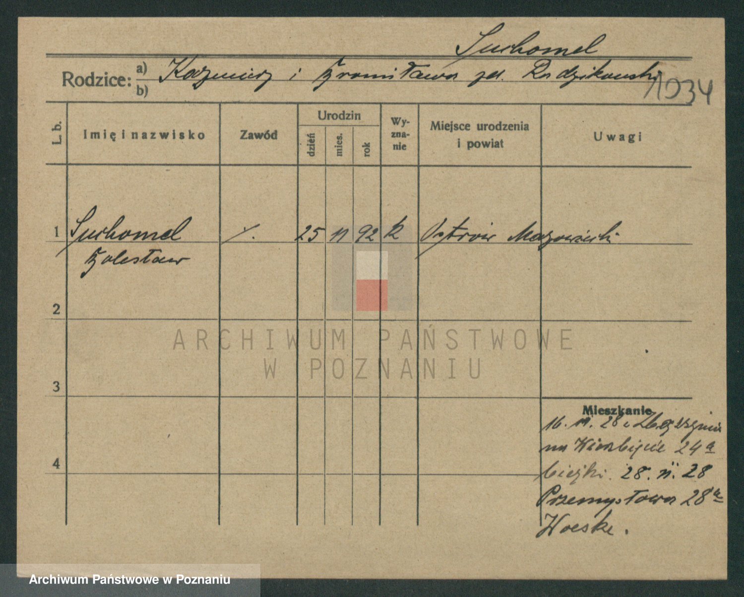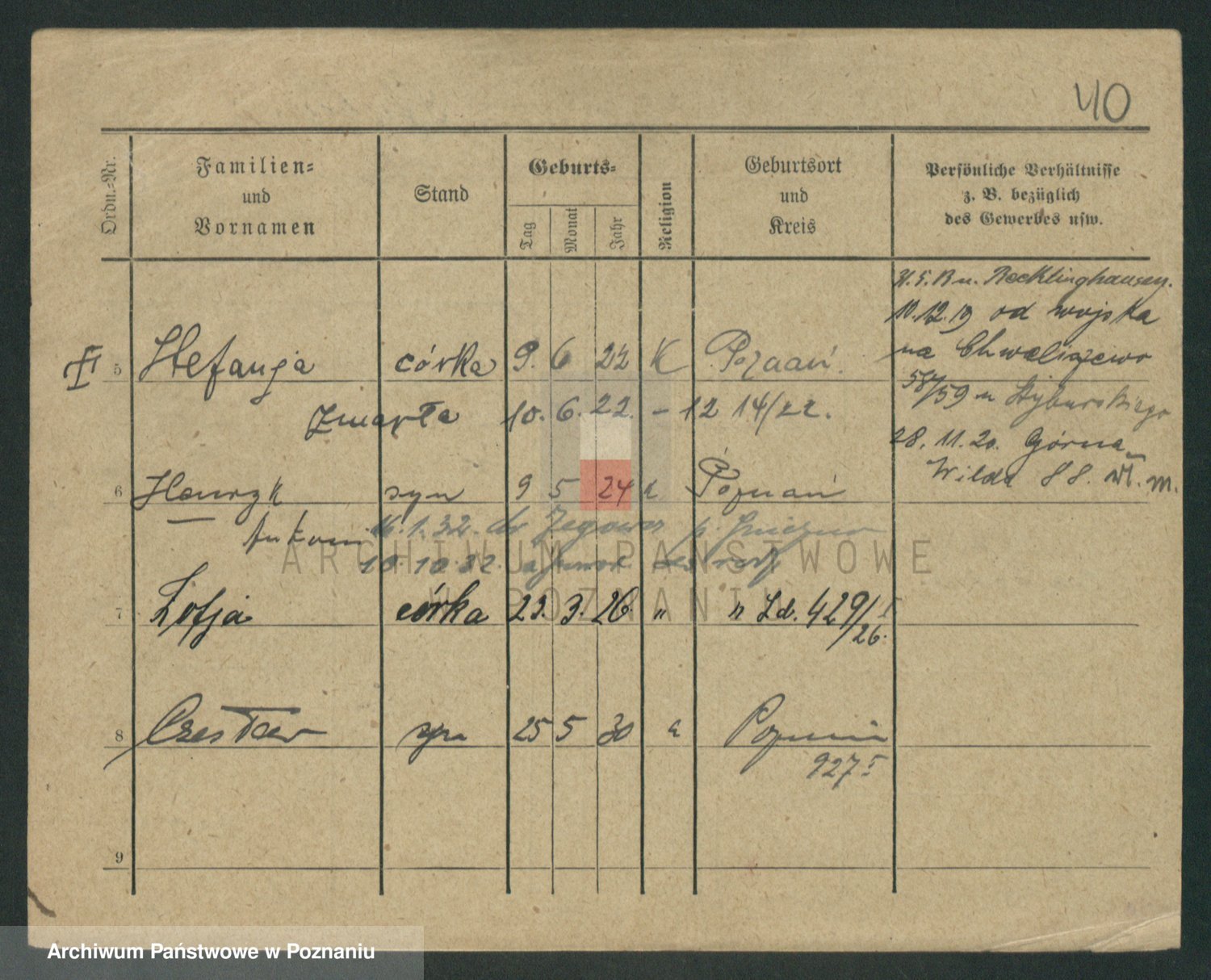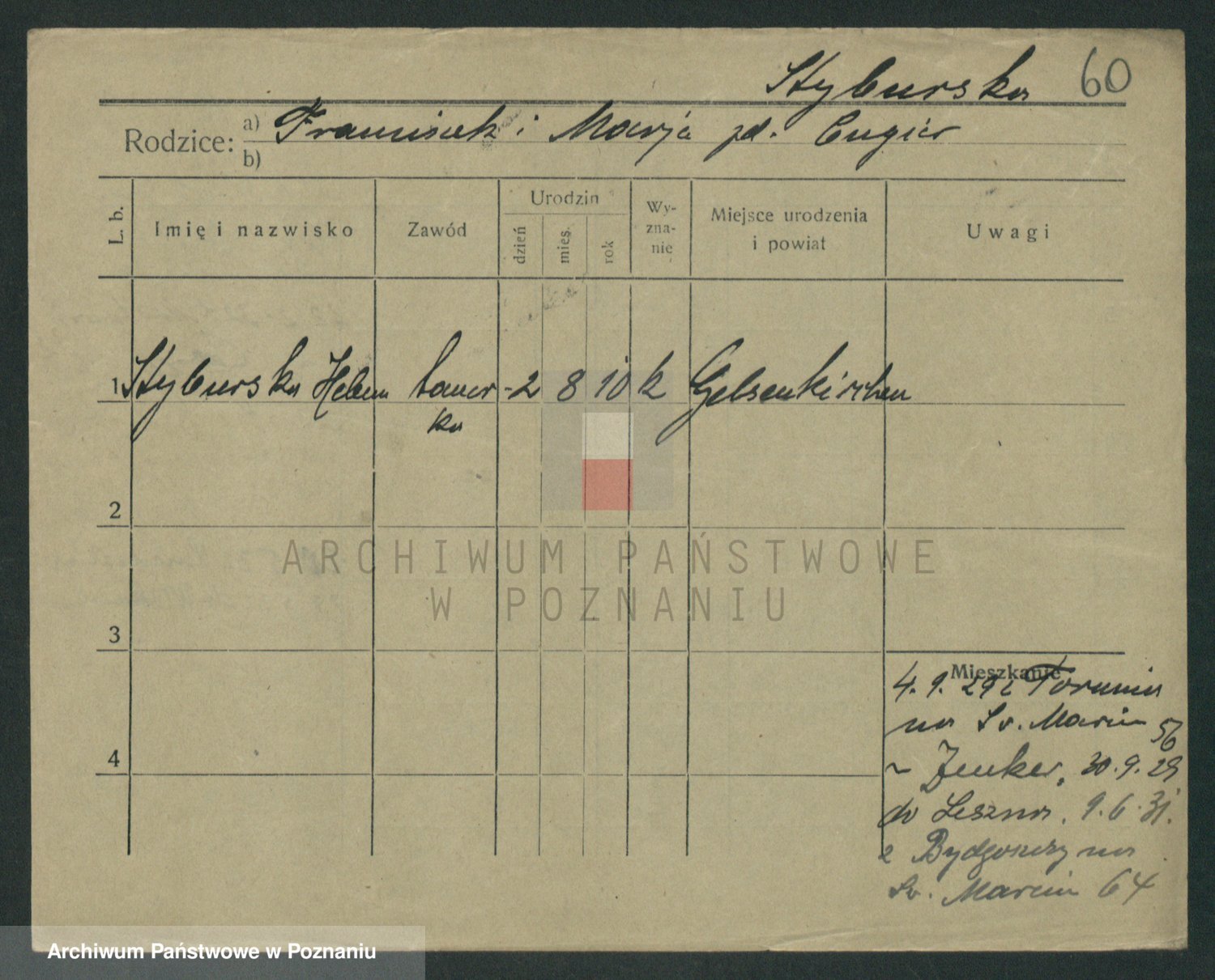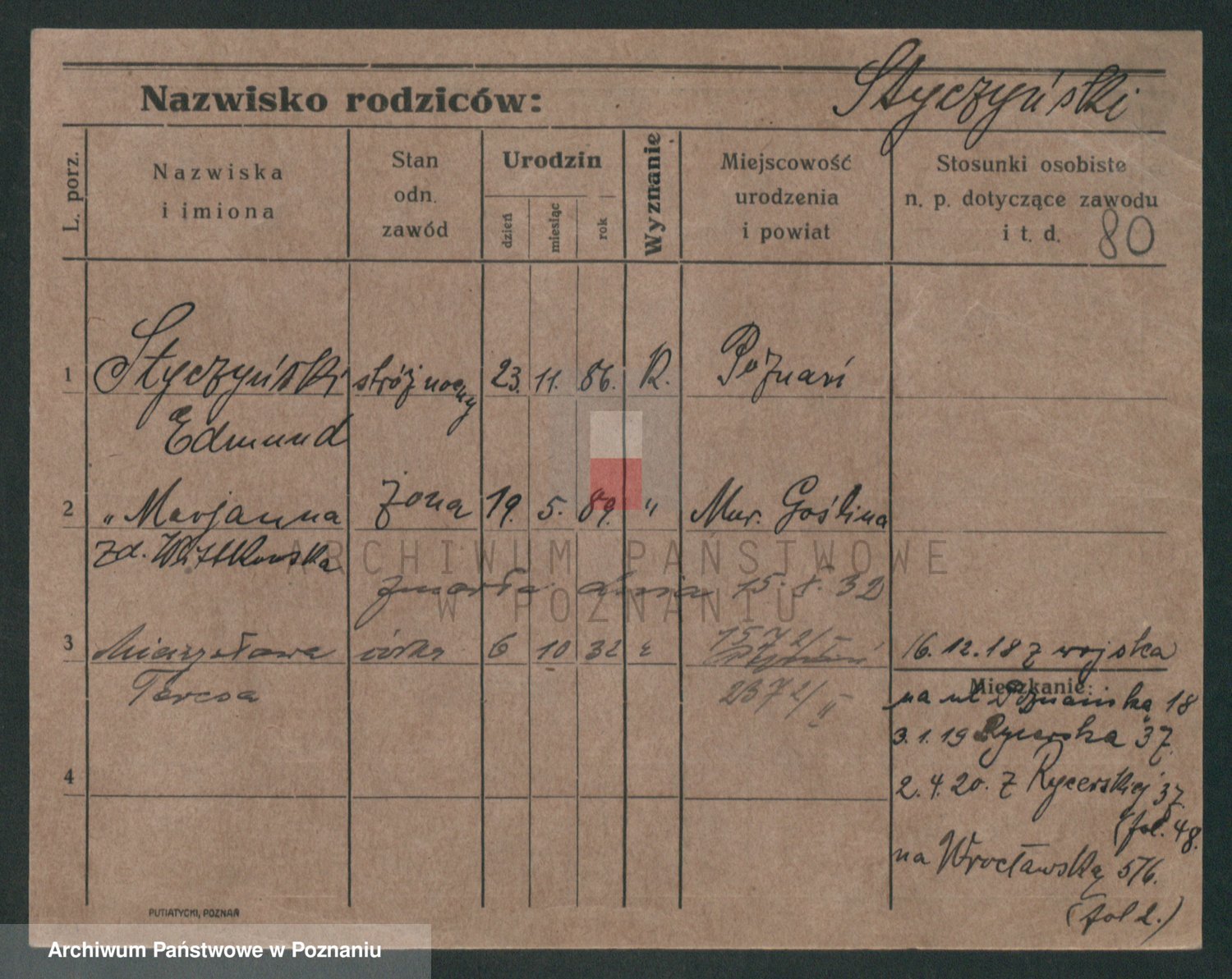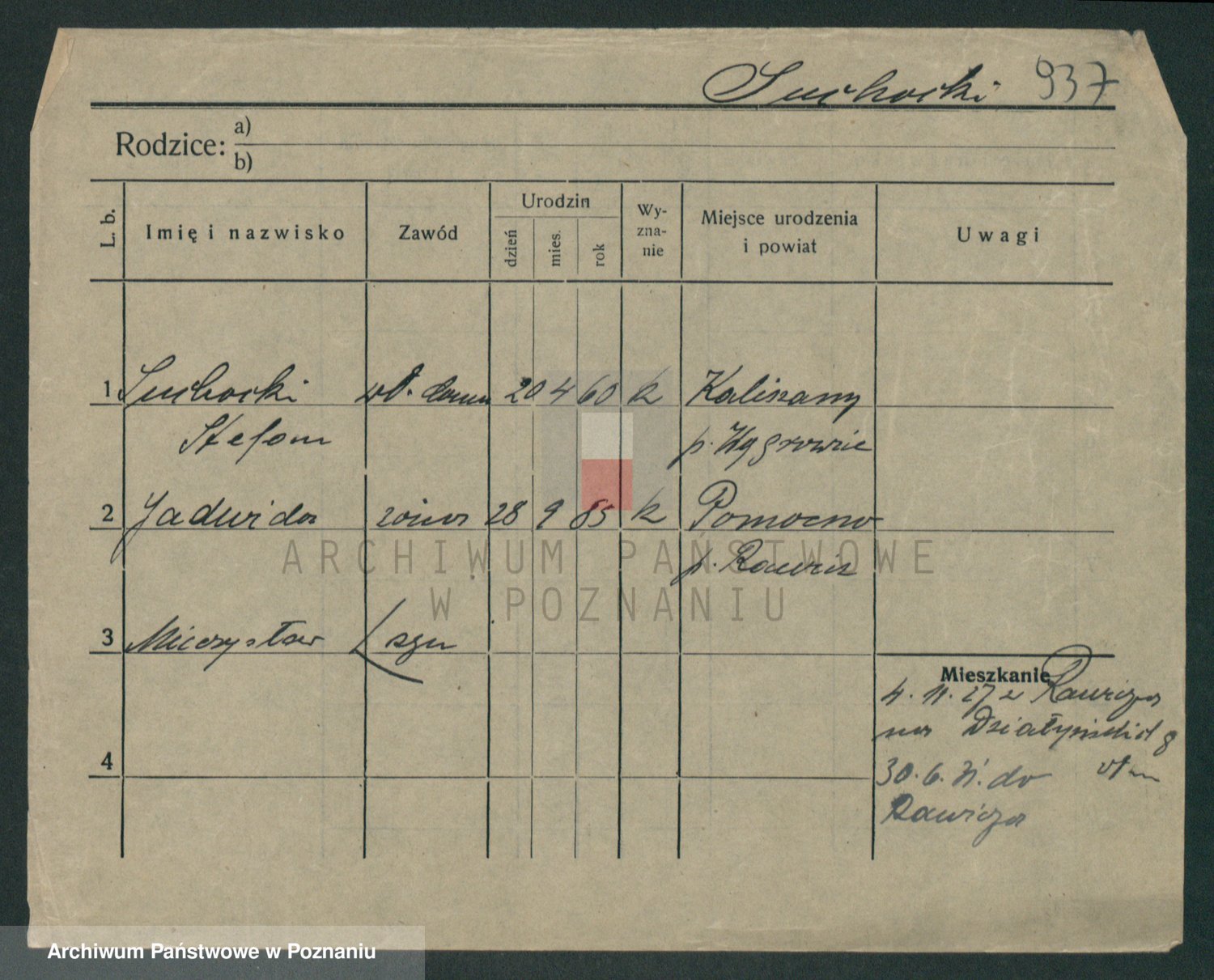 Podgląd karty osobowej dostępny jest po kliknięciu na nazwisko lub ikonkę karty. Można dokonywać powiększenia (ikony na górze) lub przechodzić między kolejnymi skanami (strzałki po bokach).