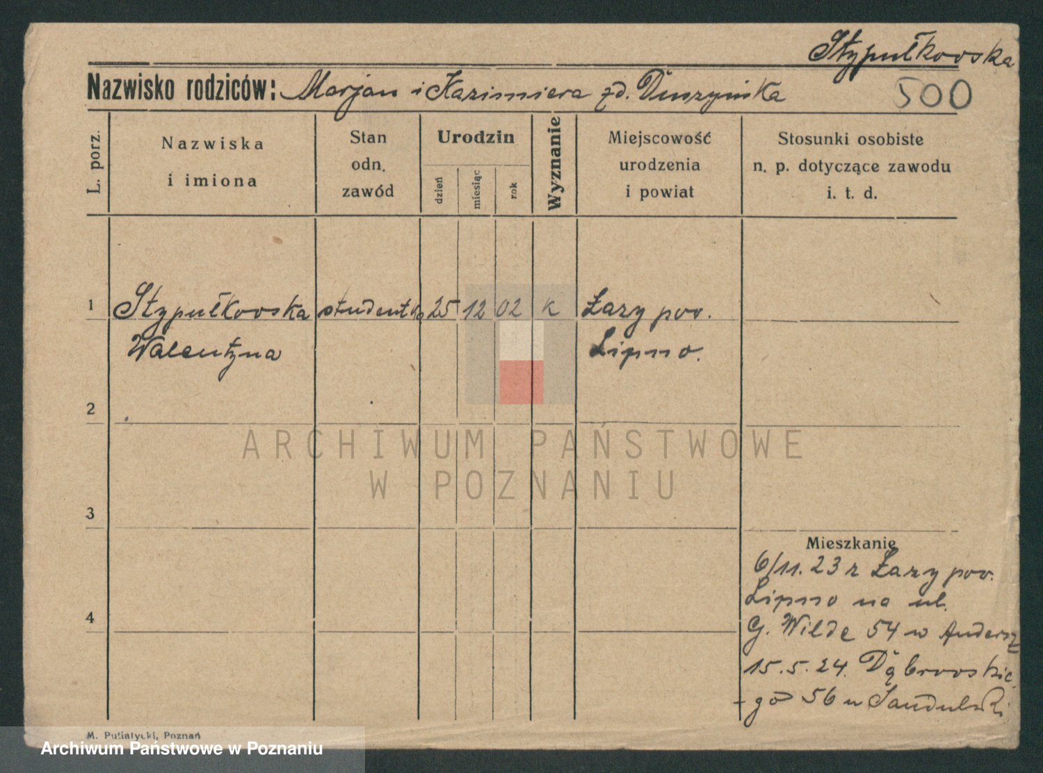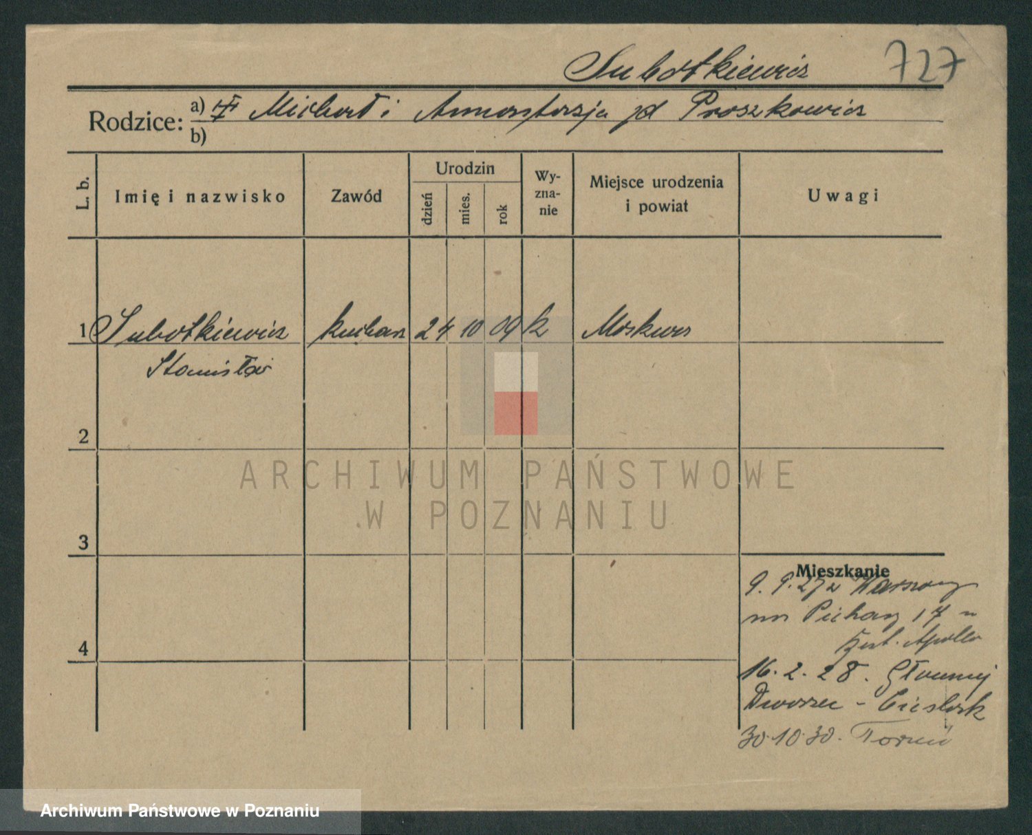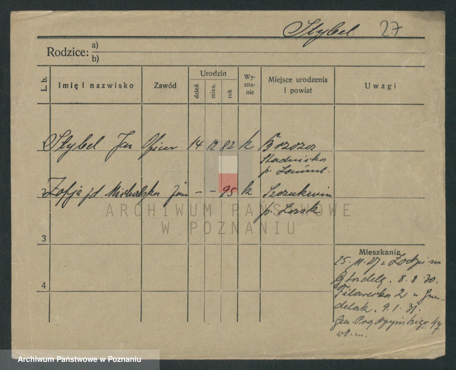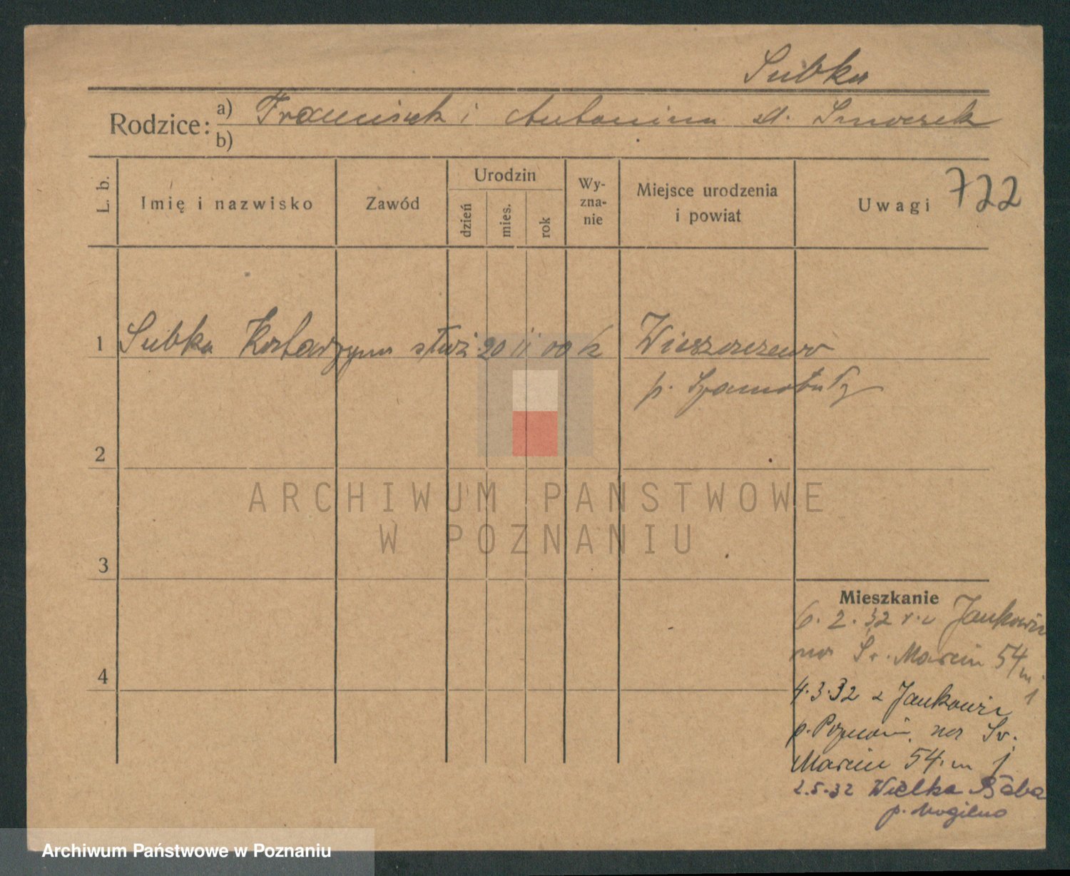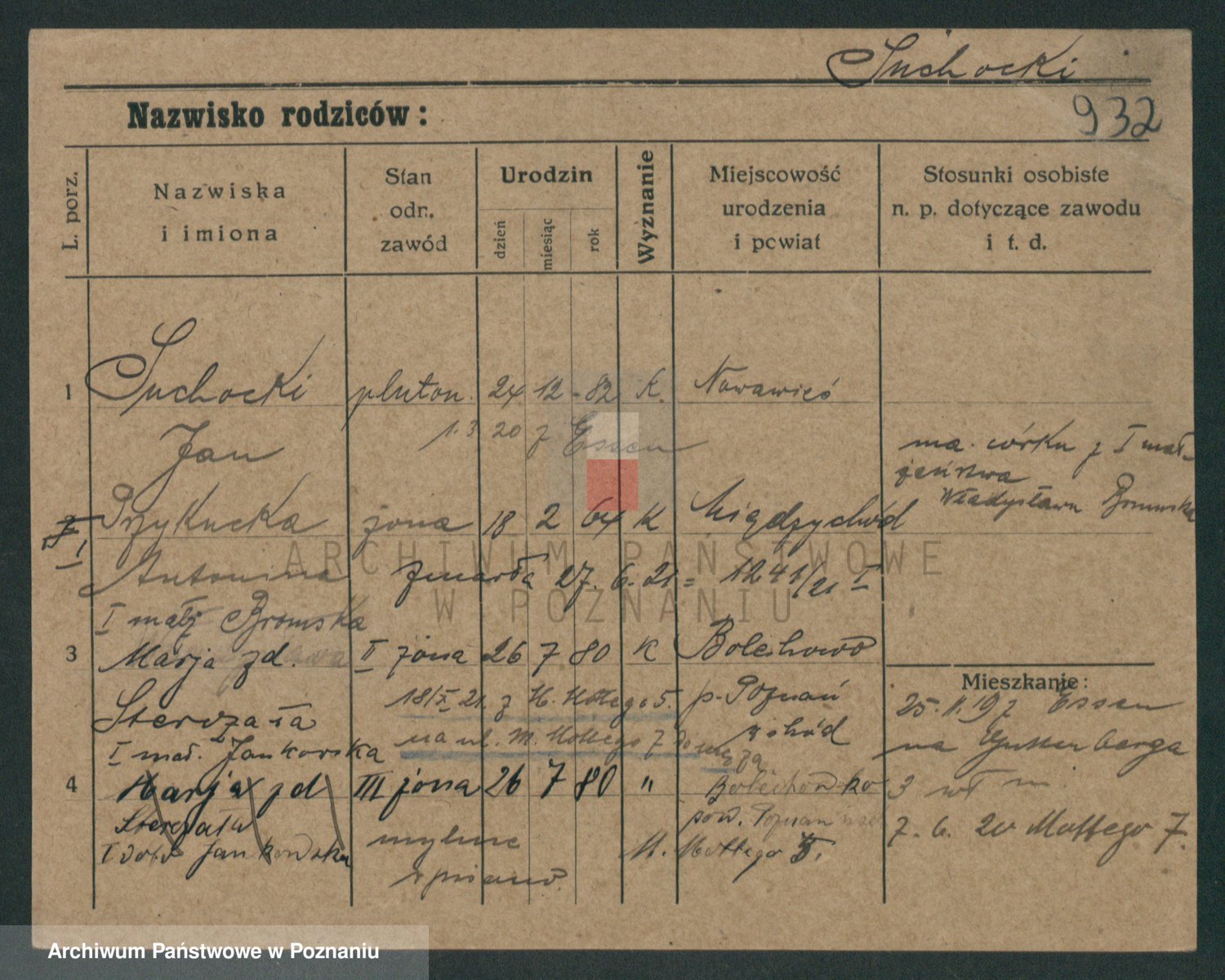 Podgląd karty osobowej dostępny jest po kliknięciu na nazwisko lub ikonkę karty. Można dokonywać powiększenia (ikony na górze) lub przechodzić między kolejnymi skanami (strzałki po bokach).