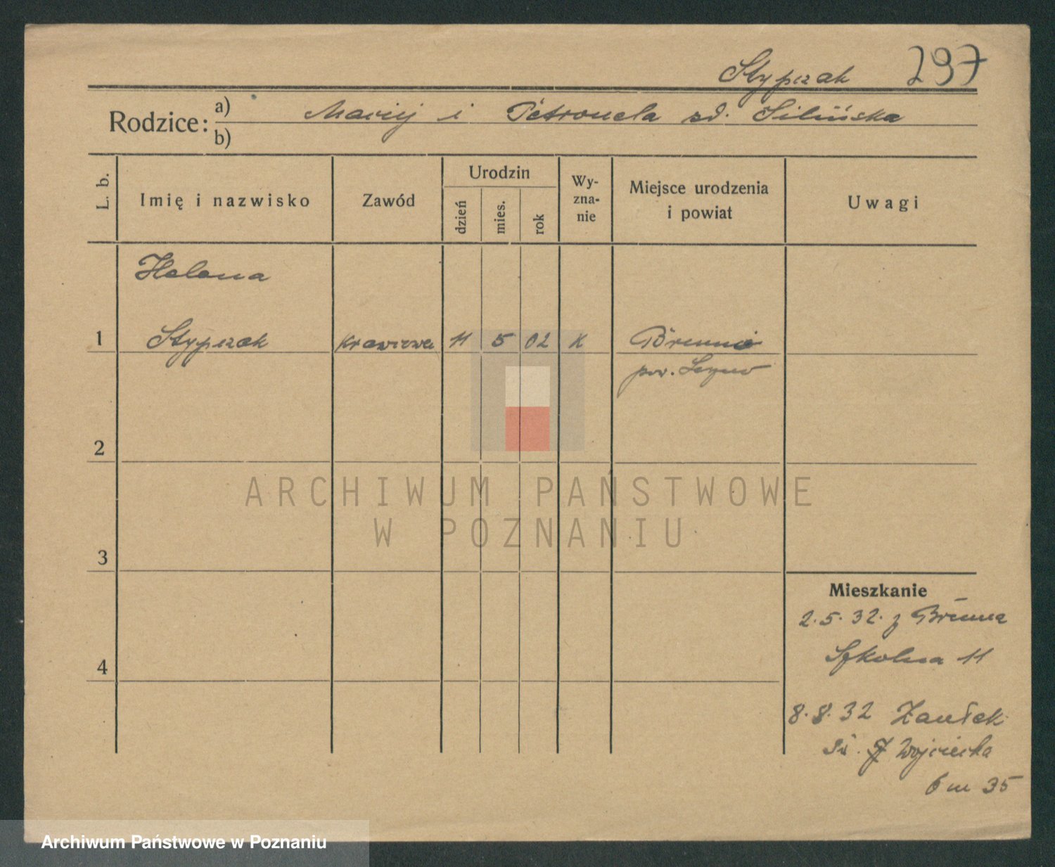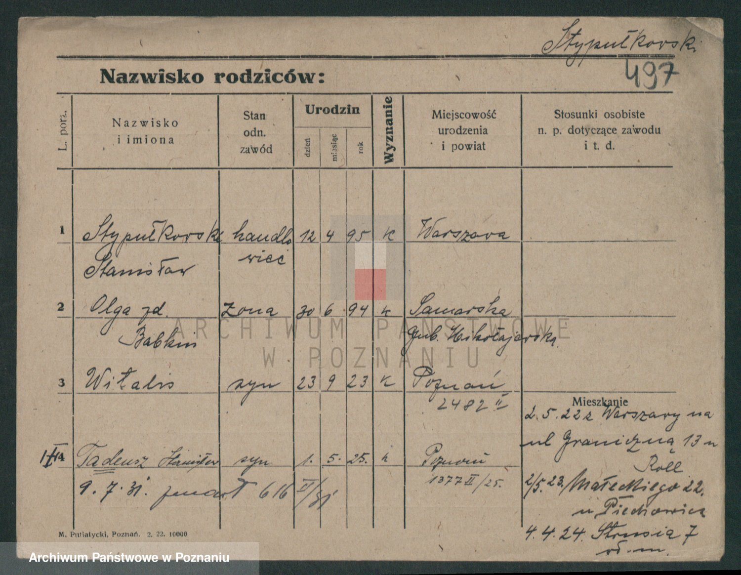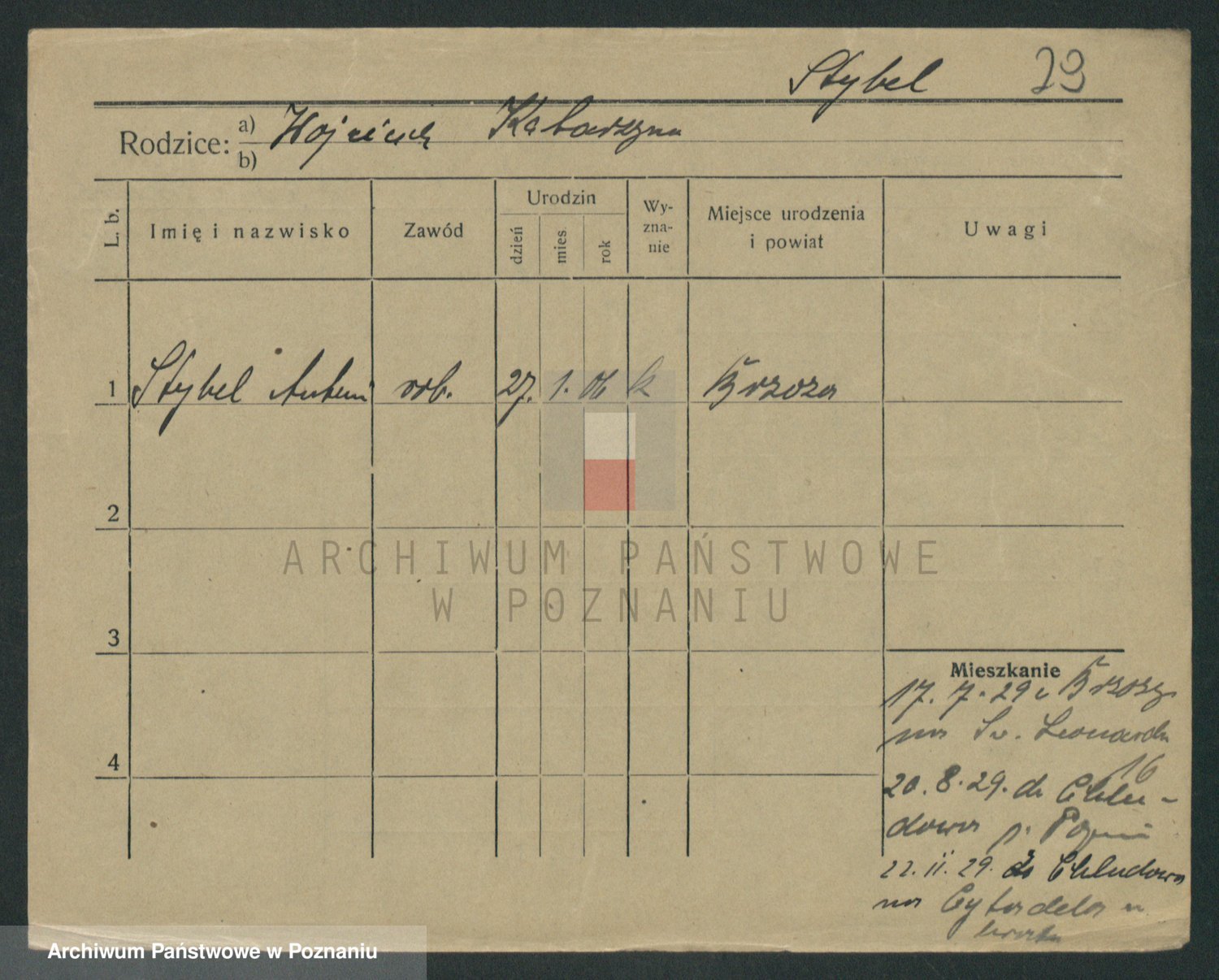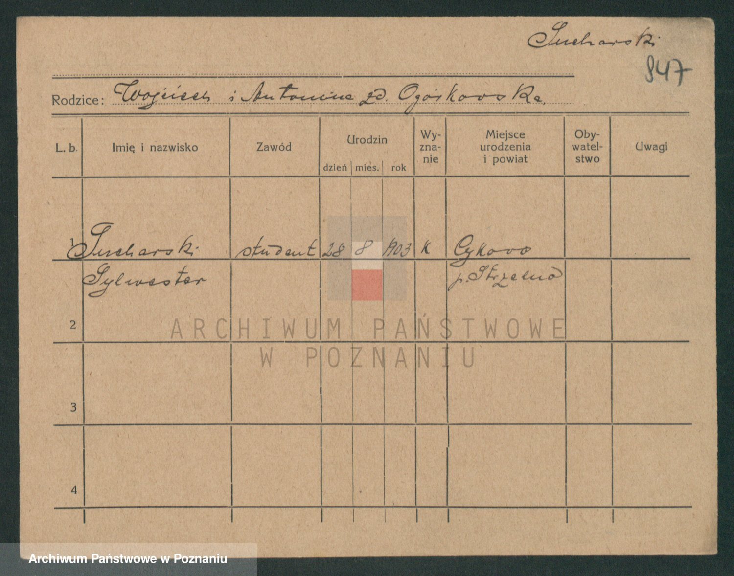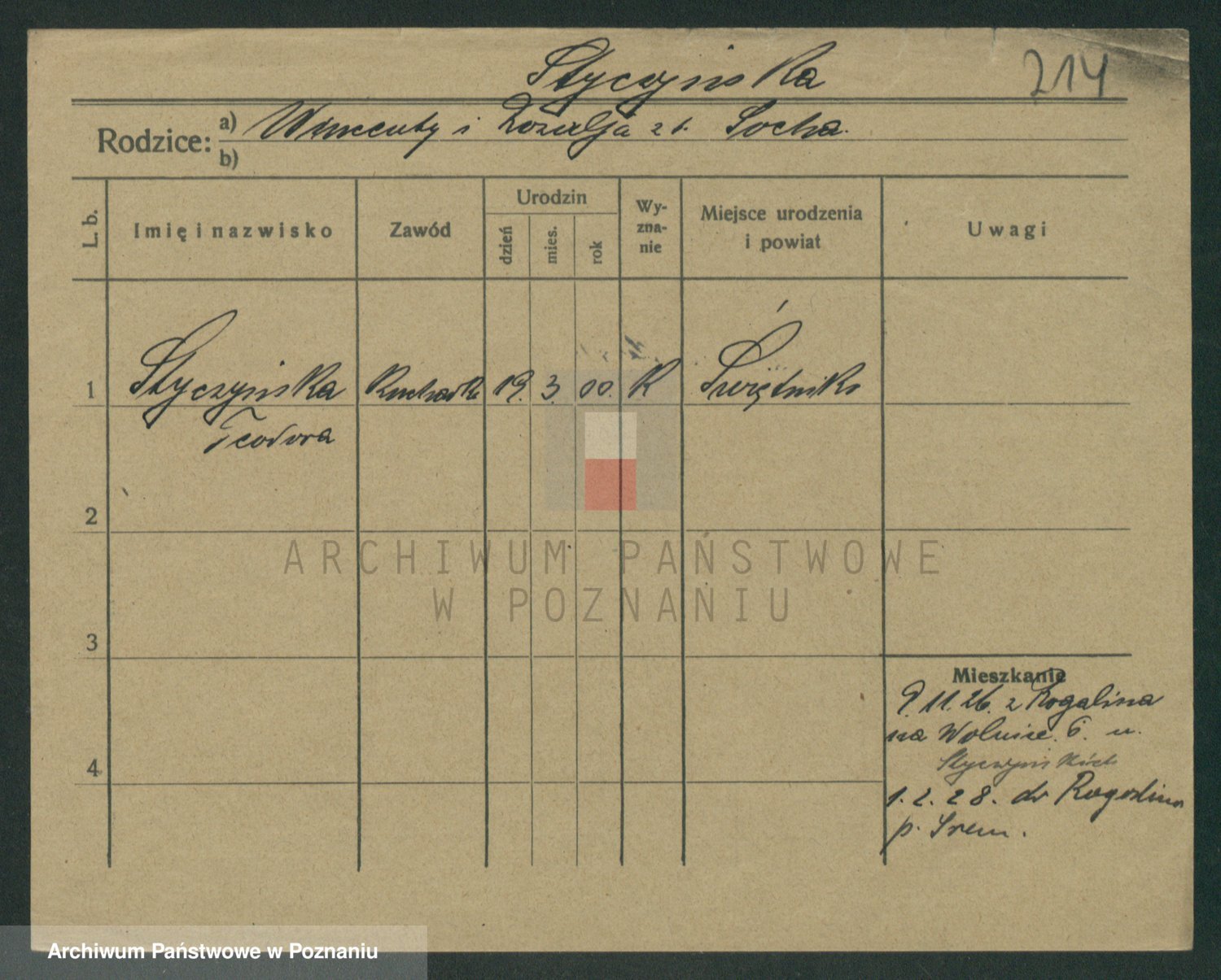 Podgląd karty osobowej dostępny jest po kliknięciu na nazwisko lub ikonkę karty. Można dokonywać powiększenia (ikony na górze) lub przechodzić między kolejnymi skanami (strzałki po bokach).