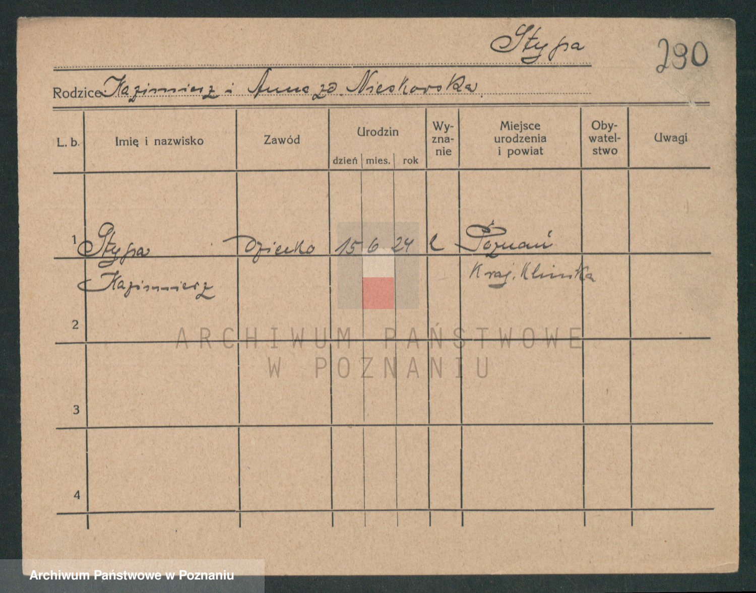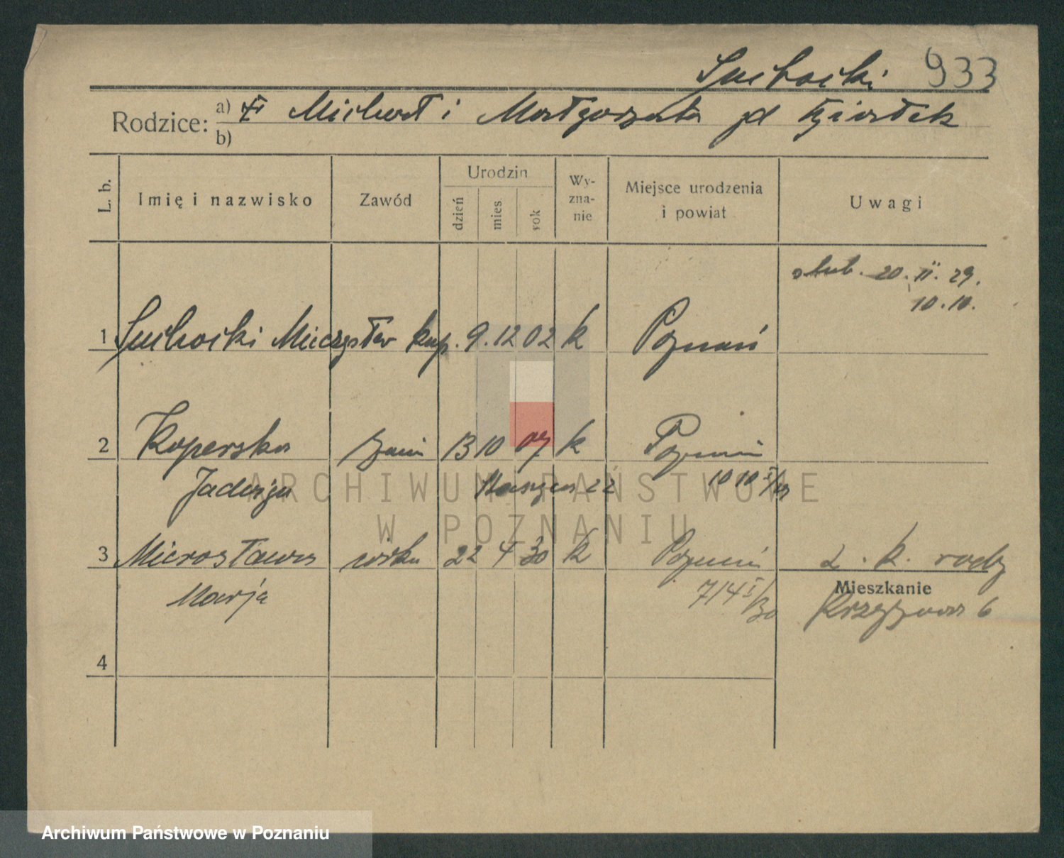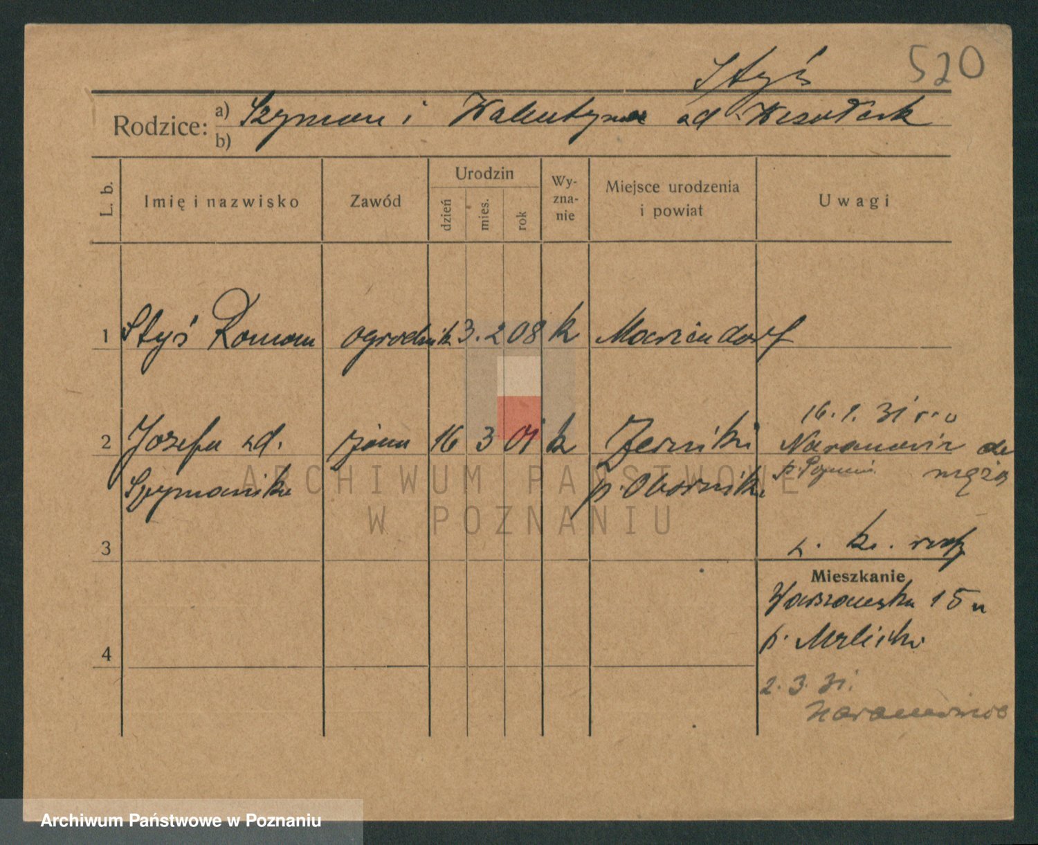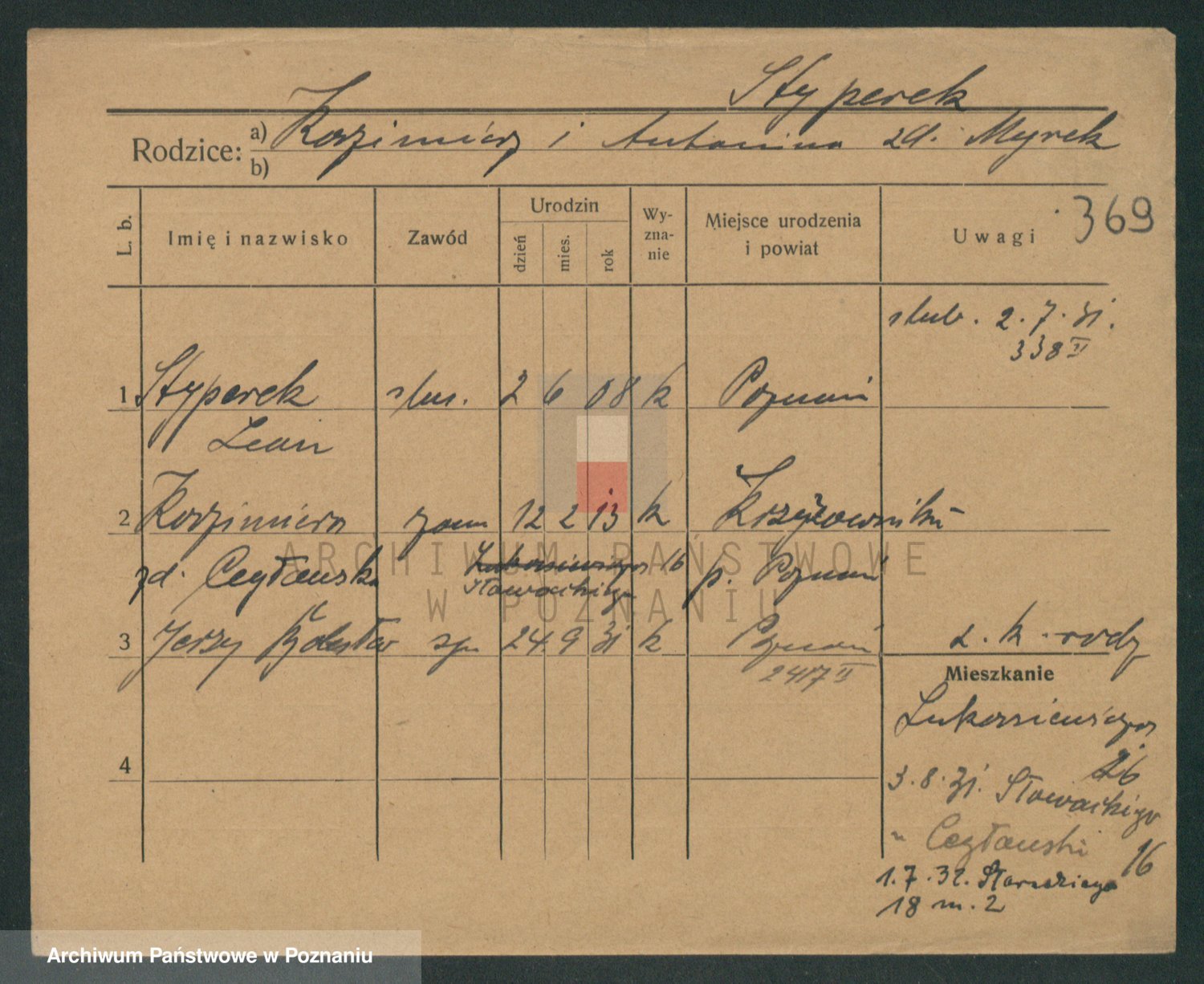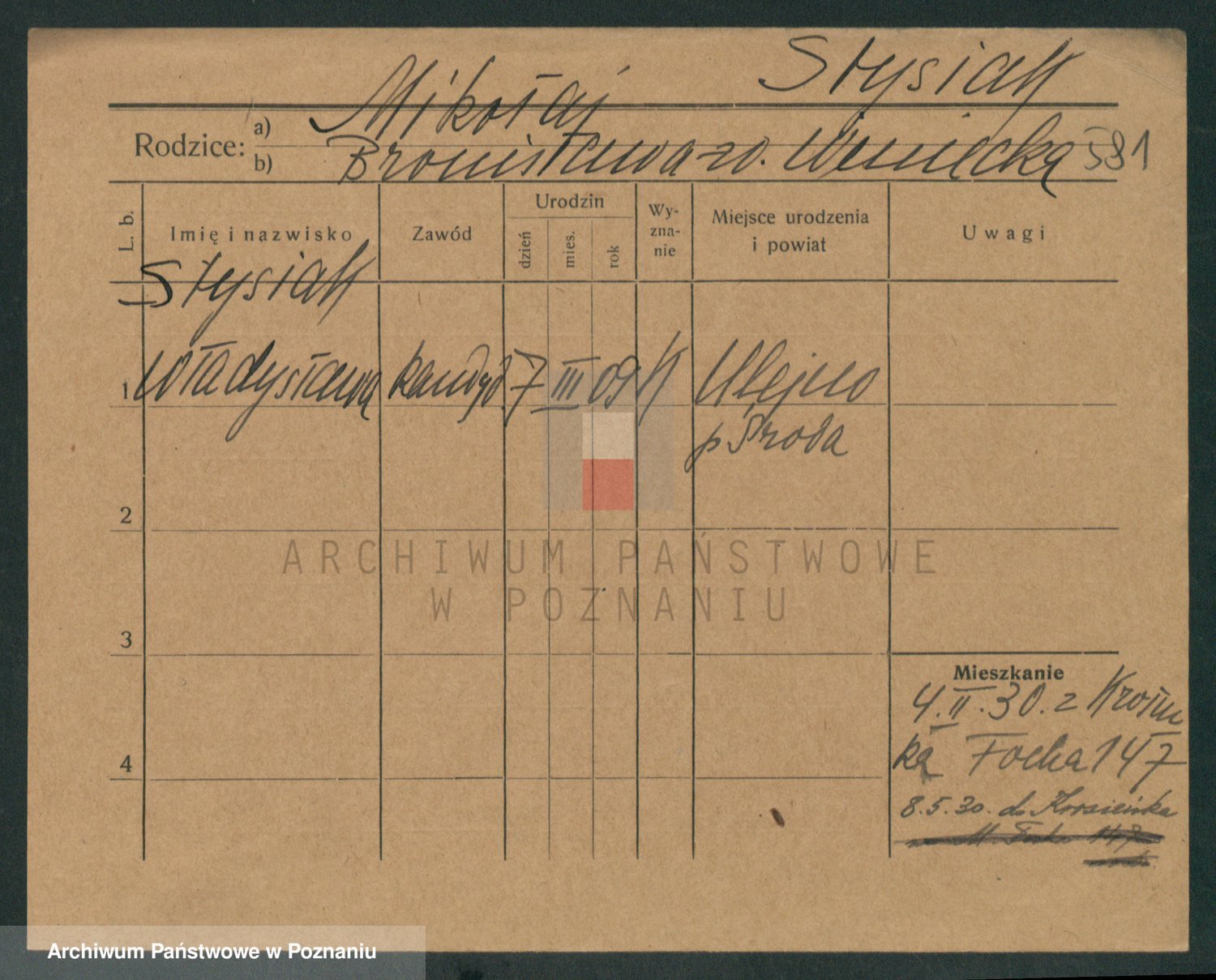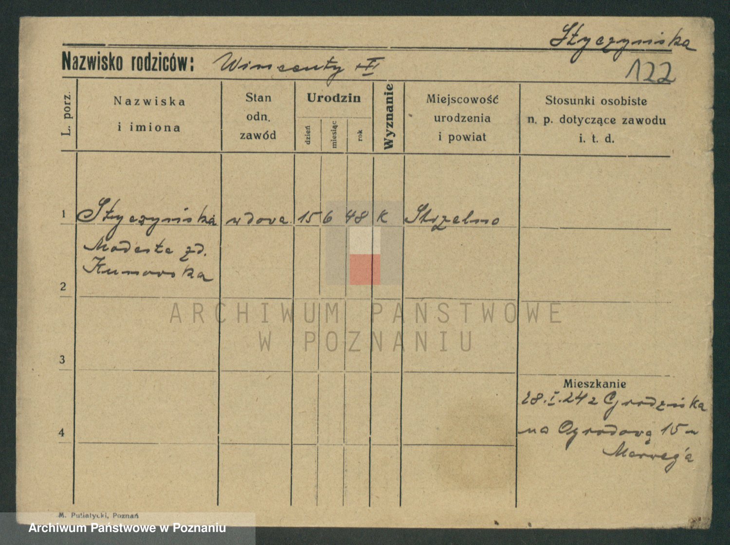 Podgląd karty osobowej dostępny jest po kliknięciu na nazwisko lub ikonkę karty. Można dokonywać powiększenia (ikony na górze) lub przechodzić między kolejnymi skanami (strzałki po bokach).