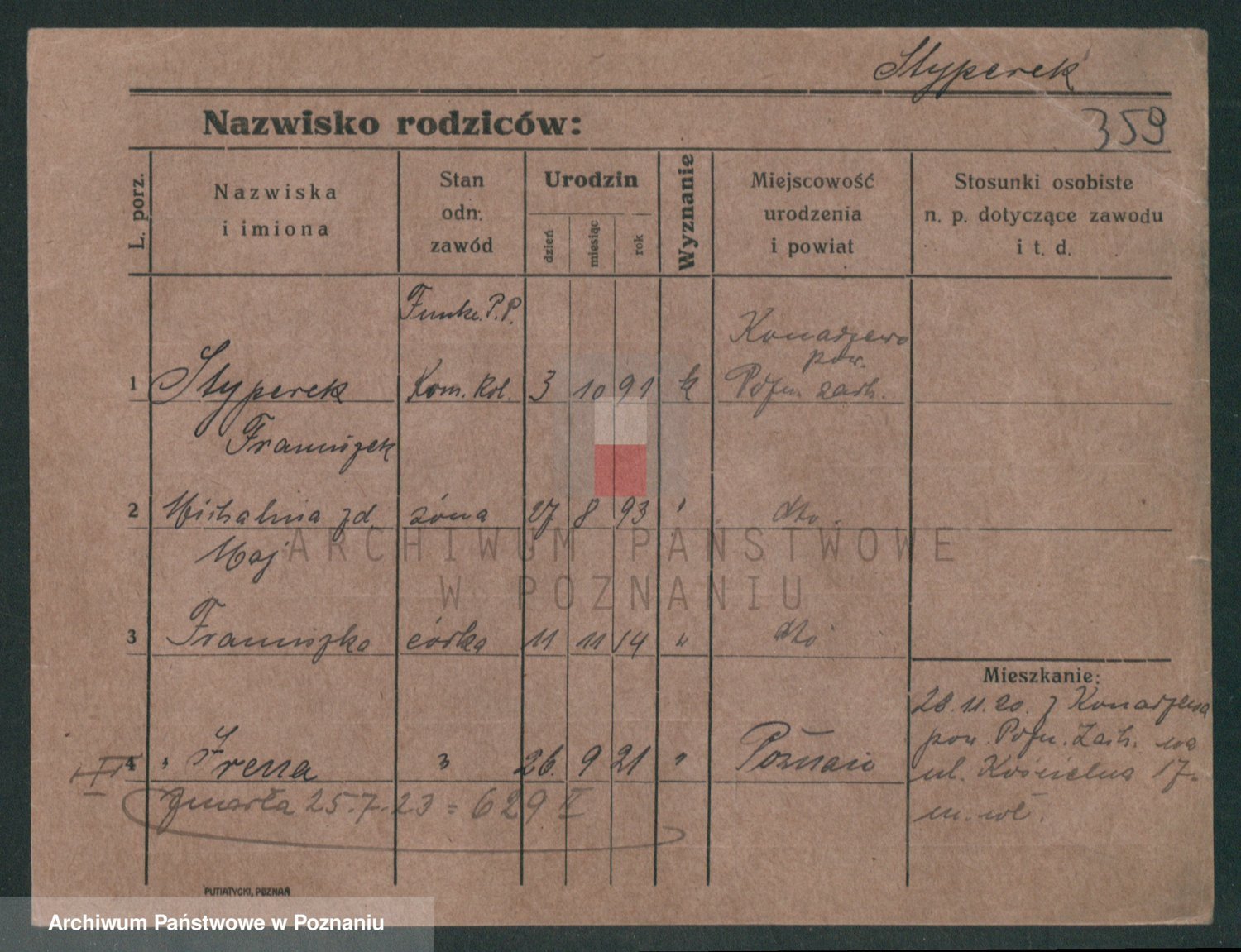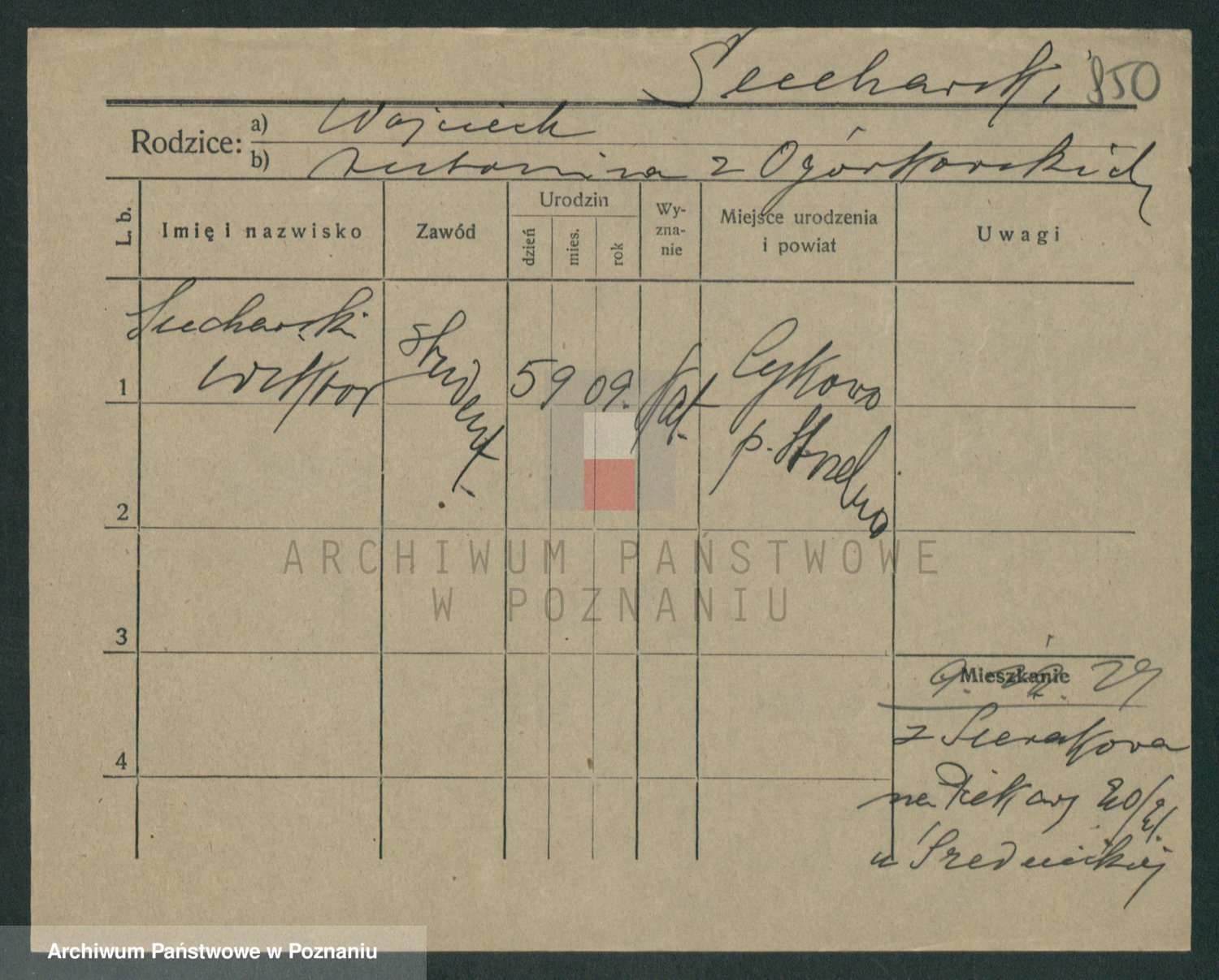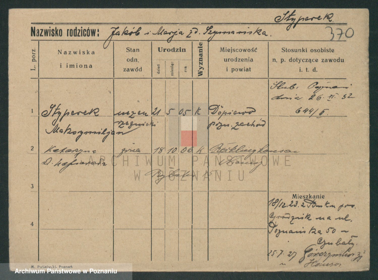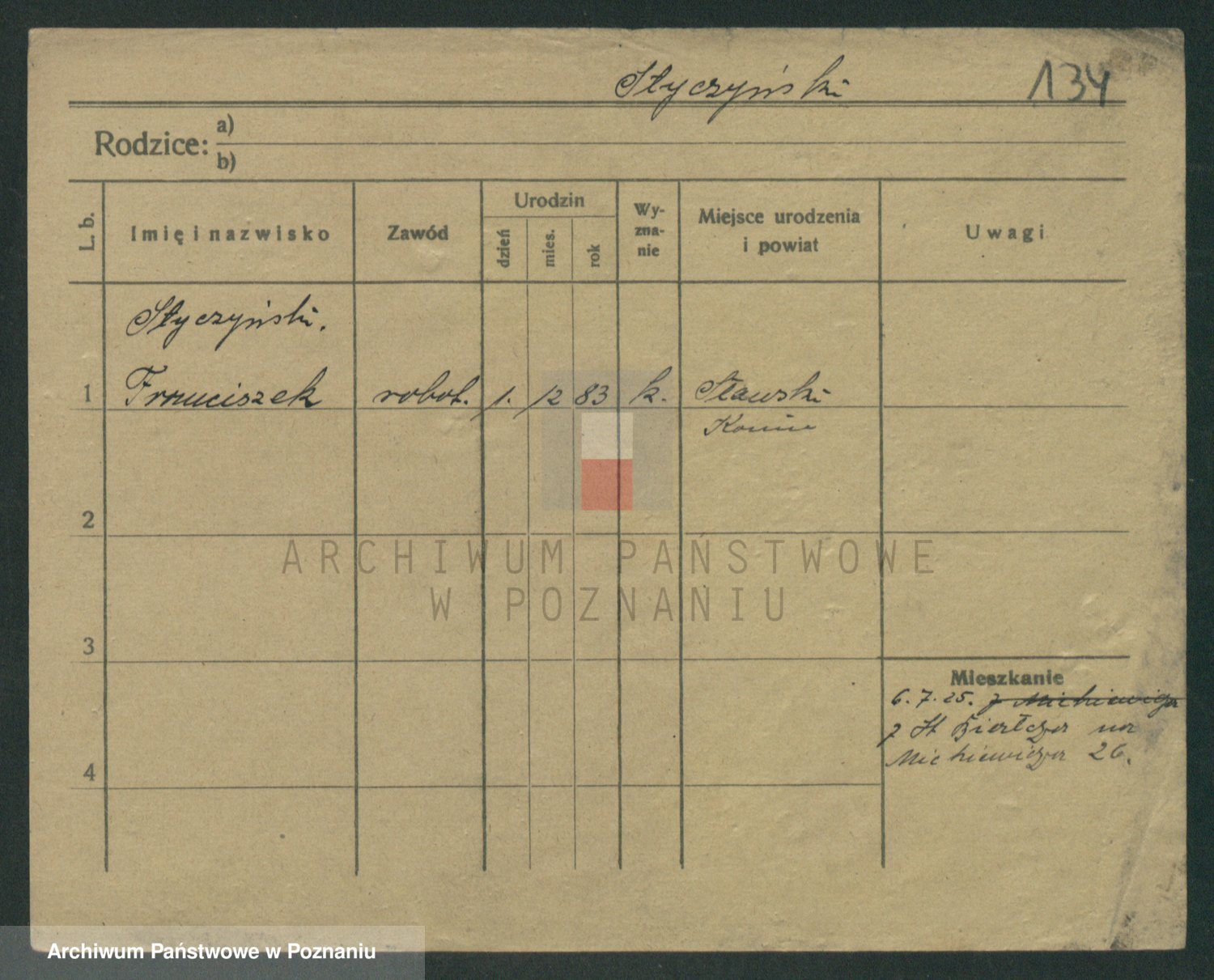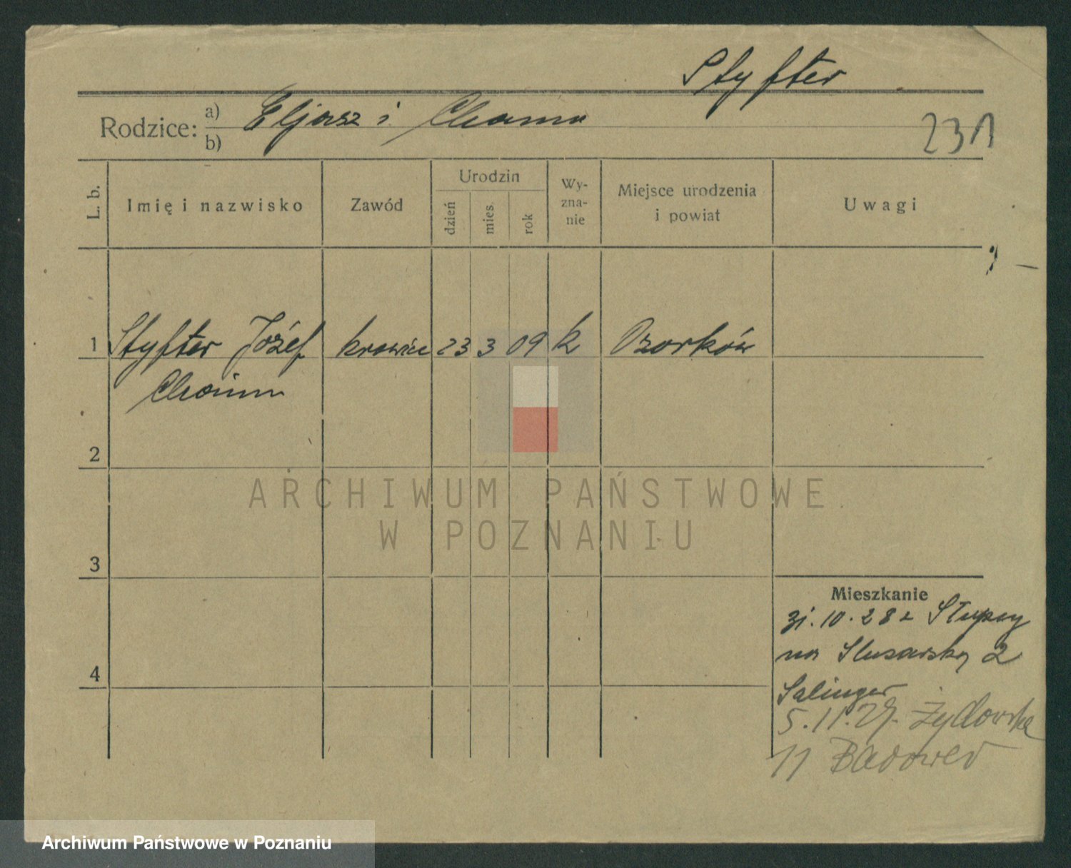 Podgląd karty osobowej dostępny jest po kliknięciu na nazwisko lub ikonkę karty. Można dokonywać powiększenia (ikony na górze) lub przechodzić między kolejnymi skanami (strzałki po bokach).