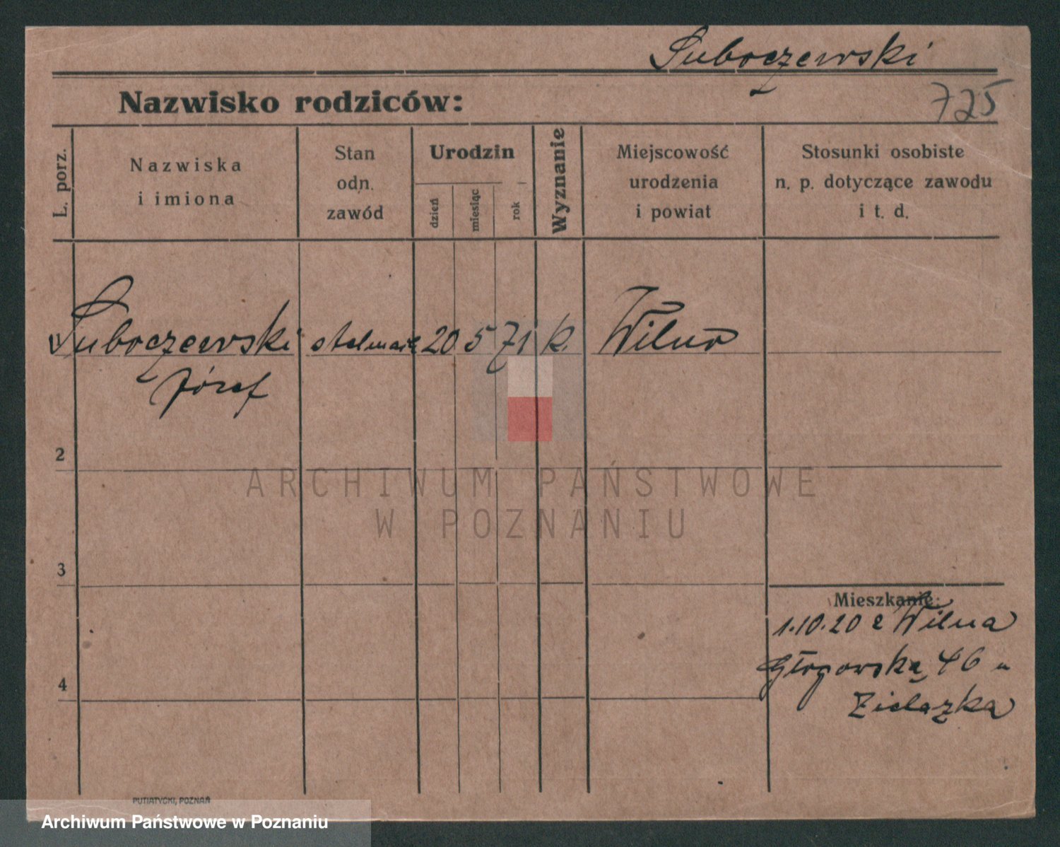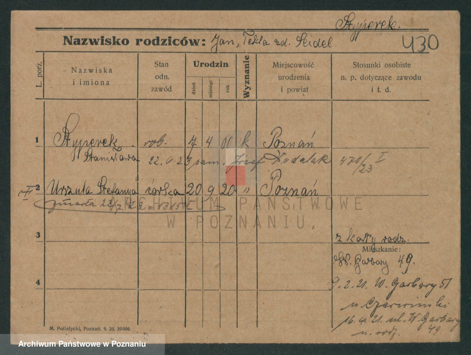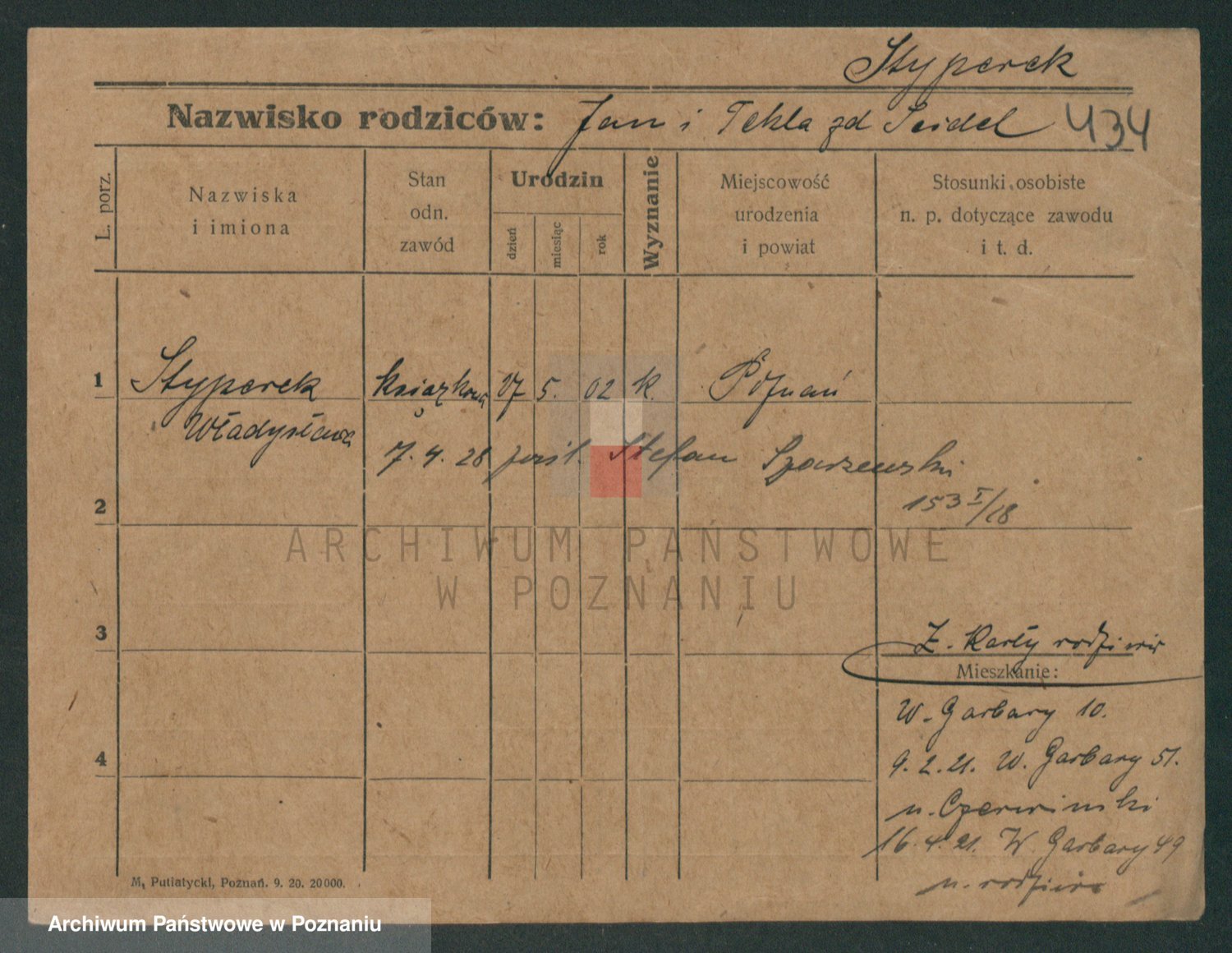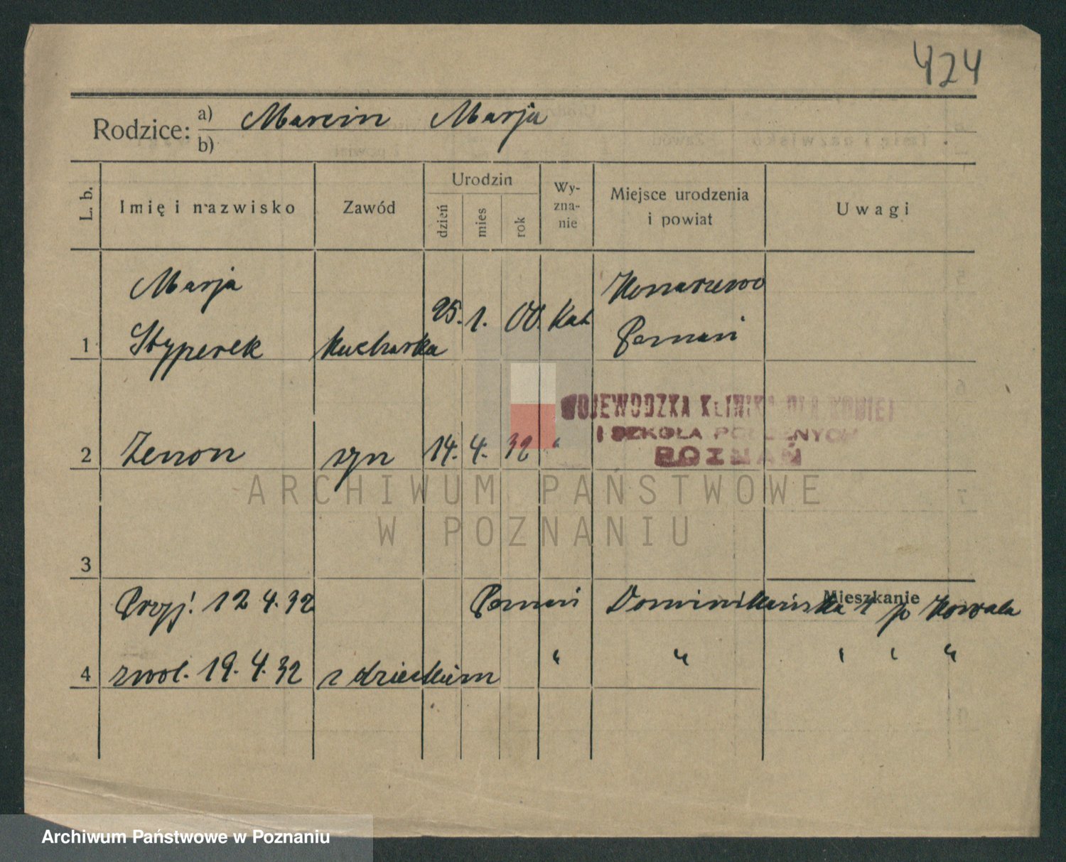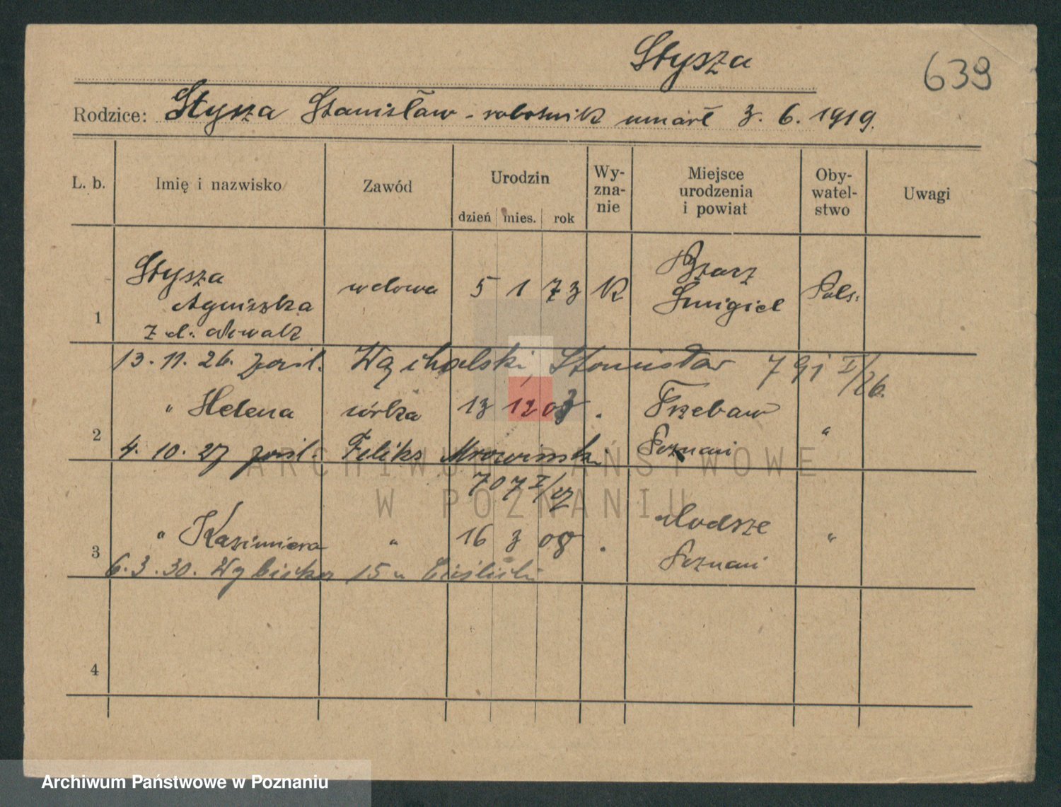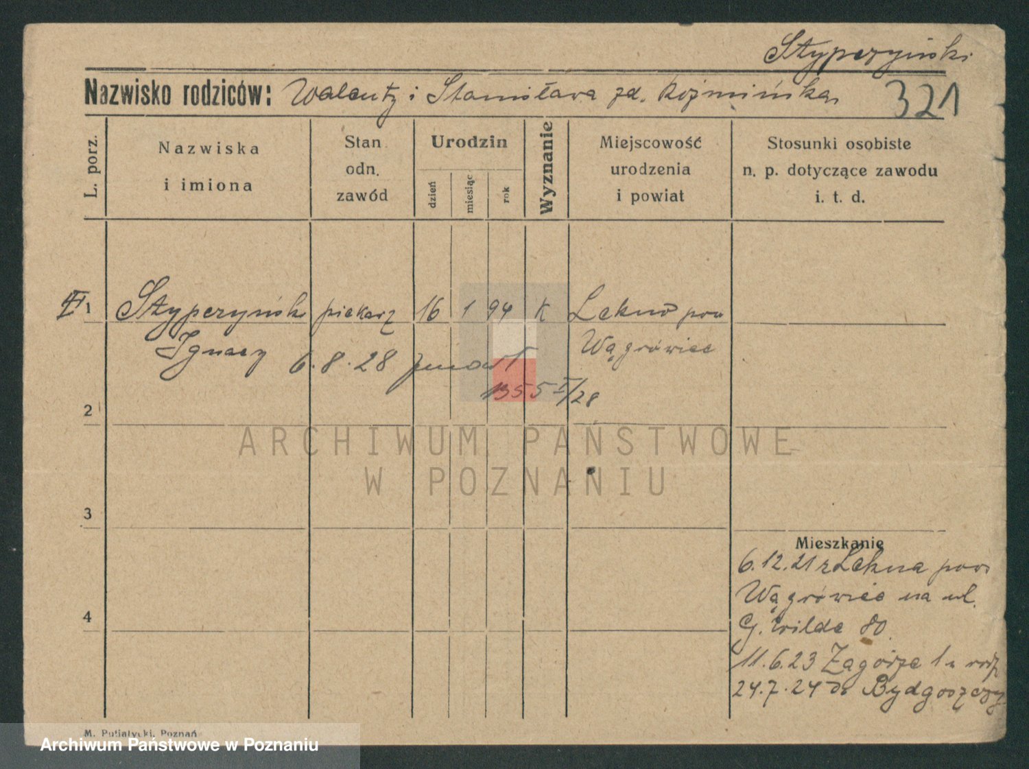 Podgląd karty osobowej dostępny jest po kliknięciu na nazwisko lub ikonkę karty. Można dokonywać powiększenia (ikony na górze) lub przechodzić między kolejnymi skanami (strzałki po bokach).