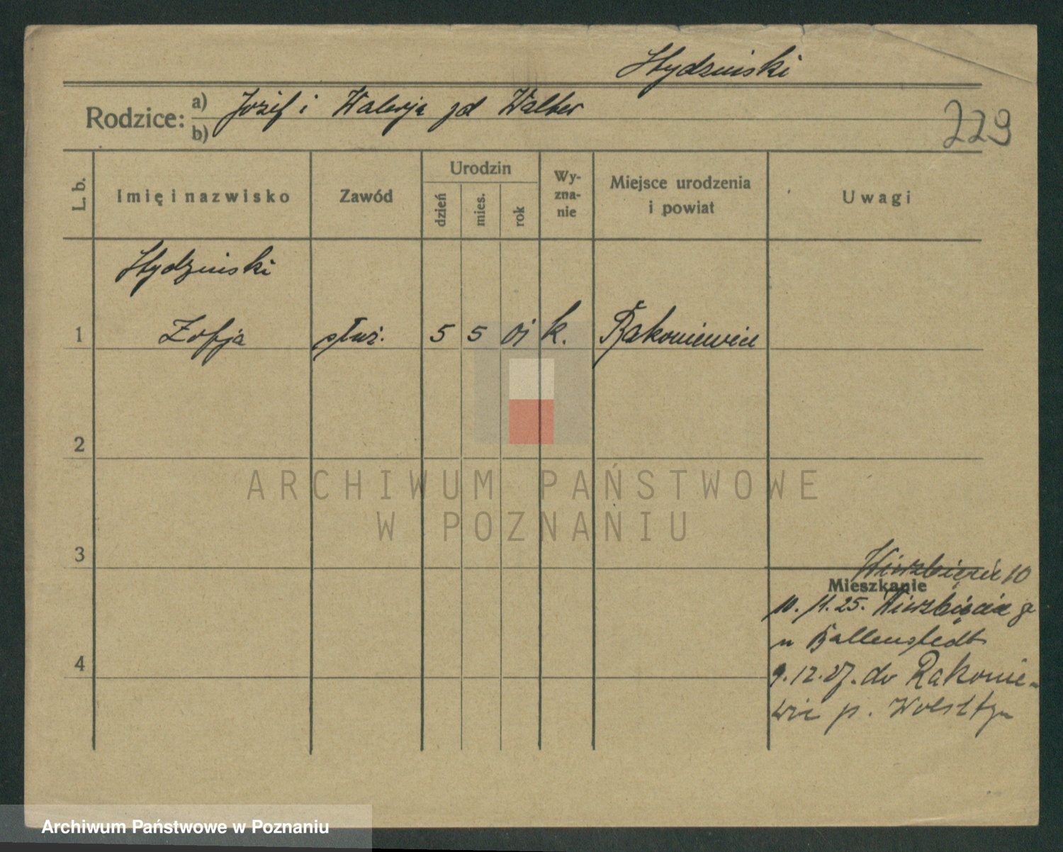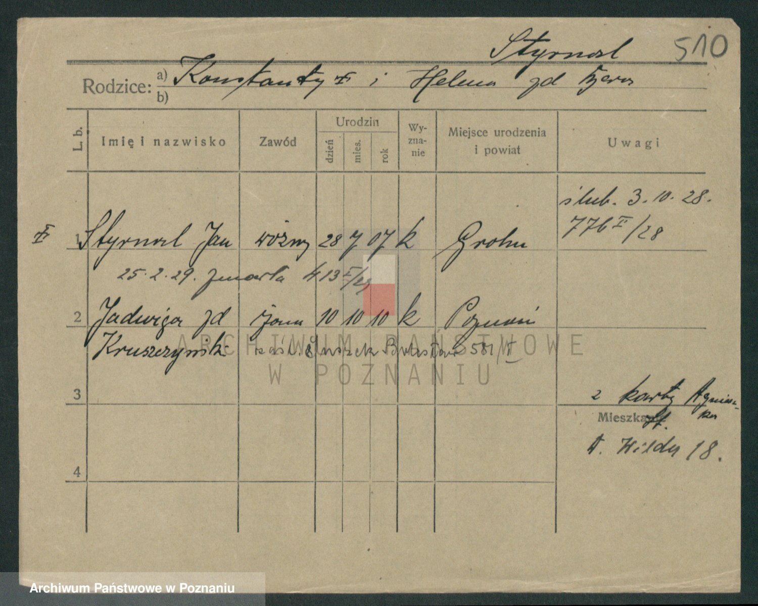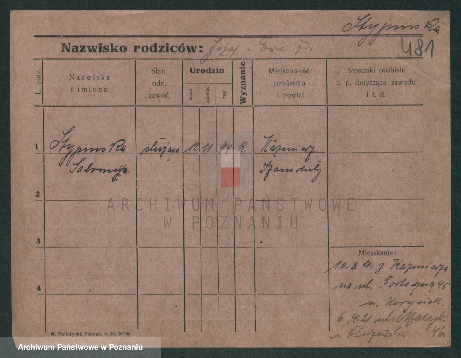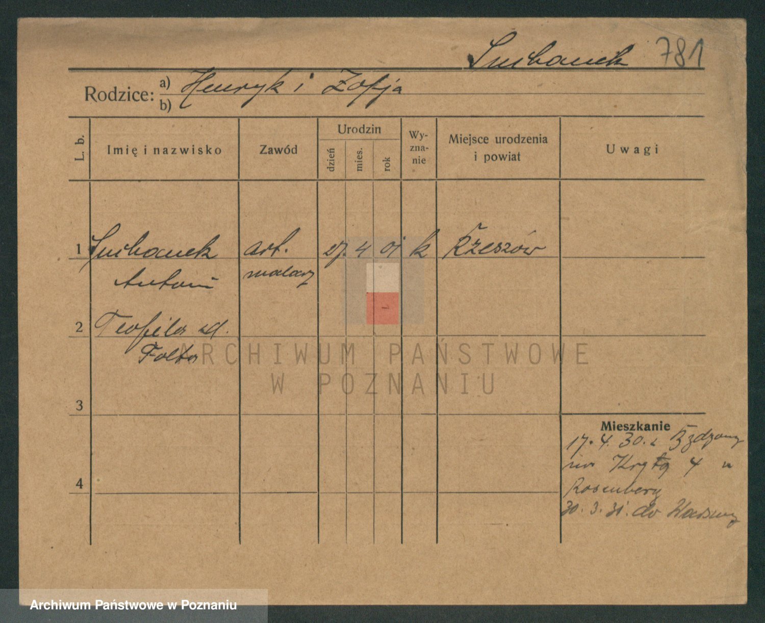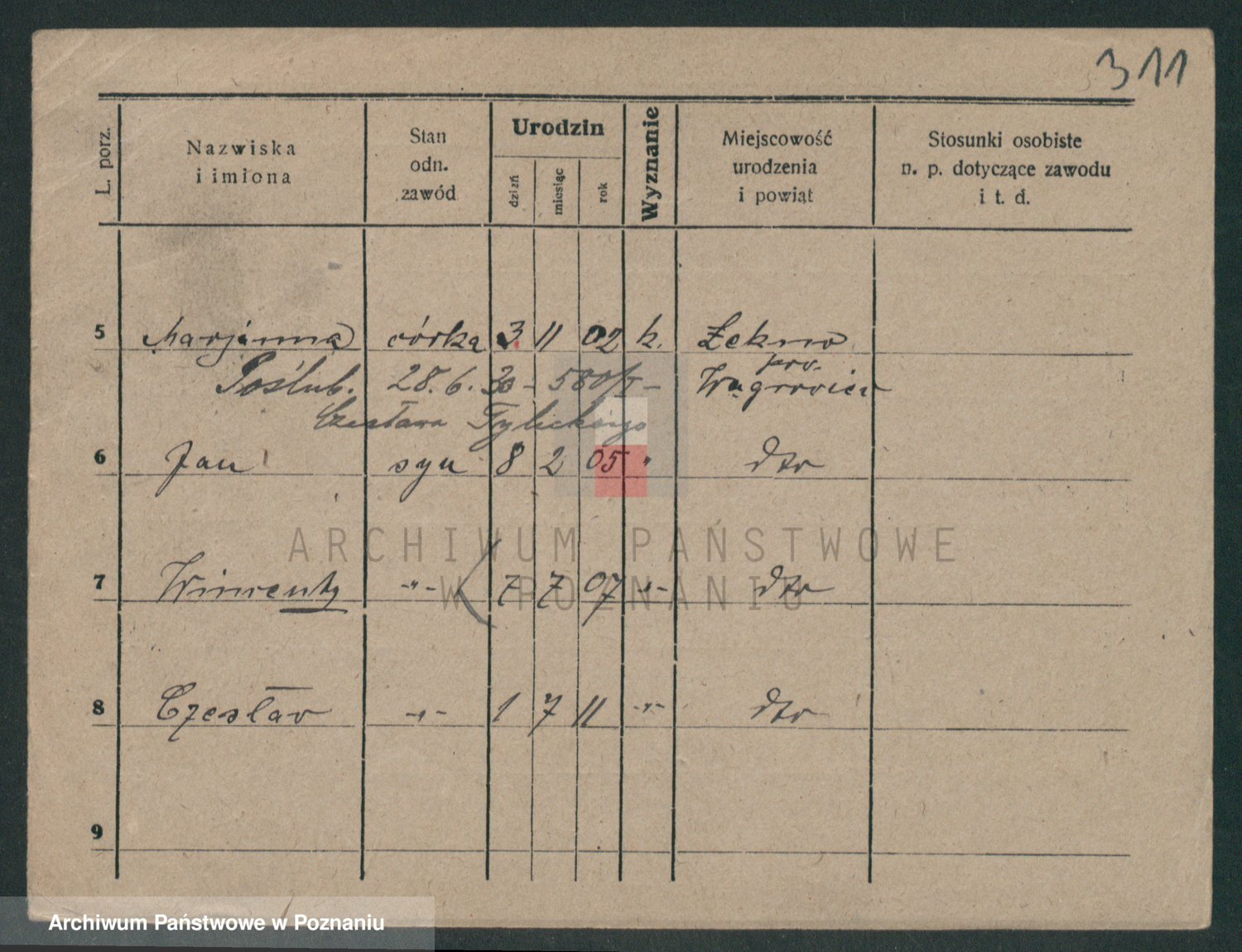 Podgląd karty osobowej dostępny jest po kliknięciu na nazwisko lub ikonkę karty. Można dokonywać powiększenia (ikony na górze) lub przechodzić między kolejnymi skanami (strzałki po bokach).