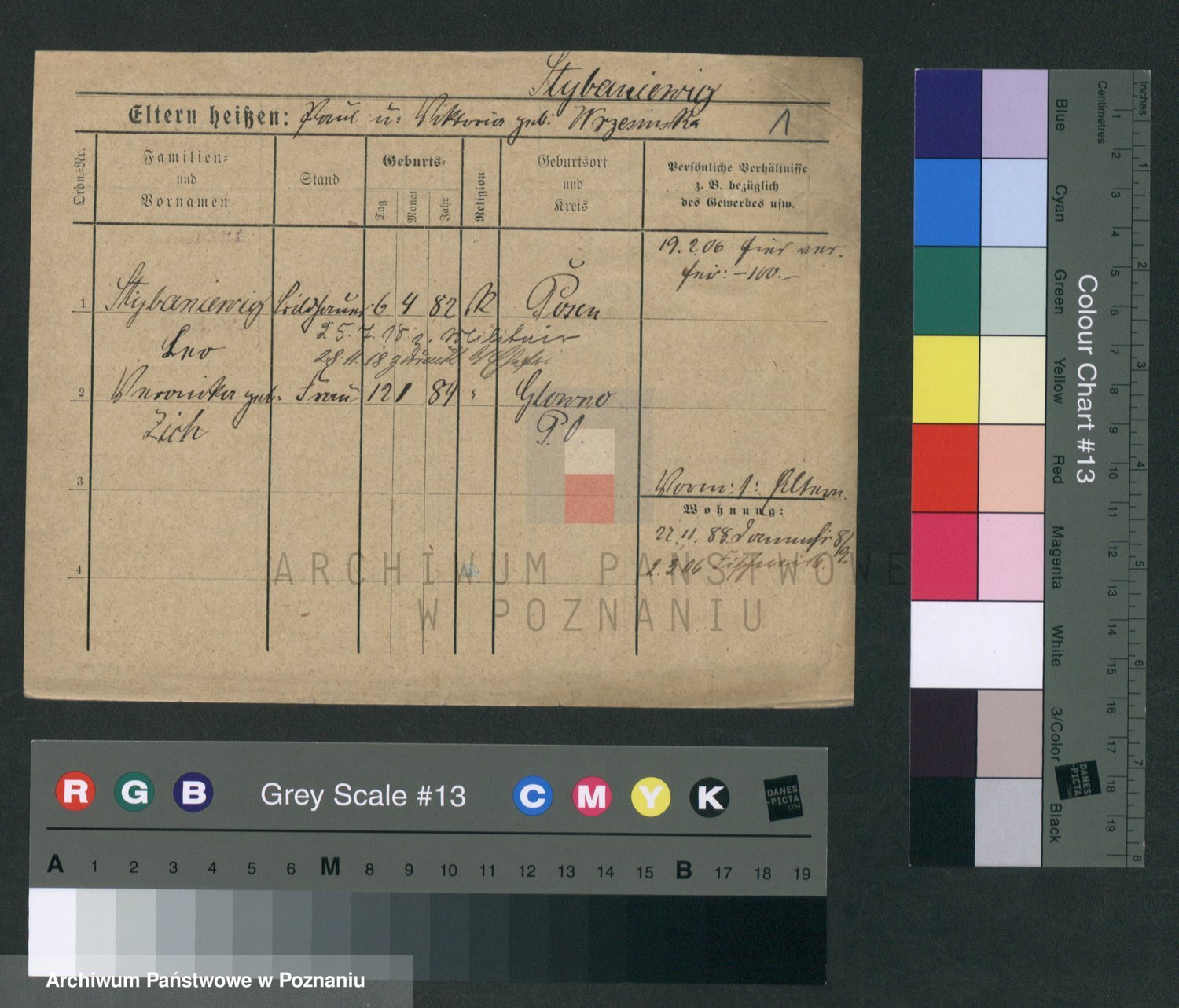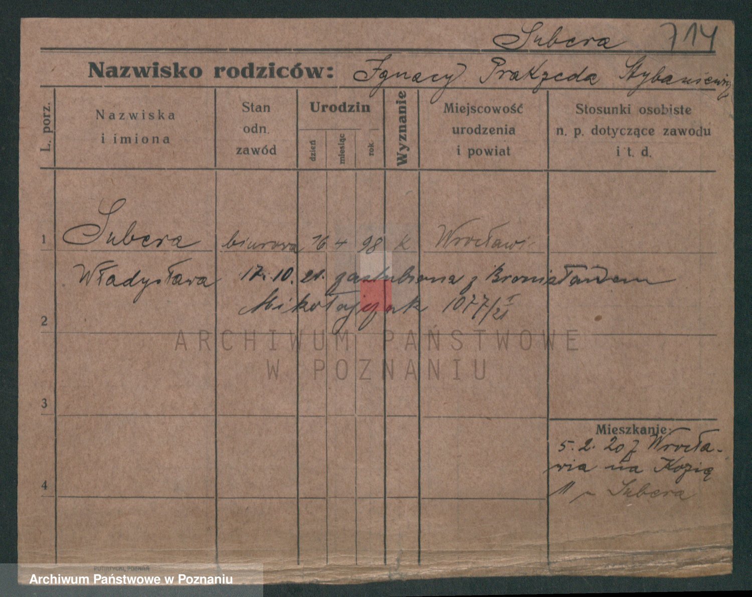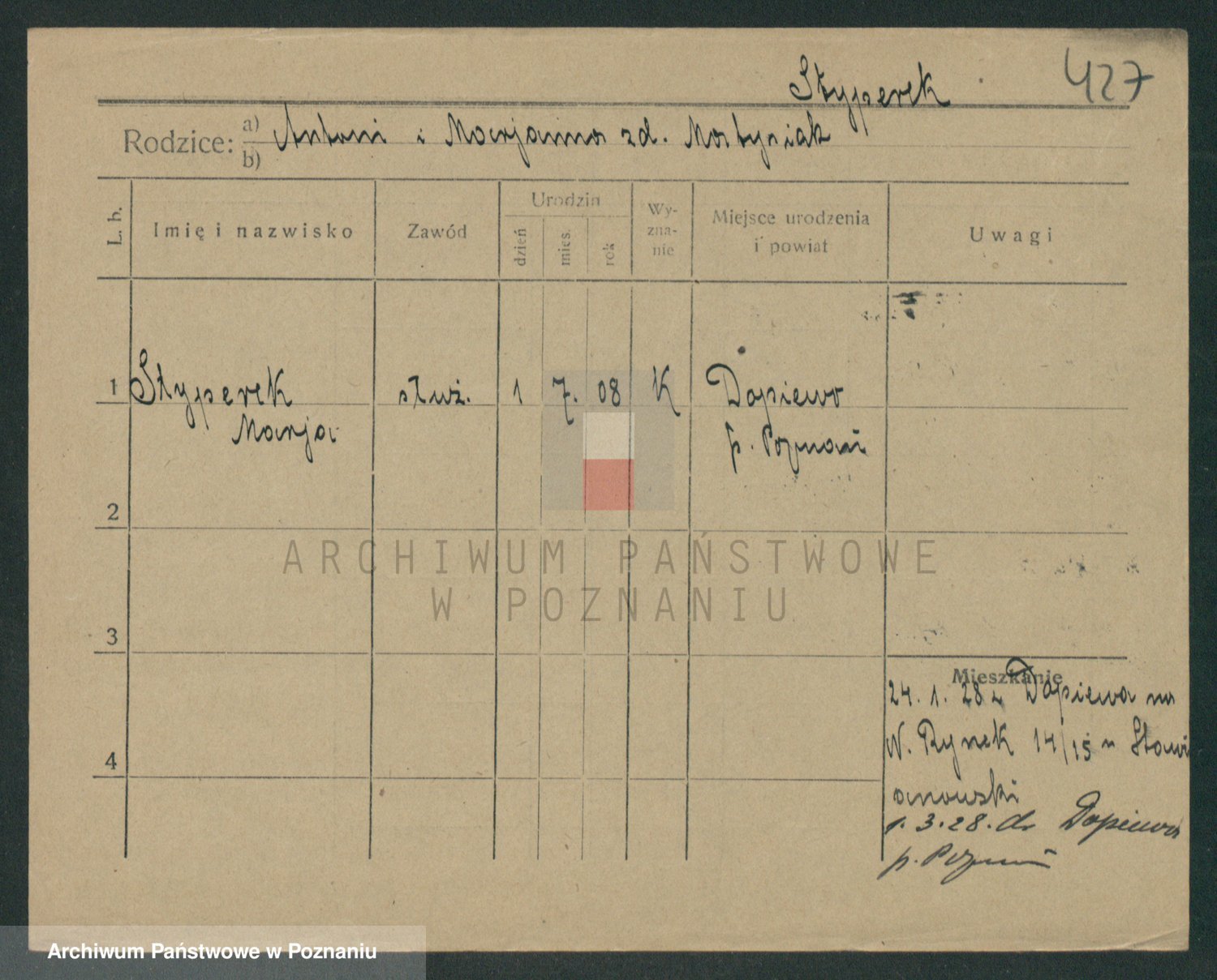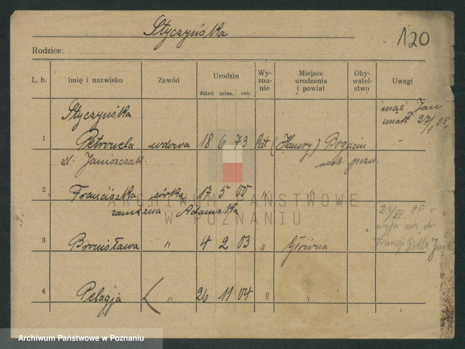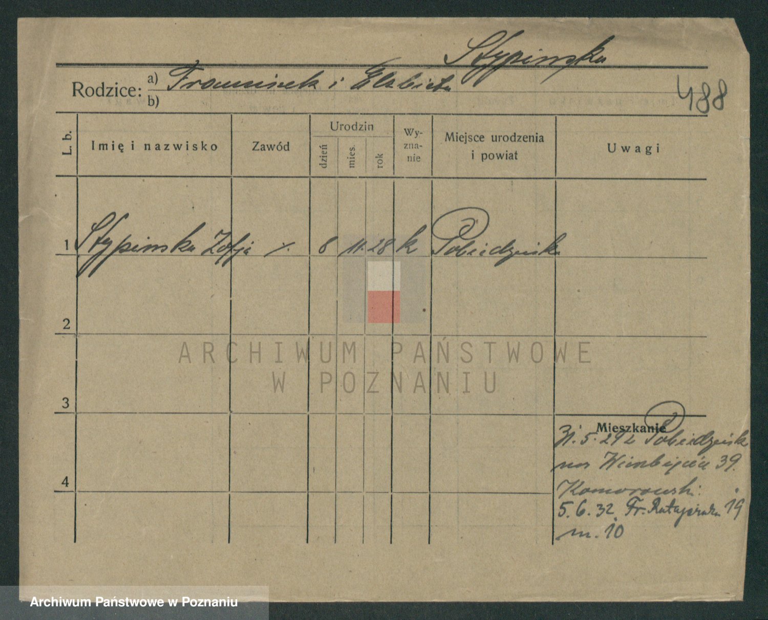 Podgląd karty osobowej dostępny jest po kliknięciu na nazwisko lub ikonkę karty. Można dokonywać powiększenia (ikony na górze) lub przechodzić między kolejnymi skanami (strzałki po bokach).