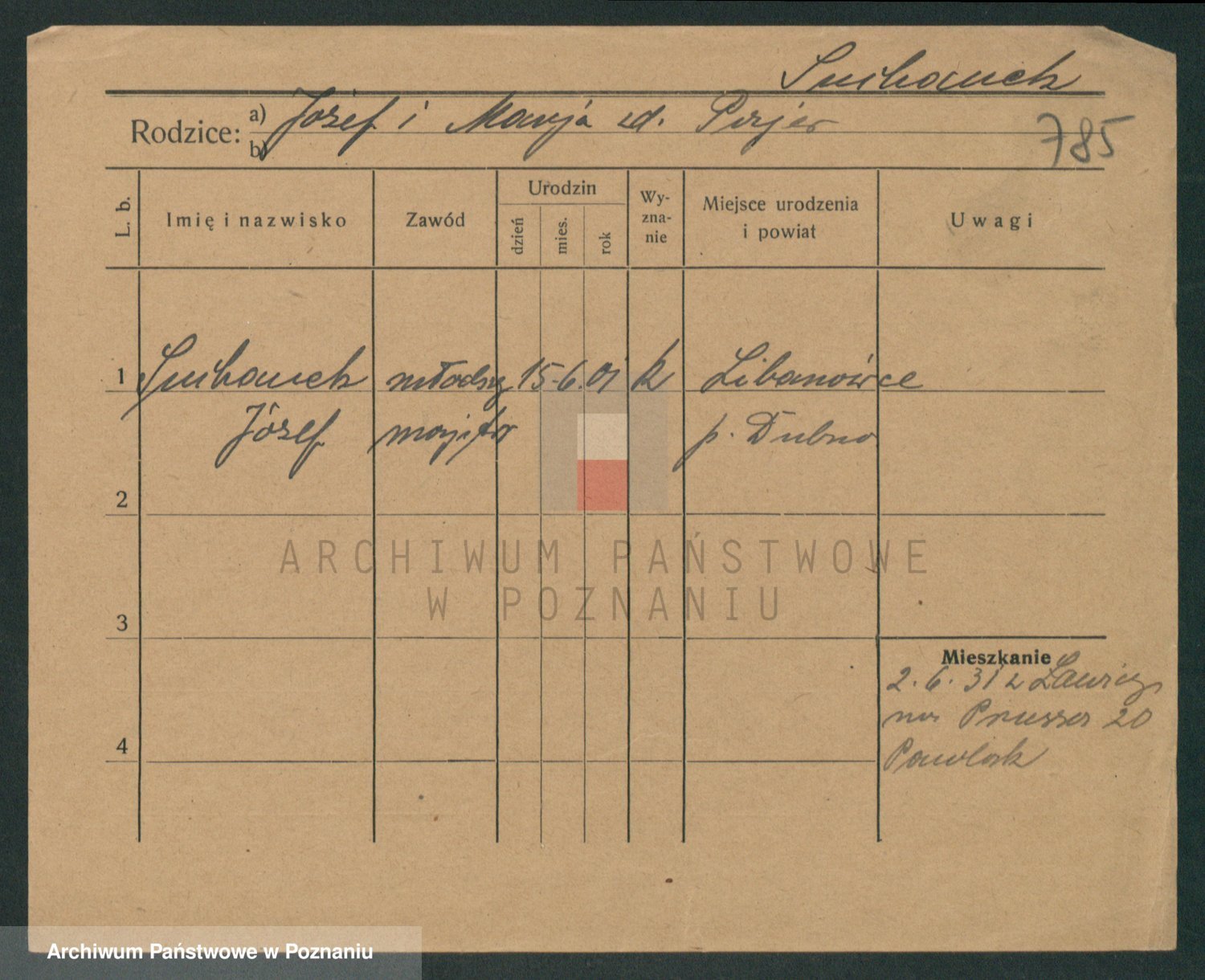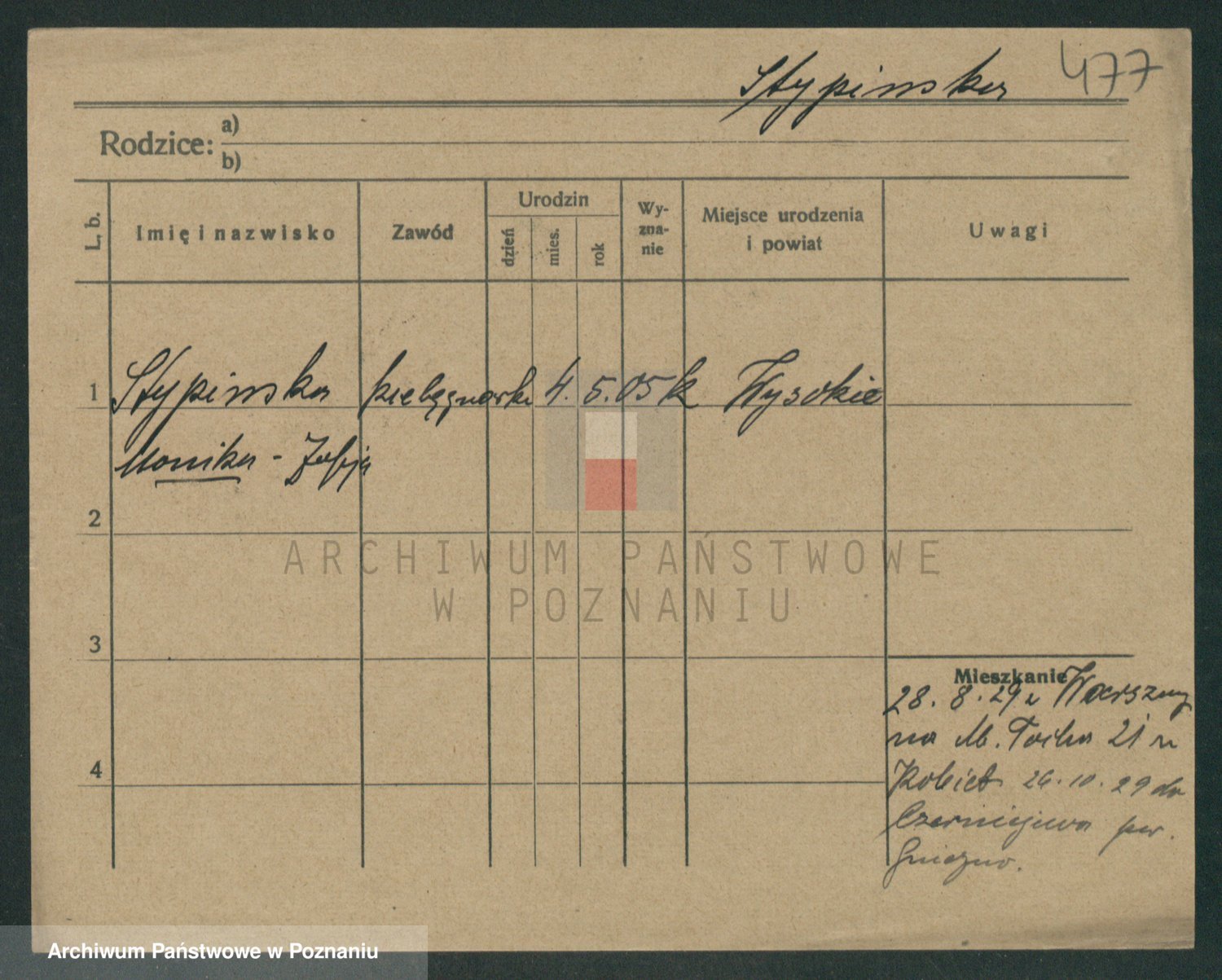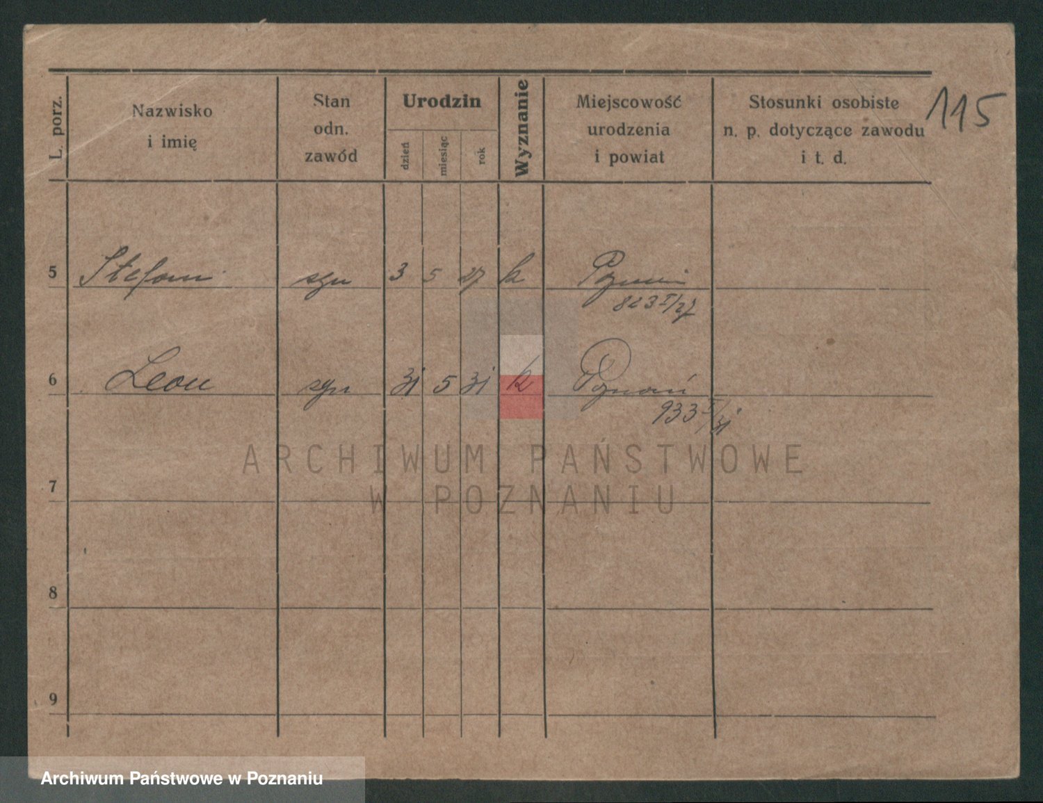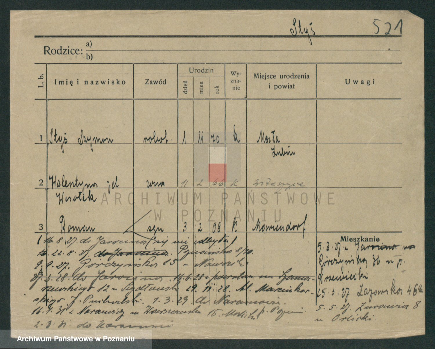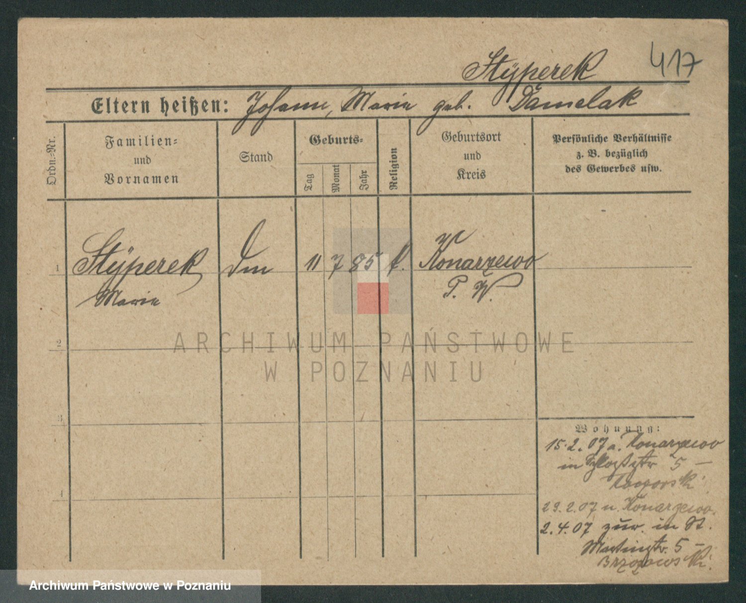 Podgląd karty osobowej dostępny jest po kliknięciu na nazwisko lub ikonkę karty. Można dokonywać powiększenia (ikony na górze) lub przechodzić między kolejnymi skanami (strzałki po bokach).