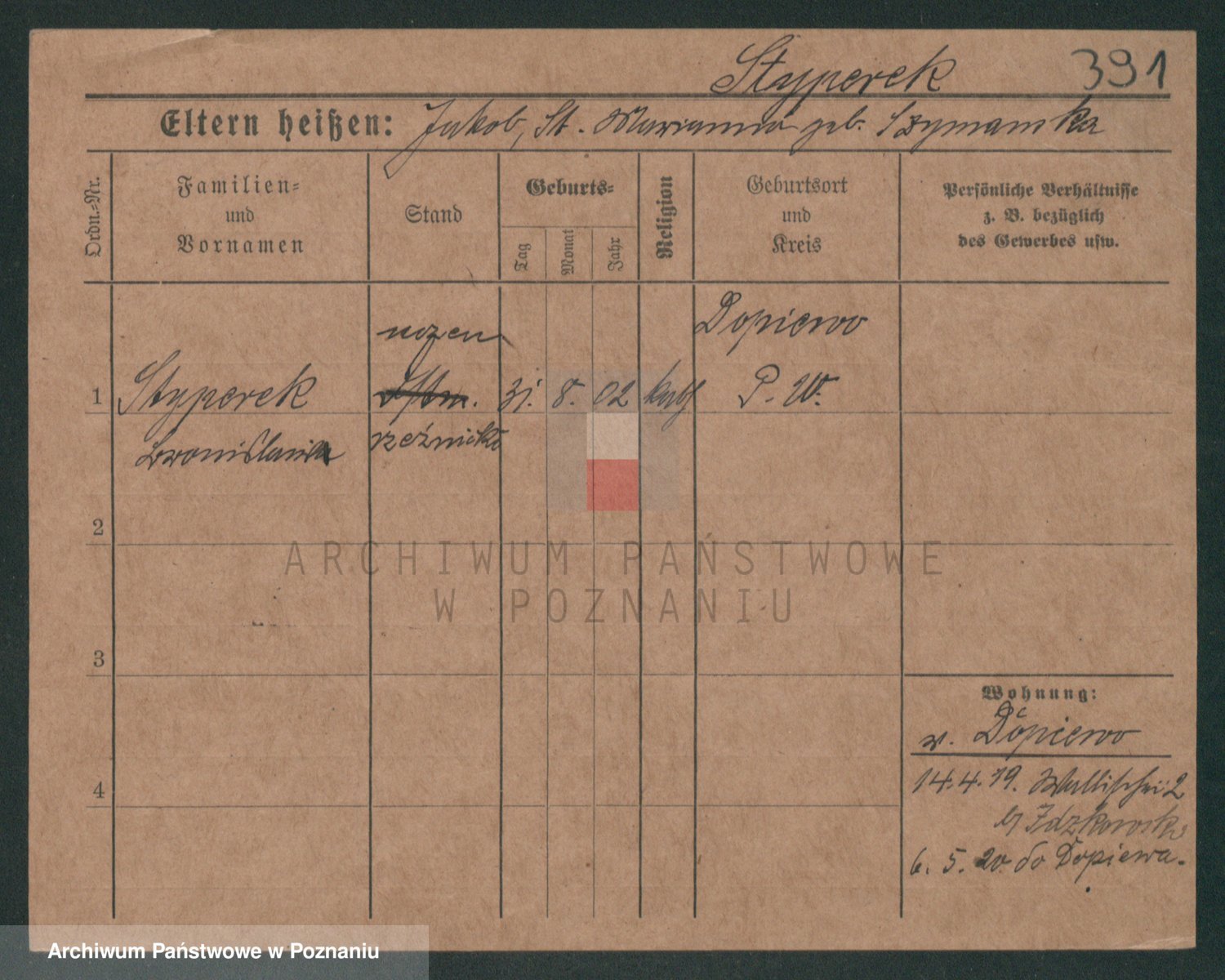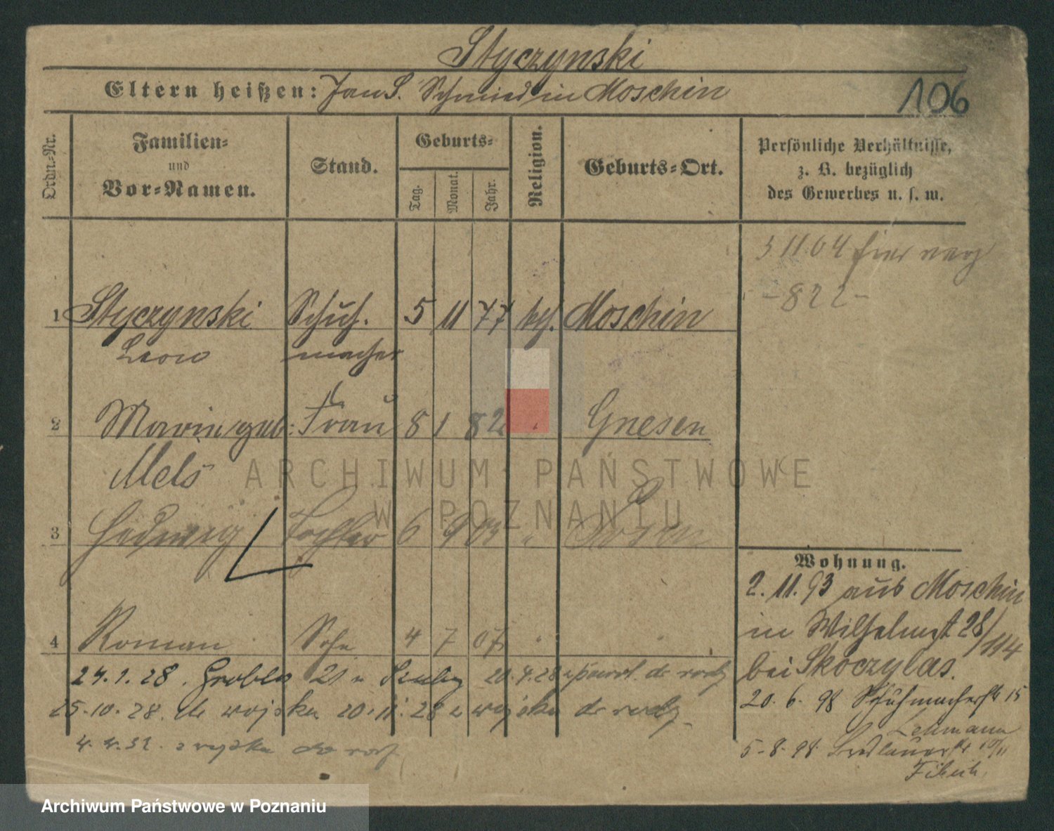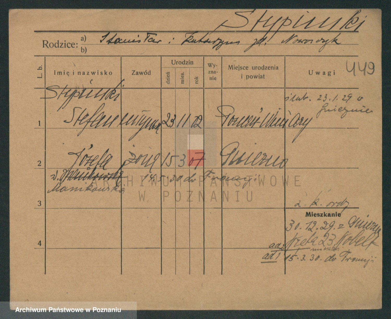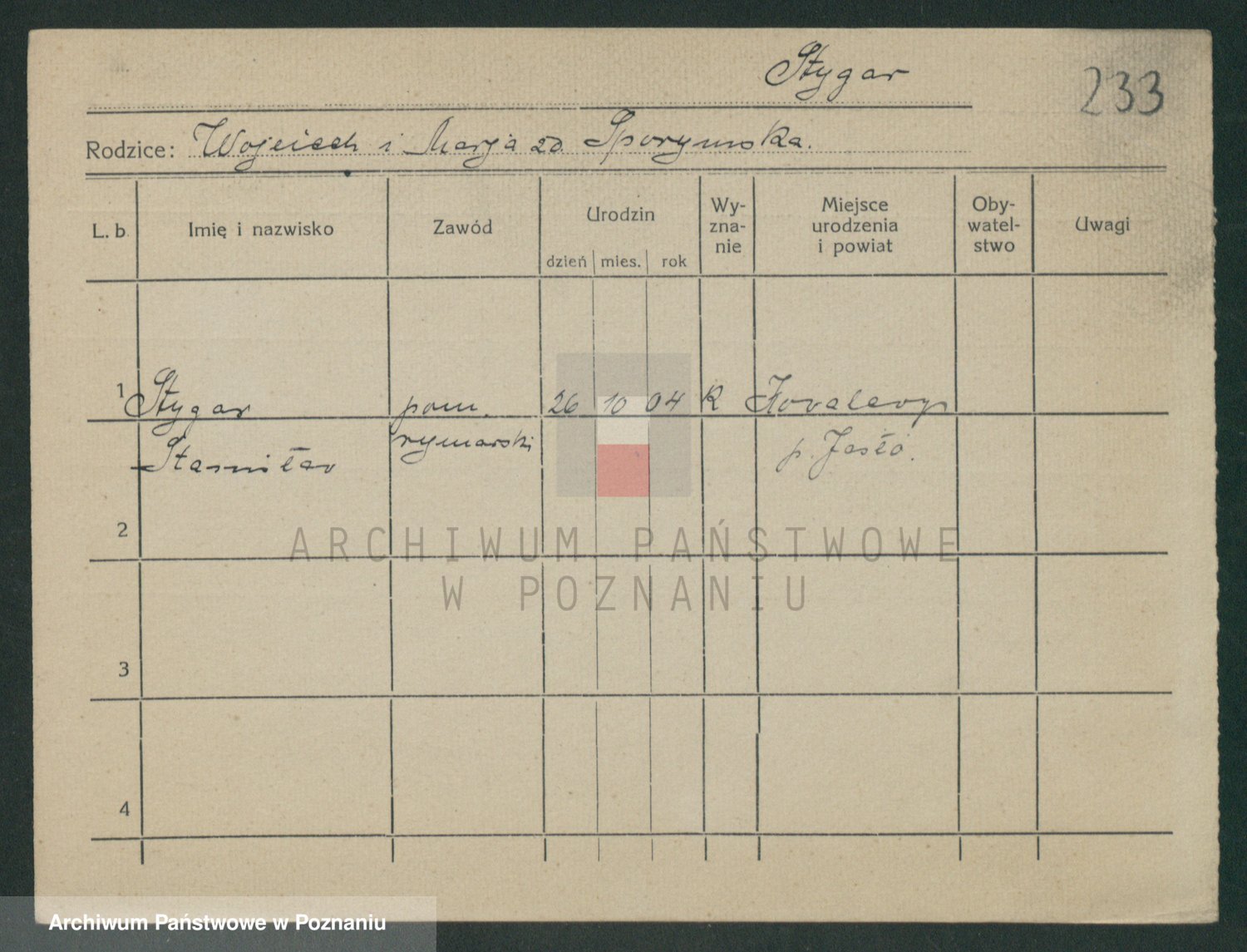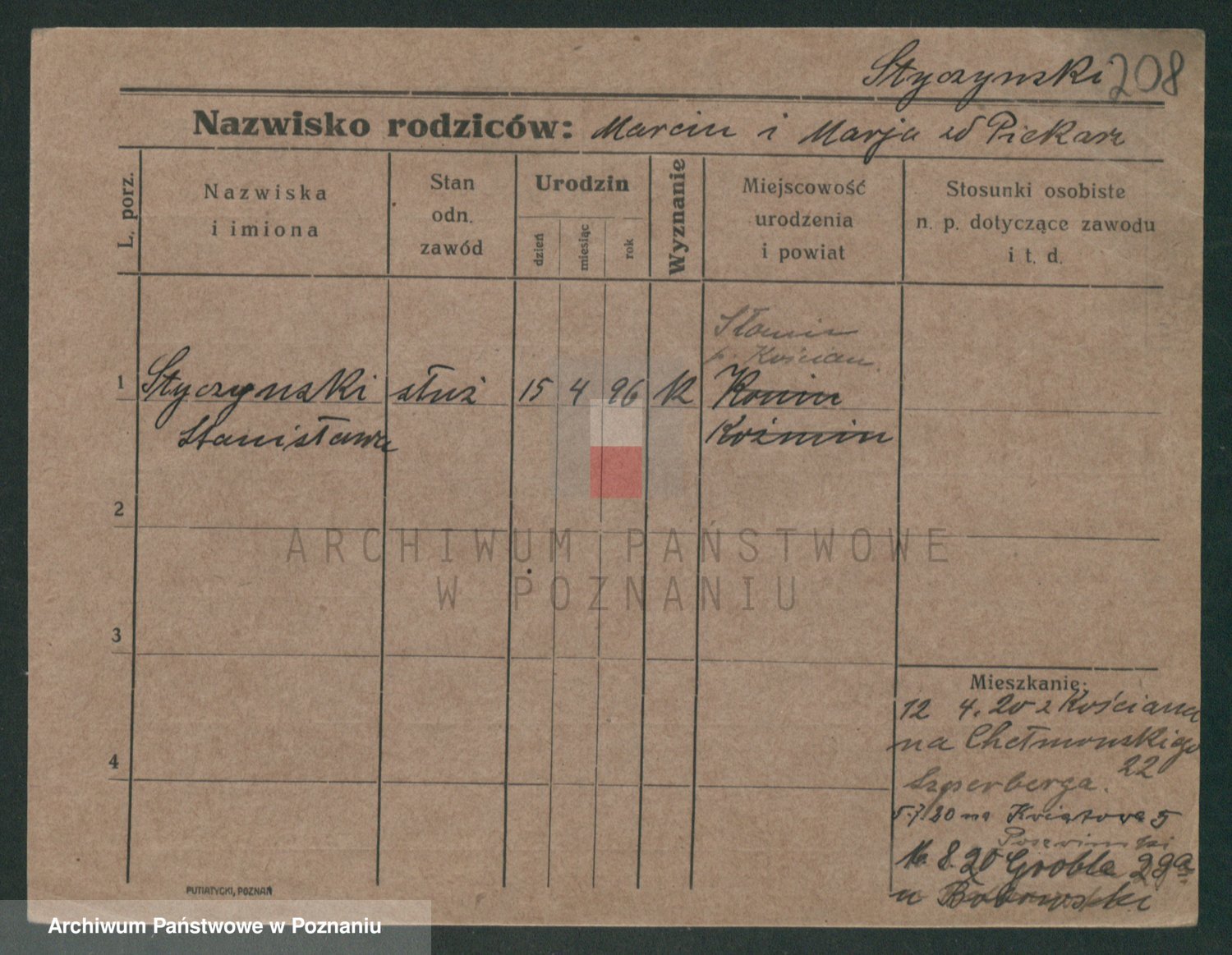 Podgląd karty osobowej dostępny jest po kliknięciu na nazwisko lub ikonkę karty. Można dokonywać powiększenia (ikony na górze) lub przechodzić między kolejnymi skanami (strzałki po bokach).