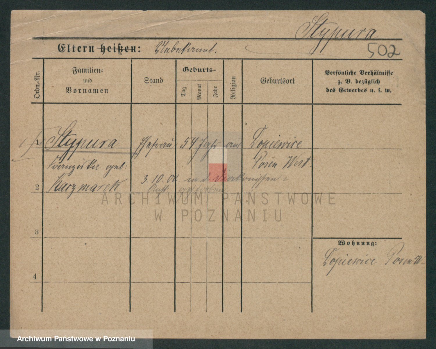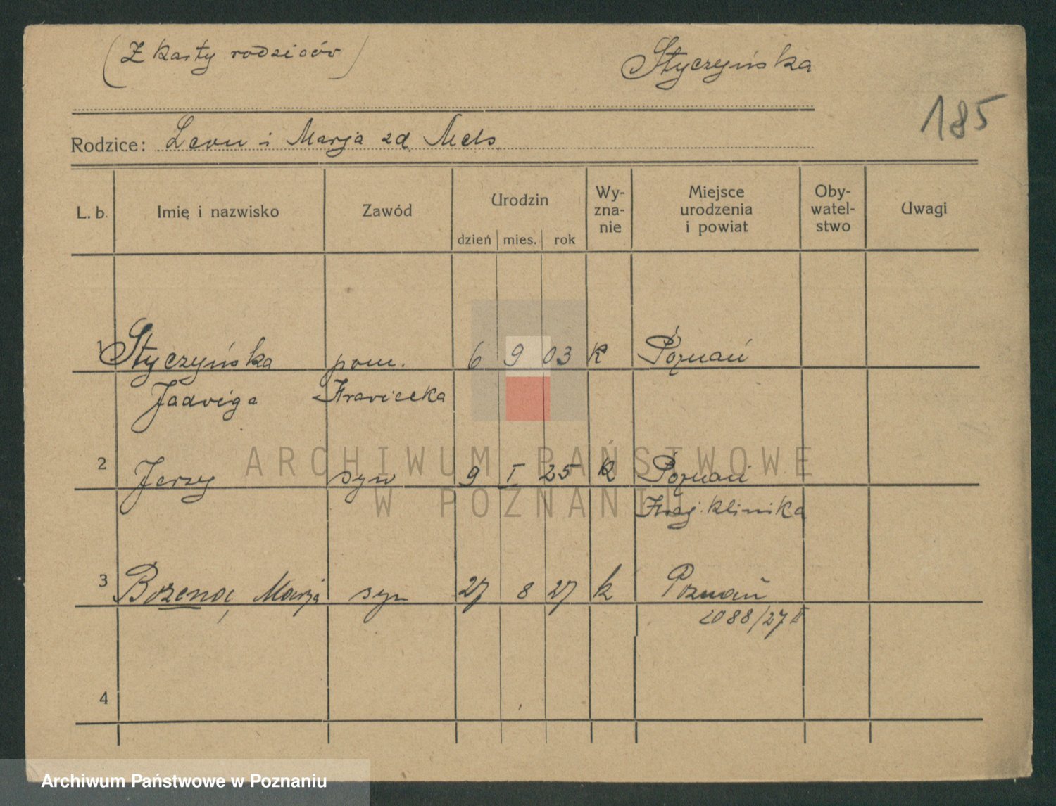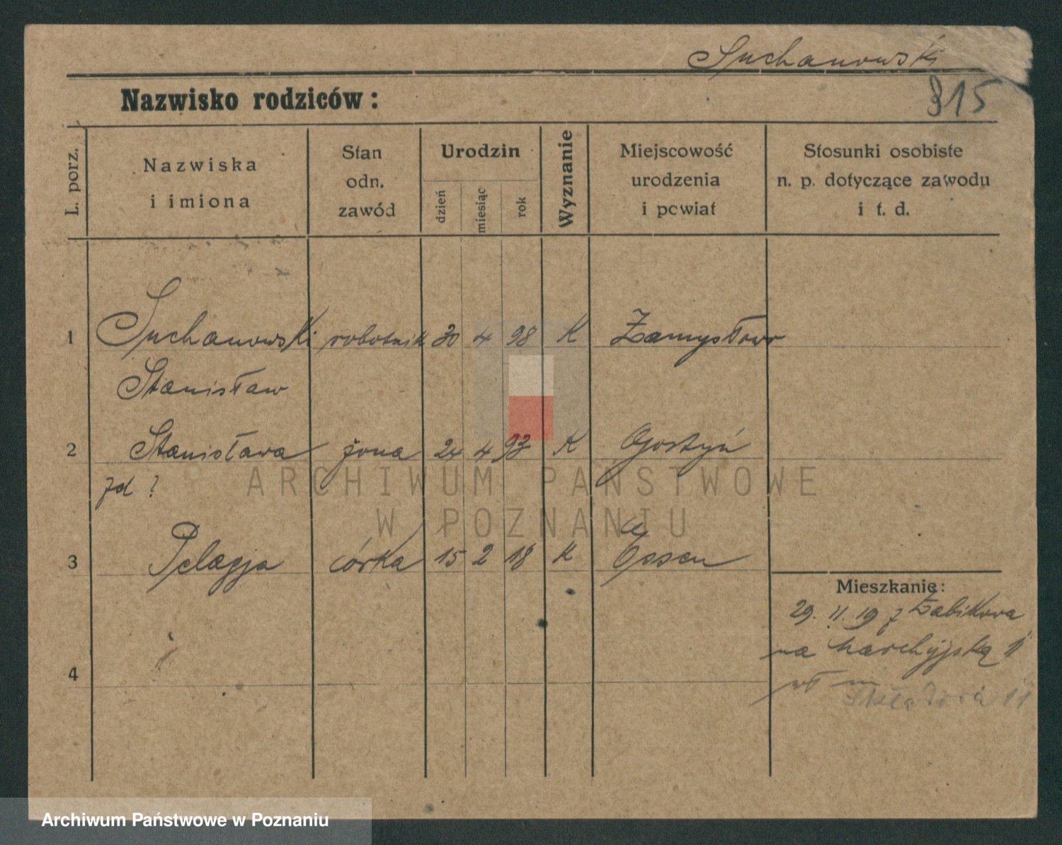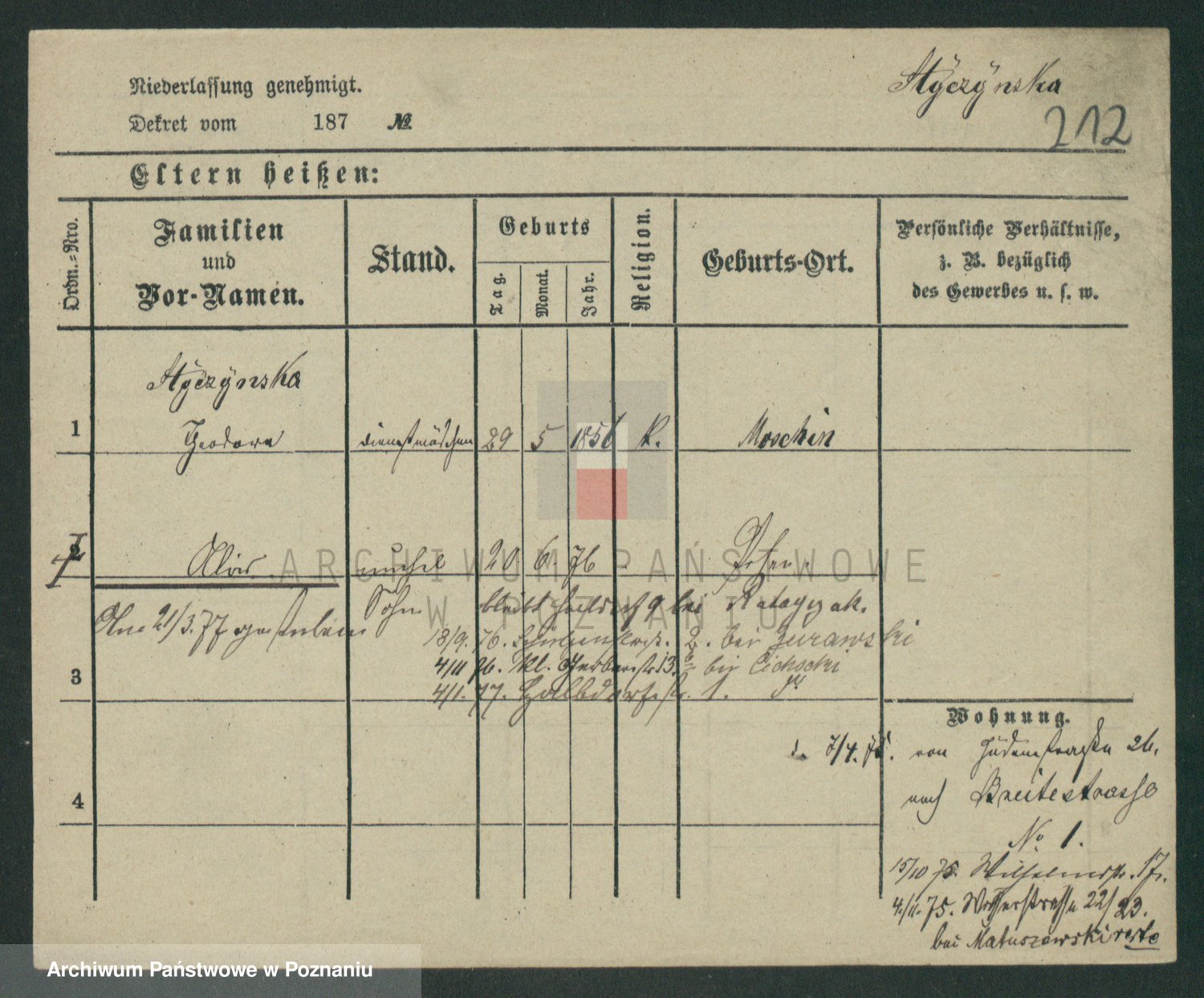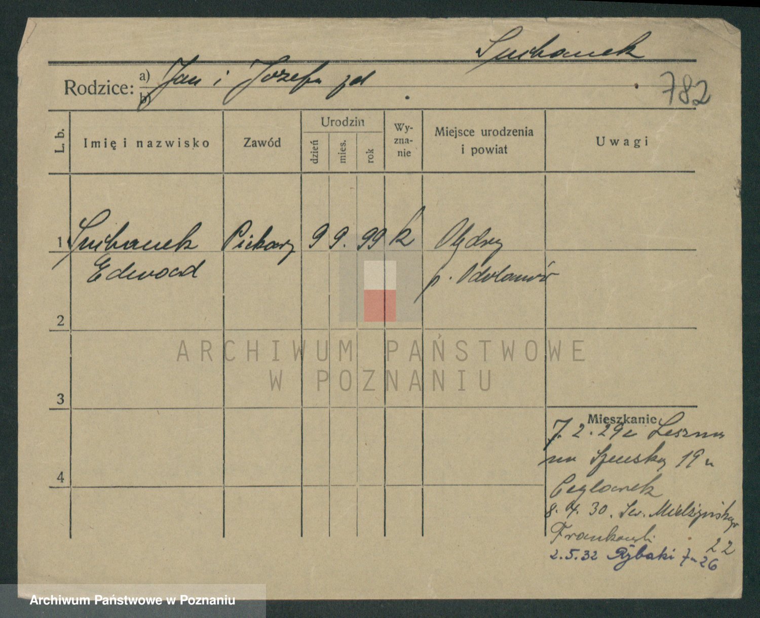 Podgląd karty osobowej dostępny jest po kliknięciu na nazwisko lub ikonkę karty. Można dokonywać powiększenia (ikony na górze) lub przechodzić między kolejnymi skanami (strzałki po bokach).