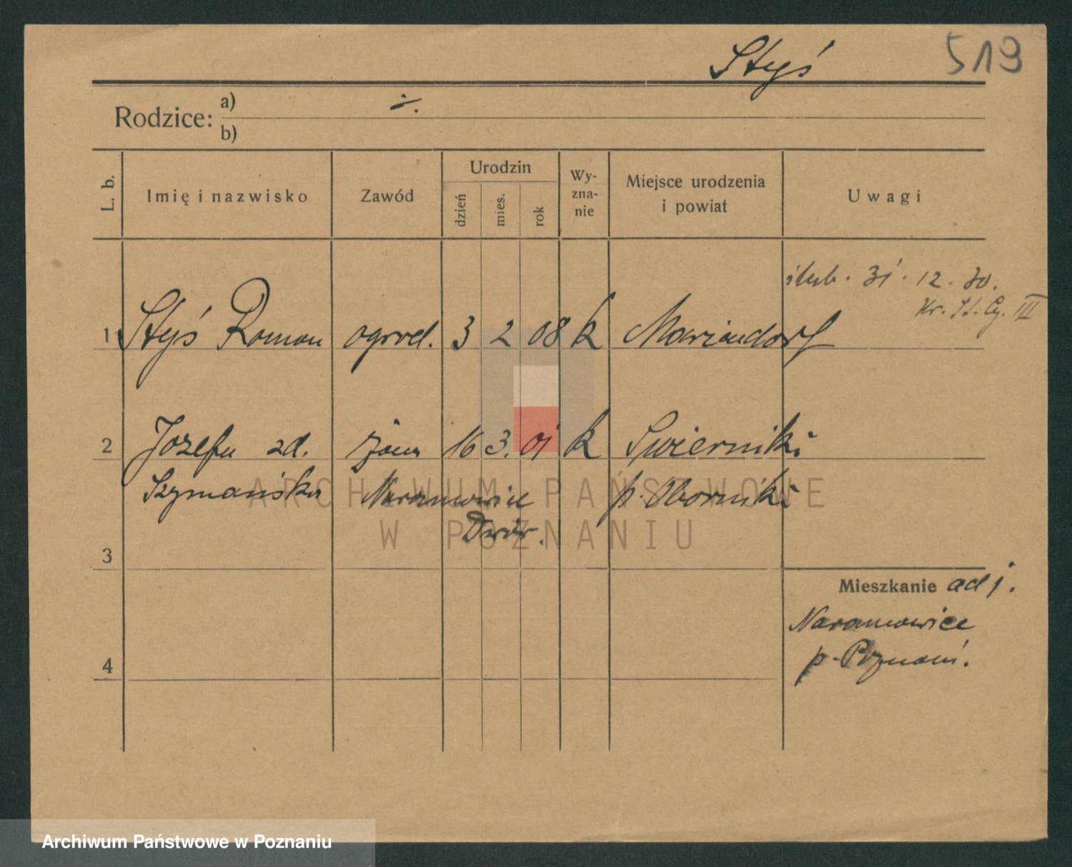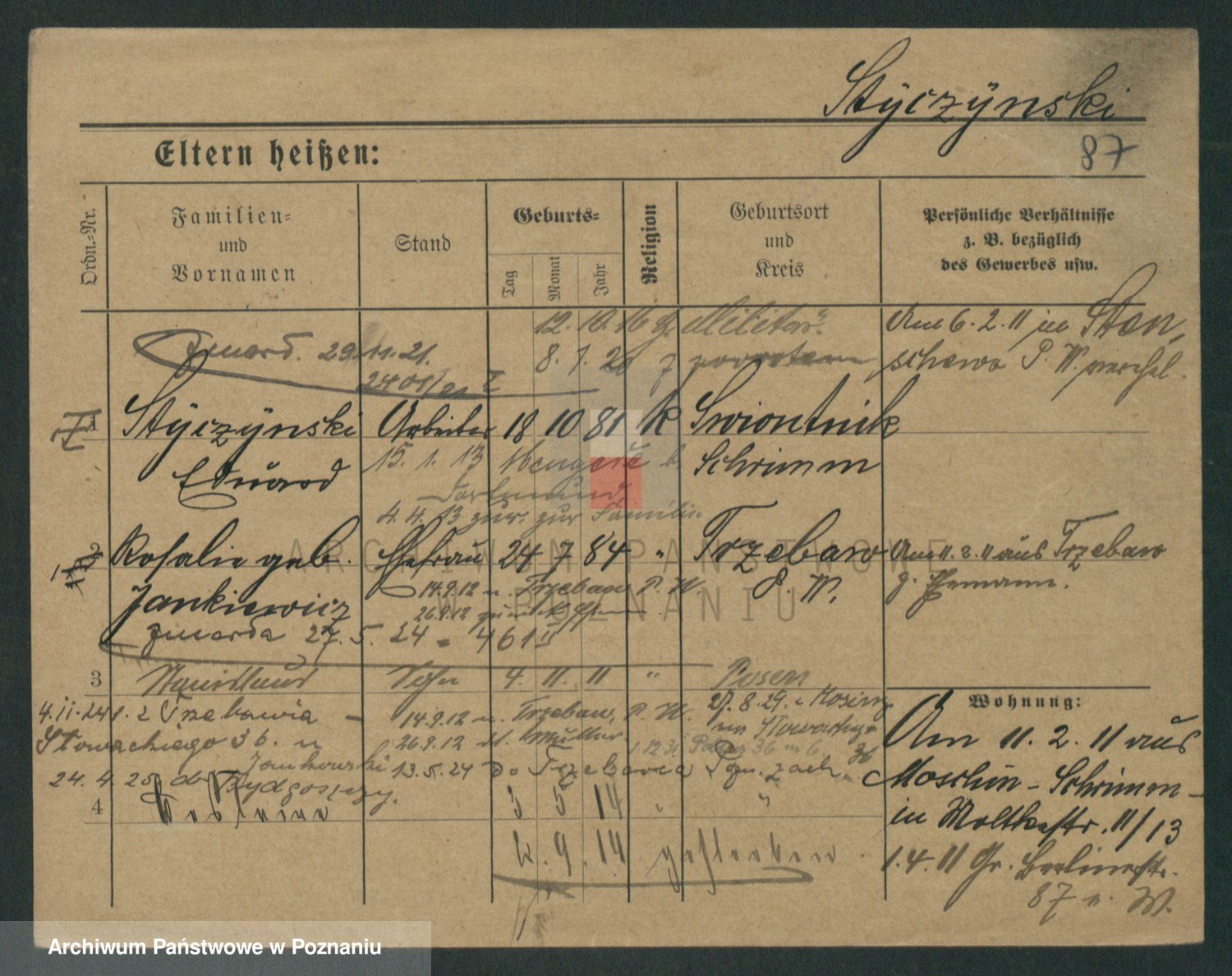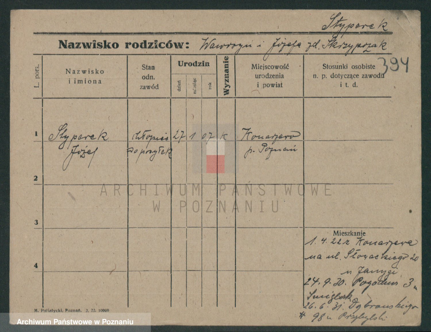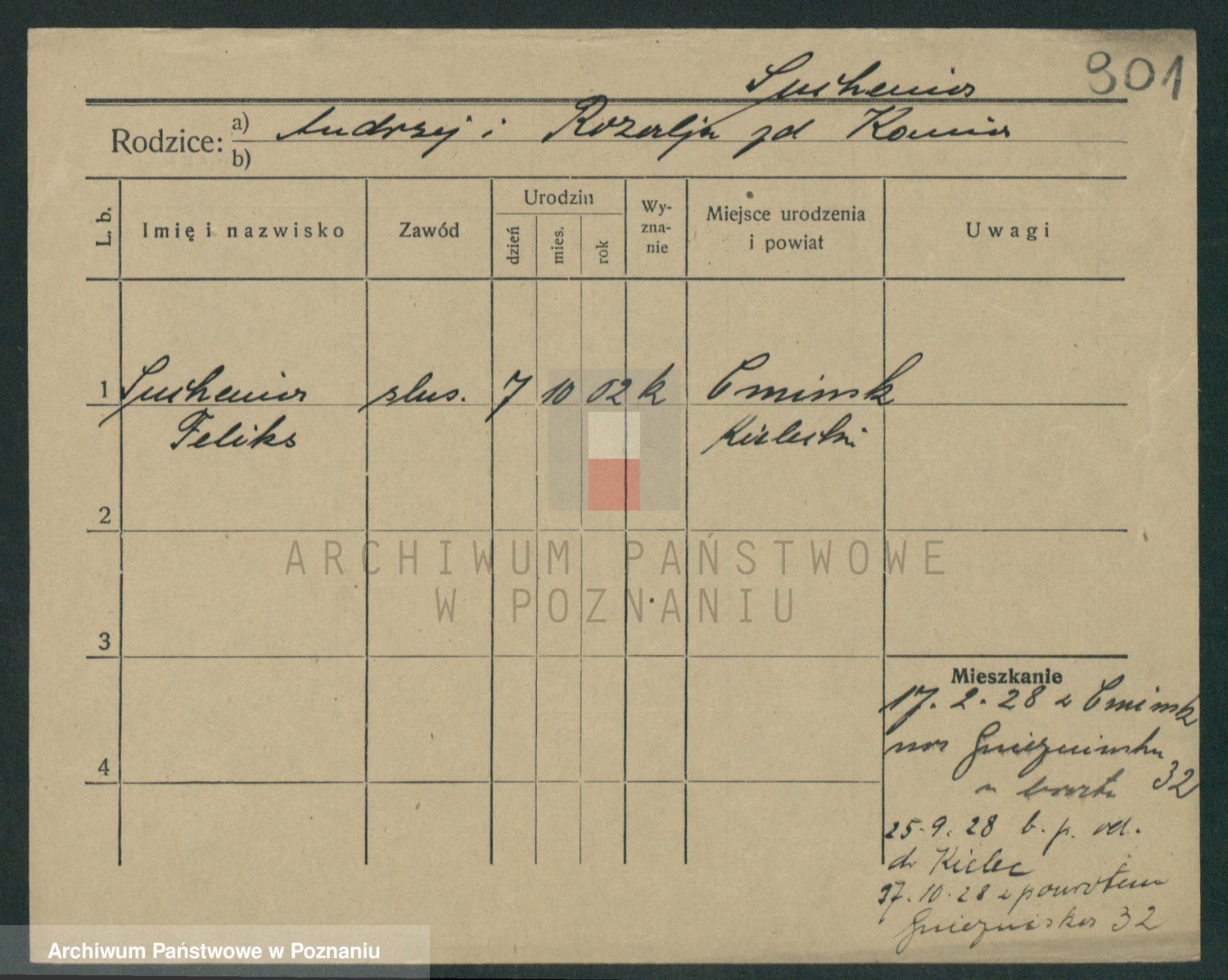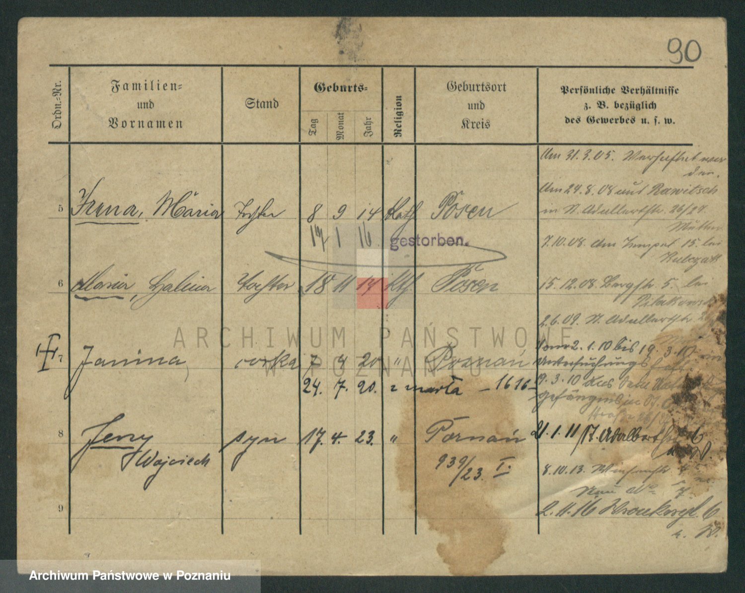 Podgląd karty osobowej dostępny jest po kliknięciu na nazwisko lub ikonkę karty. Można dokonywać powiększenia (ikony na górze) lub przechodzić między kolejnymi skanami (strzałki po bokach).