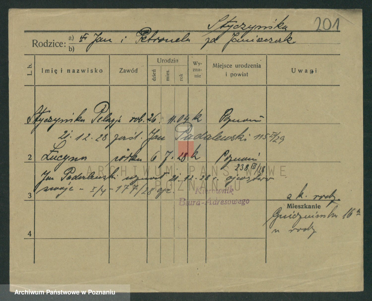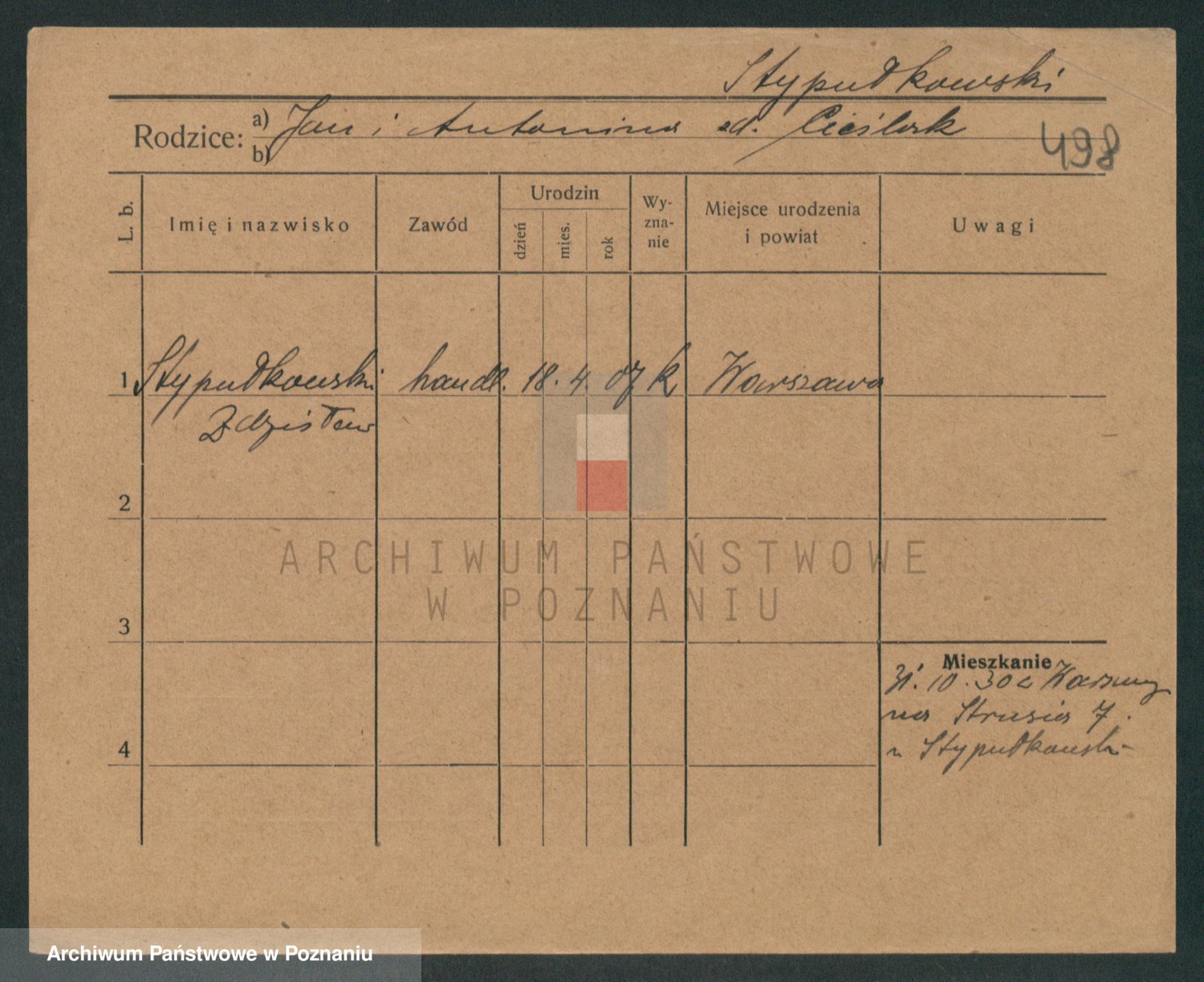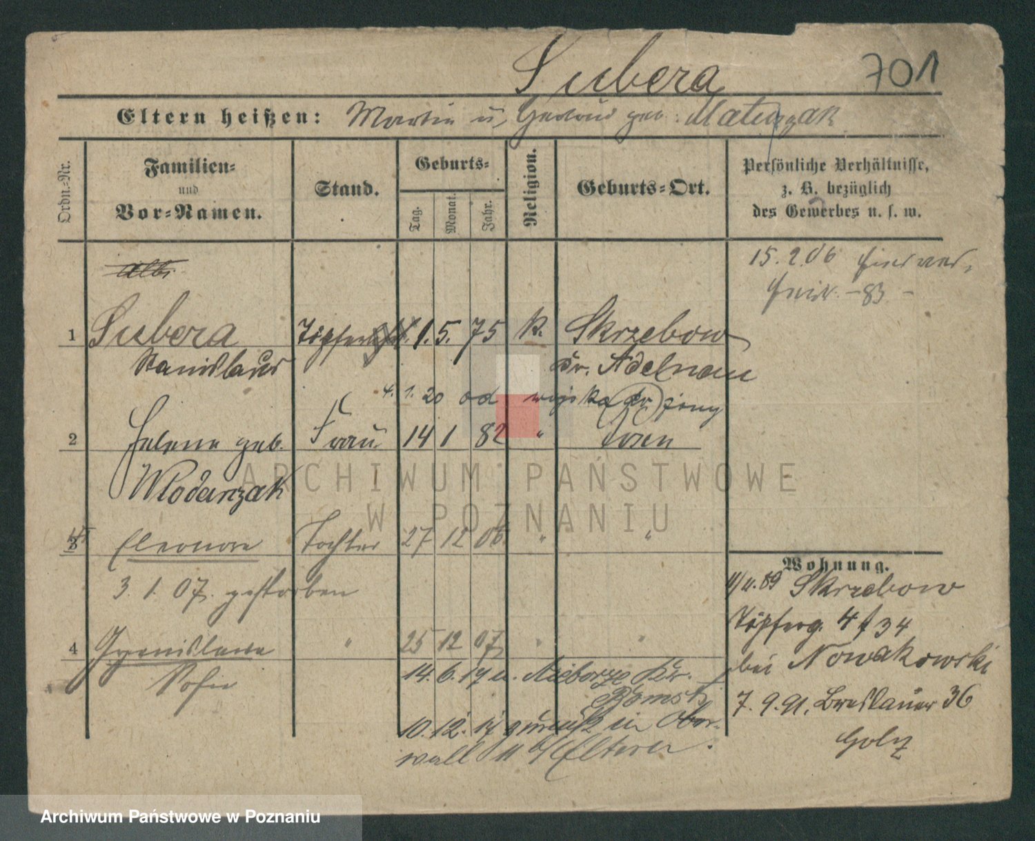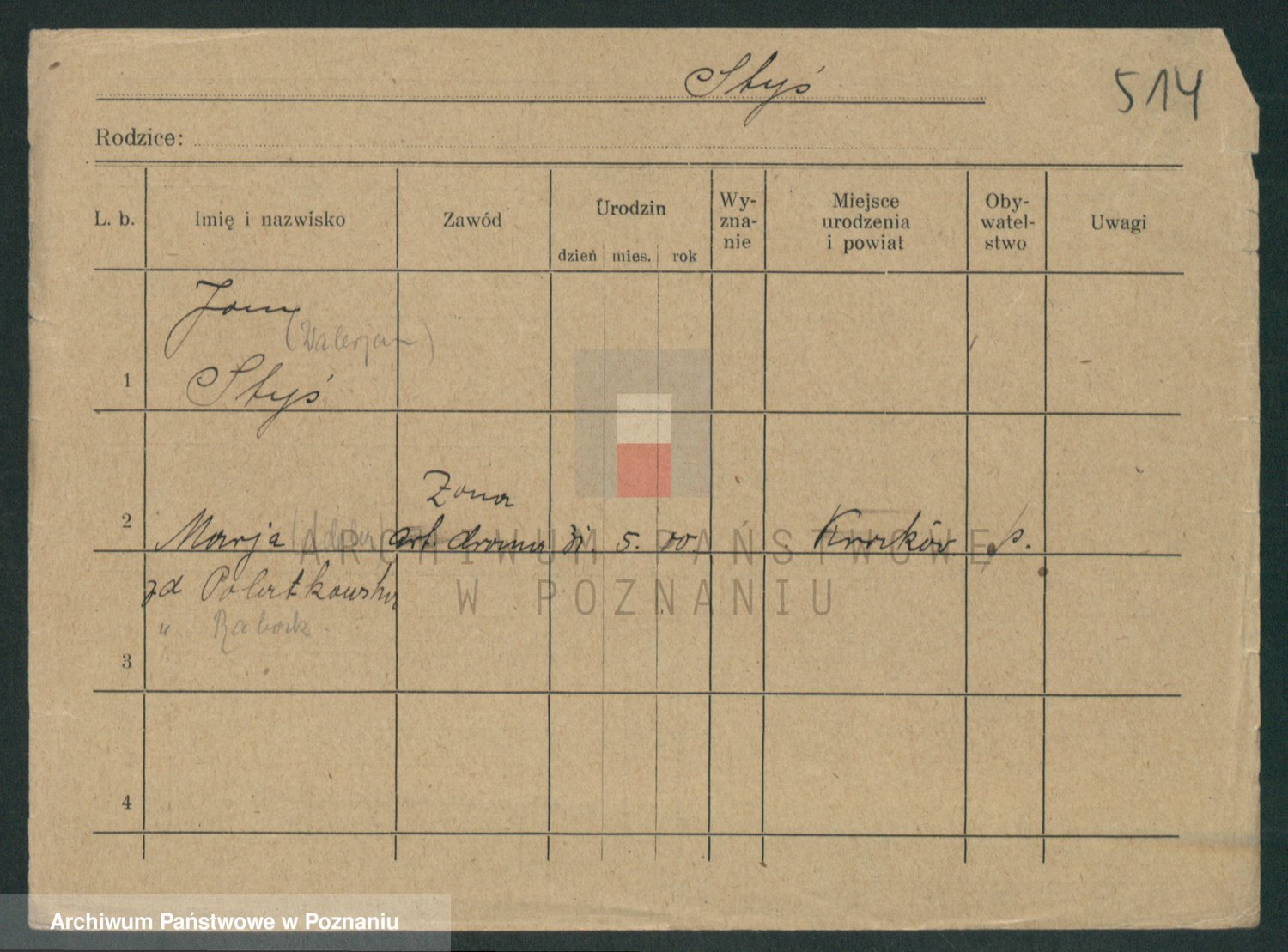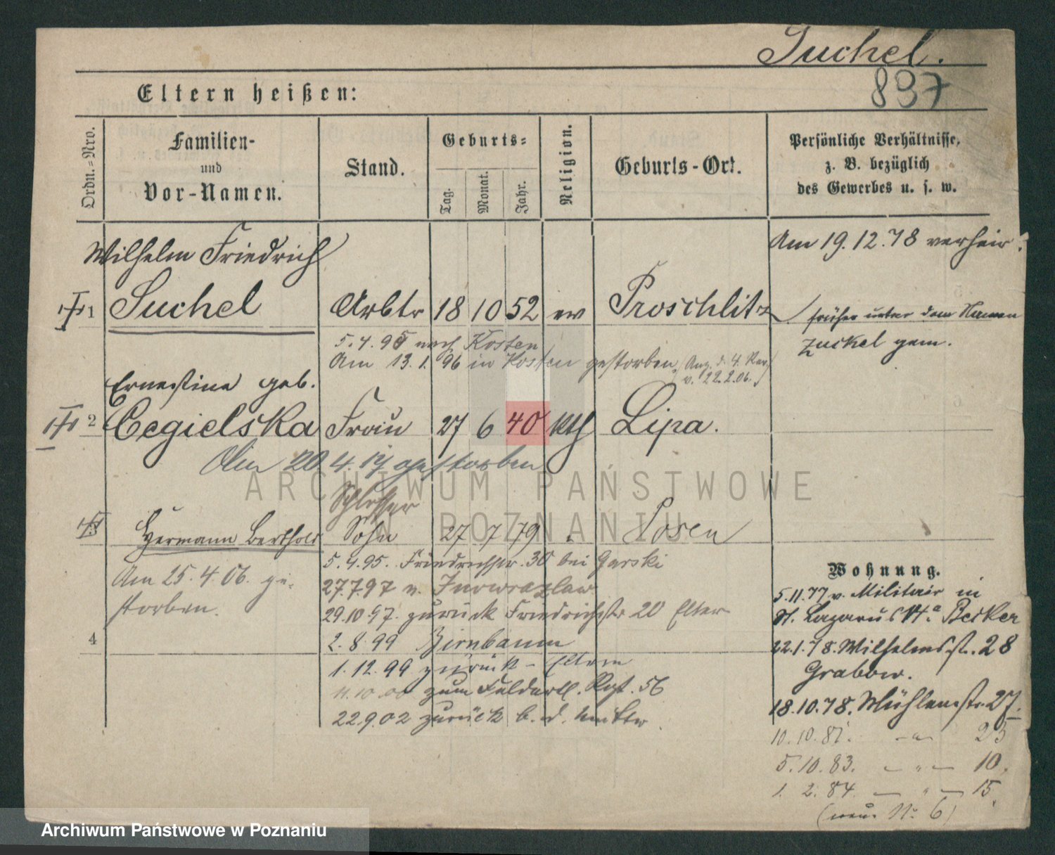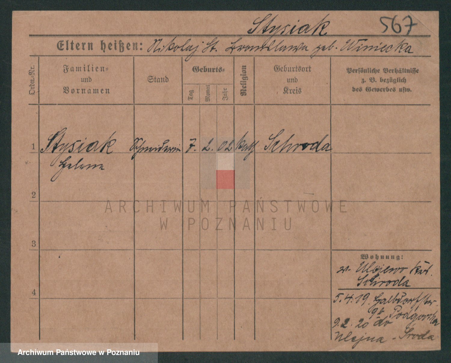 Podgląd karty osobowej dostępny jest po kliknięciu na nazwisko lub ikonkę karty. Można dokonywać powiększenia (ikony na górze) lub przechodzić między kolejnymi skanami (strzałki po bokach).