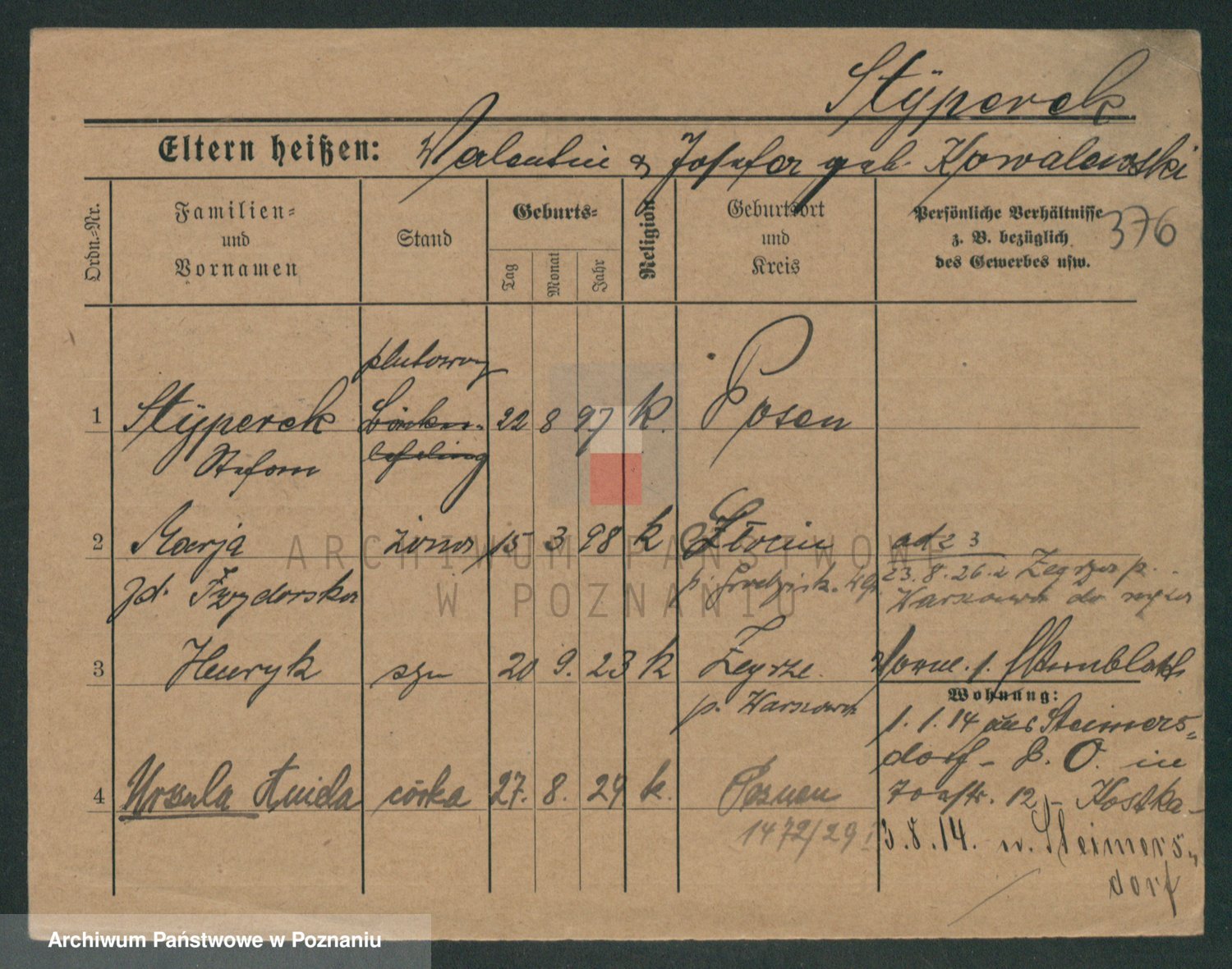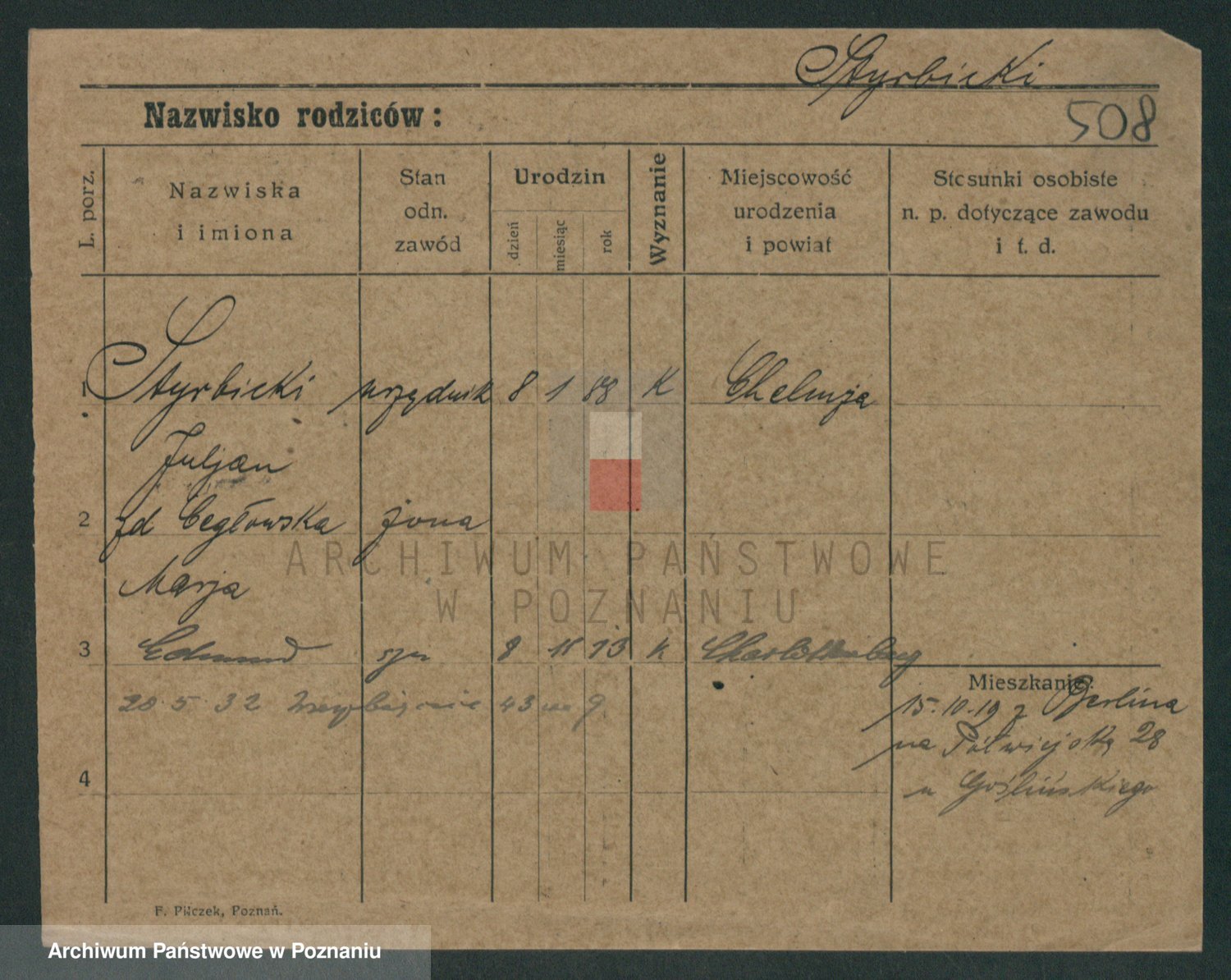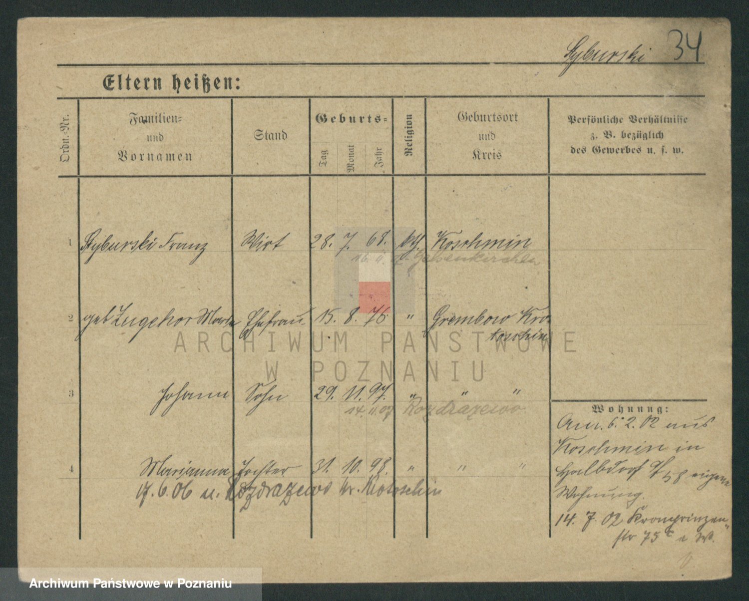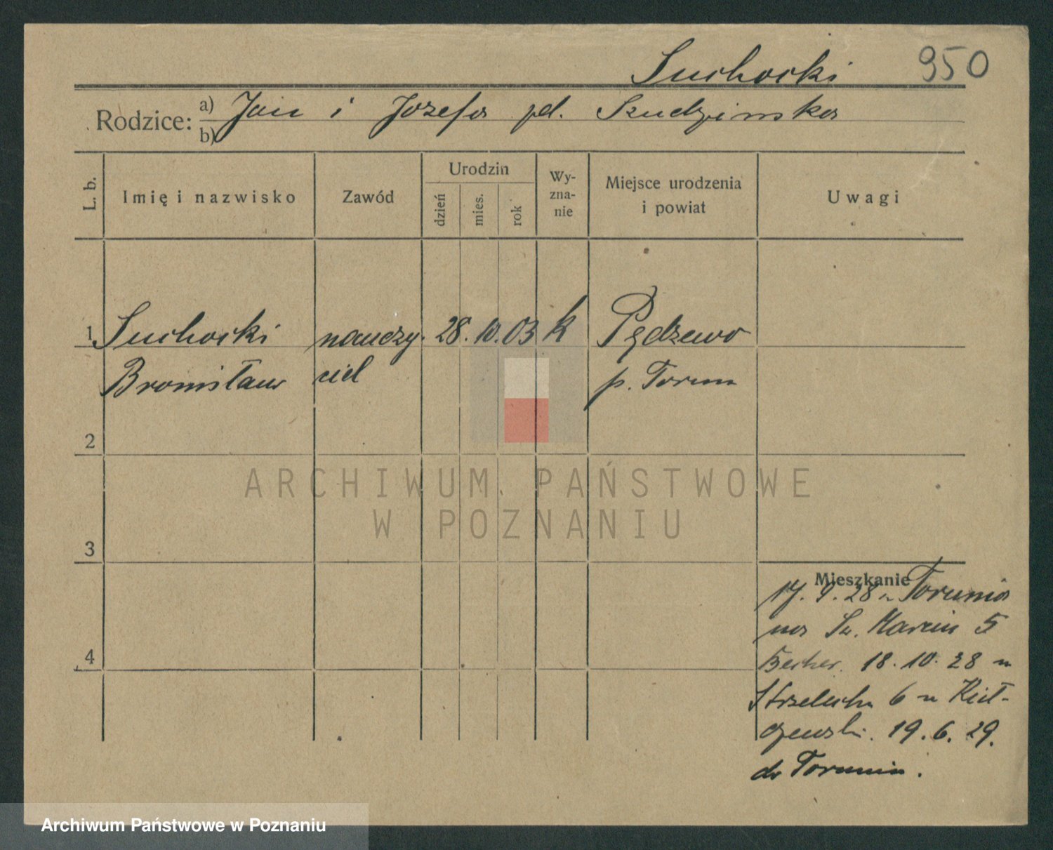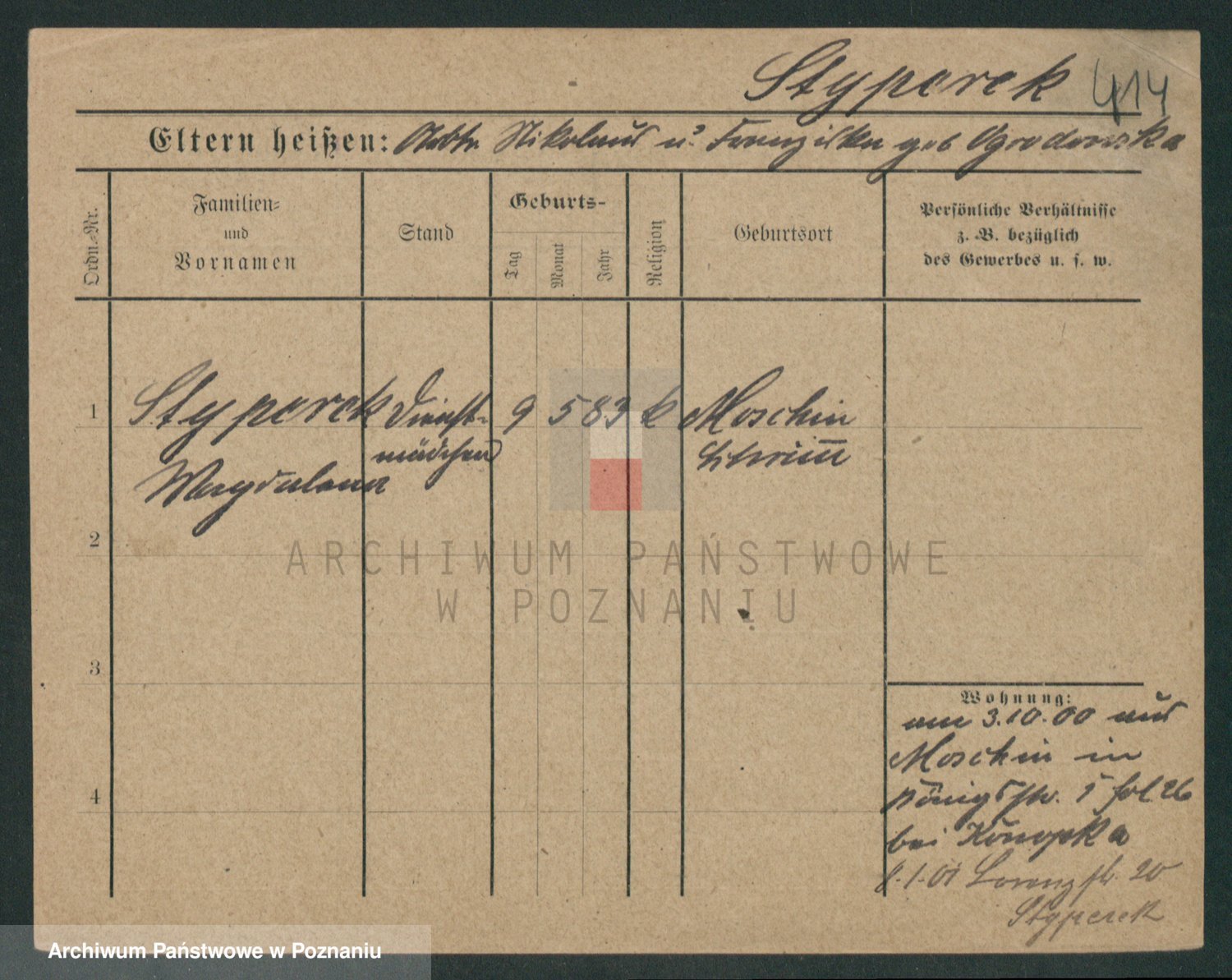 Podgląd karty osobowej dostępny jest po kliknięciu na nazwisko lub ikonkę karty. Można dokonywać powiększenia (ikony na górze) lub przechodzić między kolejnymi skanami (strzałki po bokach).
