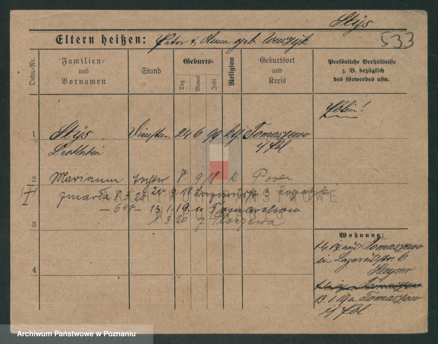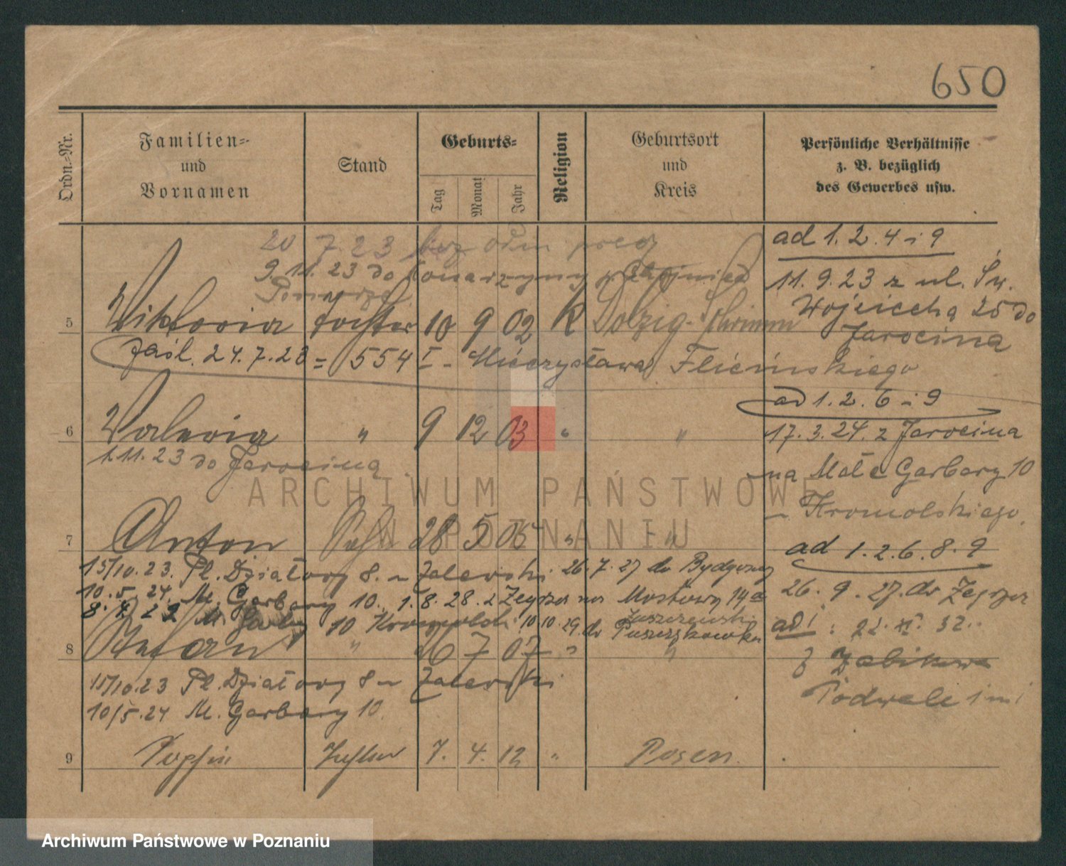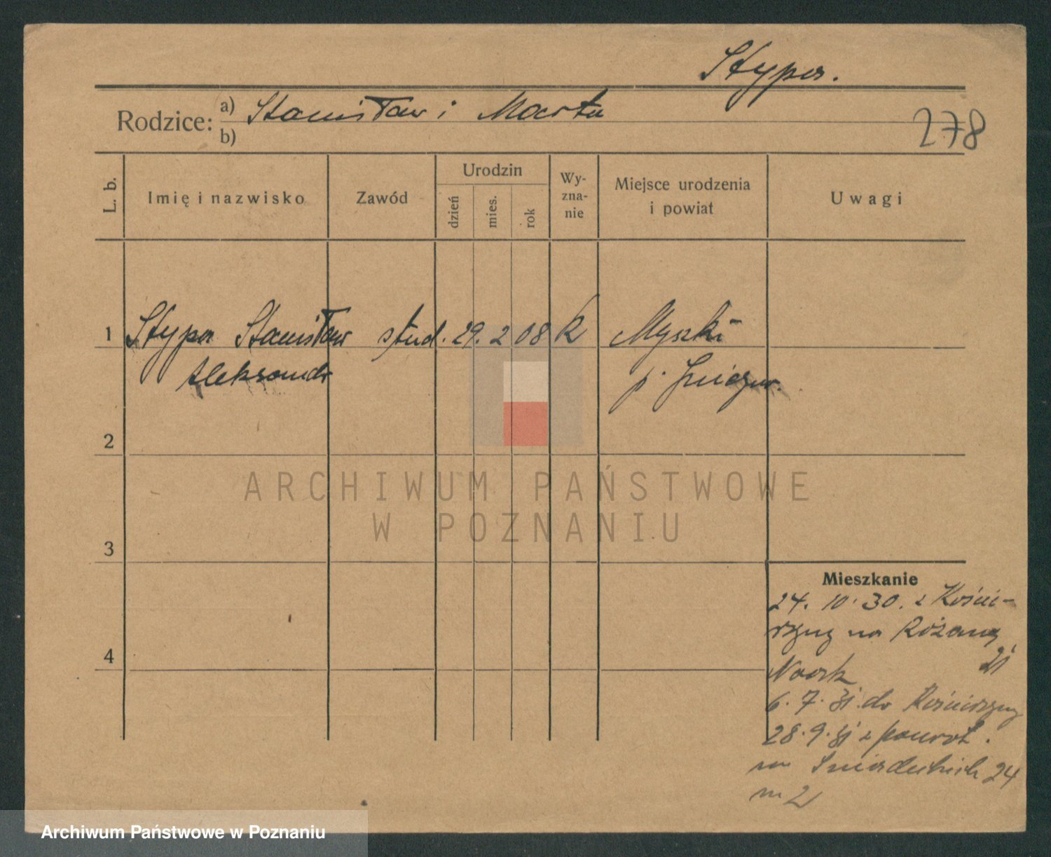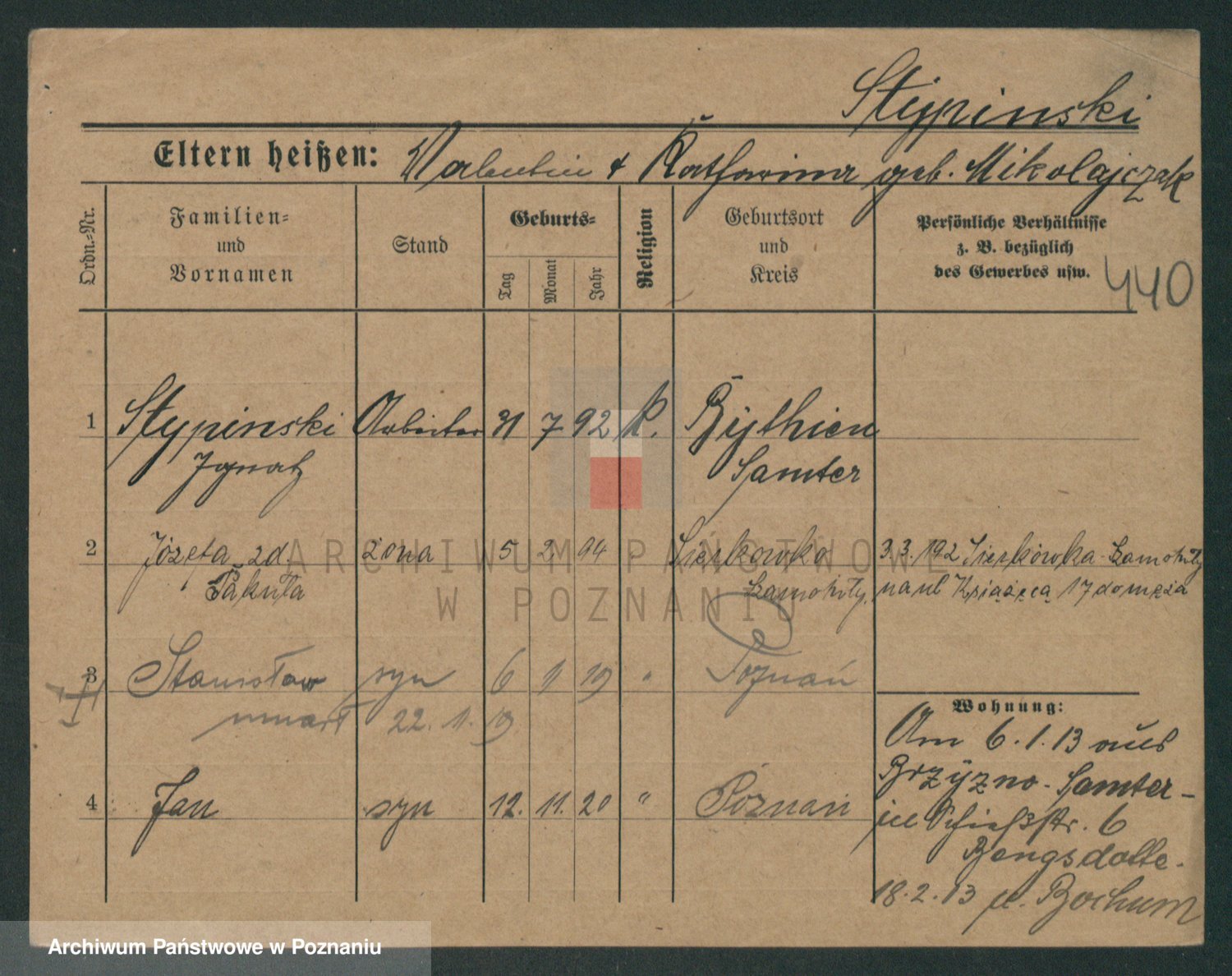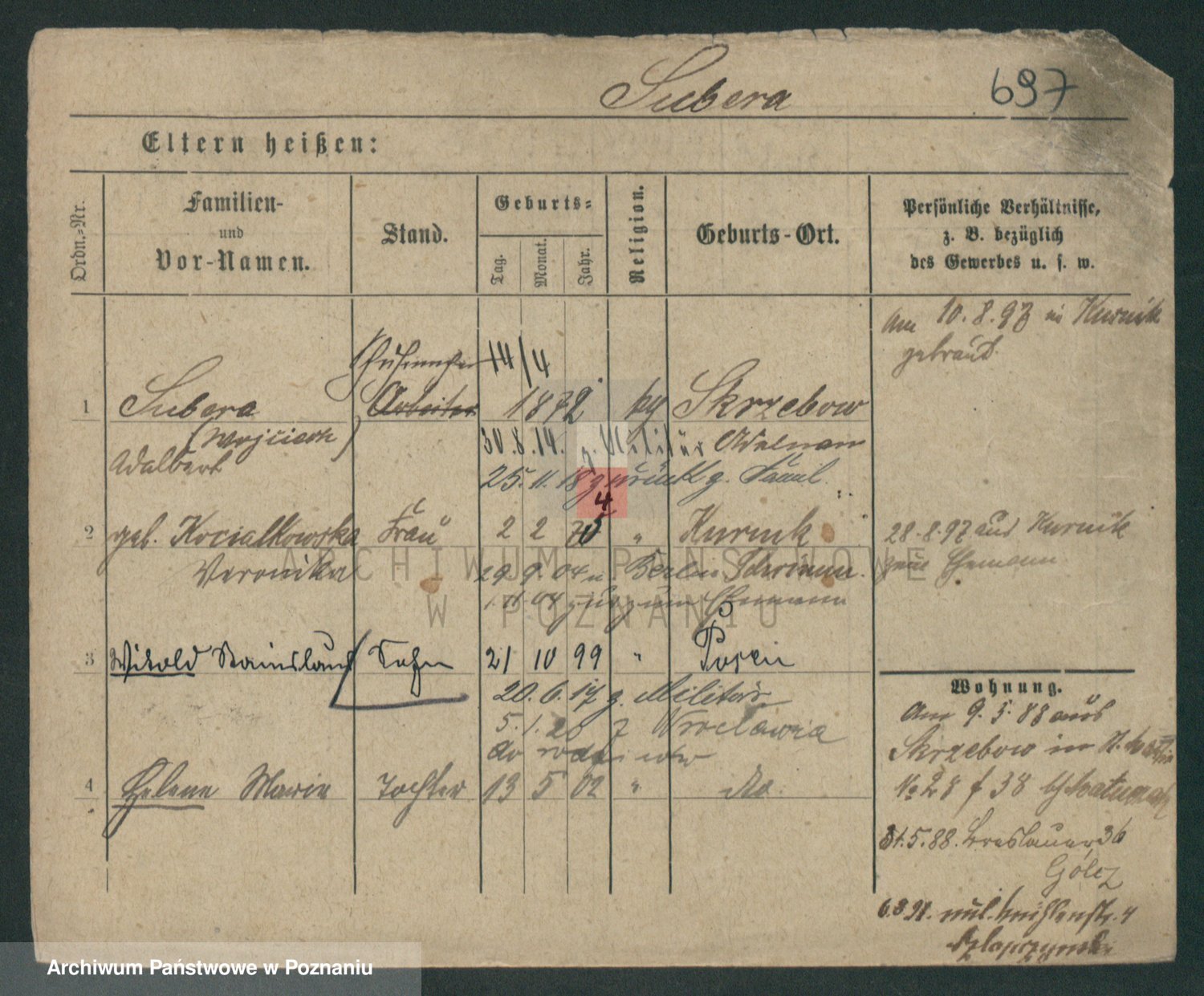 Podgląd karty osobowej dostępny jest po kliknięciu na nazwisko lub ikonkę karty. Można dokonywać powiększenia (ikony na górze) lub przechodzić między kolejnymi skanami (strzałki po bokach).