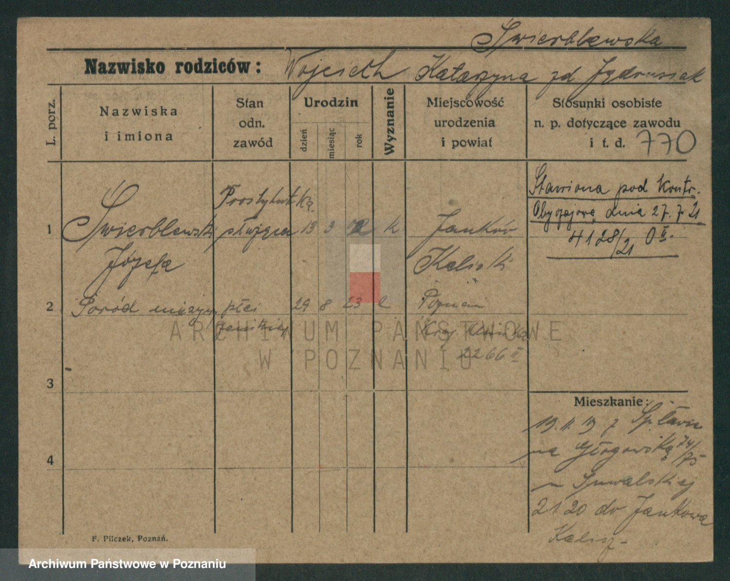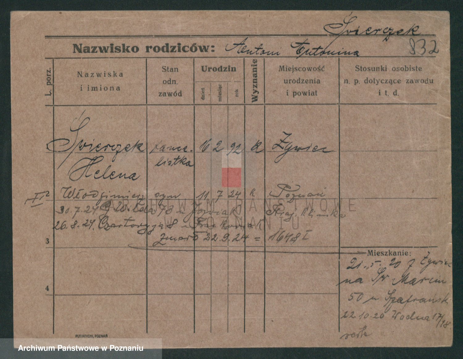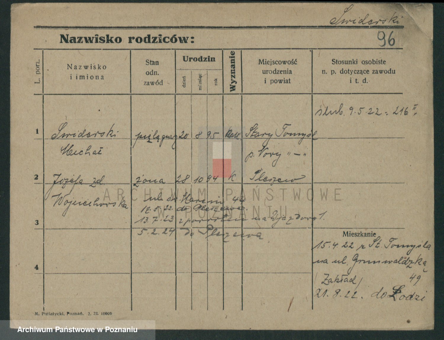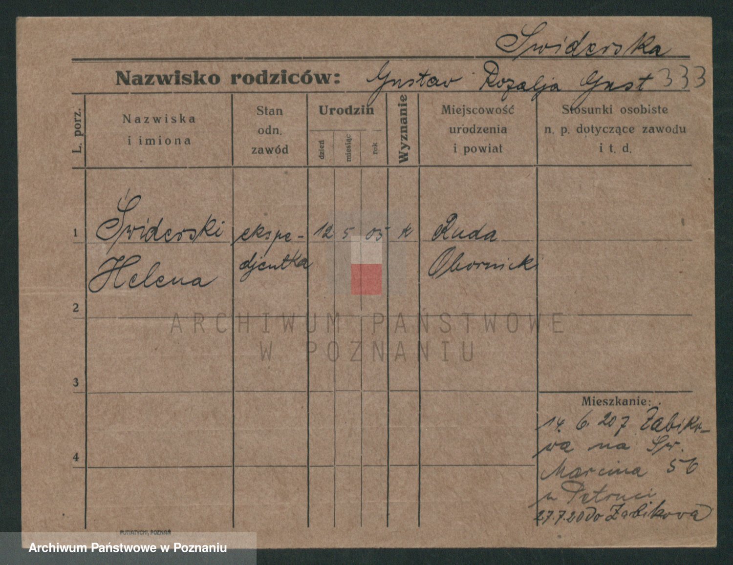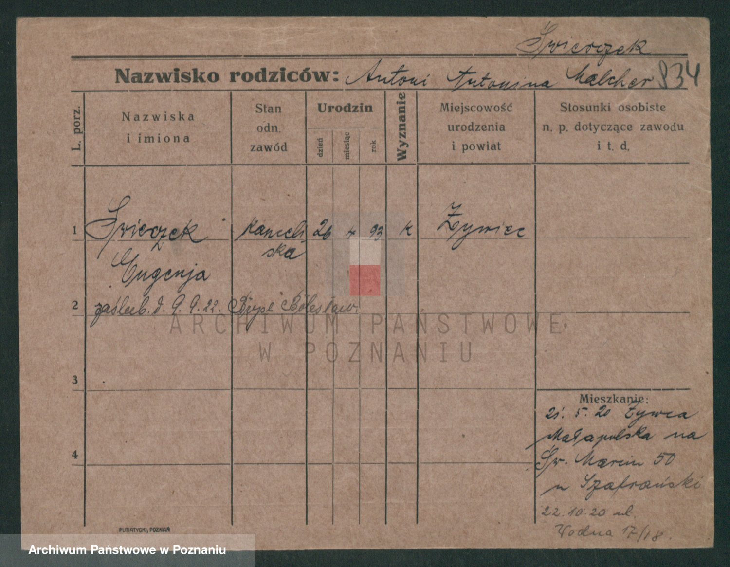 Podgląd karty osobowej dostępny jest po kliknięciu na nazwisko lub ikonkę karty. Można dokonywać powiększenia (ikony na górze) lub przechodzić między kolejnymi skanami (strzałki po bokach).