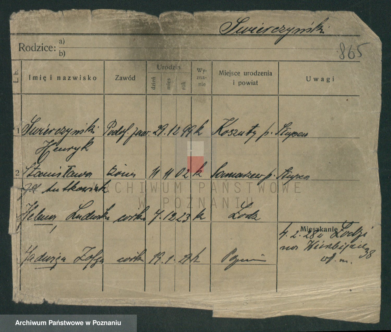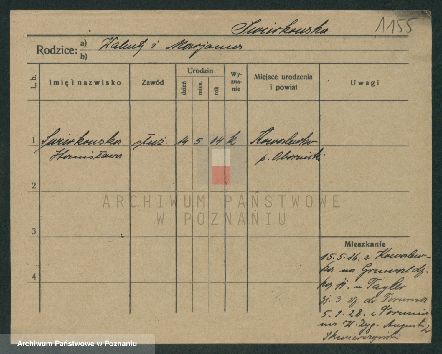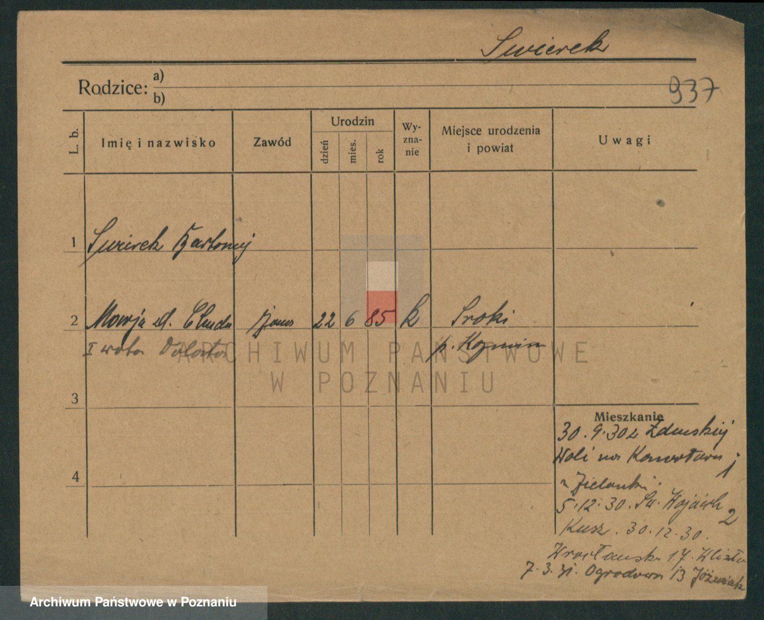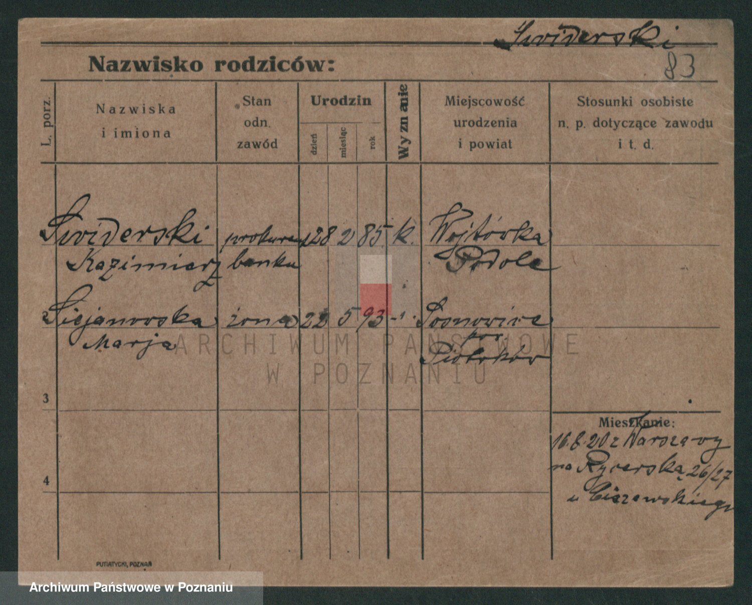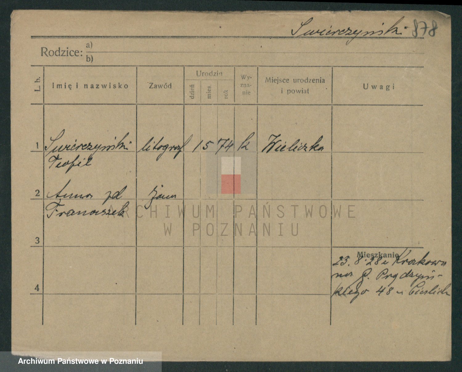 Podgląd karty osobowej dostępny jest po kliknięciu na nazwisko lub ikonkę karty. Można dokonywać powiększenia (ikony na górze) lub przechodzić między kolejnymi skanami (strzałki po bokach).