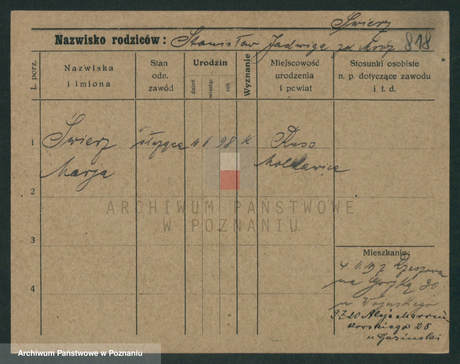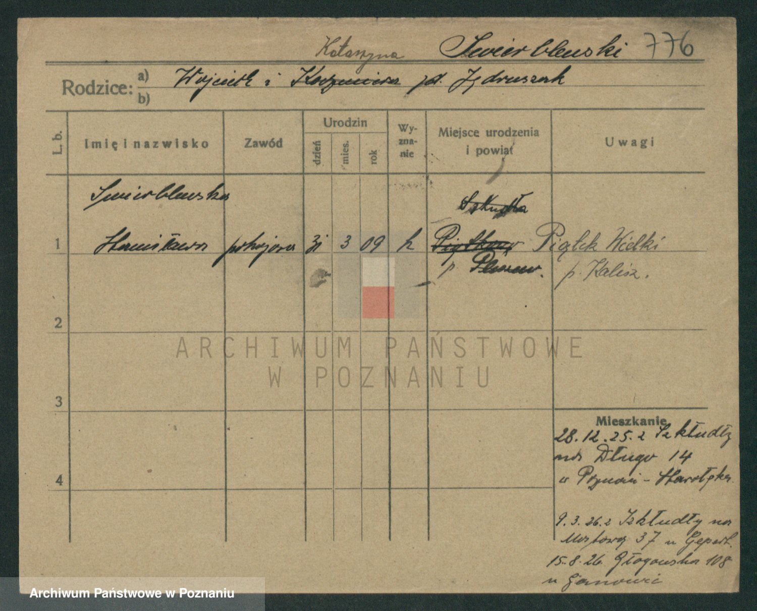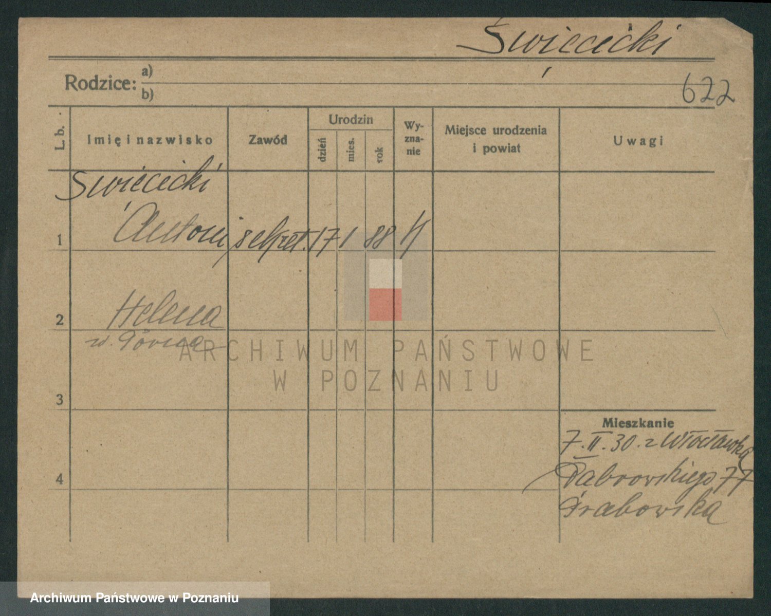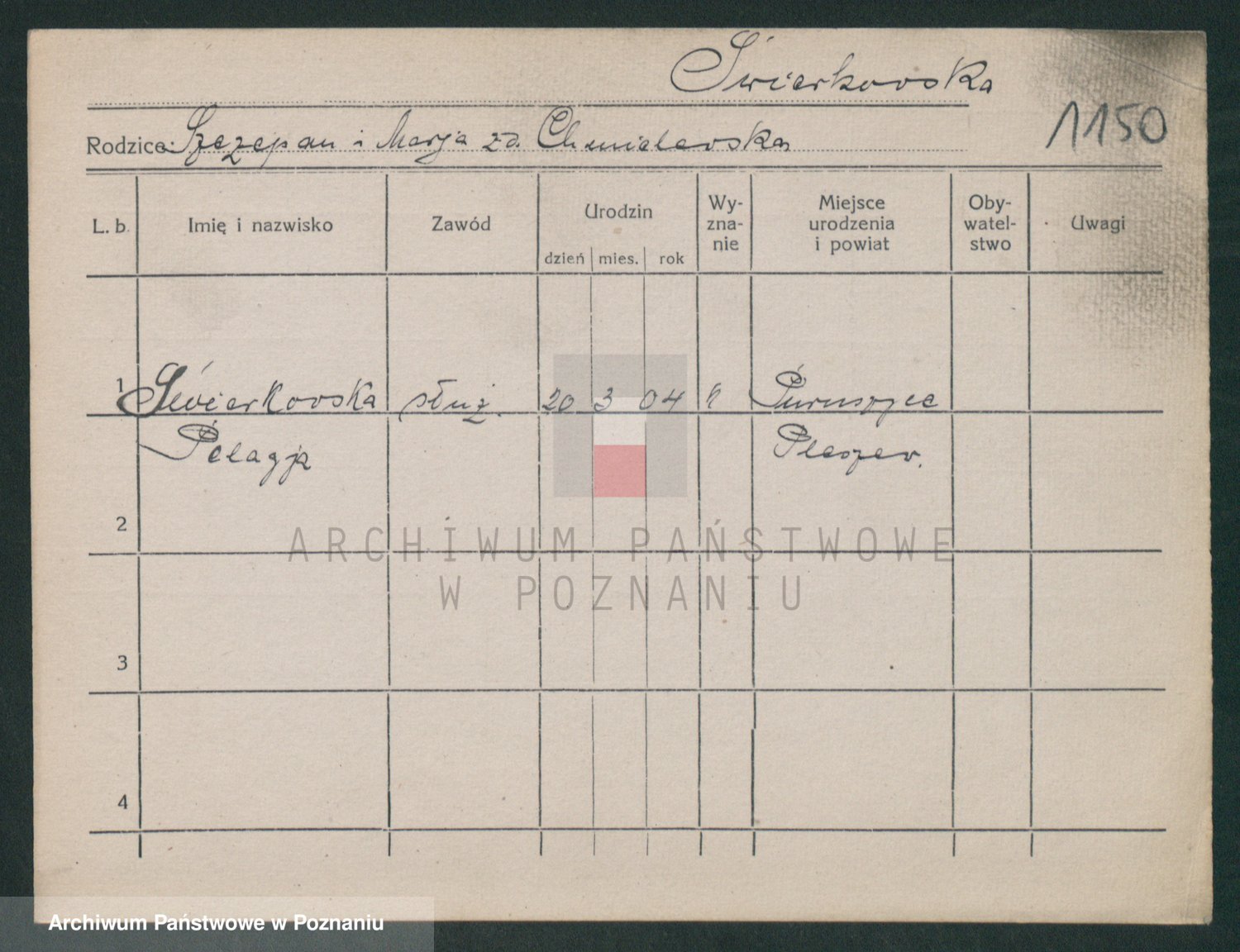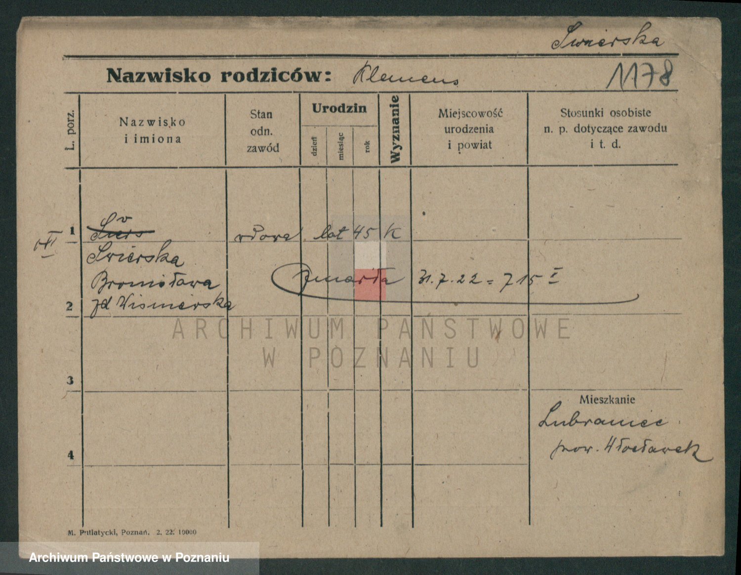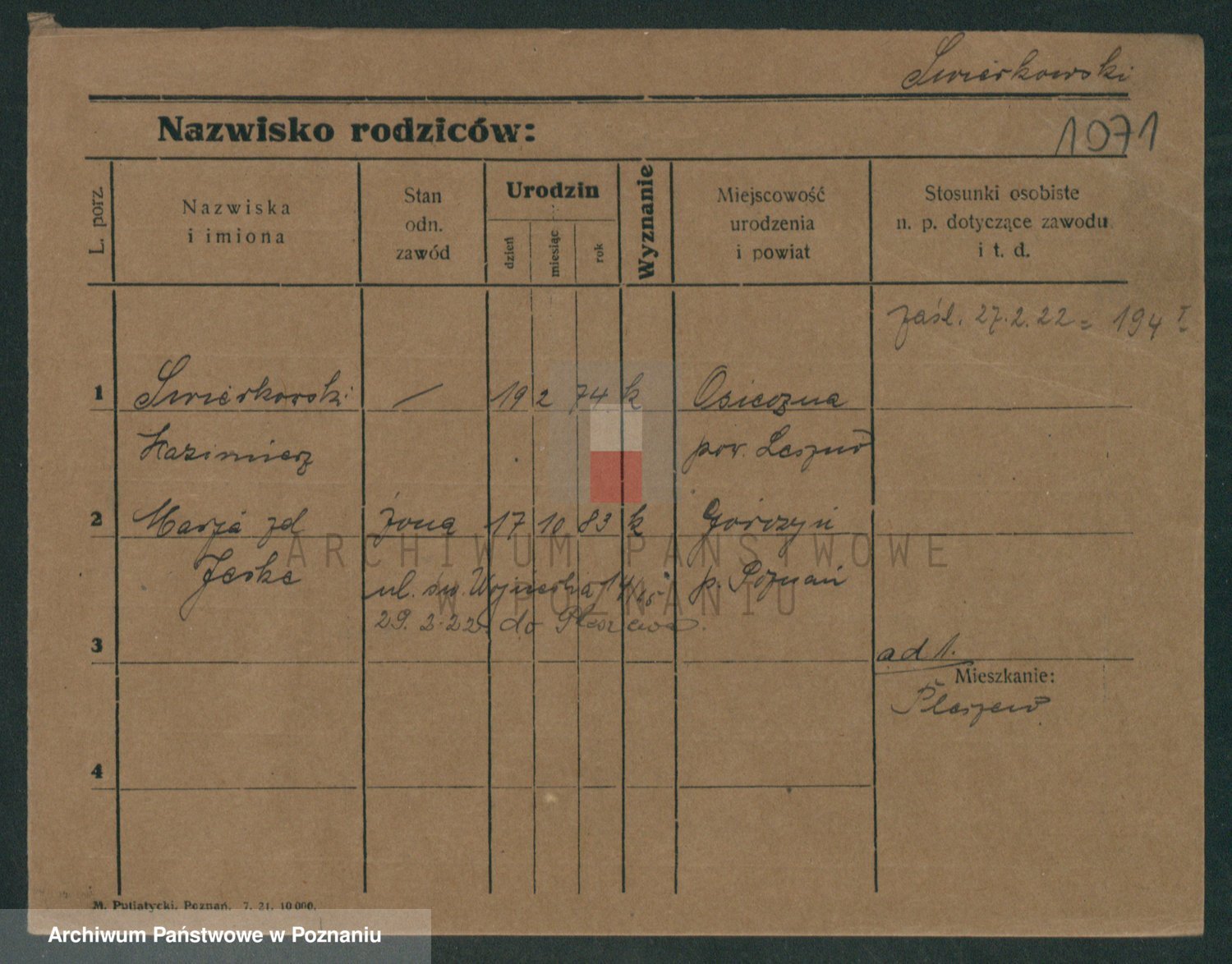 Podgląd karty osobowej dostępny jest po kliknięciu na nazwisko lub ikonkę karty. Można dokonywać powiększenia (ikony na górze) lub przechodzić między kolejnymi skanami (strzałki po bokach).