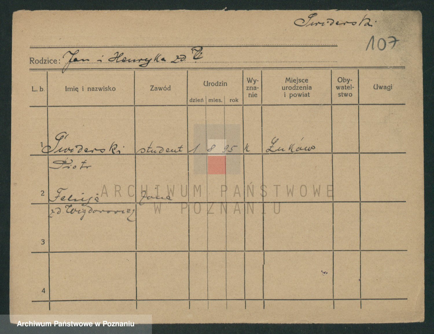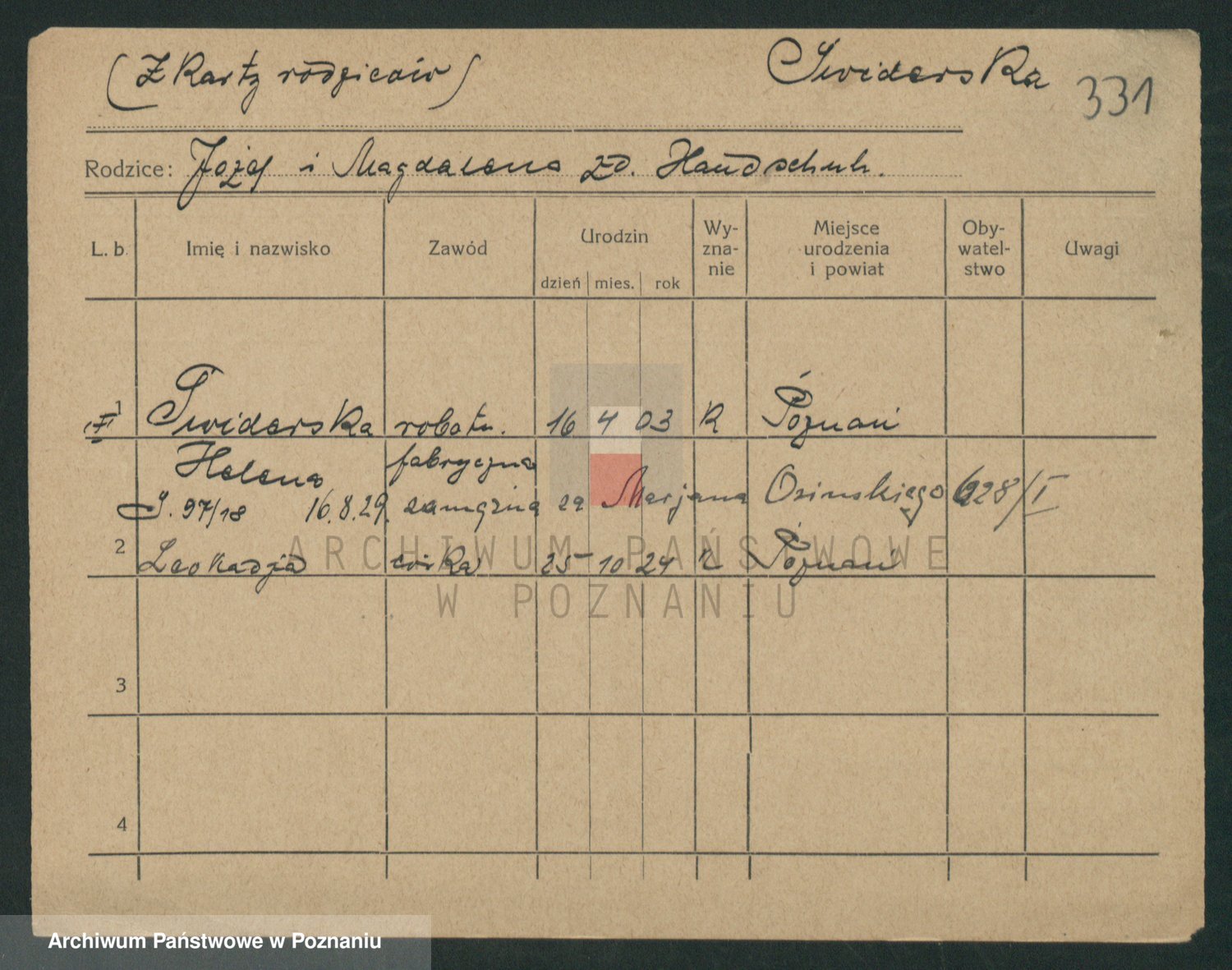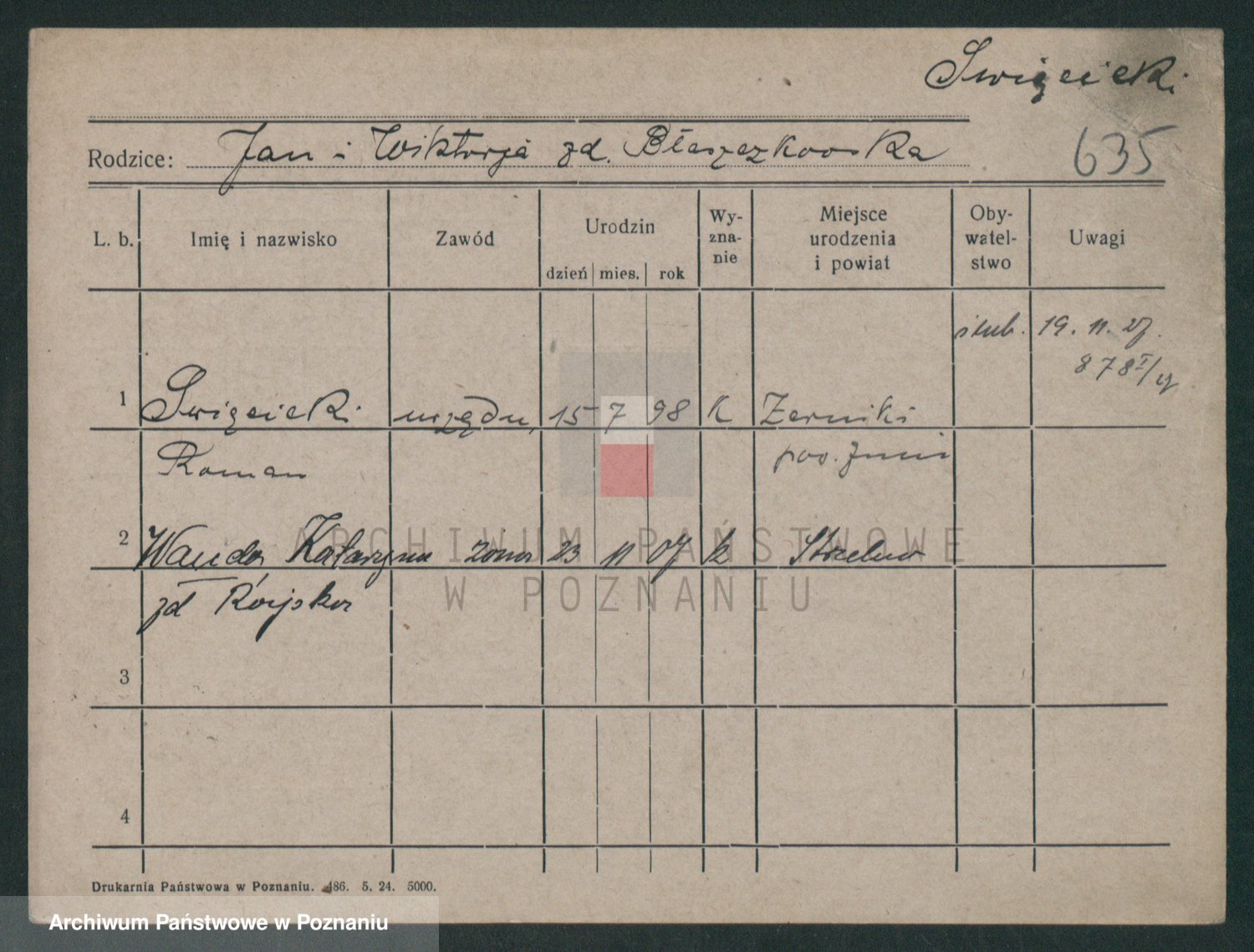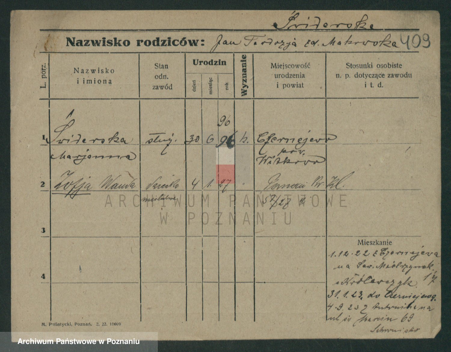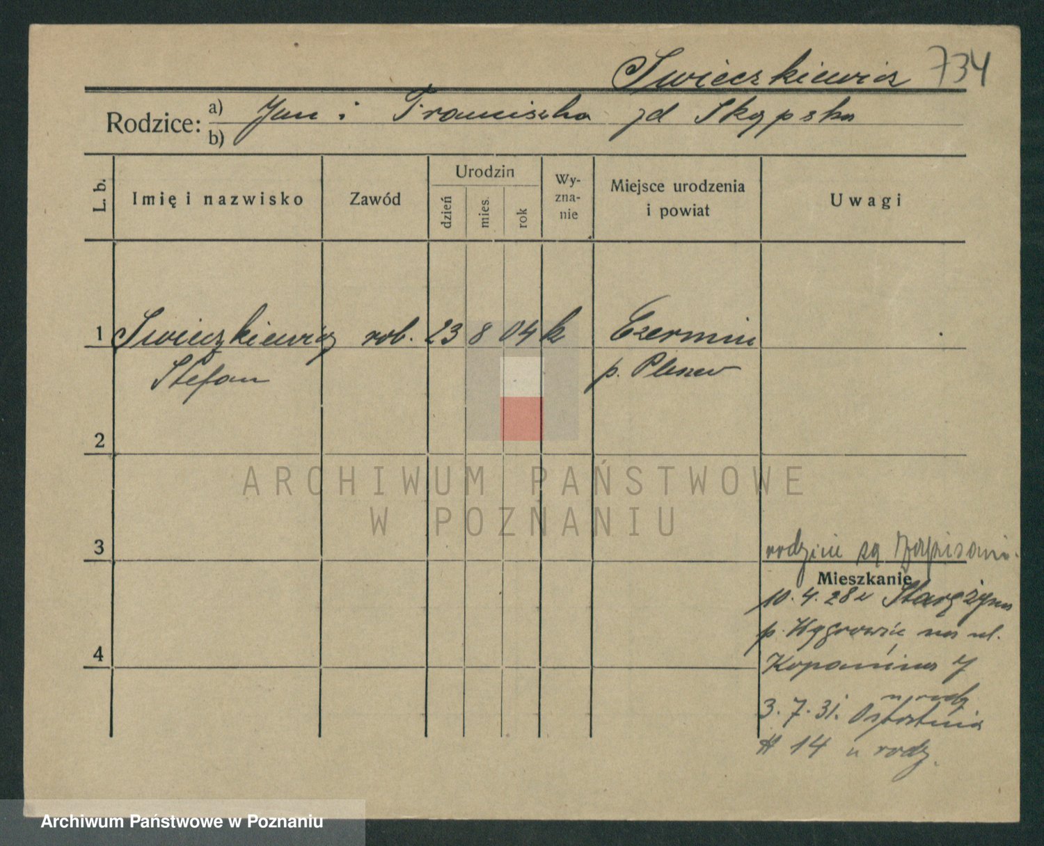 Podgląd karty osobowej dostępny jest po kliknięciu na nazwisko lub ikonkę karty. Można dokonywać powiększenia (ikony na górze) lub przechodzić między kolejnymi skanami (strzałki po bokach).