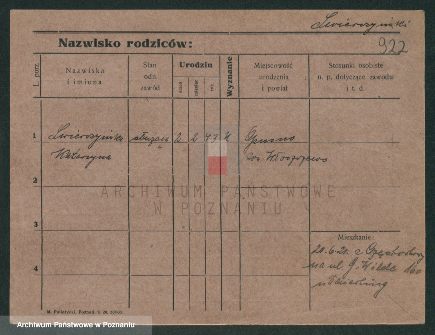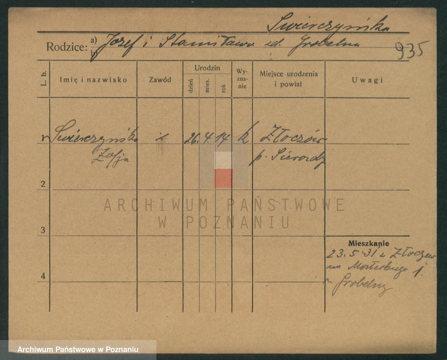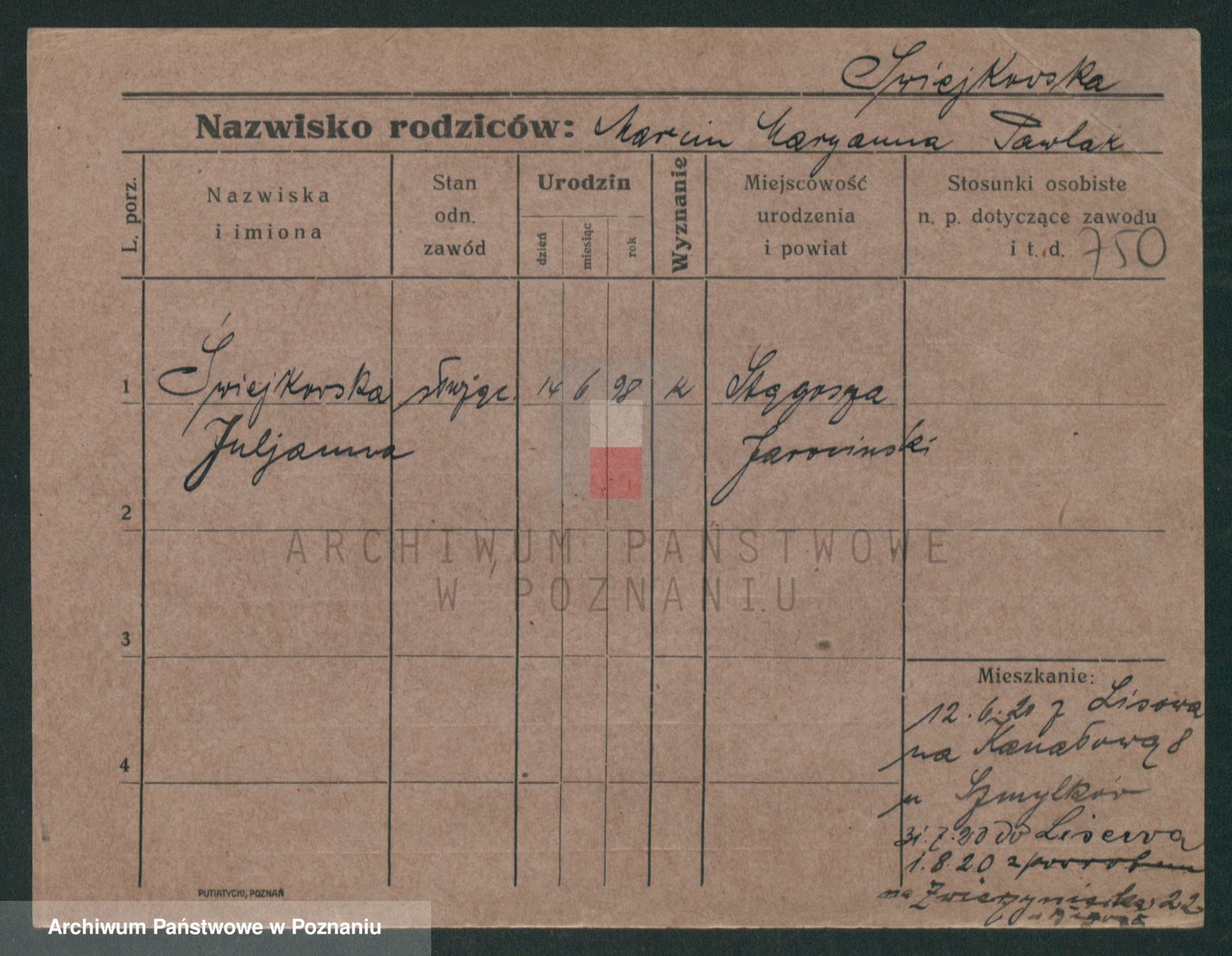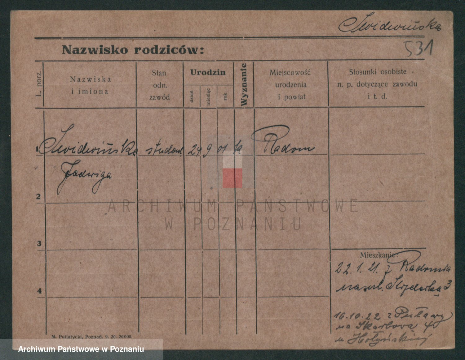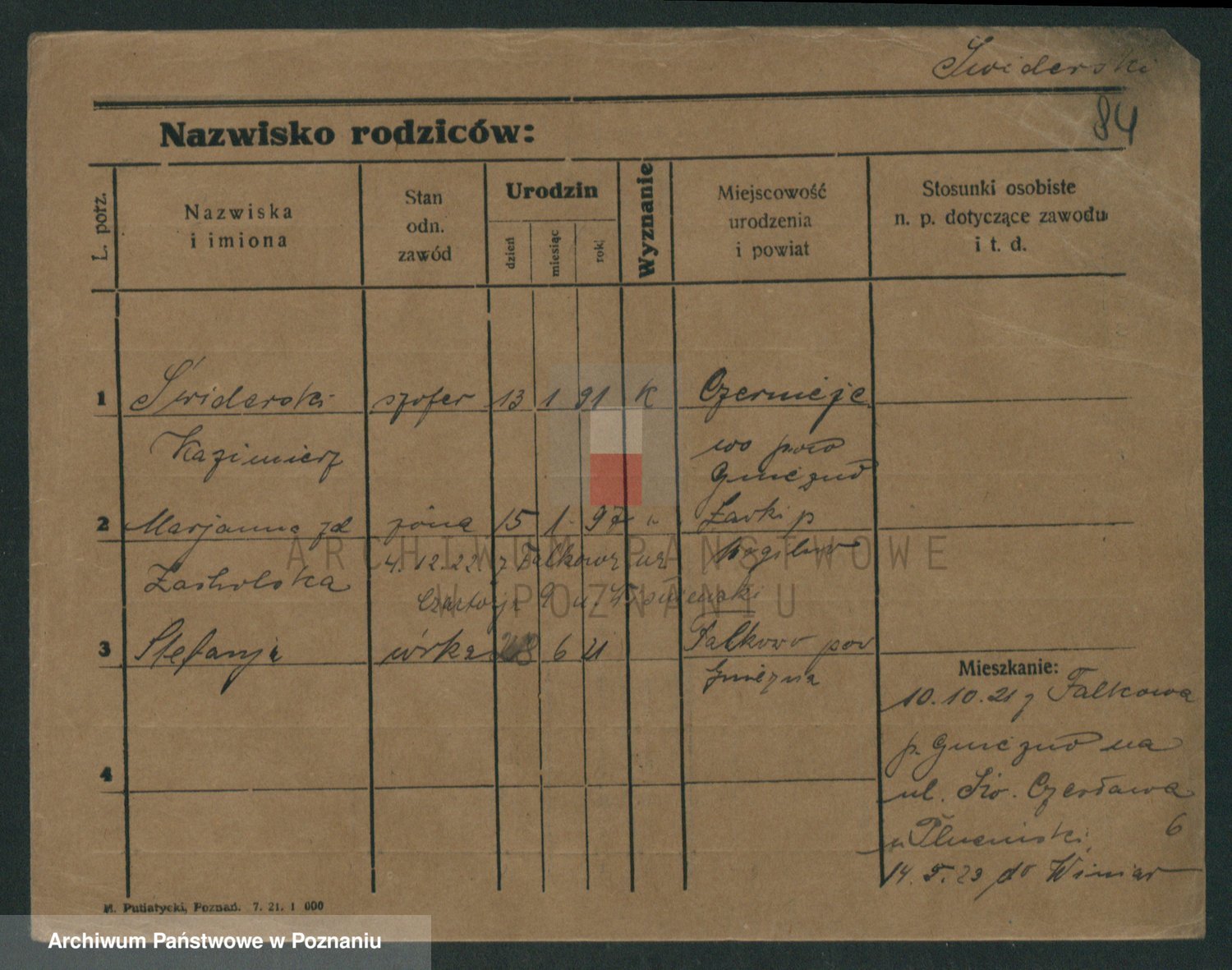 Podgląd karty osobowej dostępny jest po kliknięciu na nazwisko lub ikonkę karty. Można dokonywać powiększenia (ikony na górze) lub przechodzić między kolejnymi skanami (strzałki po bokach).
