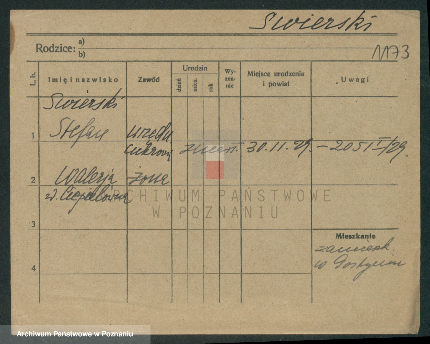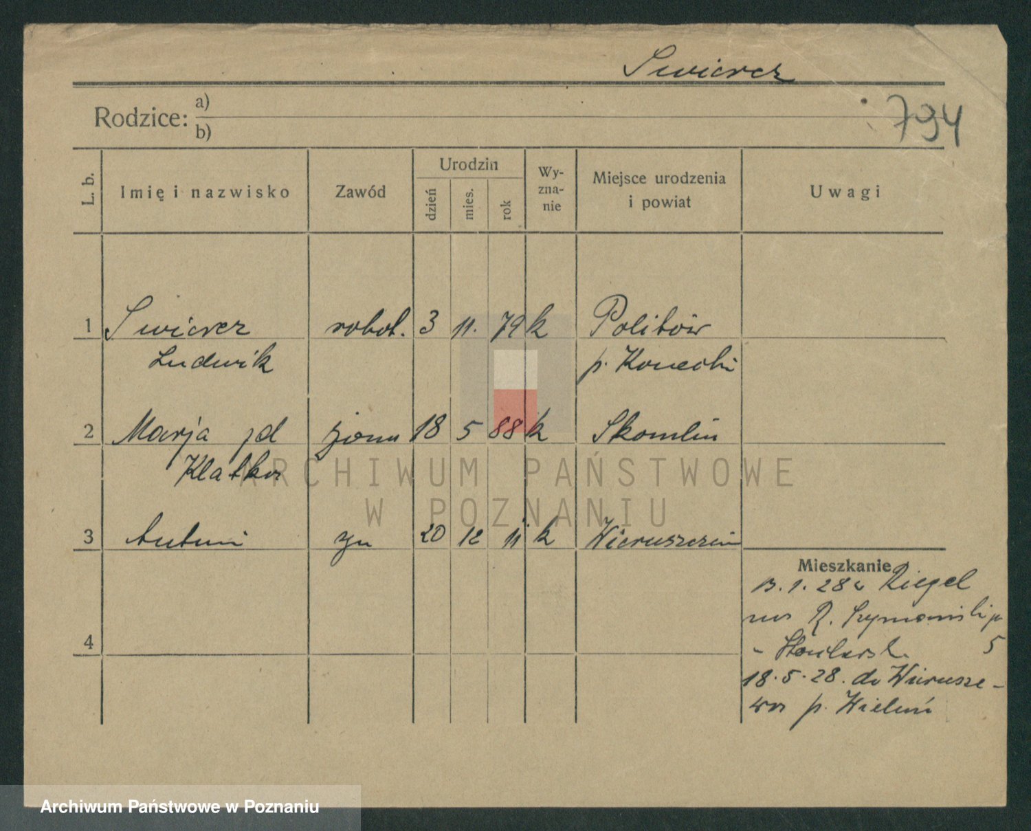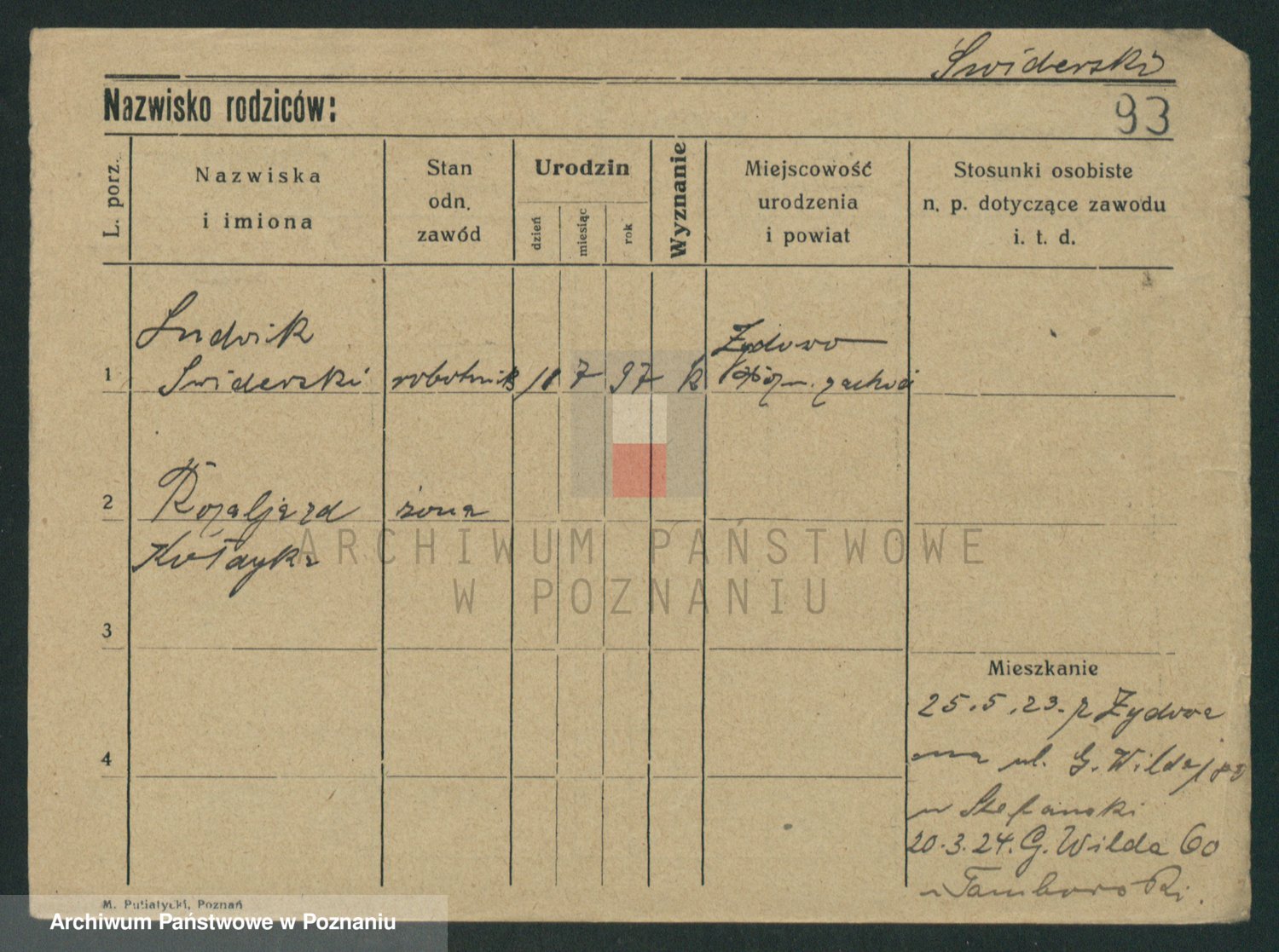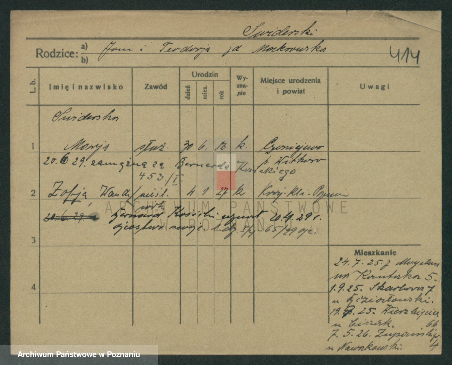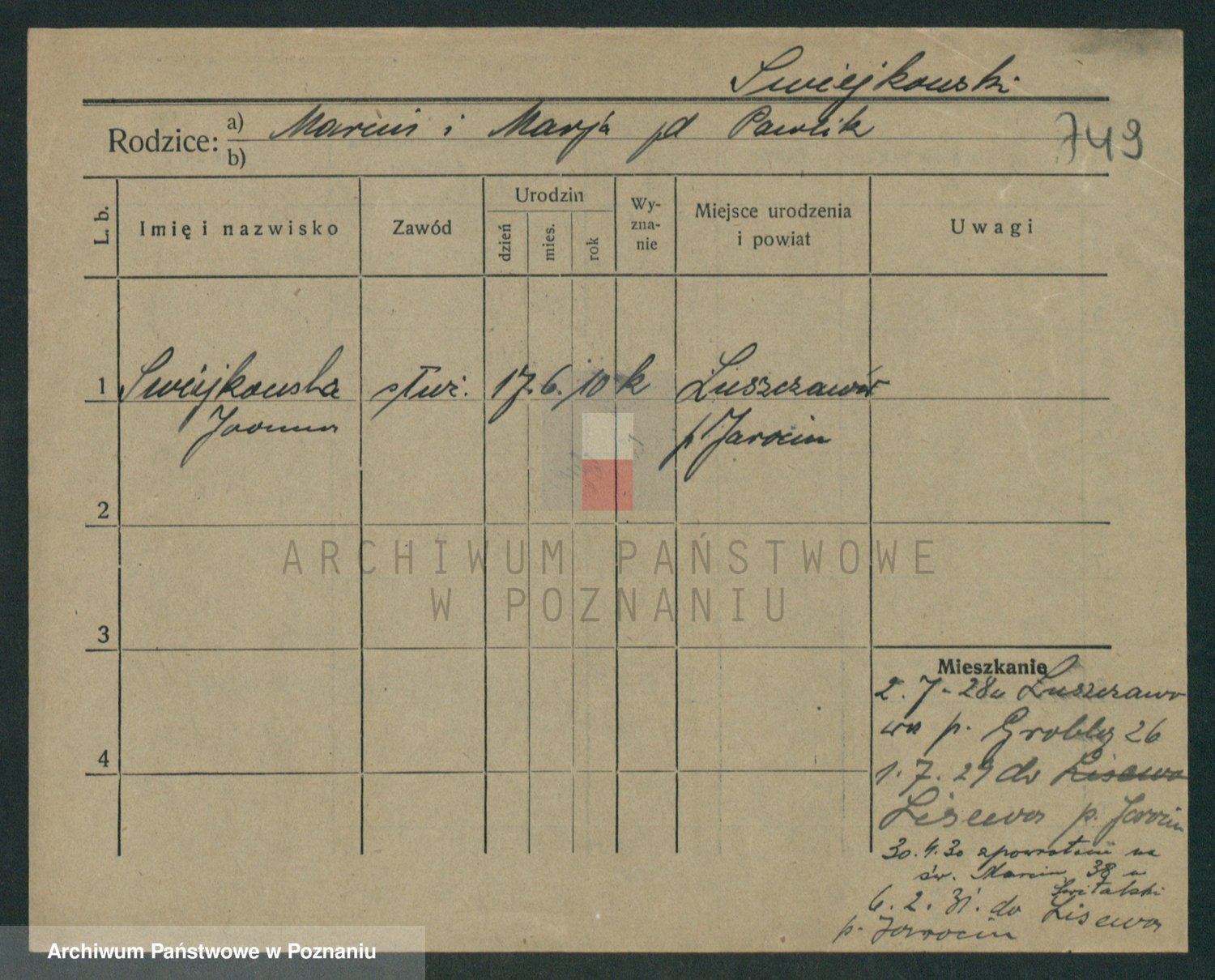 Podgląd karty osobowej dostępny jest po kliknięciu na nazwisko lub ikonkę karty. Można dokonywać powiększenia (ikony na górze) lub przechodzić między kolejnymi skanami (strzałki po bokach).