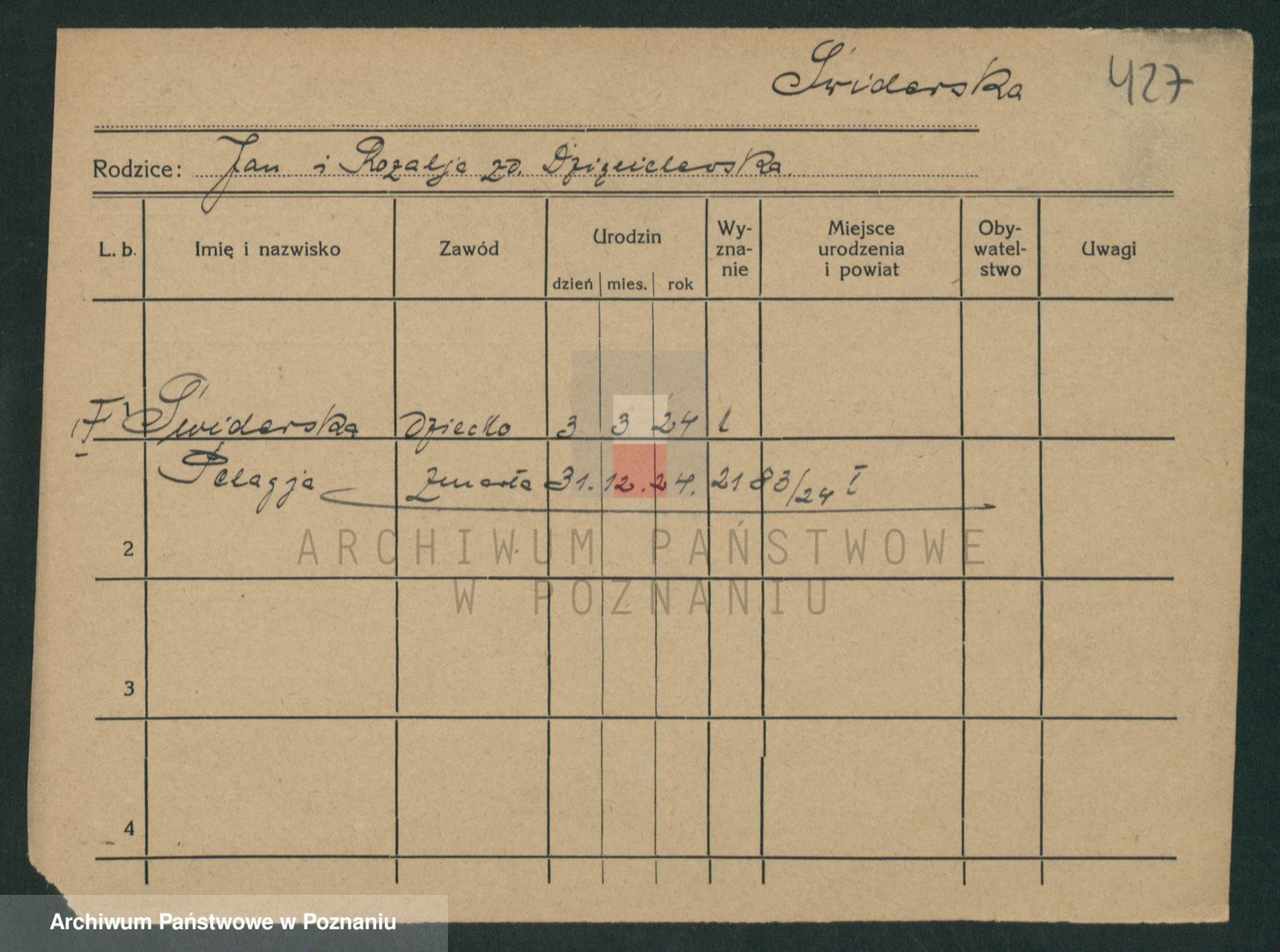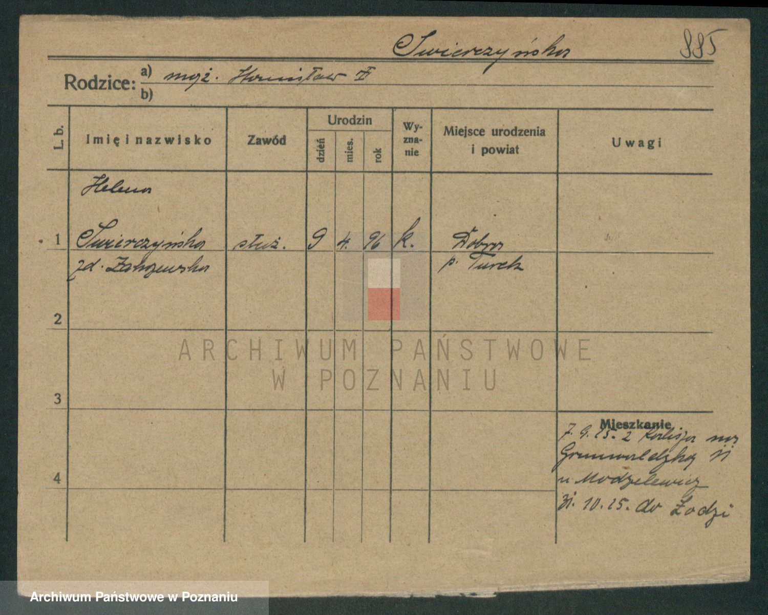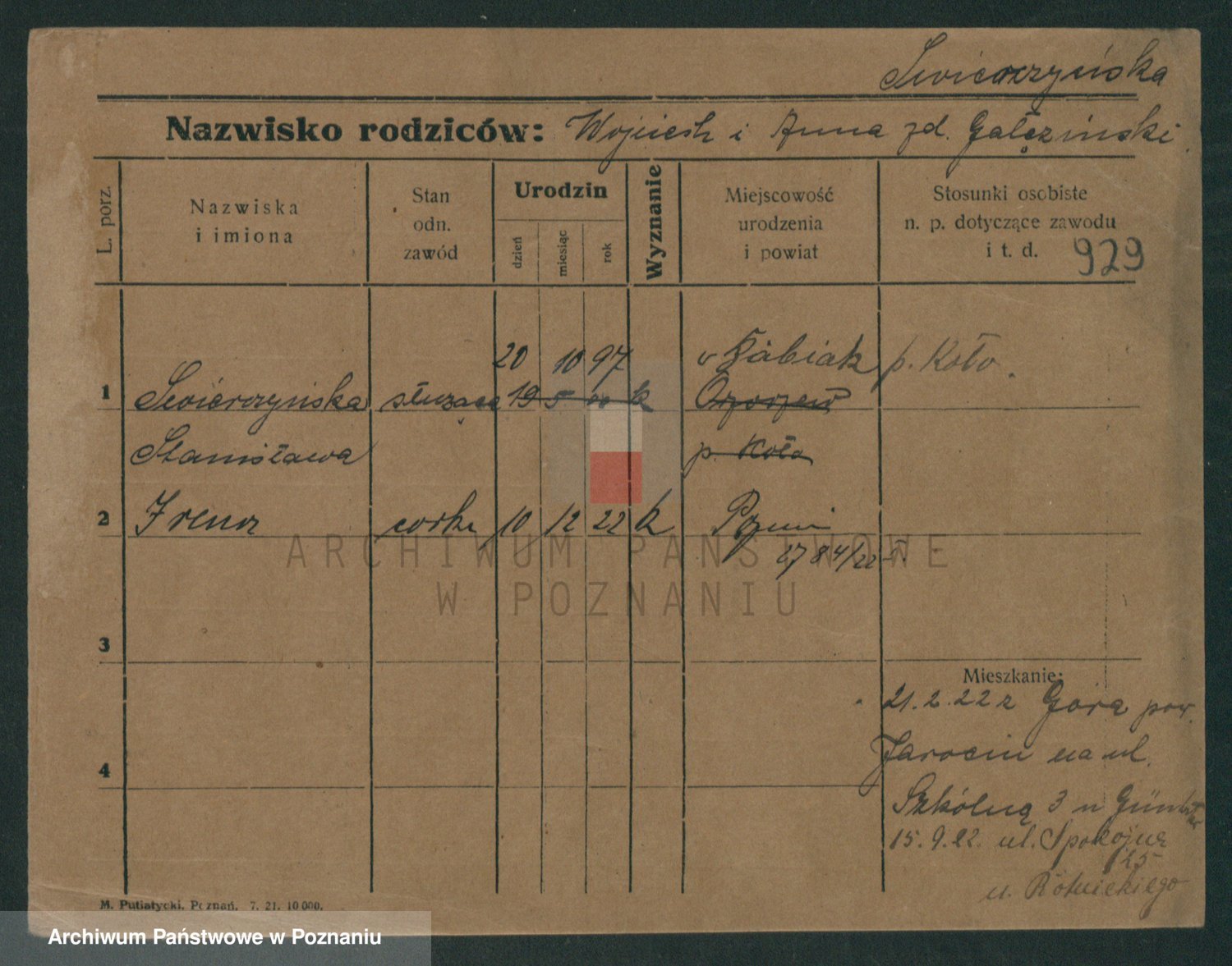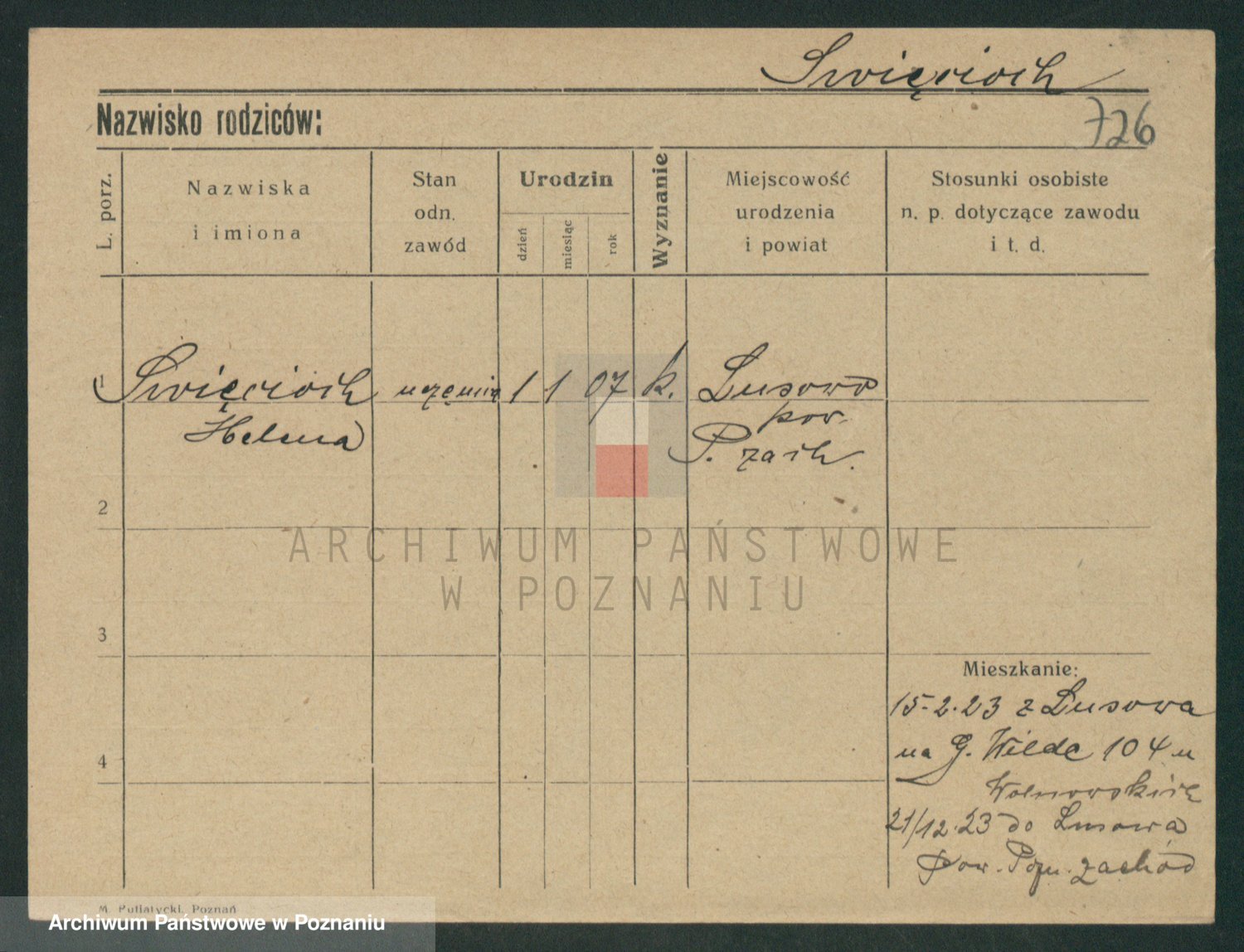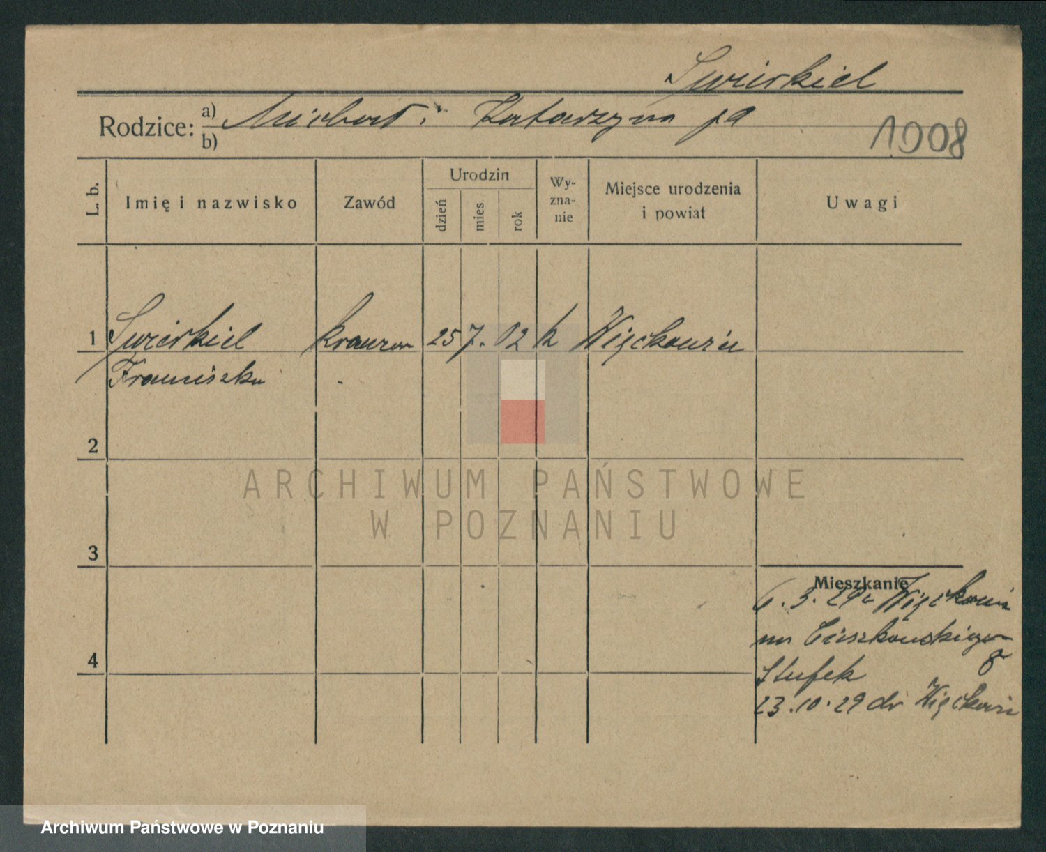 Podgląd karty osobowej dostępny jest po kliknięciu na nazwisko lub ikonkę karty. Można dokonywać powiększenia (ikony na górze) lub przechodzić między kolejnymi skanami (strzałki po bokach).