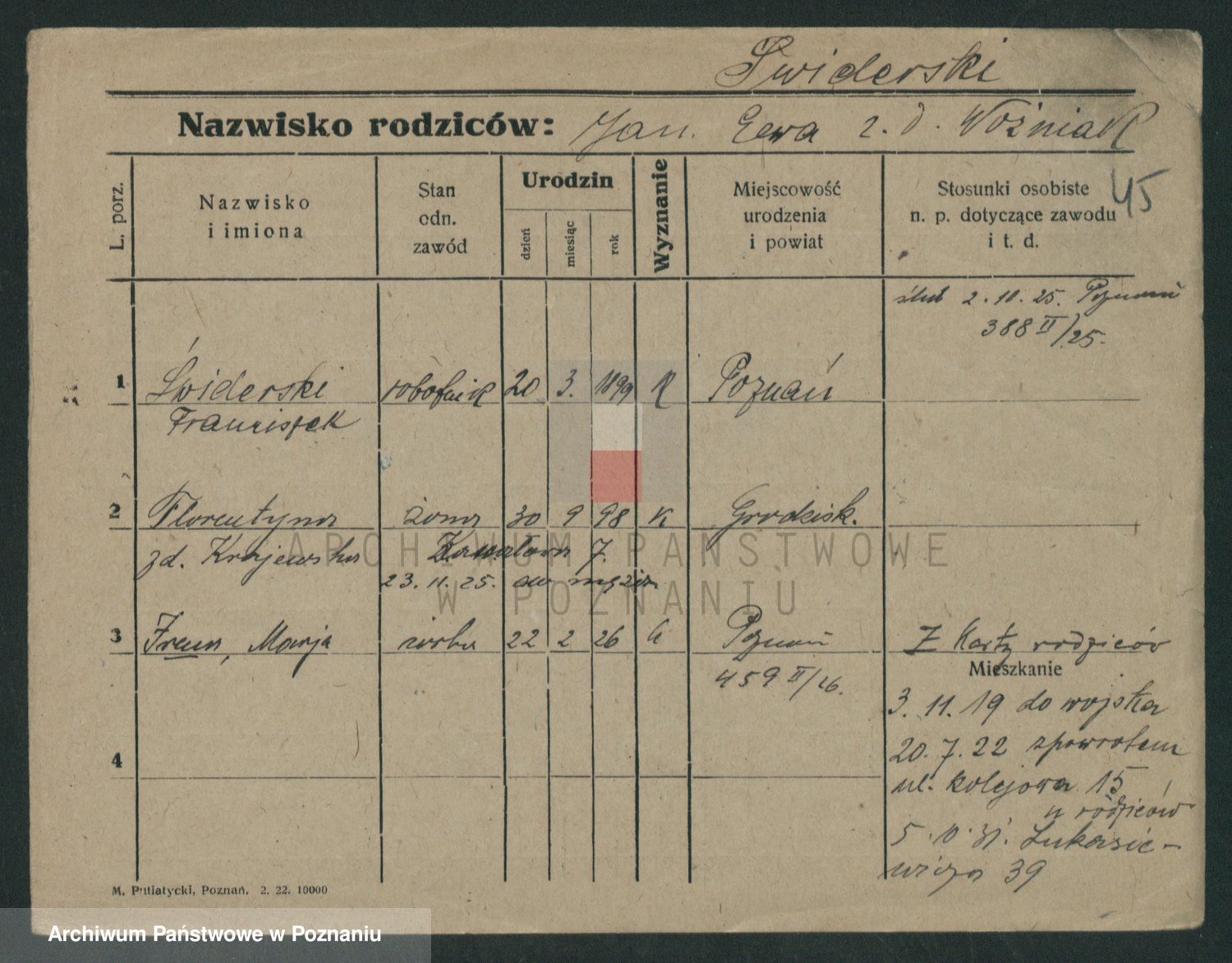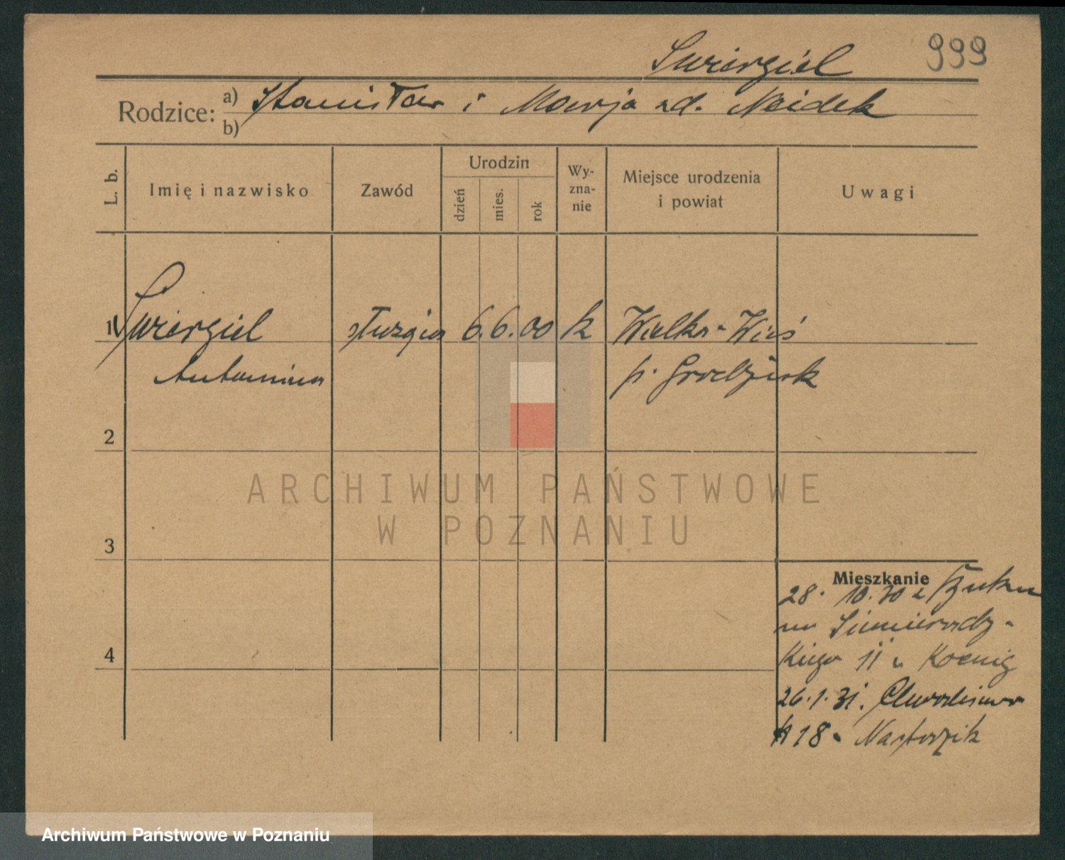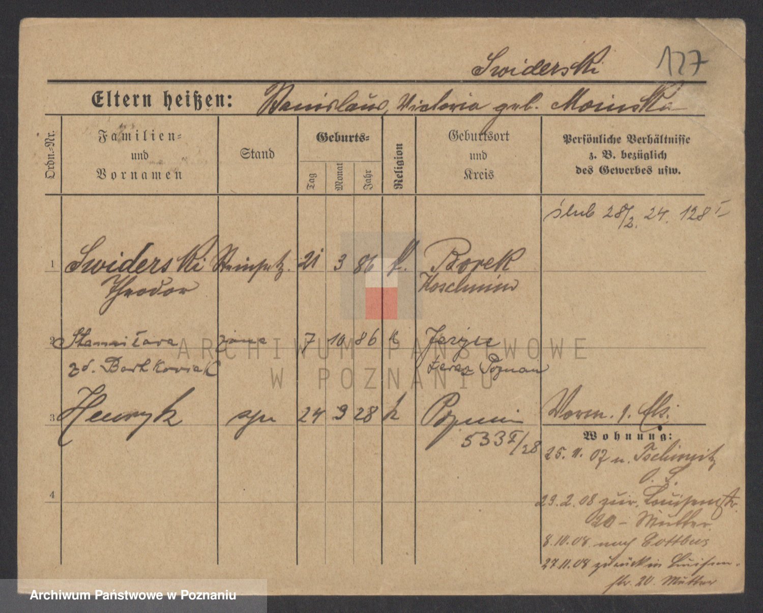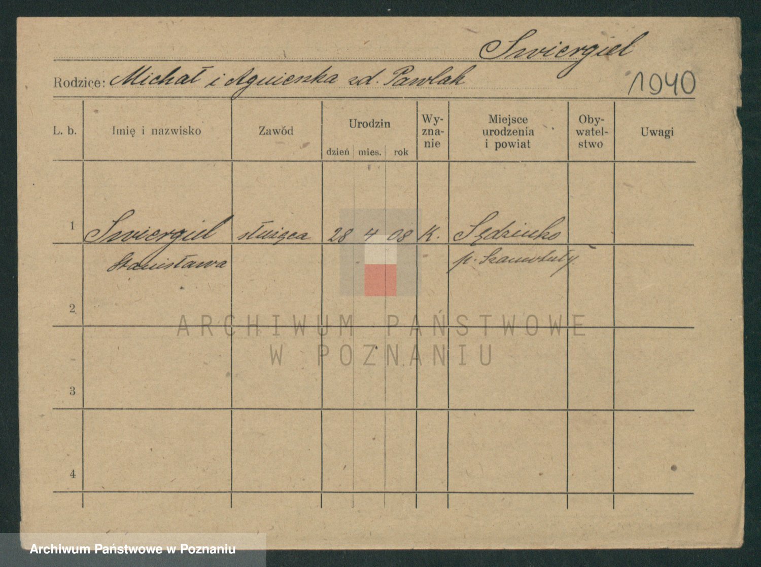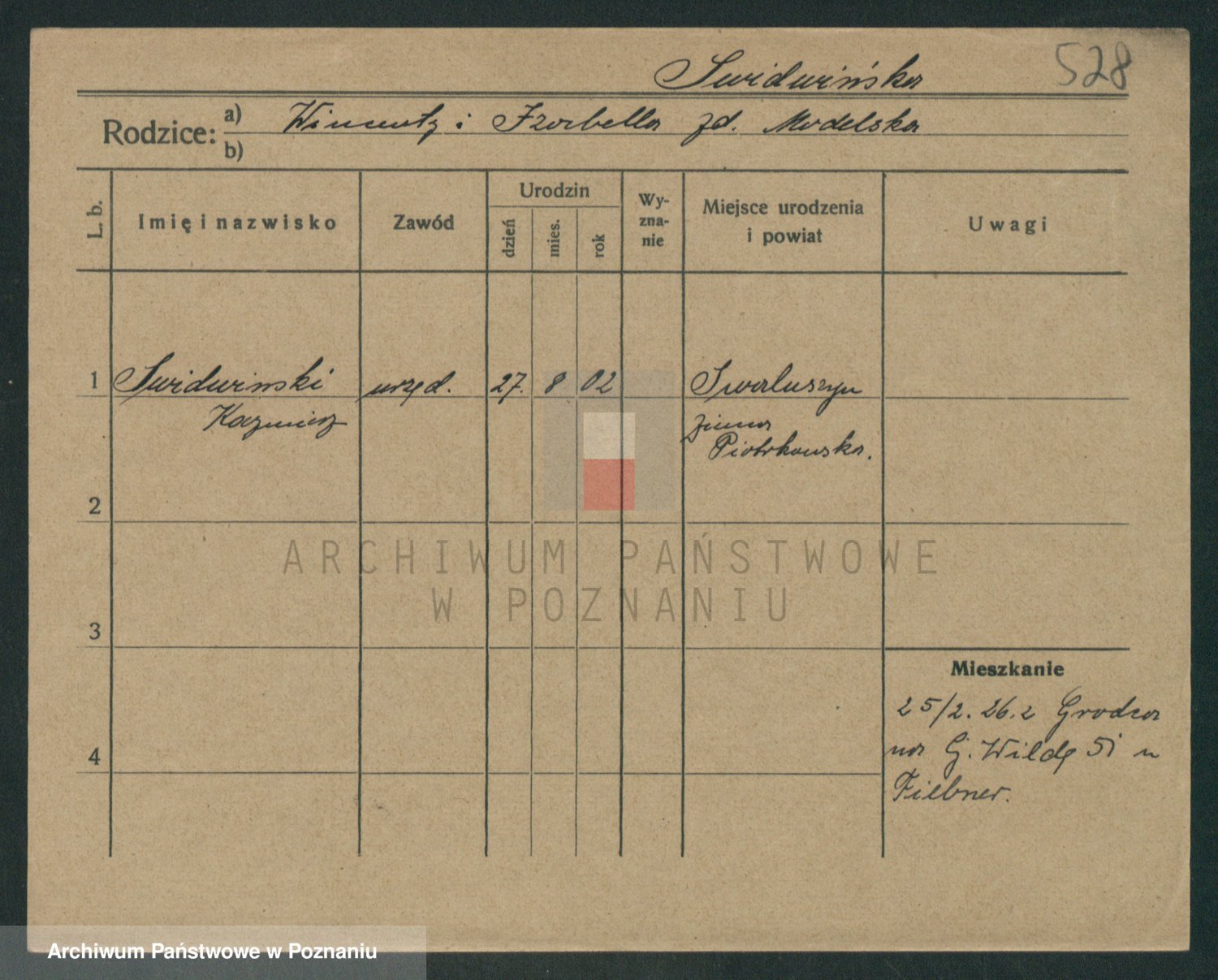 Podgląd karty osobowej dostępny jest po kliknięciu na nazwisko lub ikonkę karty. Można dokonywać powiększenia (ikony na górze) lub przechodzić między kolejnymi skanami (strzałki po bokach).