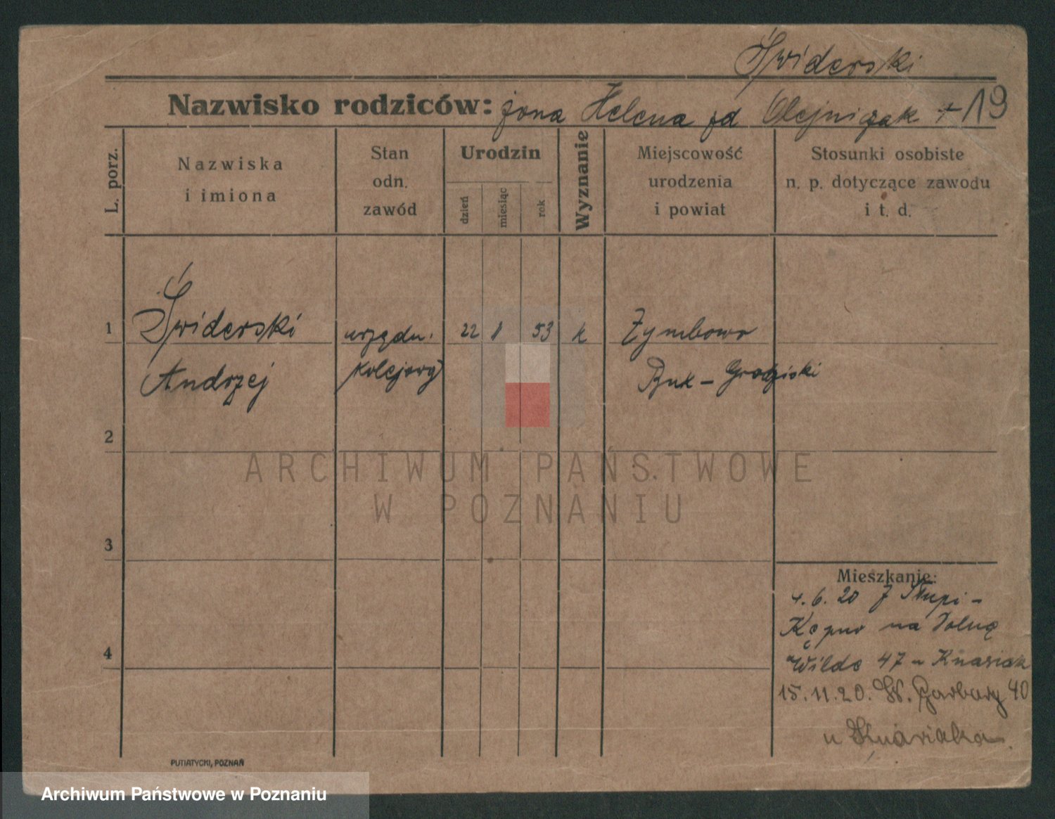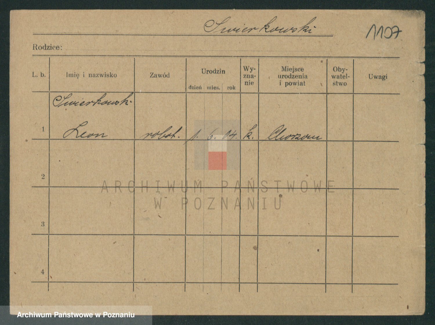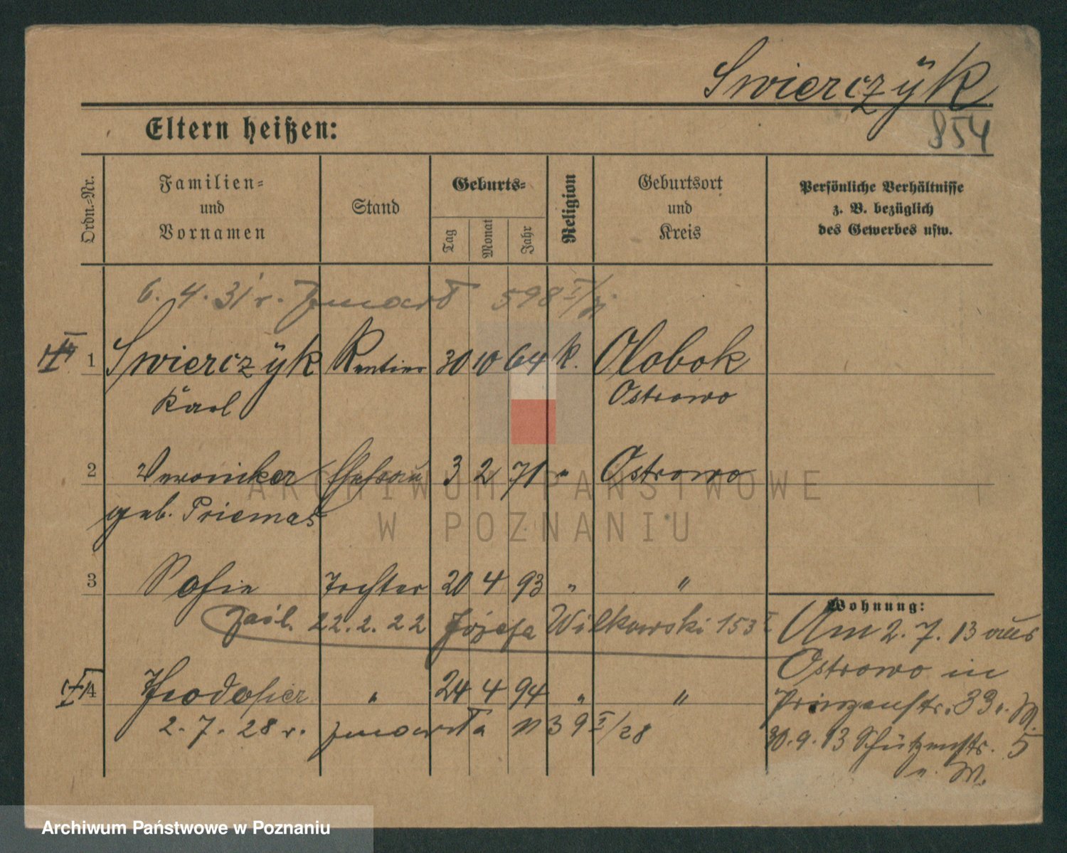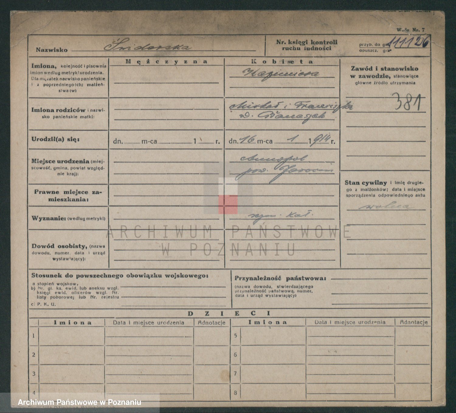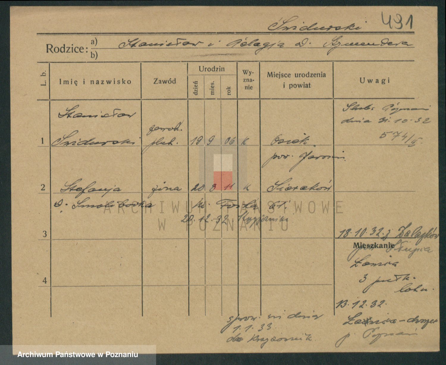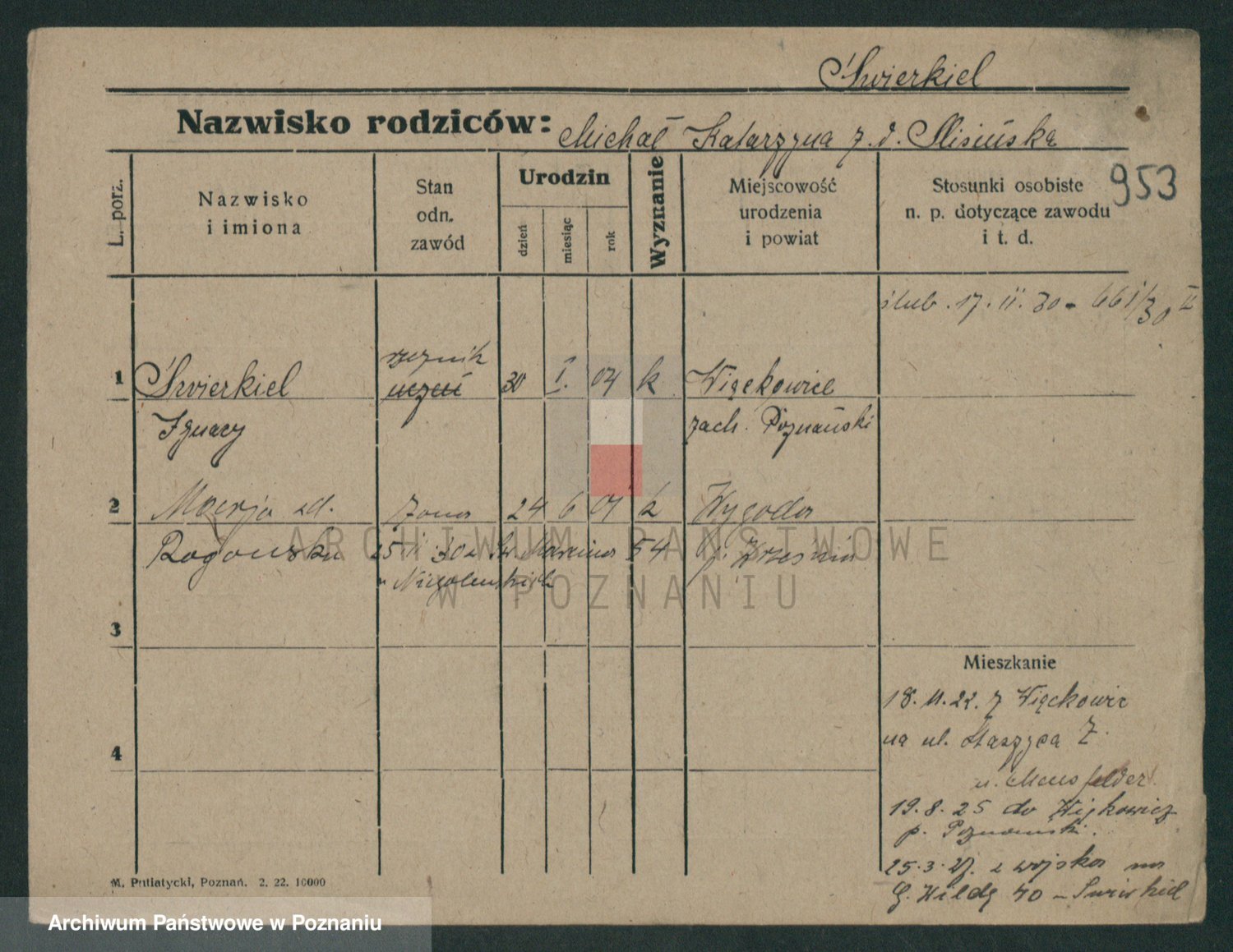 Podgląd karty osobowej dostępny jest po kliknięciu na nazwisko lub ikonkę karty. Można dokonywać powiększenia (ikony na górze) lub przechodzić między kolejnymi skanami (strzałki po bokach).