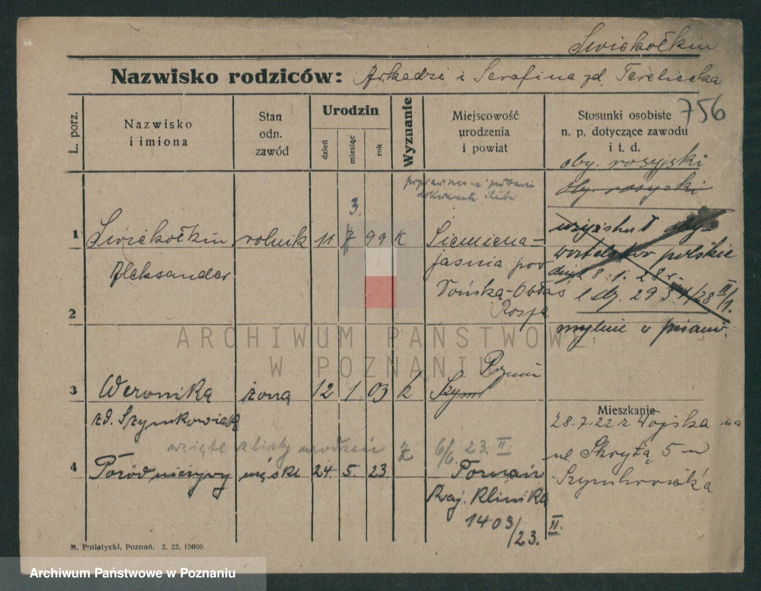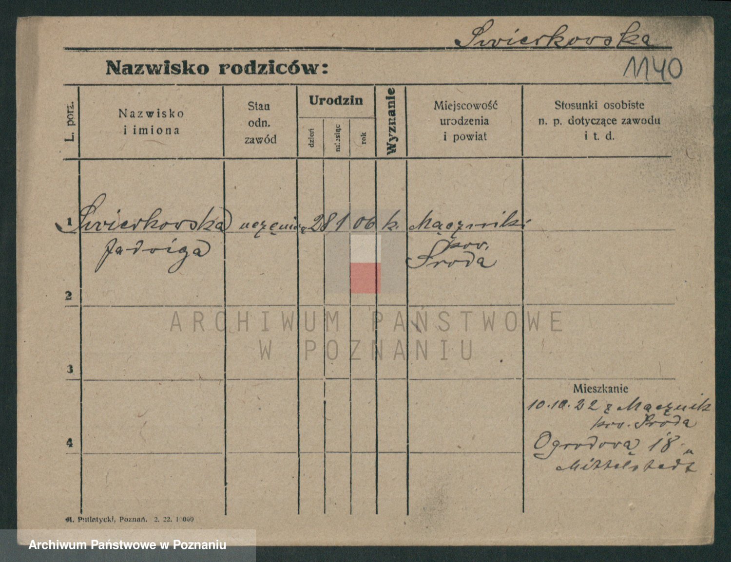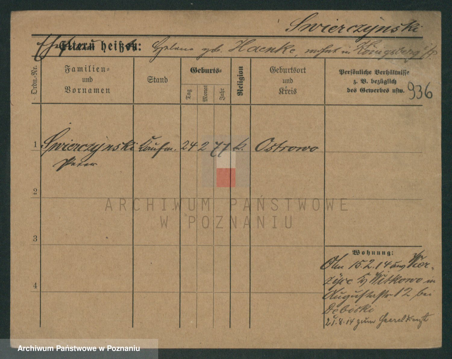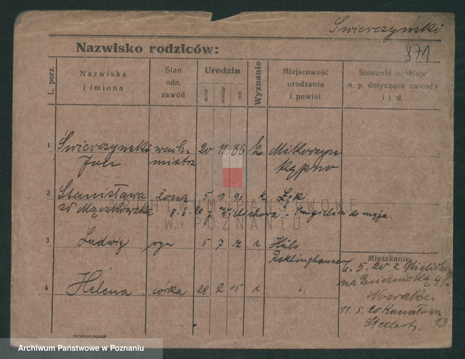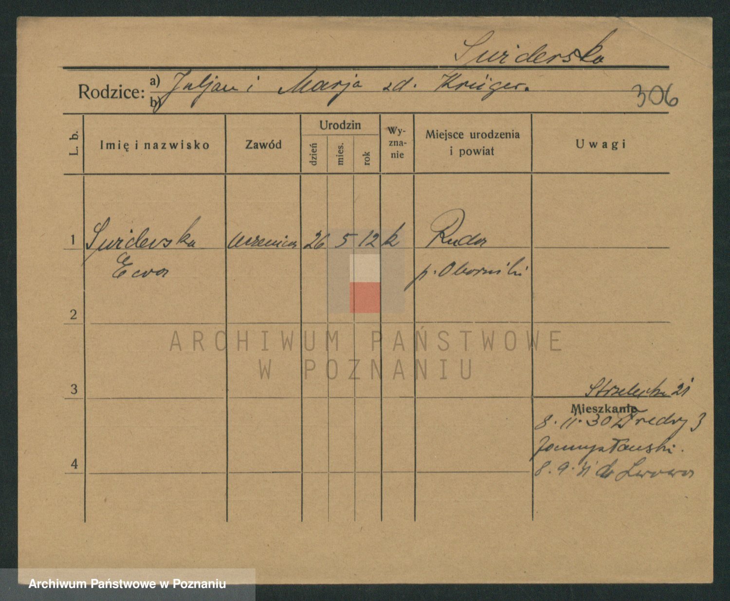 Podgląd karty osobowej dostępny jest po kliknięciu na nazwisko lub ikonkę karty. Można dokonywać powiększenia (ikony na górze) lub przechodzić między kolejnymi skanami (strzałki po bokach).