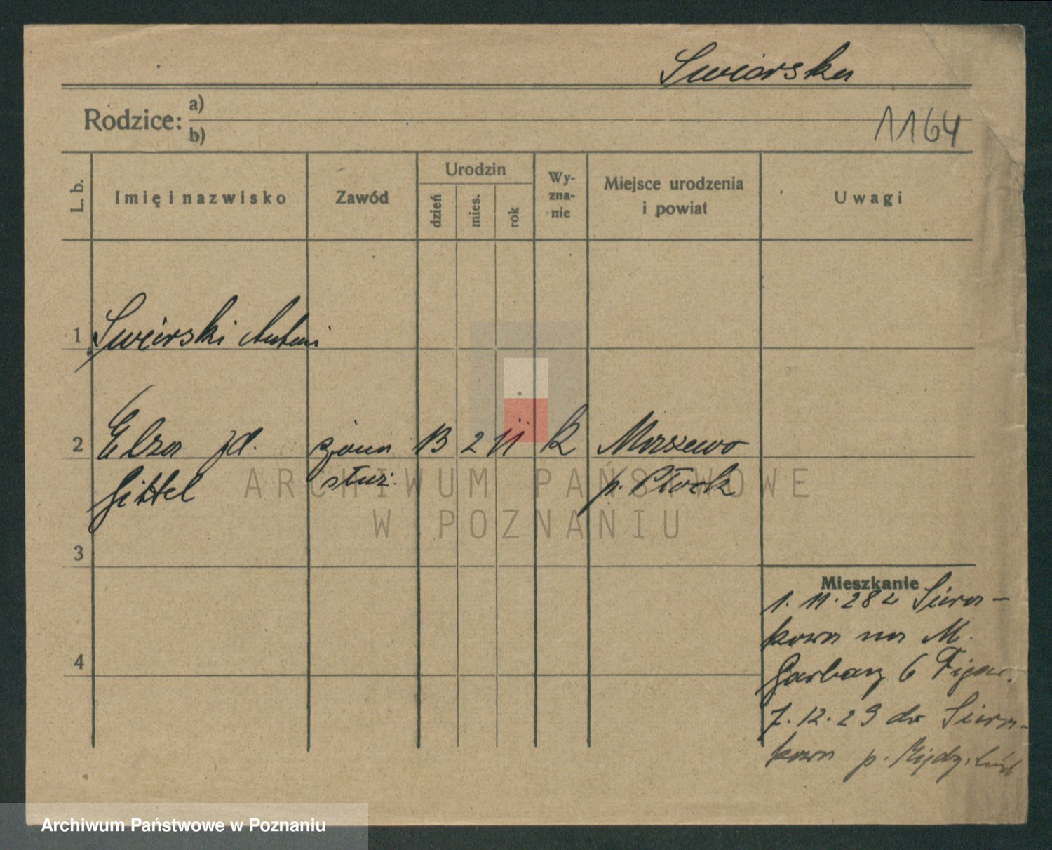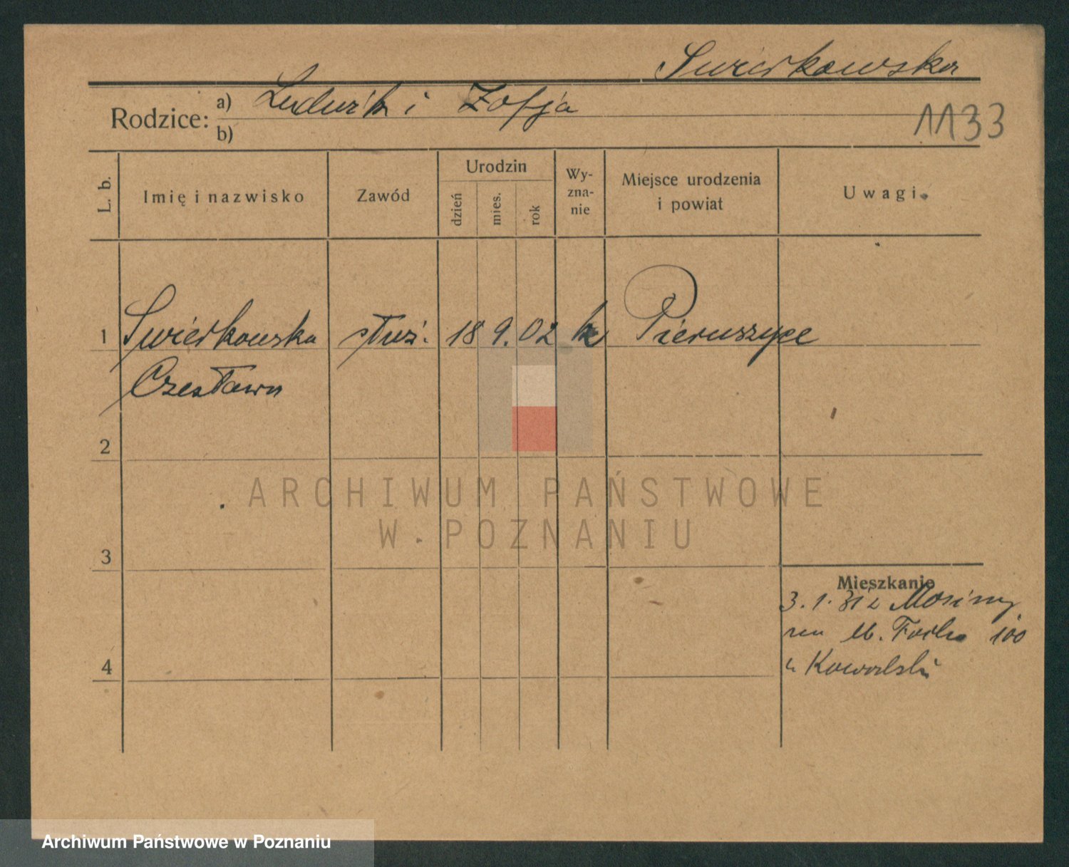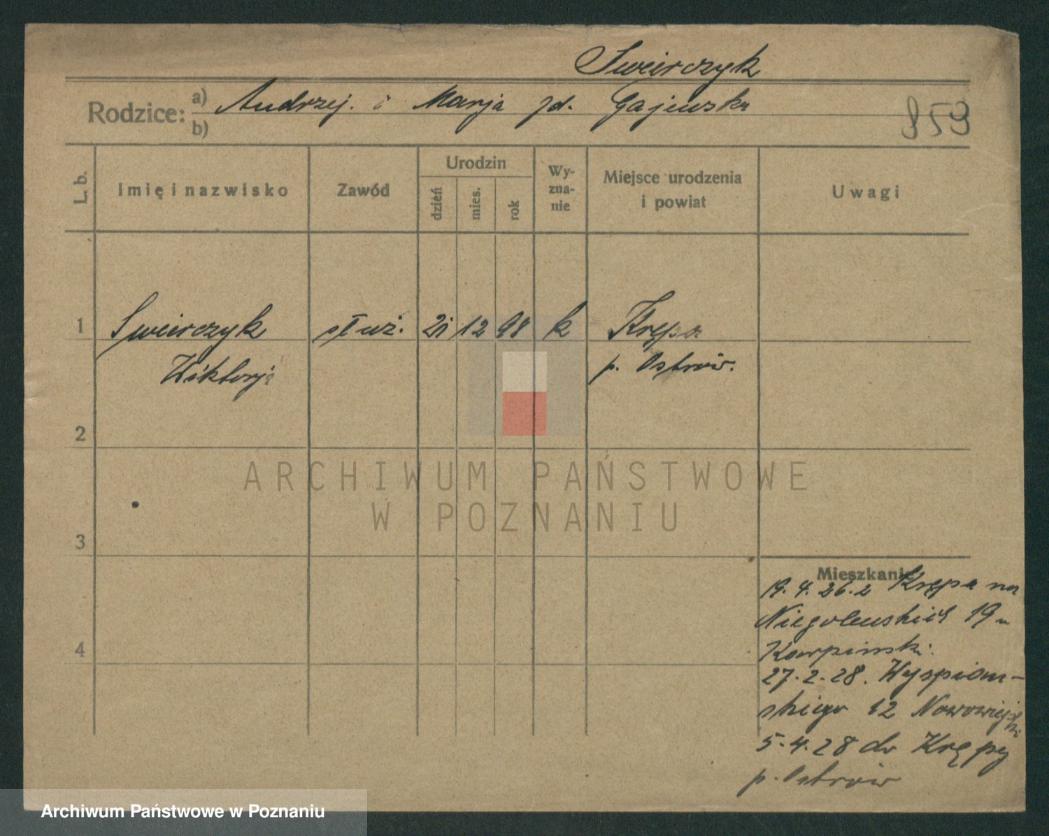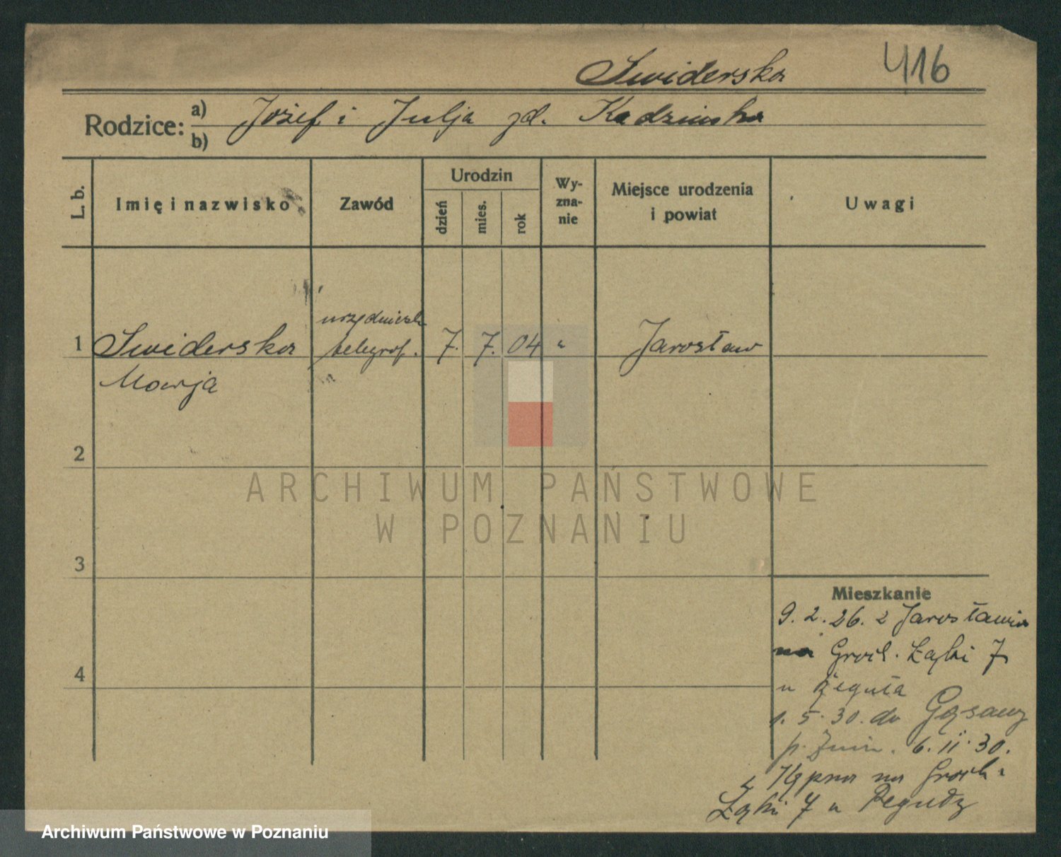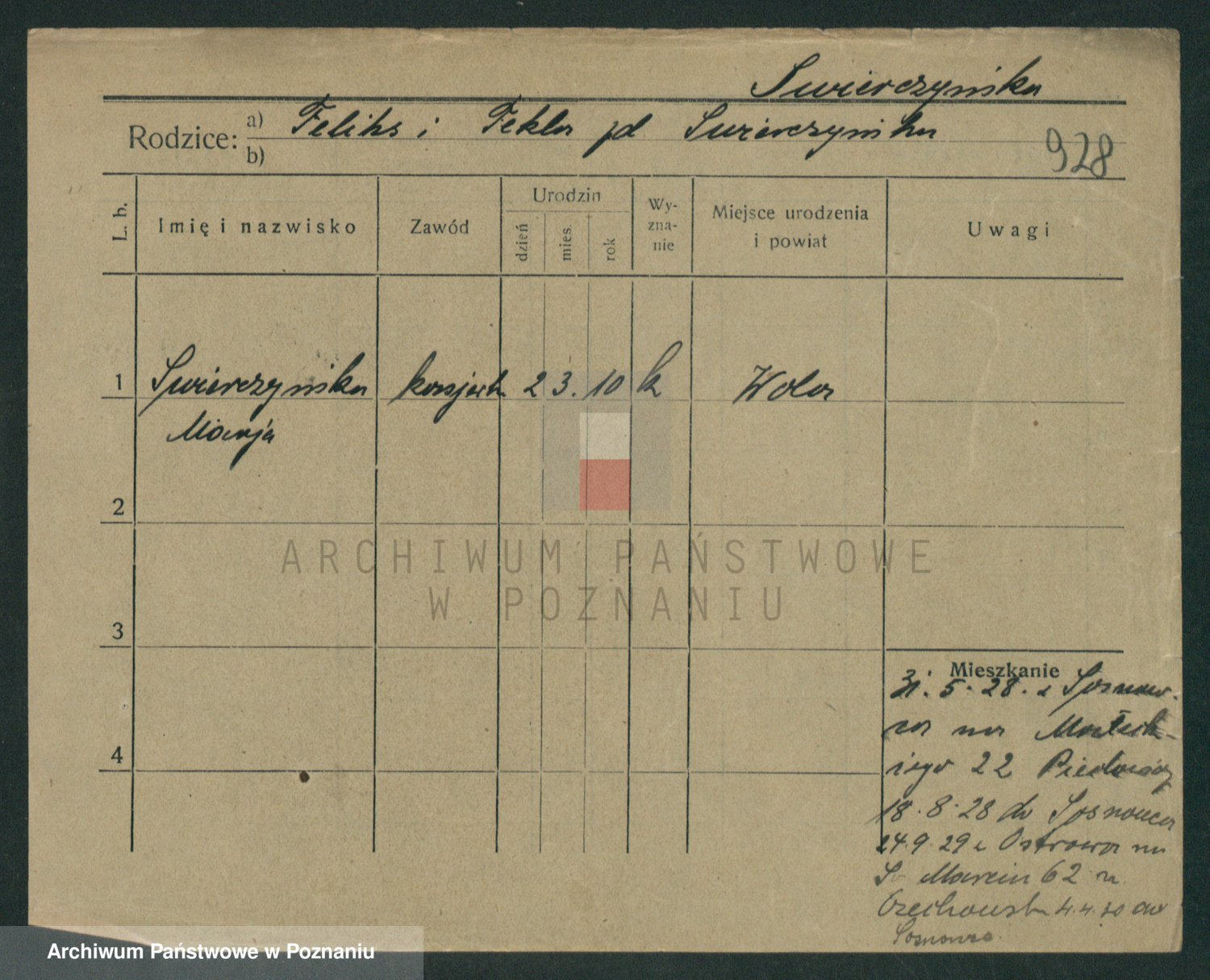 Podgląd karty osobowej dostępny jest po kliknięciu na nazwisko lub ikonkę karty. Można dokonywać powiększenia (ikony na górze) lub przechodzić między kolejnymi skanami (strzałki po bokach).