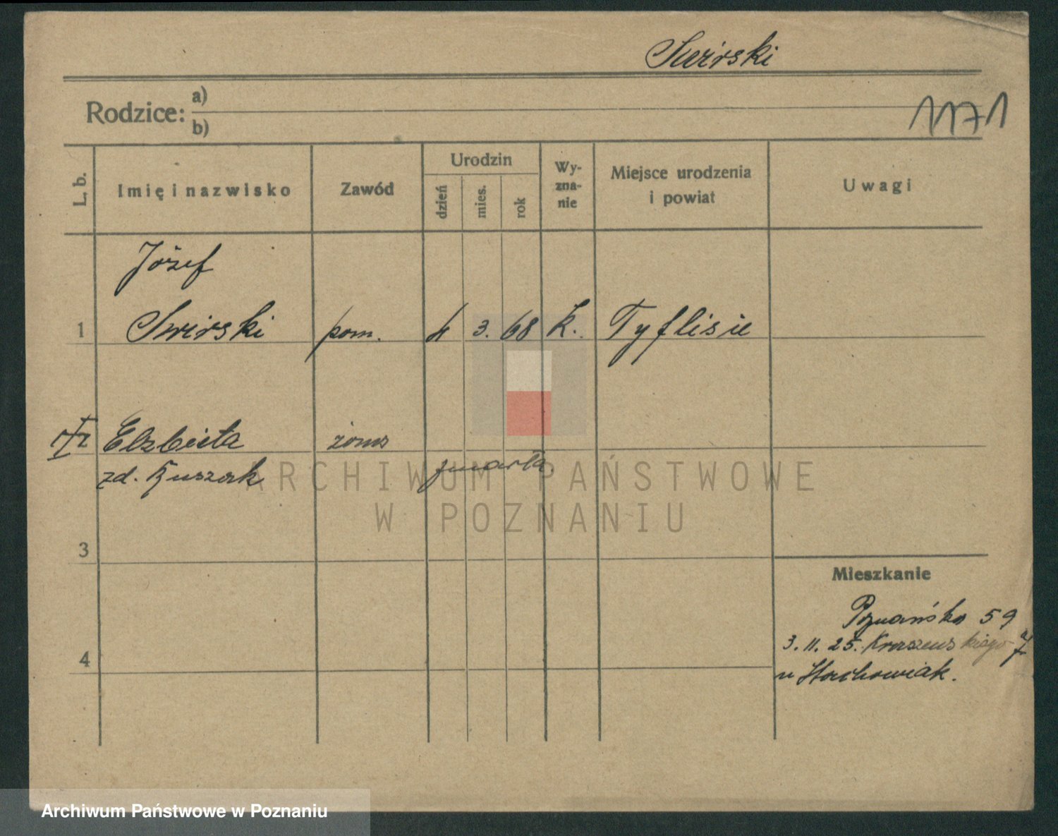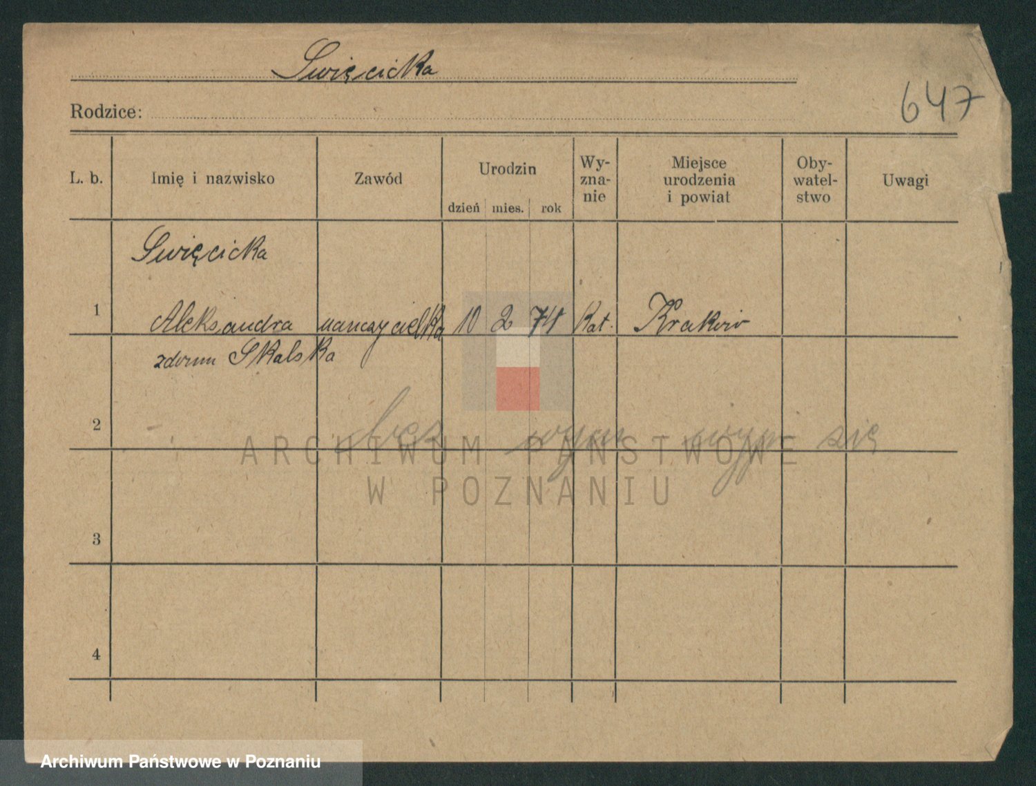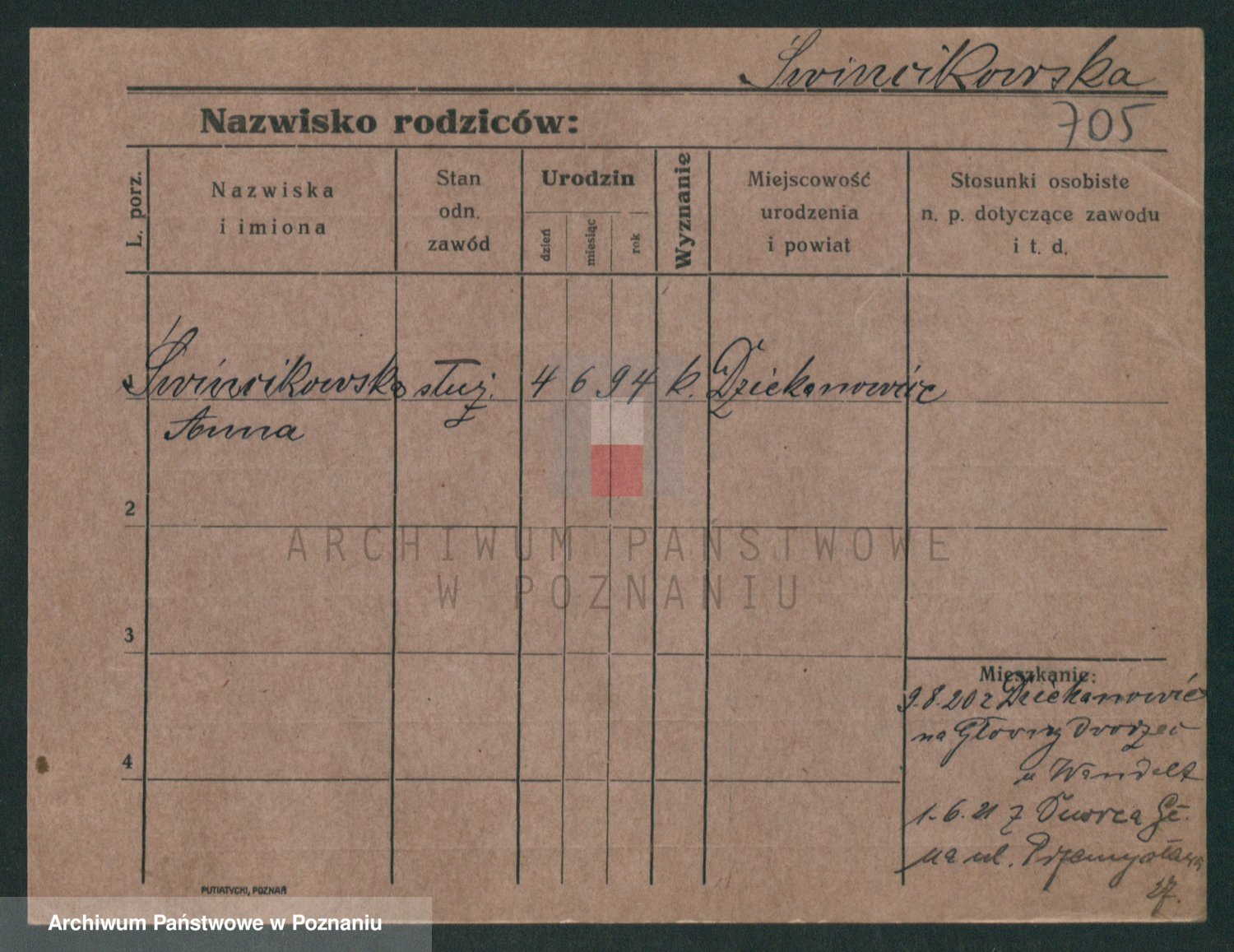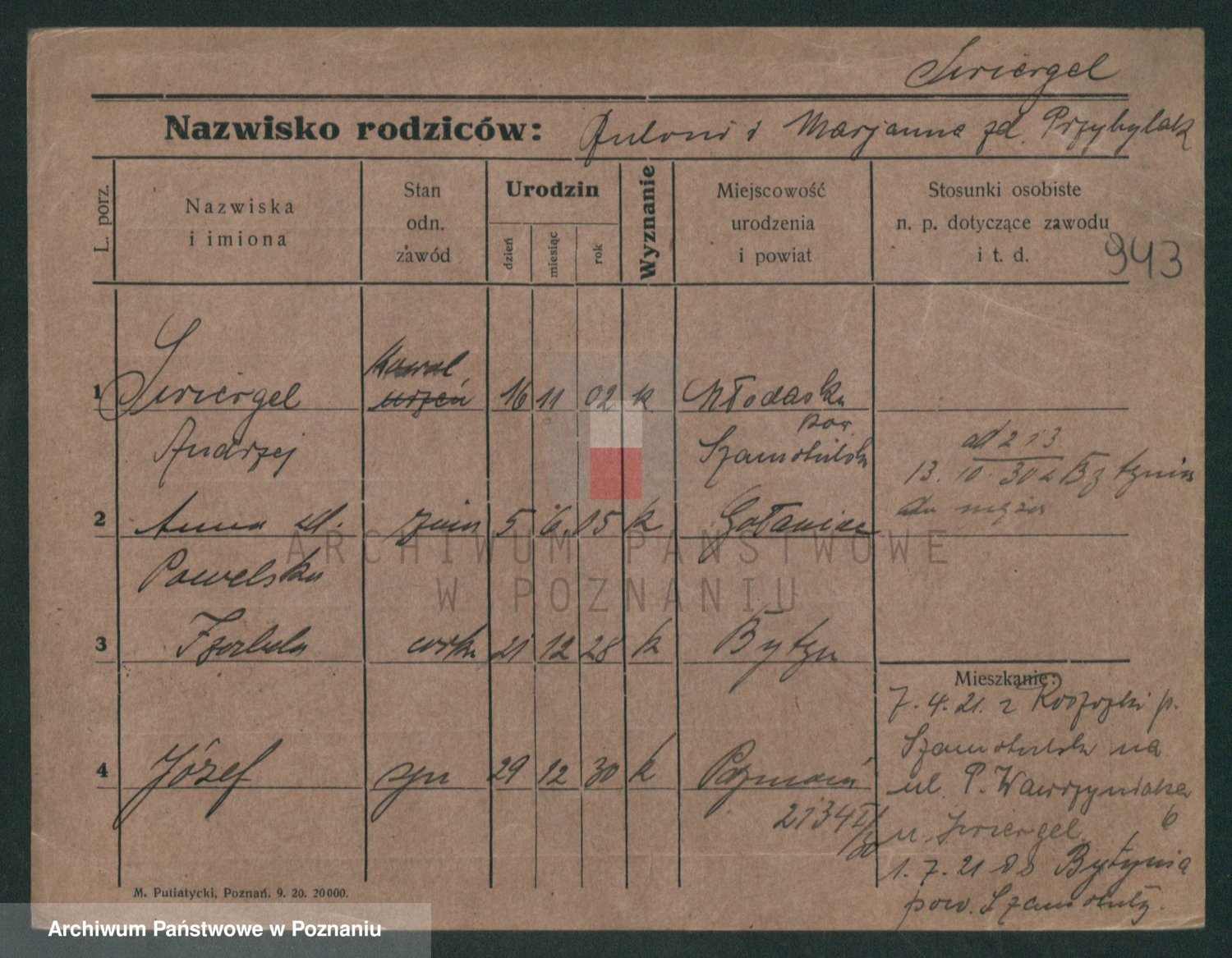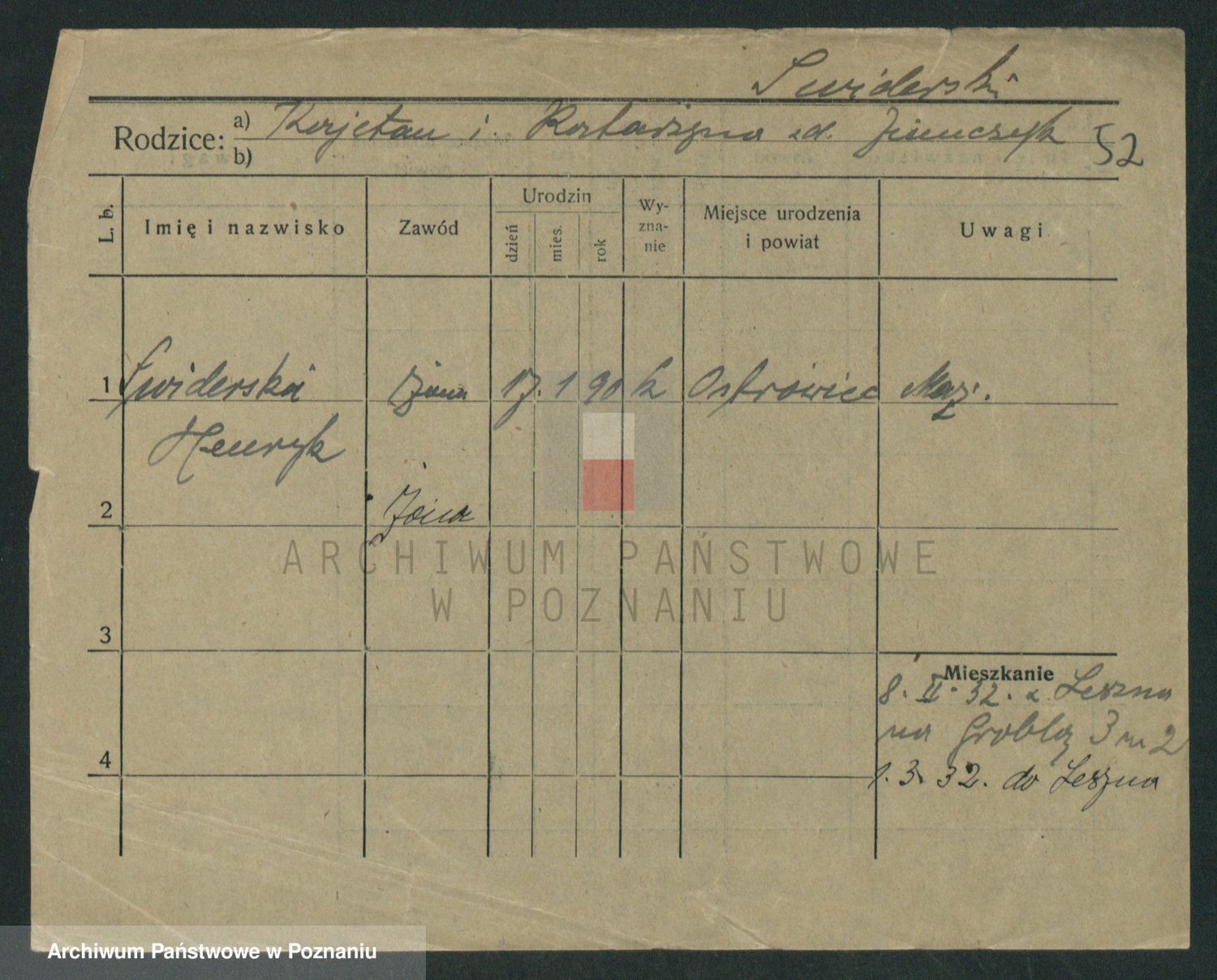 Podgląd karty osobowej dostępny jest po kliknięciu na nazwisko lub ikonkę karty. Można dokonywać powiększenia (ikony na górze) lub przechodzić między kolejnymi skanami (strzałki po bokach).