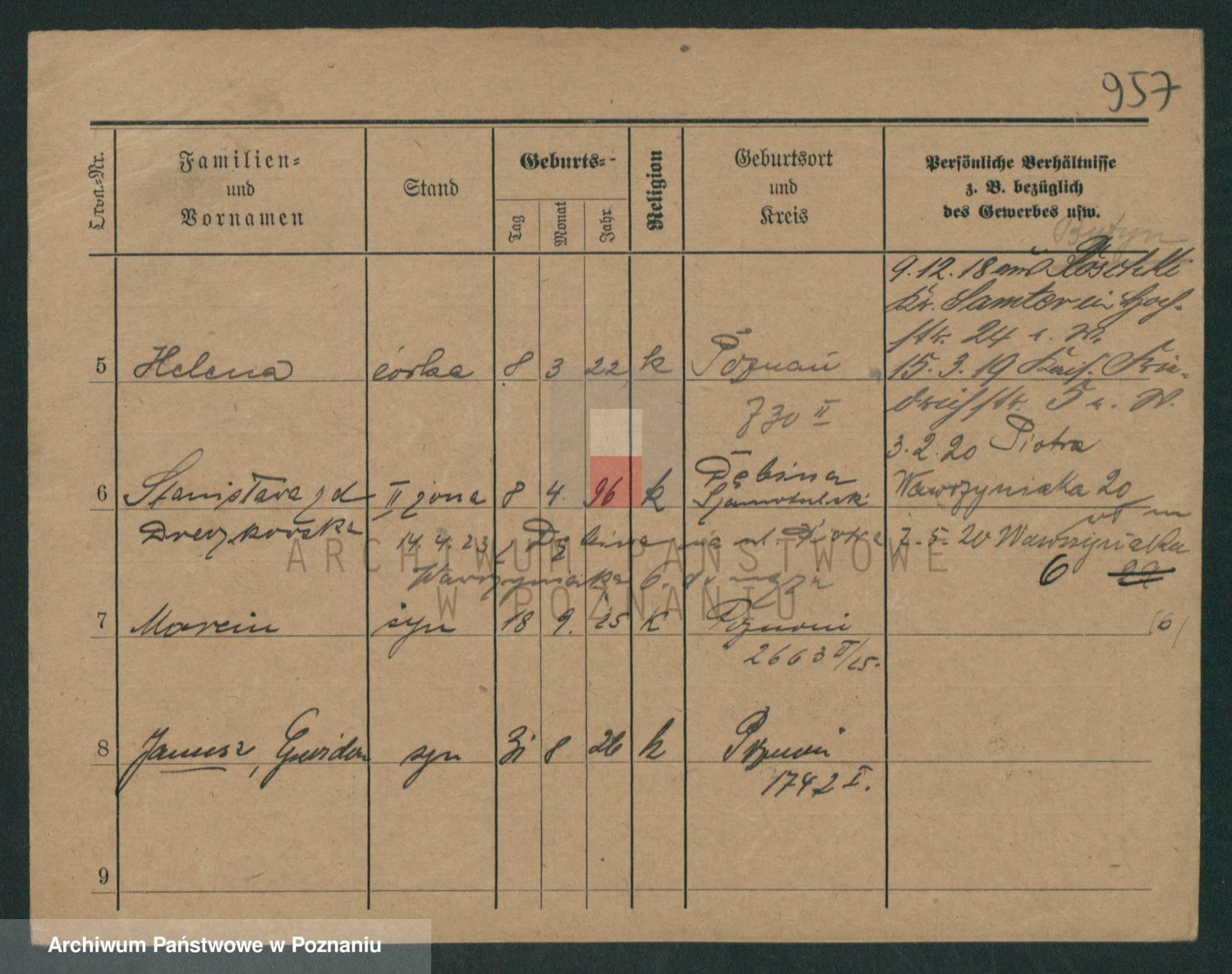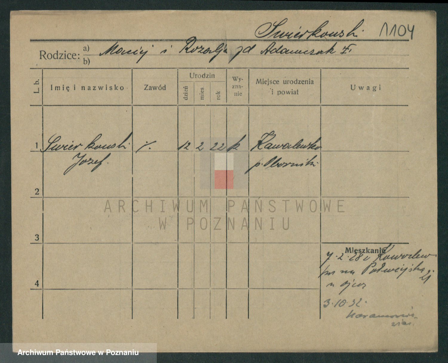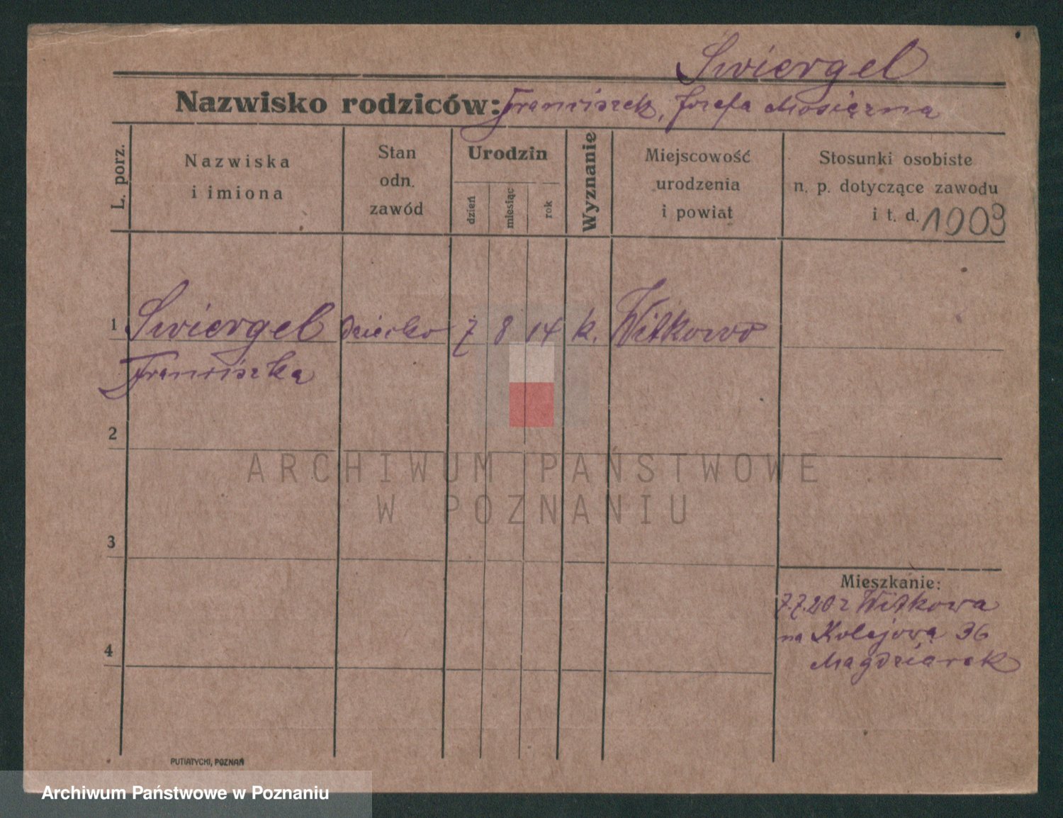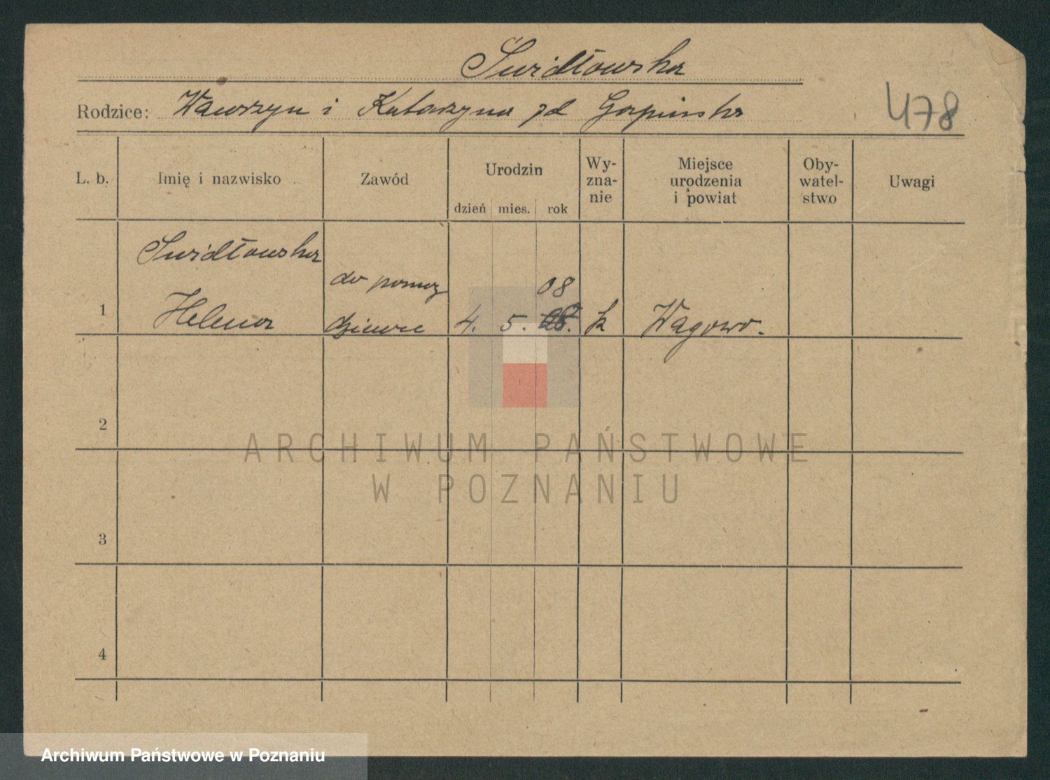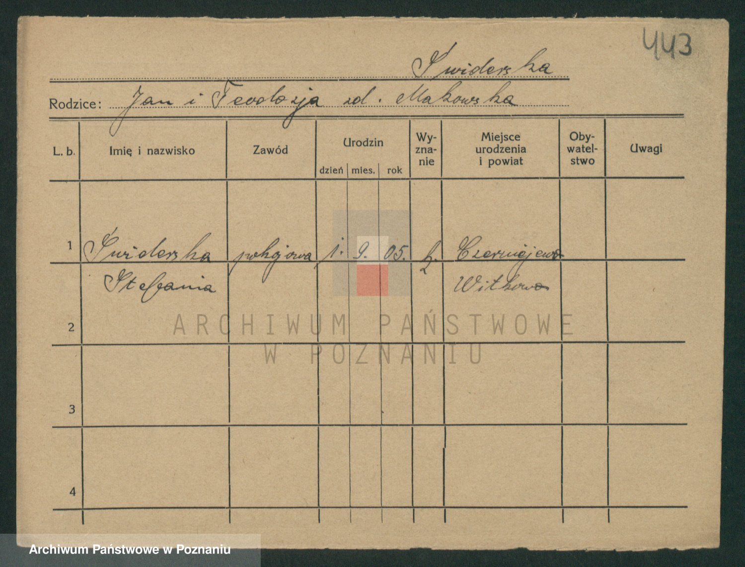 Podgląd karty osobowej dostępny jest po kliknięciu na nazwisko lub ikonkę karty. Można dokonywać powiększenia (ikony na górze) lub przechodzić między kolejnymi skanami (strzałki po bokach).