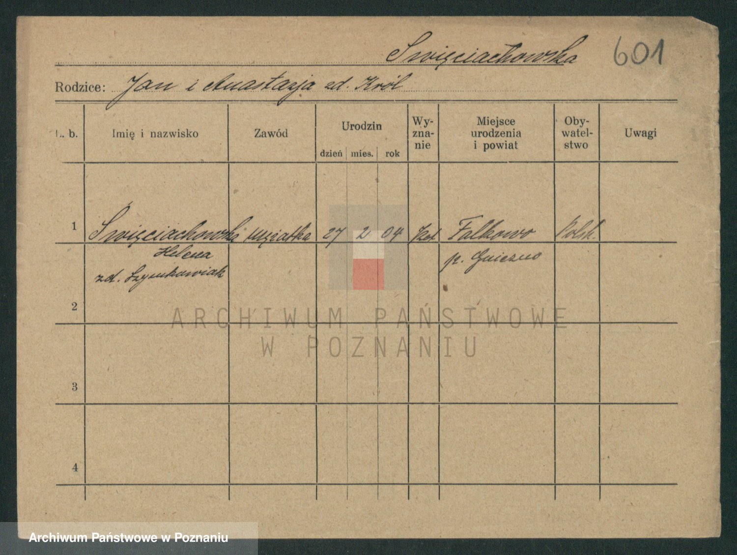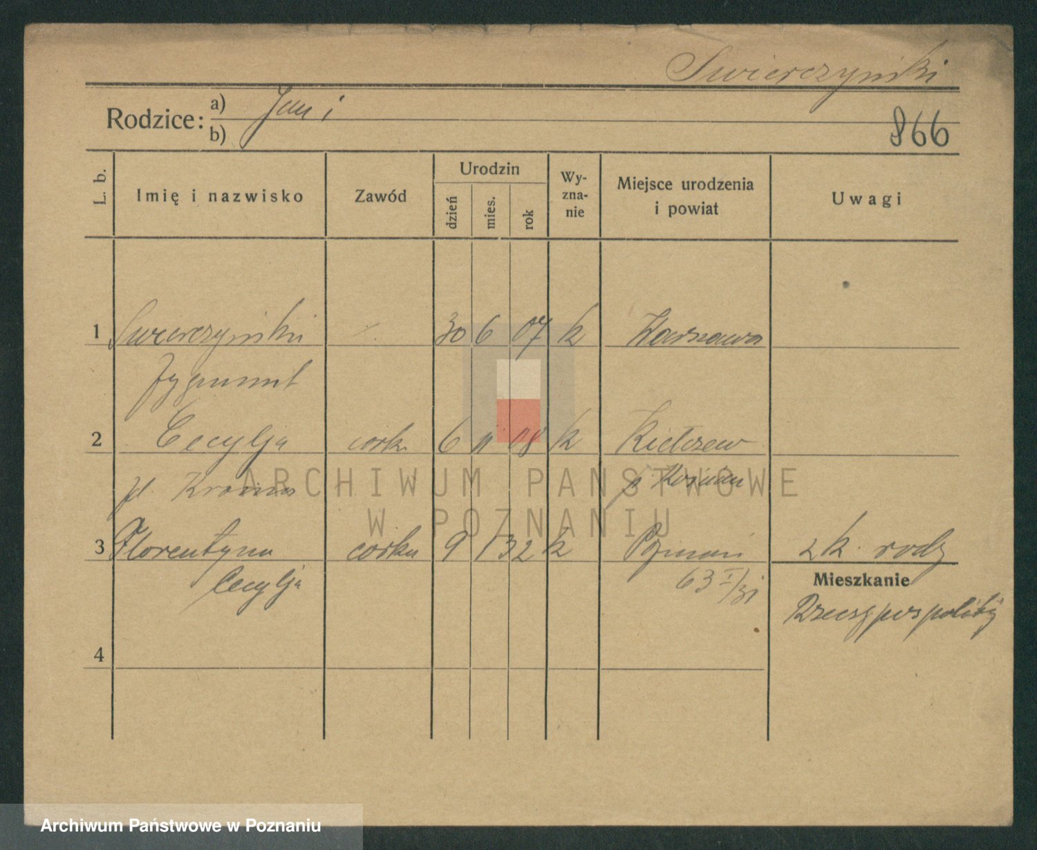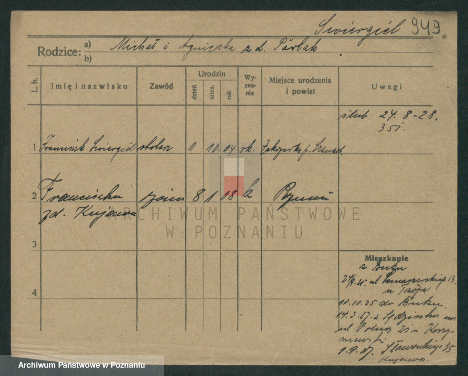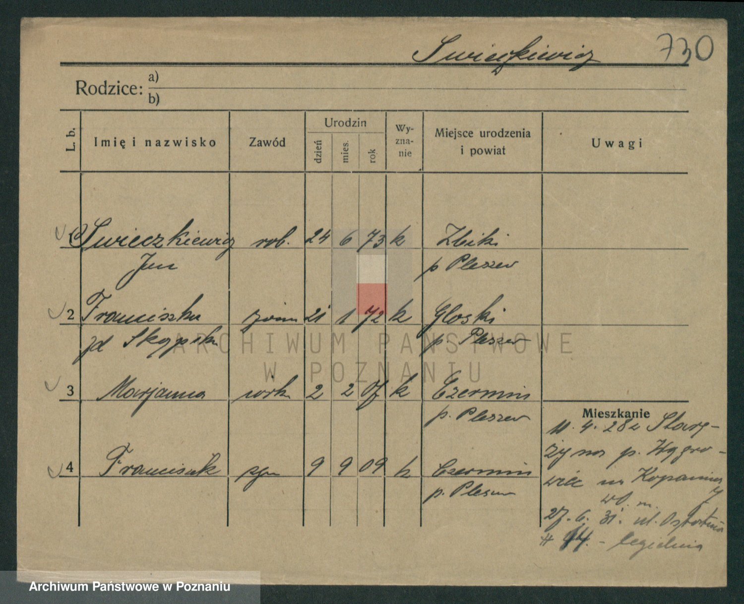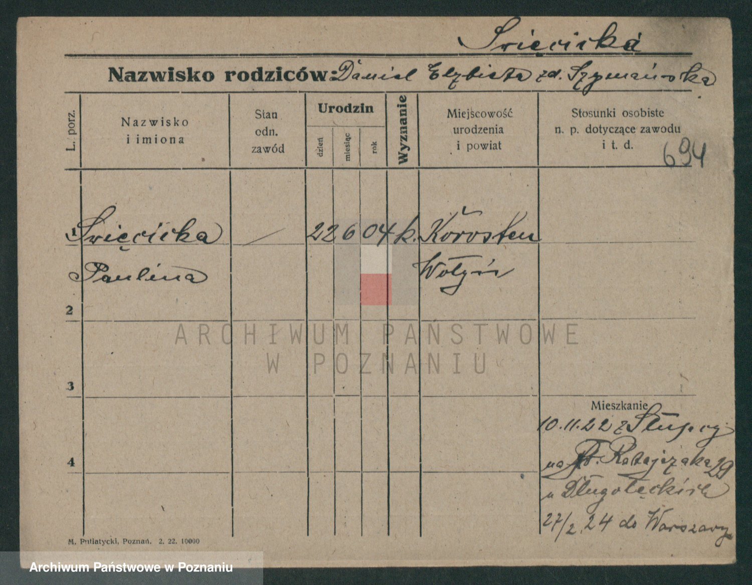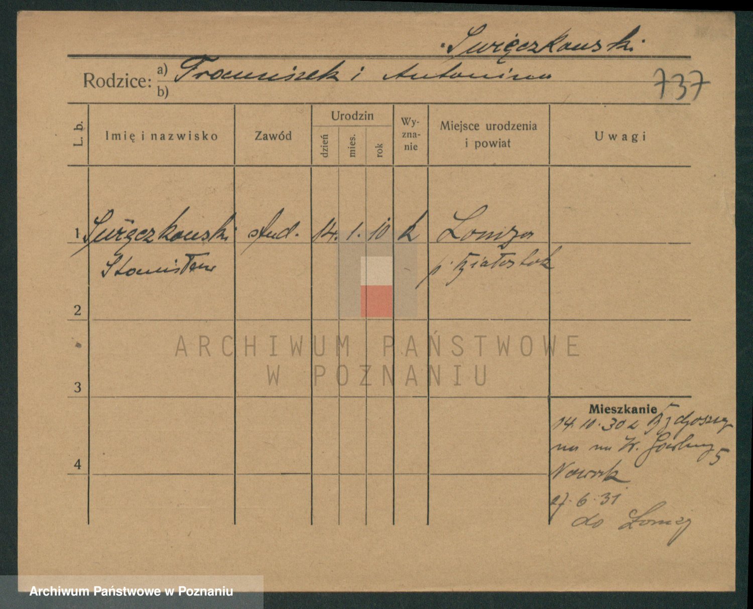 Podgląd karty osobowej dostępny jest po kliknięciu na nazwisko lub ikonkę karty. Można dokonywać powiększenia (ikony na górze) lub przechodzić między kolejnymi skanami (strzałki po bokach).